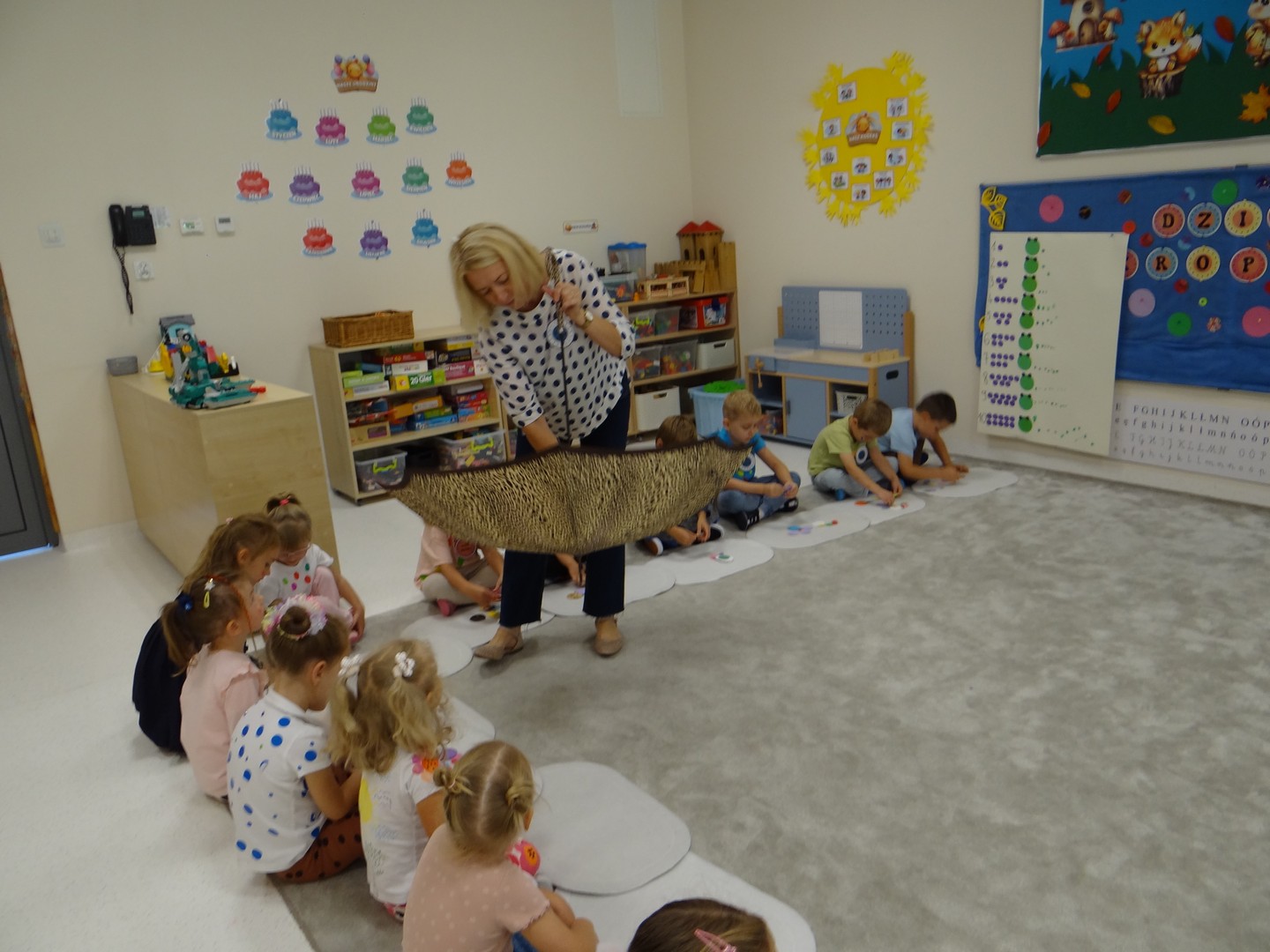 22.09.2025 r. naszą grupę odwiedziła Pani Jesień. Dzieci miały okazję uroczyście powitać nową porę roku z tym większą radością, że w rolę Pani Jesieni wcieliła się mama Jaśminki. Pani Asia w pięknej jesiennej kreacji opowiadała dzieciom o warzywach, owocach przyniesionych w wiklinowym koszu. Dzieci z wielkim zaintereso...