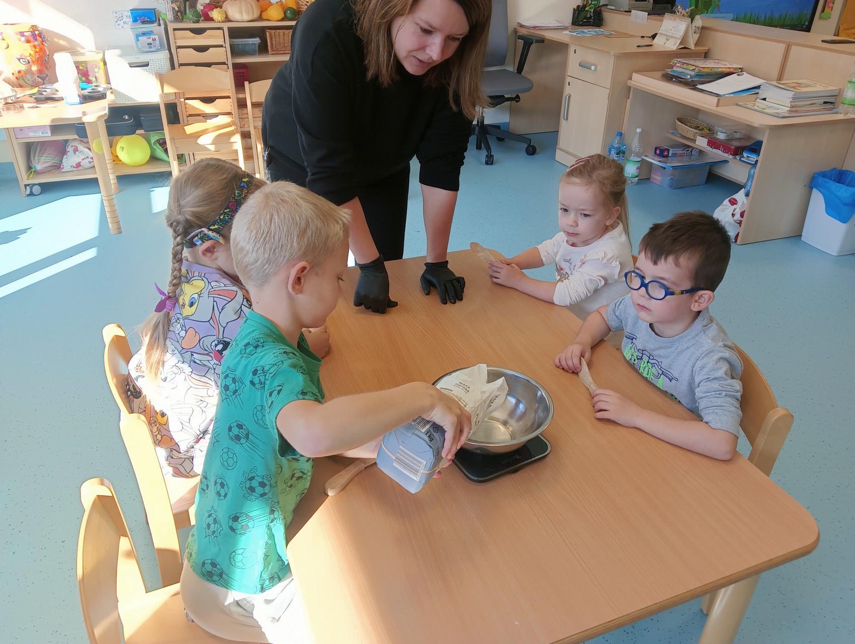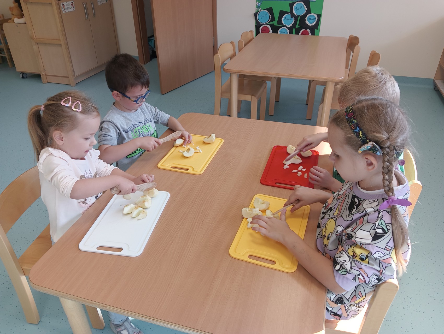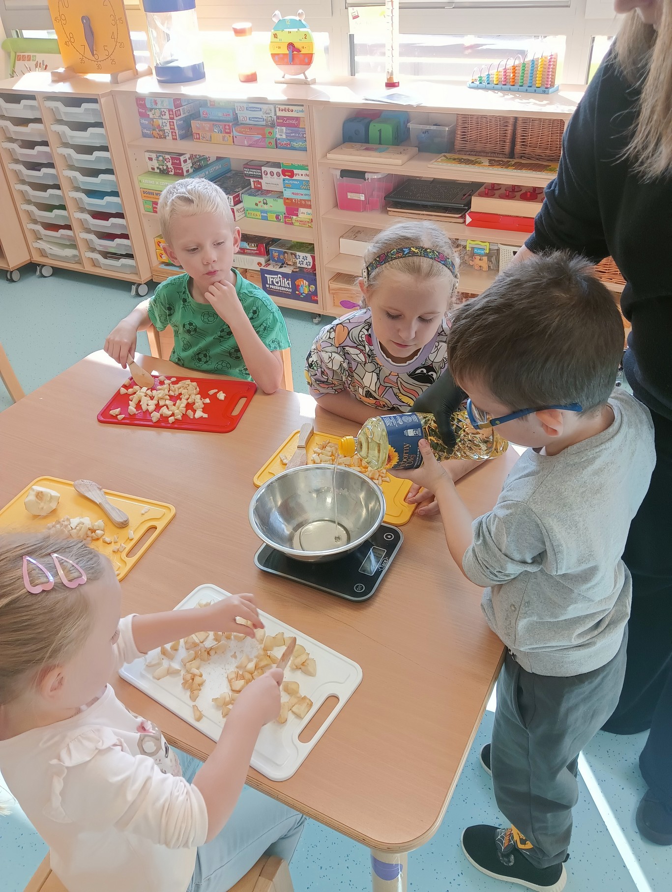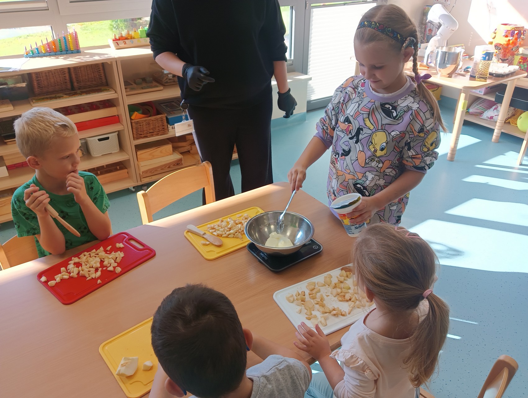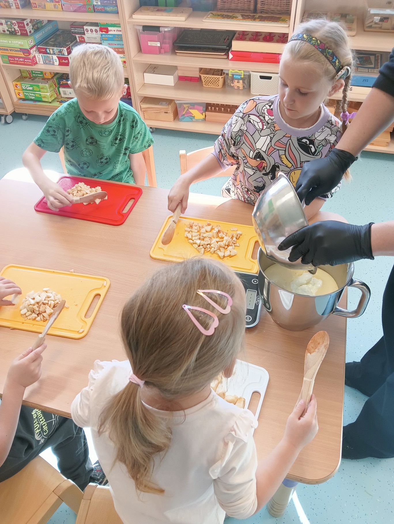 W tym tygodniu nasze Smerfy zamieniły się w małych kucharzy! Wspólnie przygotowaliśmy pyszne babeczki z jabłkami – było mieszanie, odmierzanie składników i oczywiście degustacja! Dzieci z ogromnym zaangażowaniem uczestniczyły w każdym etapie pieczenia, ucząc się współpracy, cierpliwości i rozwijając małą motorykę. A zapach świeżo upieczonych babeczek unosił się po całym przedszkolu – mniam! To był słodki dzień pełen radości, uśmiechu i nauki przez zabawę!