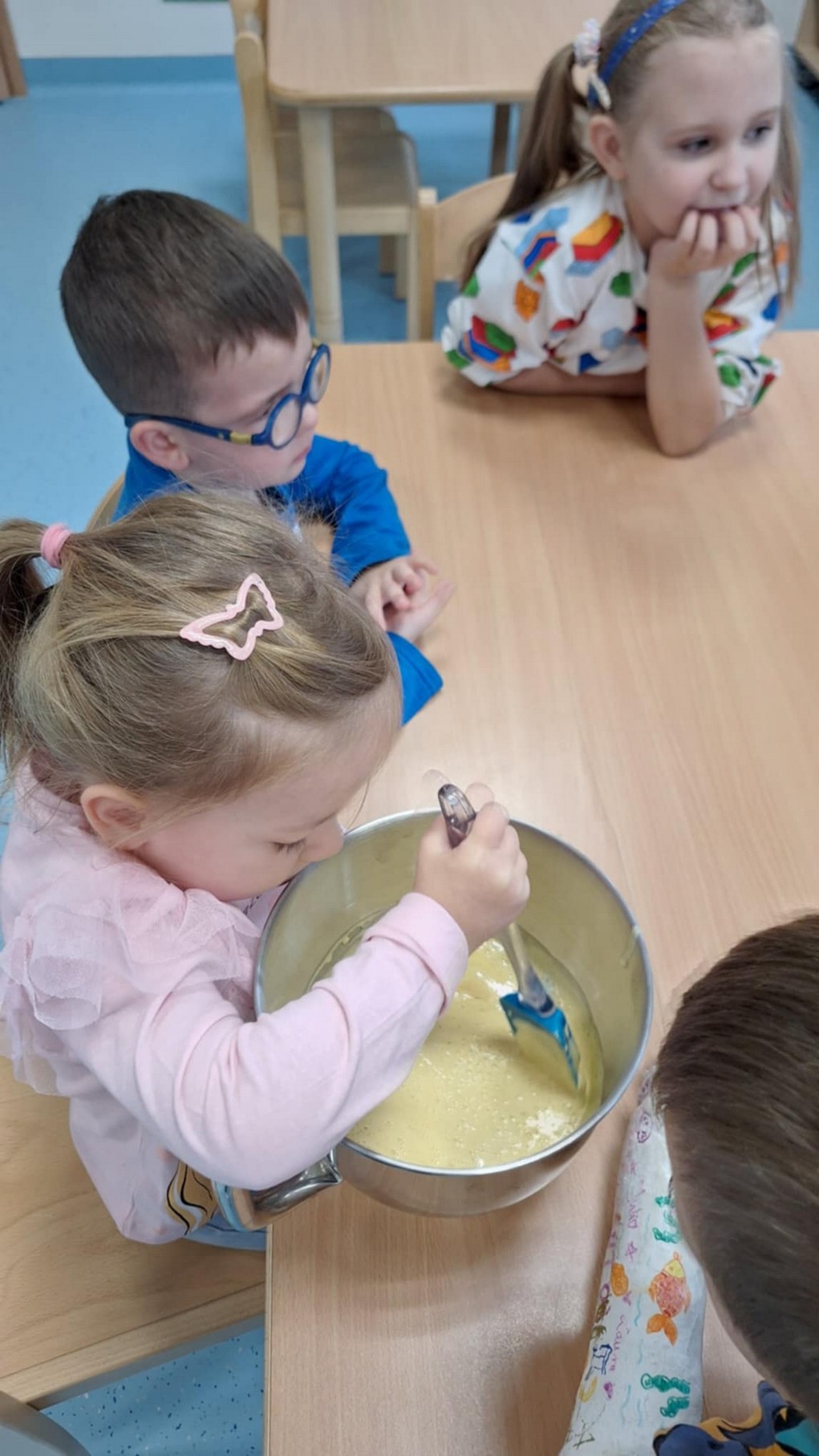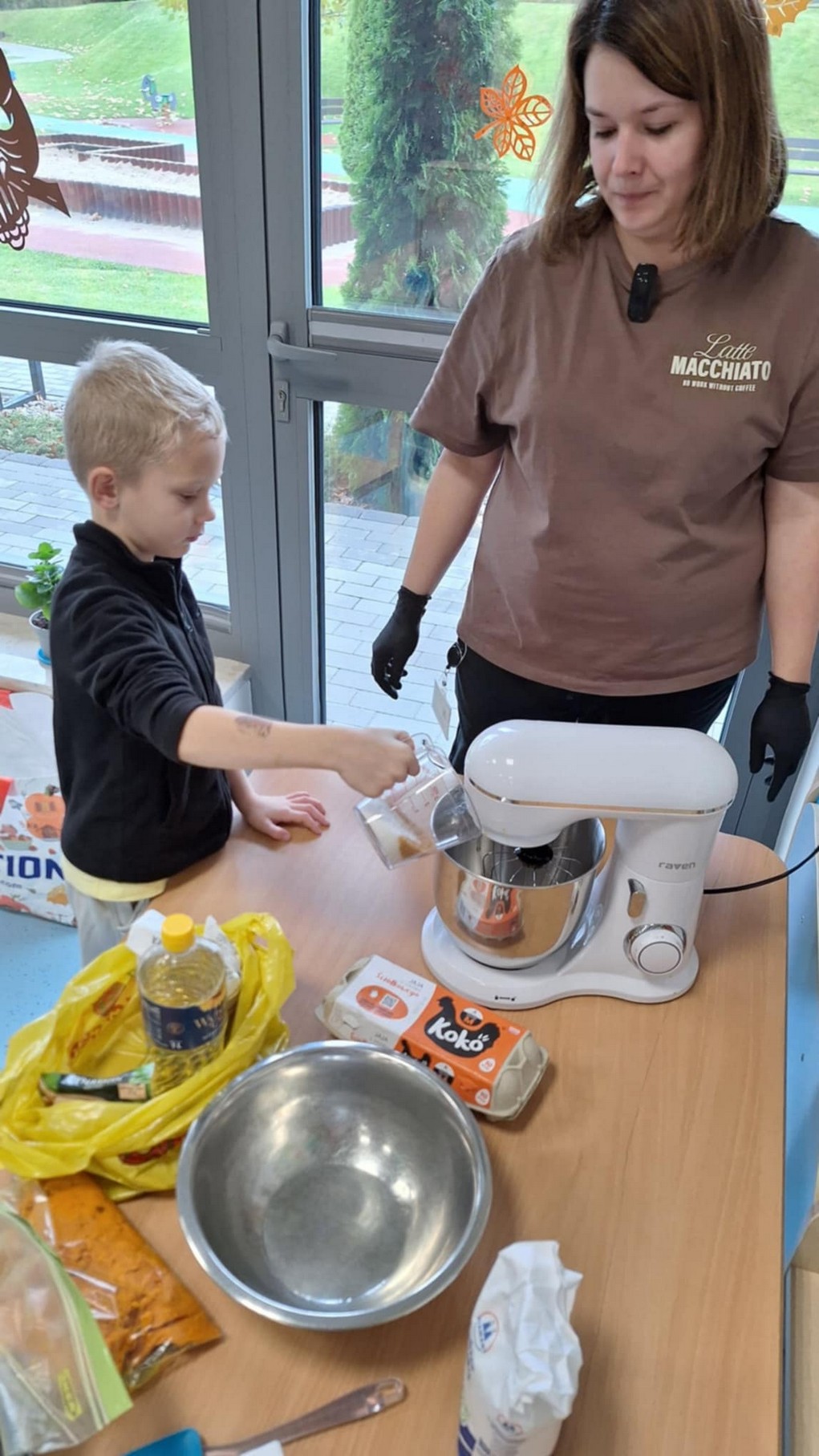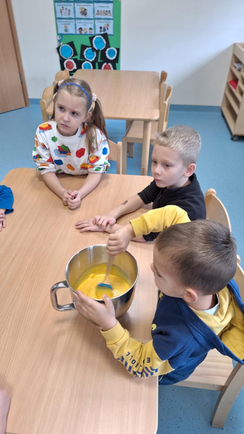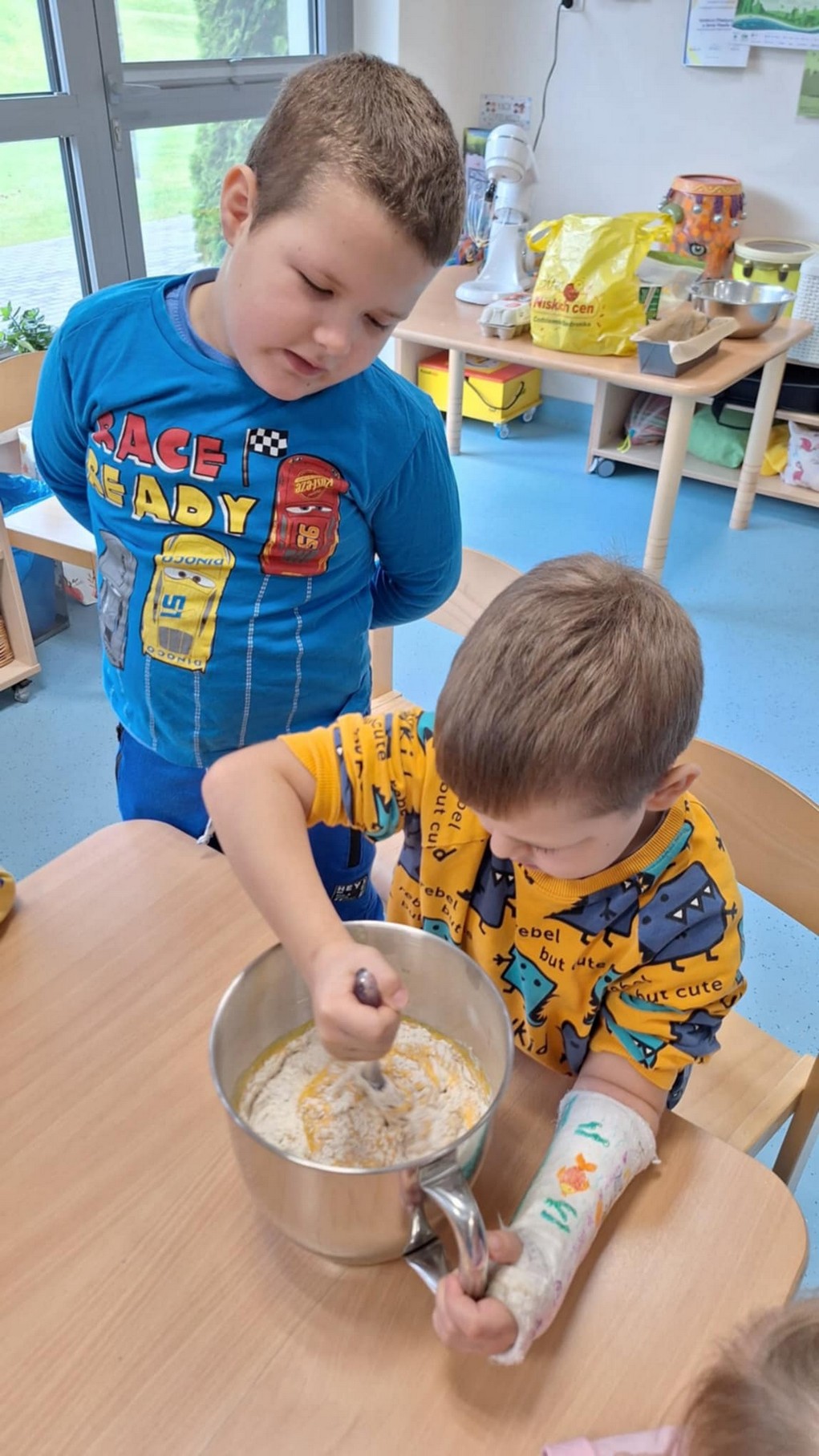Dziś w naszej grupie „Smerfy” pachniało jesienią i domowym ciepłem. Postanowiliśmy wspólnie upiec ciasto dyniowe, które od kilku dni planowaliśmy przygotować.. Najpierw obejrzeliśmy dynię – dotykaliśmy jej skórki, wąchaliśmy zapach, a potem rozmawialiśmy o tym, jak rośnie i dlaczego to takie wyjątkowe jesienne warzywo. Następnie wspólnie odmierzaliśmy składniki: mąkę, cukier, olej i przyprawy. Każdy miał okazję coś wsypać lub zamieszać, a kiedy masa zaczęła pachnieć cynamonem i wanilią, w sali zrobiło się naprawdę przytulnie. Kiedy ciasto trafiło do piekarnika, cierpliwie czekaliśmy, aż się upiecze. Degustacja była prawdziwą ucztą! Każdy Smerf z dumą próbował swojego kawałka, a na buziach malowała się satysfakcja i radość ze wspólnego działania. To był piękny dzień, pełen ciepła, współpracy i jesiennych zapachów.