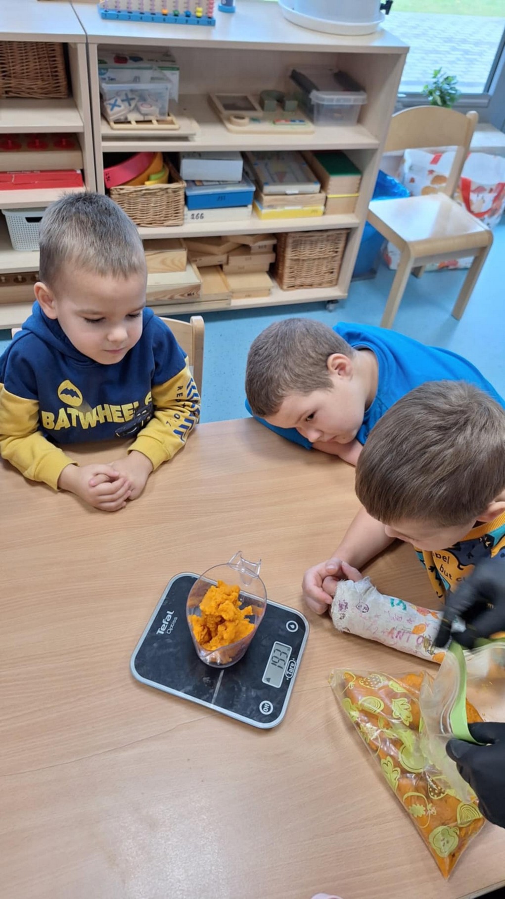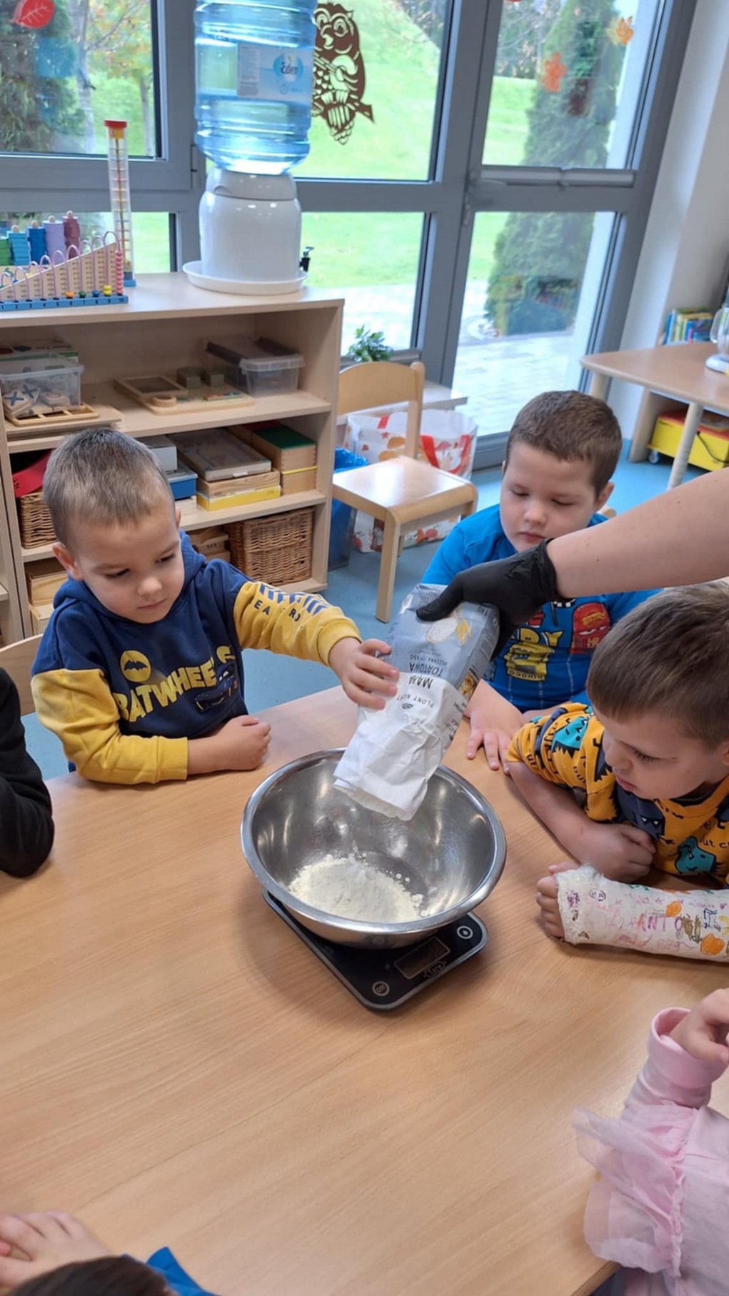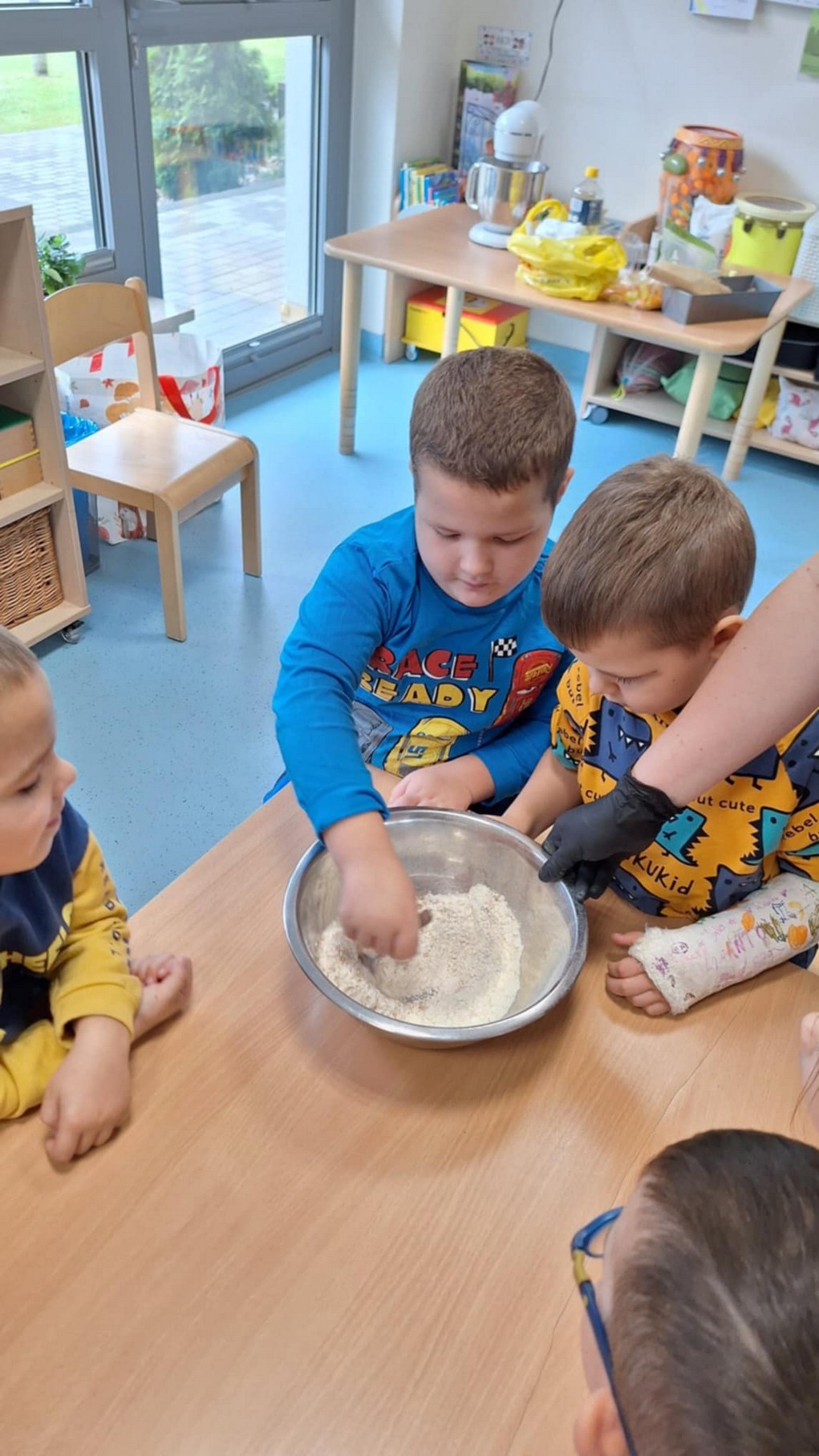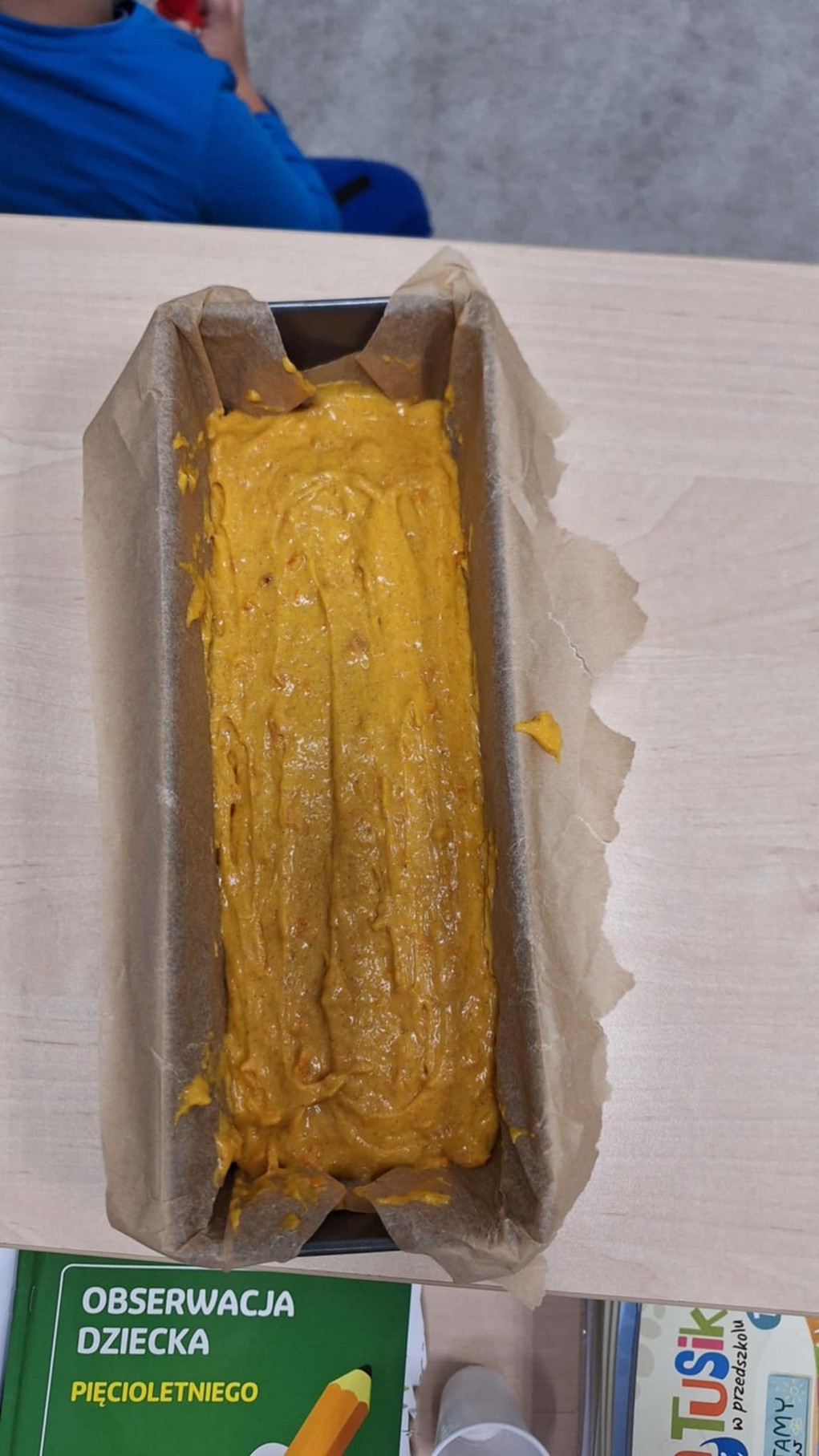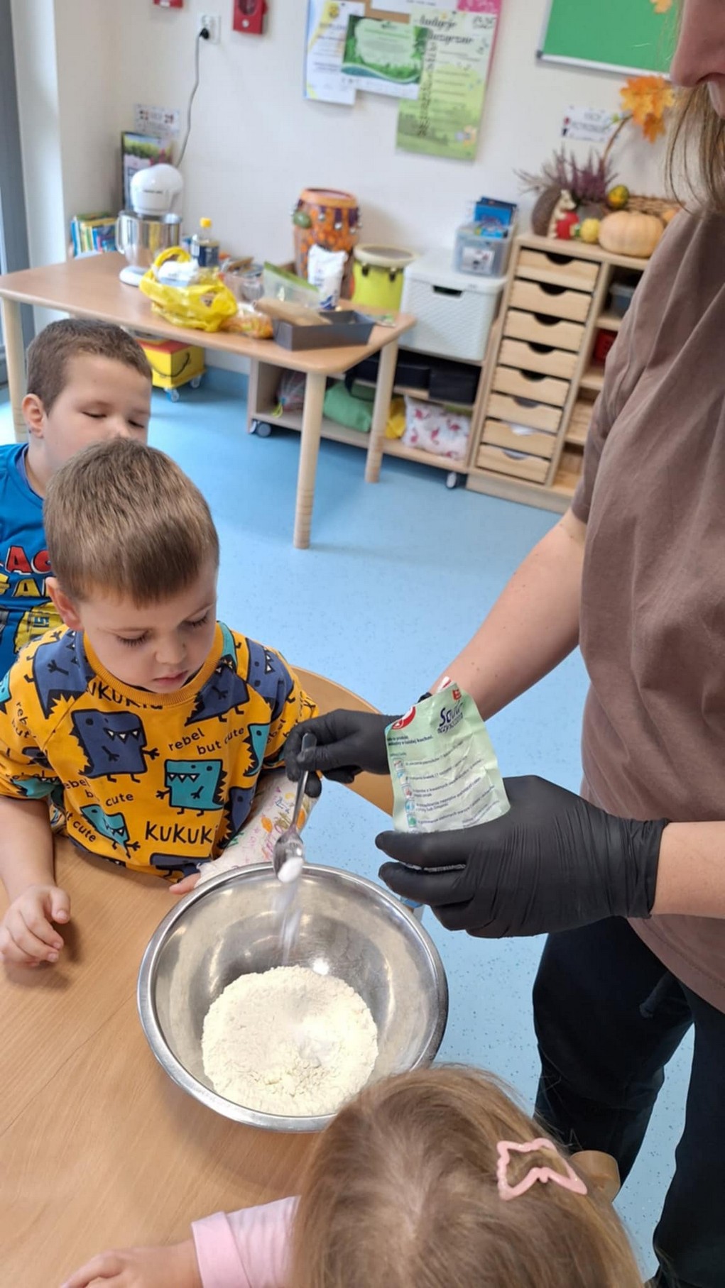 Dziś w naszej grupie „Smerfy” pachniało jesienią i domowym ciepłem. Postanowiliśmy wspólnie upiec ciasto dyniowe, które od kilku dni planowaliśmy przygotować.. Najpierw obejrzeliśmy dynię – dotykaliśmy jej skórki, wąchaliśmy zapach, a potem rozmawialiśmy o tym, jak rośnie i dlaczego to takie wyjątkowe jesienne warzywo. Następnie wspólnie odmierzaliśmy składniki: mąkę, cukier, olej i przyprawy. Każdy miał okazję coś wsypać lub zamieszać, a kiedy masa zaczęła pachnieć cynamonem i wanilią, w sali zrobiło się naprawdę przytulnie. Kiedy ciasto trafiło do piekarnika, cierpliwie czekaliśmy, aż się upiecze. Degustacja była prawdziwą ucztą! Każdy Smerf z dumą próbował swojego kawałka, a na buziach malowała się satysfakcja i radość ze wspólnego działania. To był piękny dzień, pełen ciepła, współpracy i jesiennych zapachów.