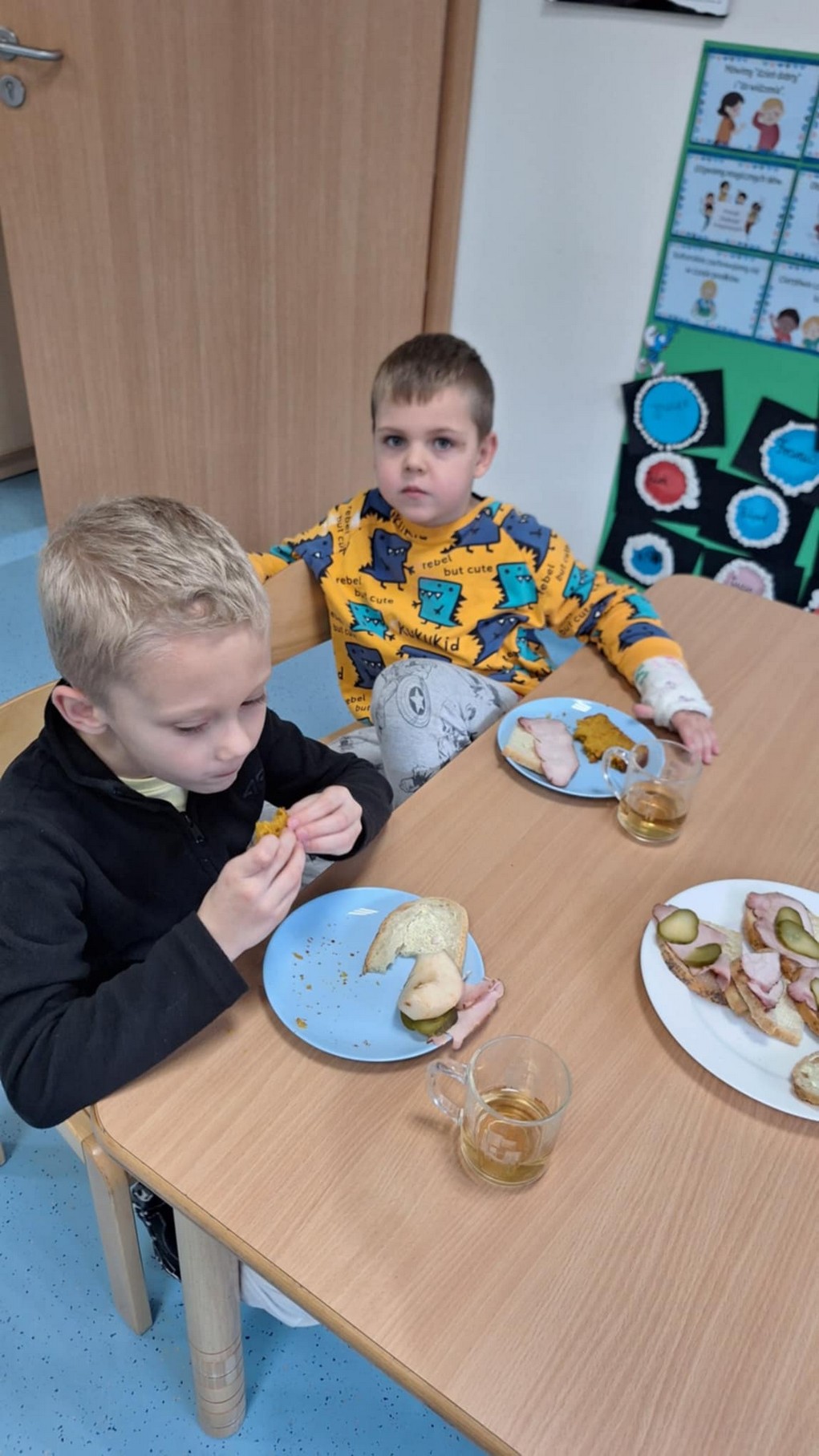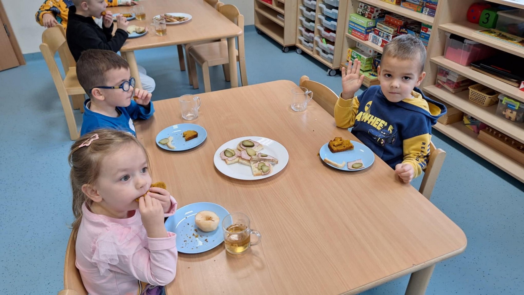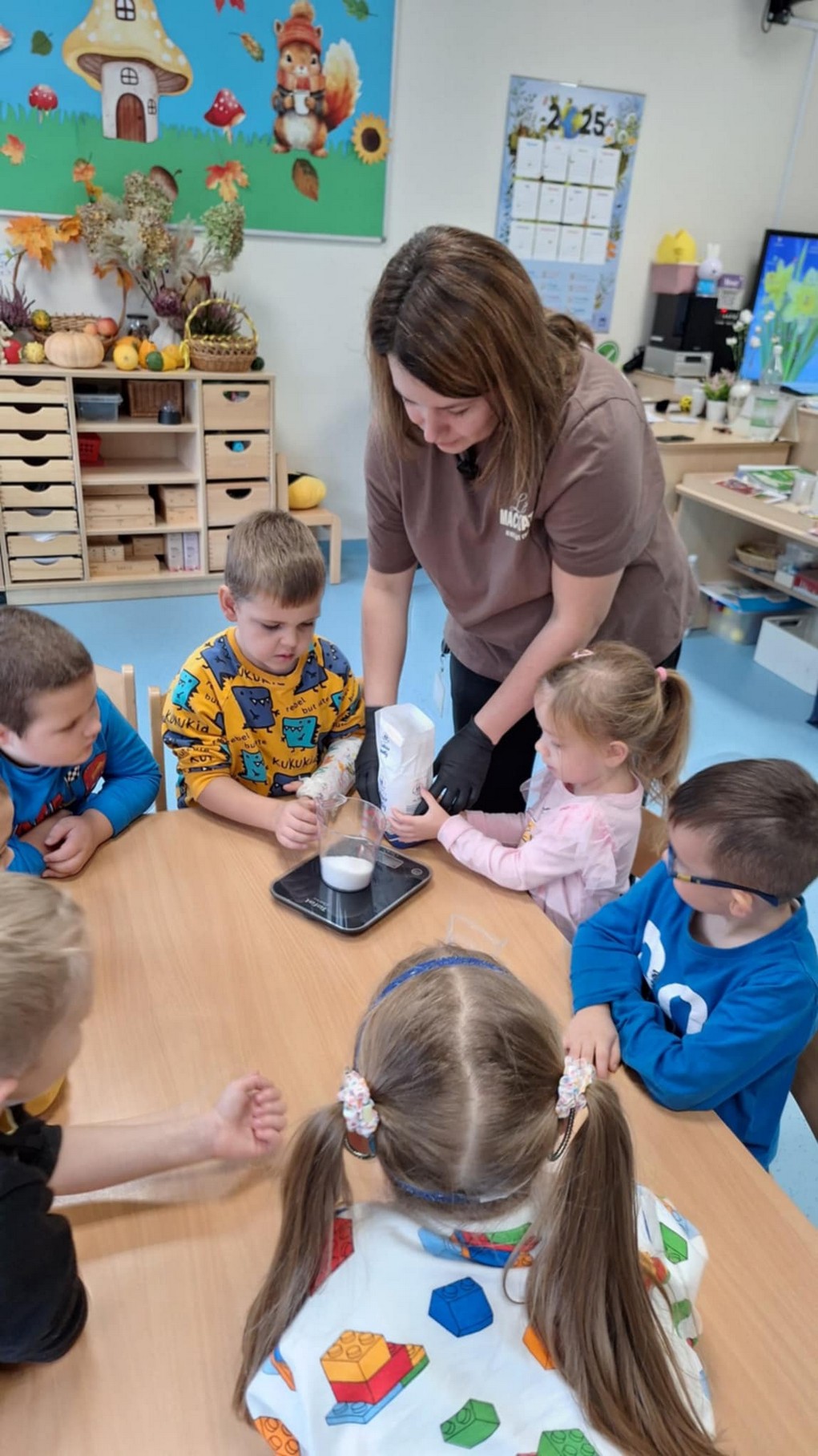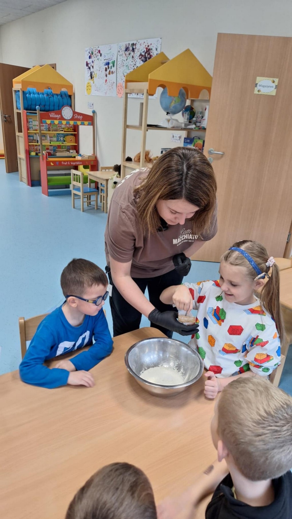 Dziś w naszej grupie „Smerfy” pachniało jesienią i domowym ciepłem. Postanowiliśmy wspólnie upiec ciasto dyniowe, które od kilku dni planowaliśmy przygotować.. Najpierw obejrzeliśmy dynię – dotykaliśmy jej skórki, wąchaliśmy zapach, a potem rozmawialiśmy o tym, jak rośnie i dlaczego to takie wyjątkowe jesienne warzywo. Następnie wspólnie odmierzaliśmy składniki: mąkę, cukier, olej i przyprawy. Każdy miał okazję coś wsypać lub zamieszać, a kiedy masa zaczęła pachnieć cynamonem i wanilią, w sali zrobiło się naprawdę przytulnie. Kiedy ciasto trafiło do piekarnika, cierpliwie czekaliśmy, aż się upiecze. Degustacja była prawdziwą ucztą! Każdy Smerf z dumą próbował swojego kawałka, a na buziach malowała się satysfakcja i radość ze wspólnego działania. To był piękny dzień, pełen ciepła, współpracy i jesiennych zapachów.