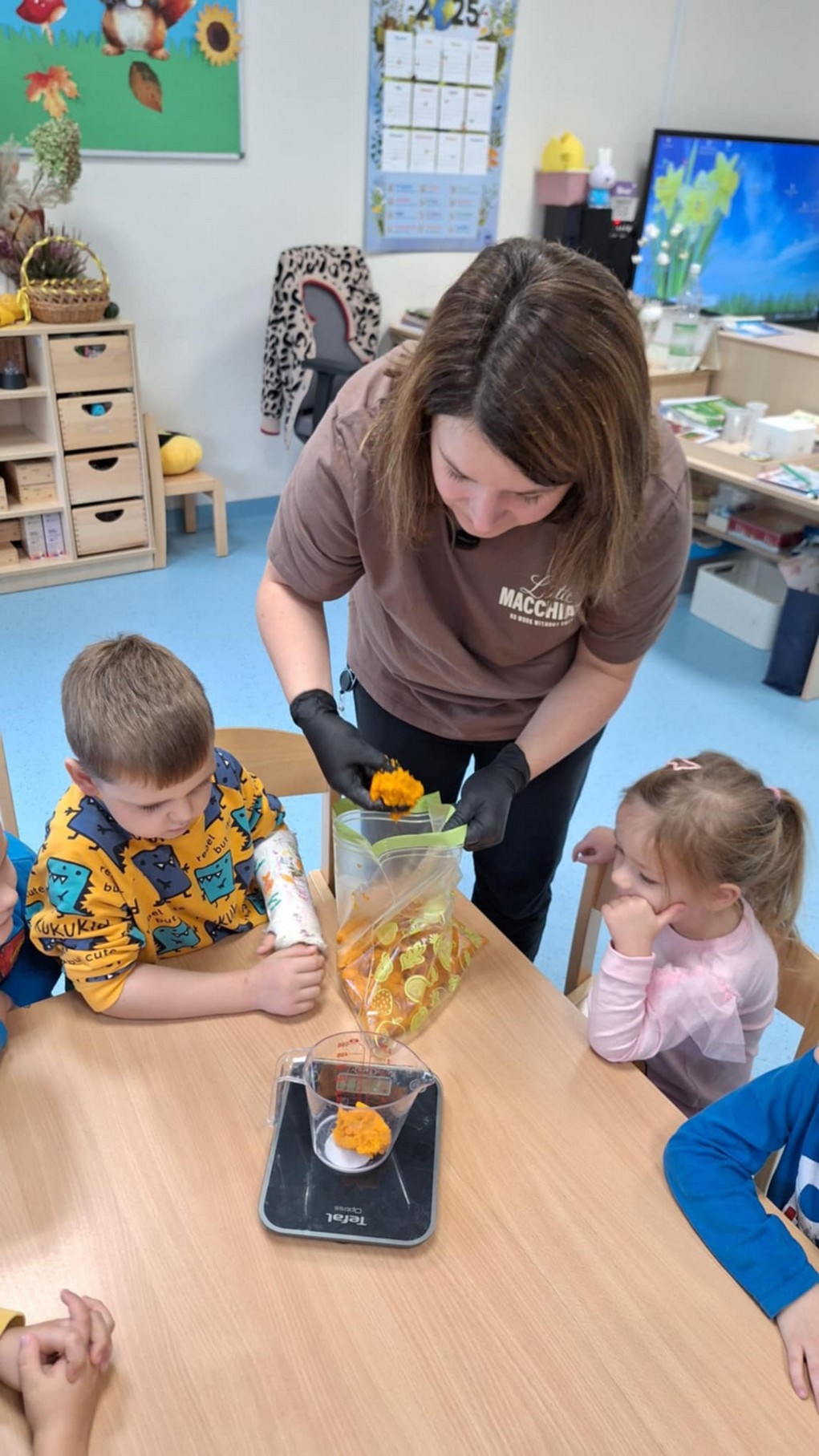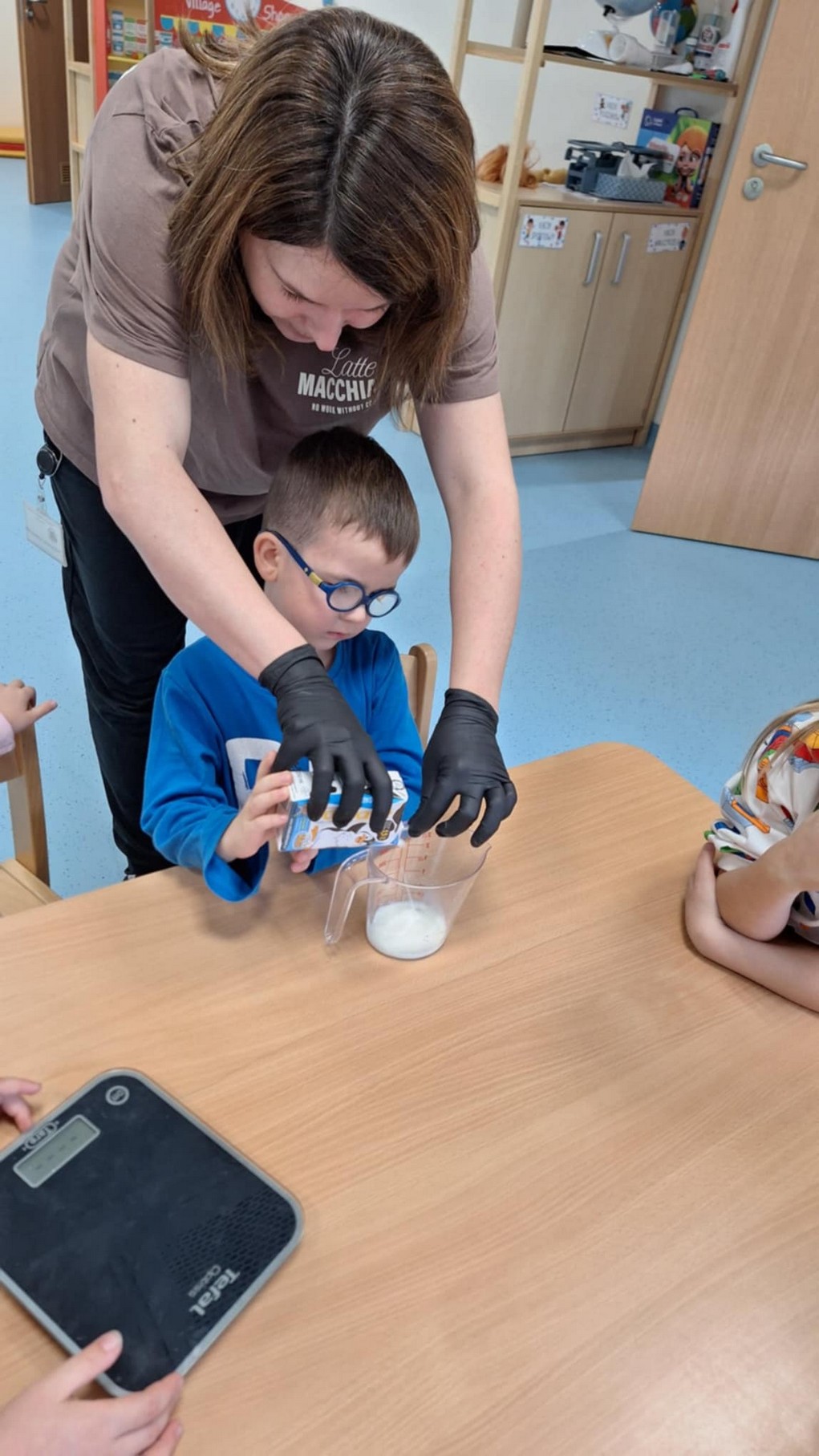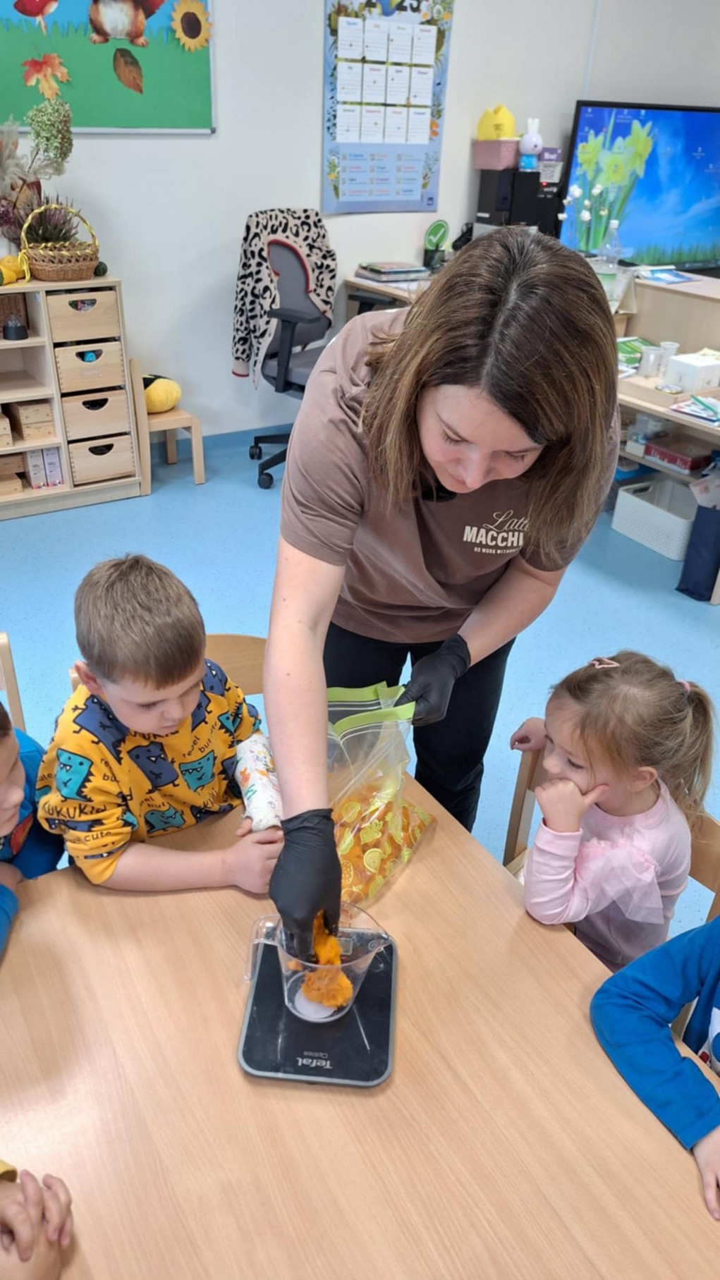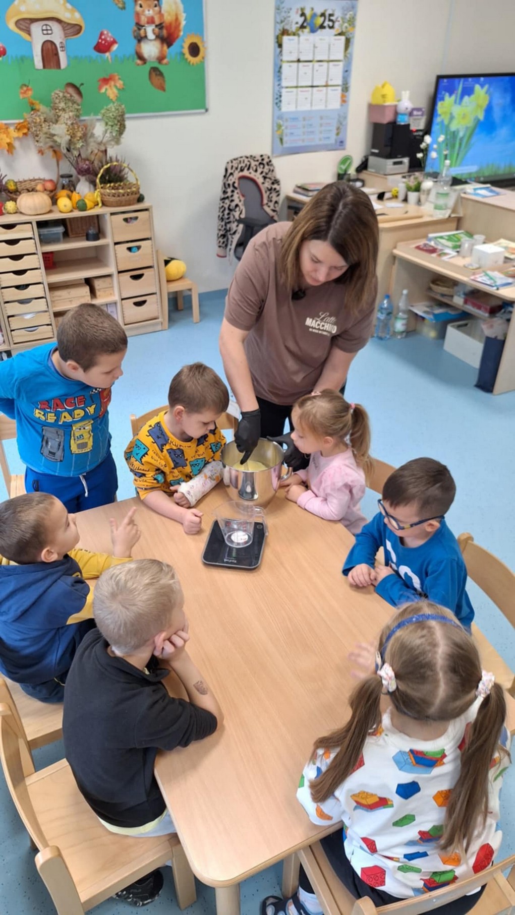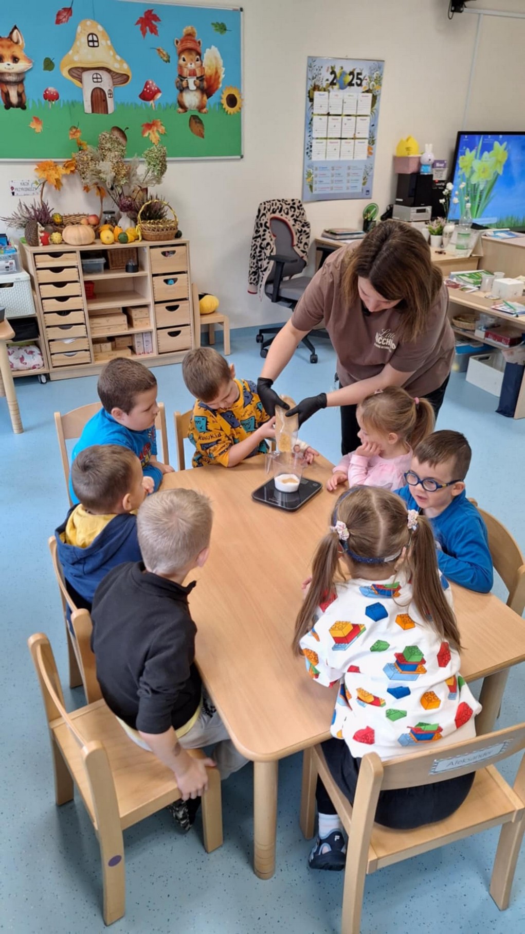 Dziś w naszej grupie „Smerfy” pachniało jesienią i domowym ciepłem. Postanowiliśmy wspólnie upiec ciasto dyniowe, które od kilku dni planowaliśmy przygotować.. Najpierw obejrzeliśmy dynię – dotykaliśmy jej skórki, wąchaliśmy zapach, a potem rozmawialiśmy o tym, jak rośnie i dlaczego to takie wyjątkowe jesienne warzywo. Następnie wspólnie odmierzaliśmy składniki: mąkę, cukier, olej i przyprawy. Każdy miał okazję coś wsypać lub zamieszać, a kiedy masa zaczęła pachnieć cynamonem i wanilią, w sali zrobiło się naprawdę przytulnie. Kiedy ciasto trafiło do piekarnika, cierpliwie czekaliśmy, aż się upiecze. Degustacja była prawdziwą ucztą! Każdy Smerf z dumą próbował swojego kawałka, a na buziach malowała się satysfakcja i radość ze wspólnego działania. To był piękny dzień, pełen ciepła, współpracy i jesiennych zapachów.