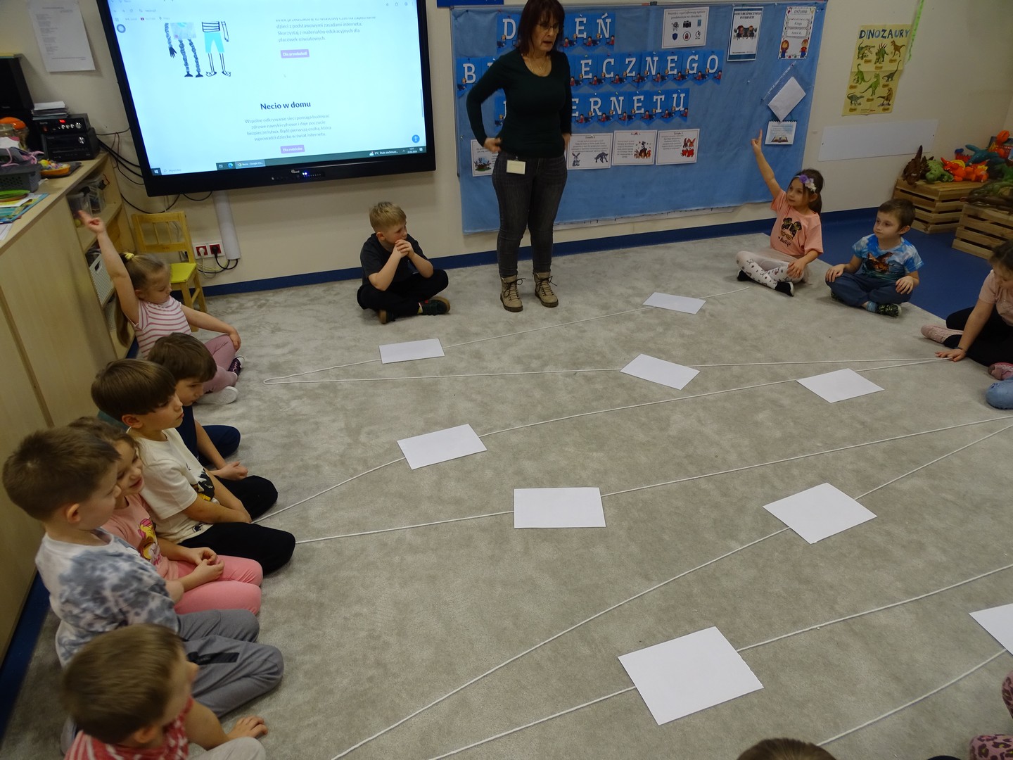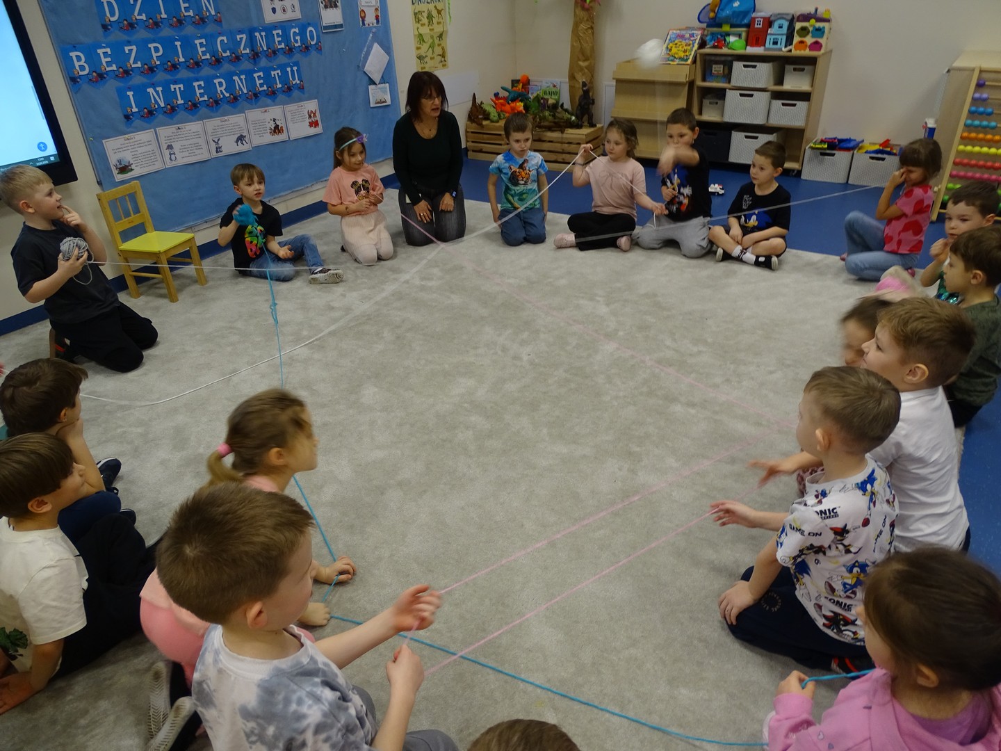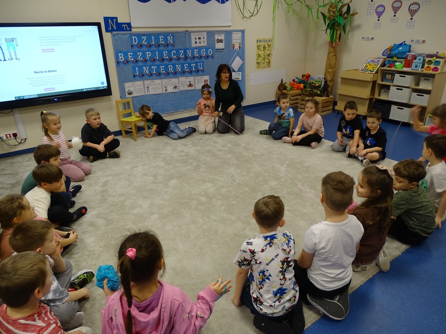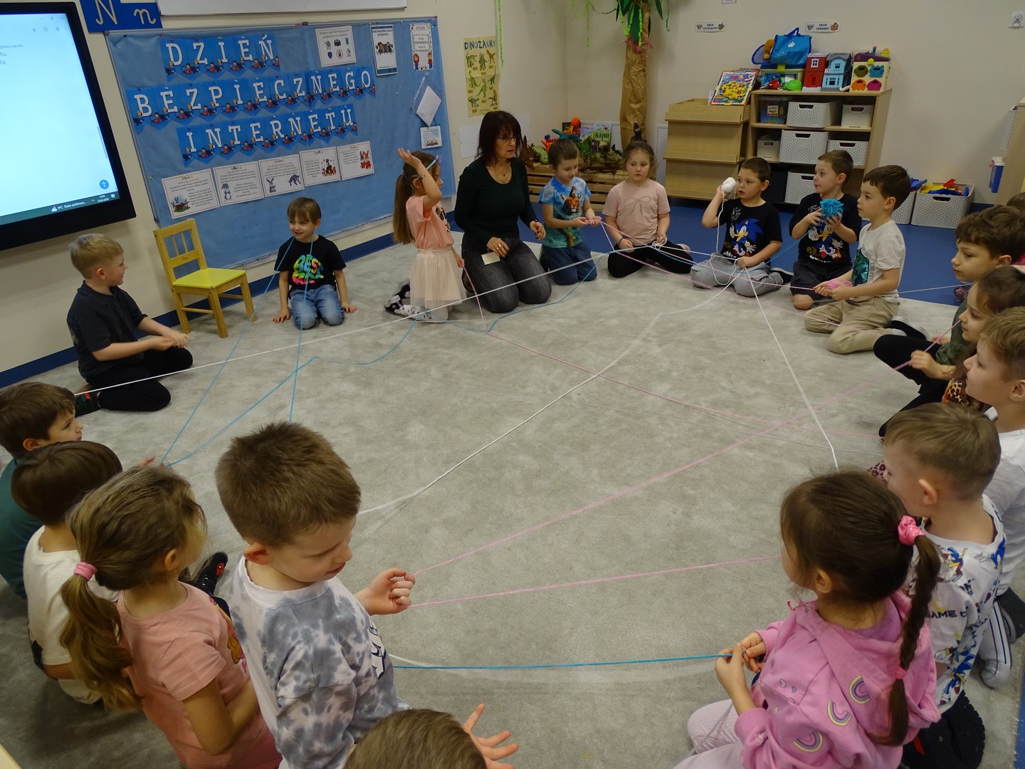 We wtorek 24 lutego obchodziliśmy w naszej grupie Dzień Bezpiecznego Internetu, aby już od najmłodszych lat uczyć dzieci, jak korzystać z technologii w sposób bezpieczny i odpowiedzialny. Podczas zajęć dzieci poznawały podstawowe zasady bezpiecznego korzystania z Internetu – dowiedziały się m.in, że nie wszystkie informacje w sieci są prawdziwe, jak chronić swoje dane oraz jak unikać kontaktu z nieznajomymi online, a także wskazywały korzyści i zagrożenie jakie wynikają z korzystania z Internetu. Tworzyły „sieć internetową” z włóczki, poznając w zabawowy sposób, jak różne elementy są ze sobą połączone. Brały udział w quizie, dzięki któremu utrwaliły podstawowe zasady bezpieczeństwa w sieci. Cały dzień był pełen nauki połączonej z zabawą – Sówki uczyły się, jak mądrze i bezpiecznie korzystać z nowych technologii, a przy tym świetnie się bawiły. Wesołe zabawy przypomniały wszystkim, że bezpieczeństwo w sieci jest bardzo ważne, nawet dla najmłodszych.