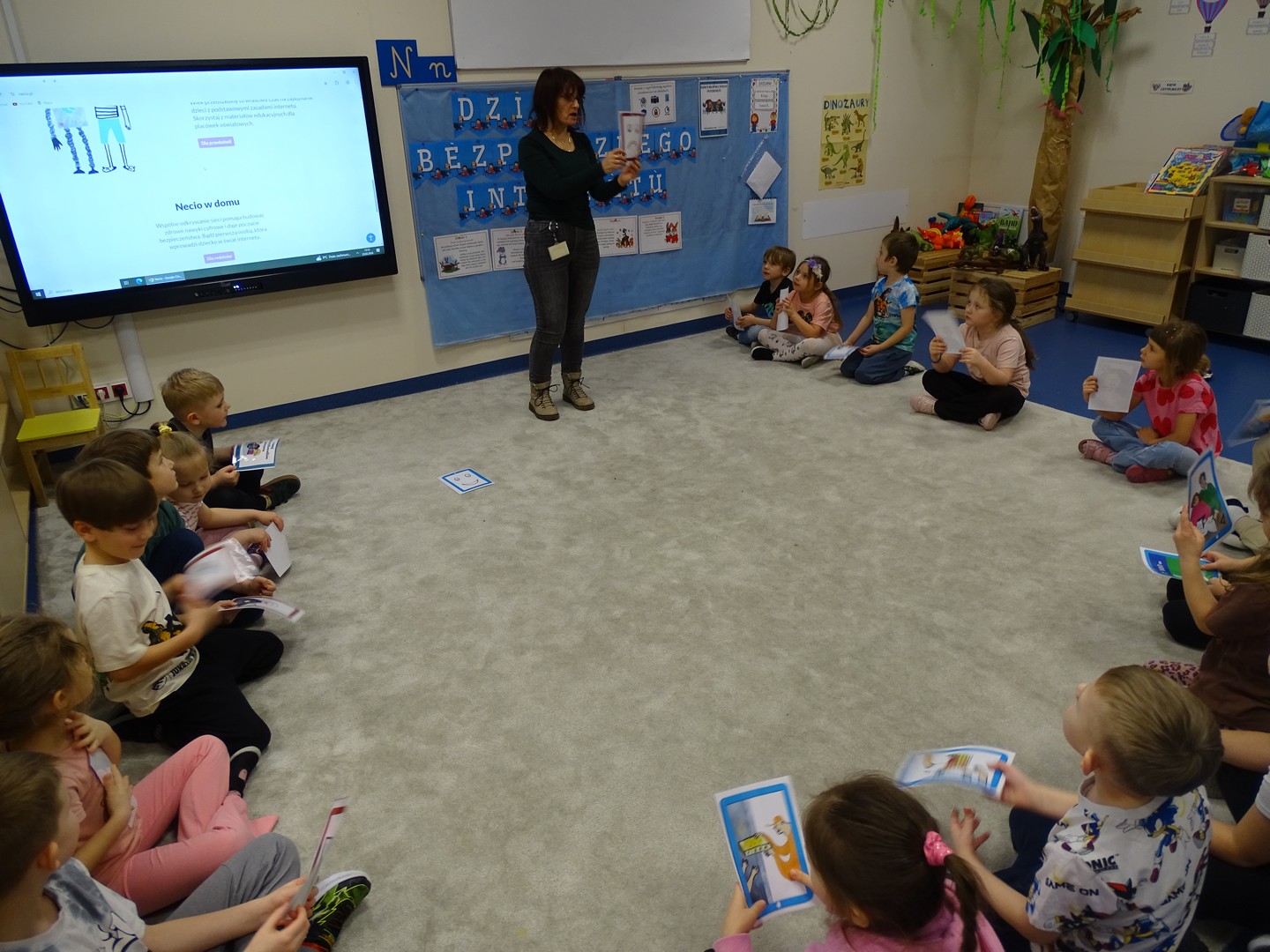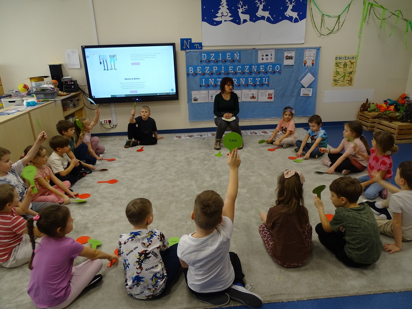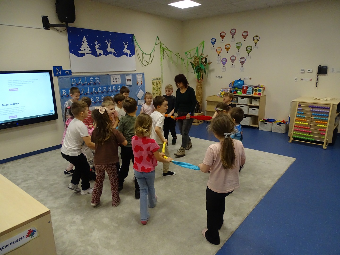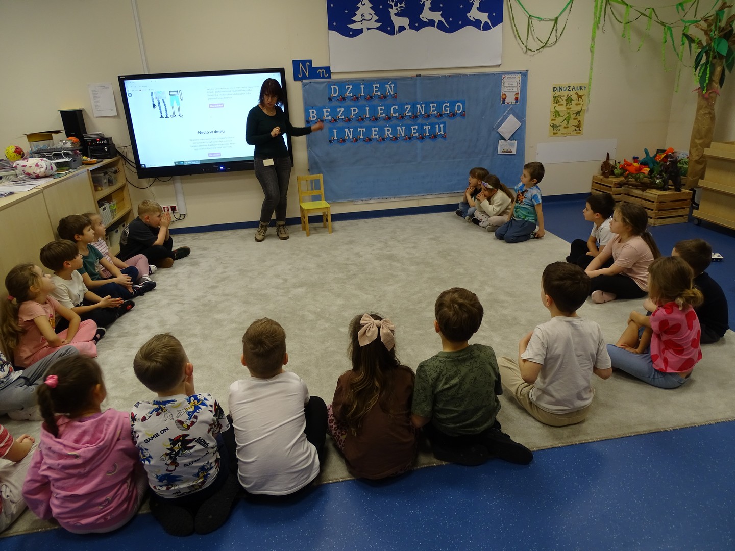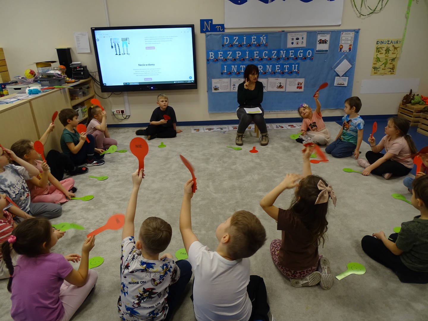 We wtorek 24 lutego obchodziliśmy w naszej grupie Dzień Bezpiecznego Internetu, aby już od najmłodszych lat uczyć dzieci, jak korzystać z technologii w sposób bezpieczny i odpowiedzialny. Podczas zajęć dzieci poznawały podstawowe zasady bezpiecznego korzystania z Internetu – dowiedziały się m.in, że nie wszystkie informacje w sieci są prawdziwe, jak chronić swoje dane oraz jak unikać kontaktu z nieznajomymi online, a także wskazywały korzyści i zagrożenie jakie wynikają z korzystania z Internetu. Tworzyły „sieć internetową” z włóczki, poznając w zabawowy sposób, jak różne elementy są ze sobą połączone. Brały udział w quizie, dzięki któremu utrwaliły podstawowe zasady bezpieczeństwa w sieci. Cały dzień był pełen nauki połączonej z zabawą – Sówki uczyły się, jak mądrze i bezpiecznie korzystać z nowych technologii, a przy tym świetnie się bawiły. Wesołe zabawy przypomniały wszystkim, że bezpieczeństwo w sieci jest bardzo ważne, nawet dla najmłodszych.