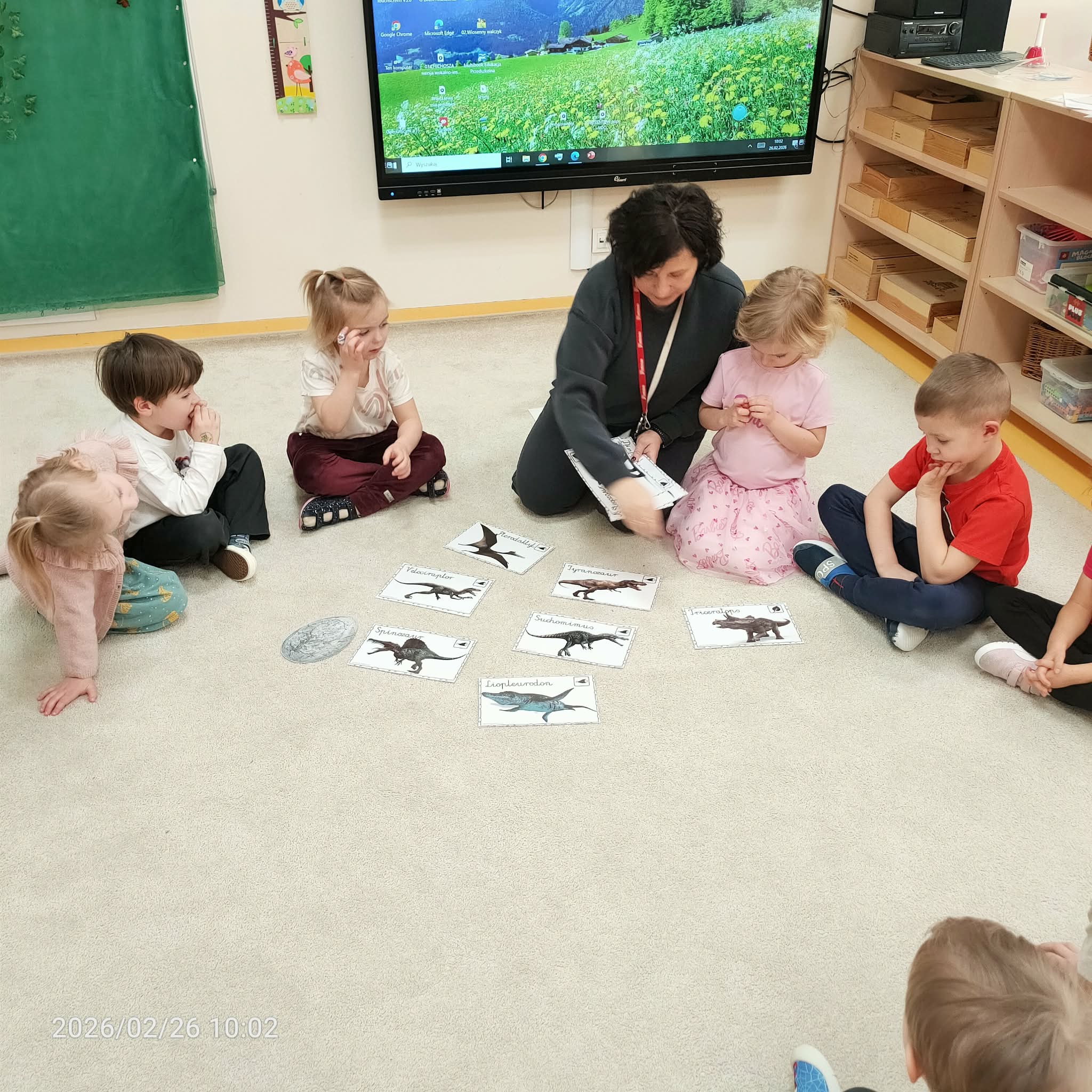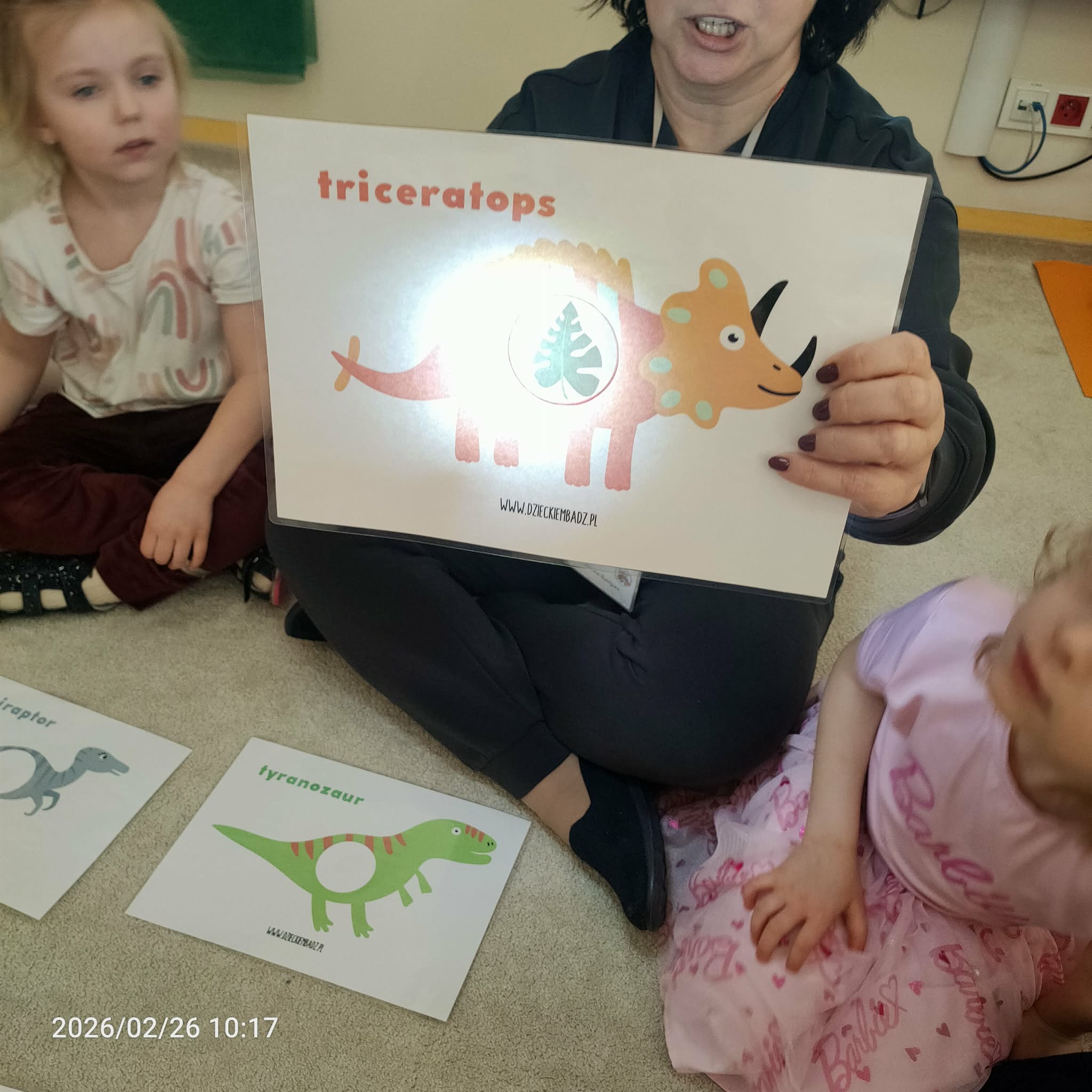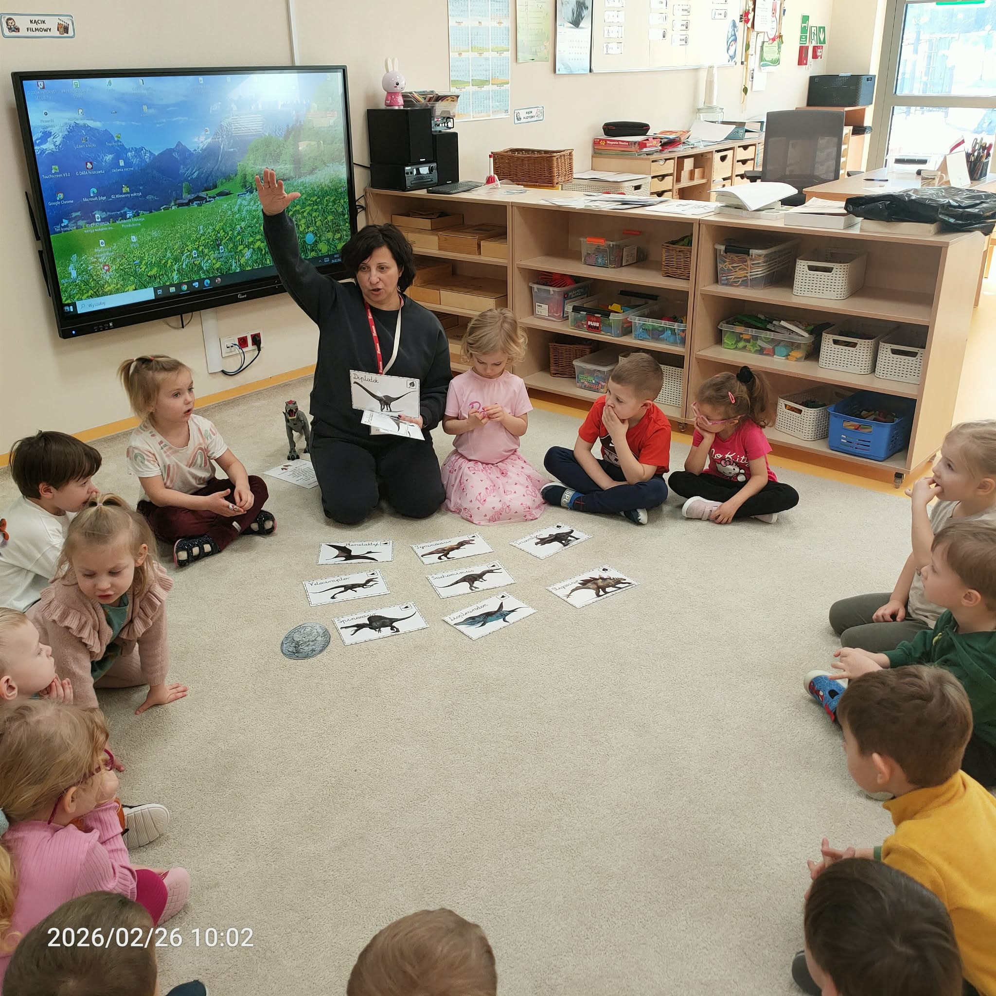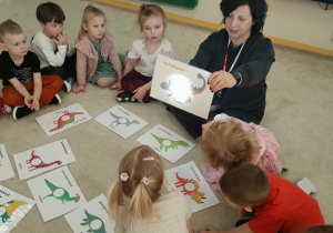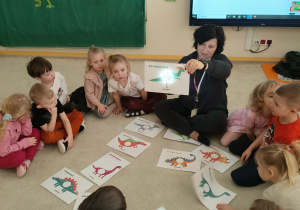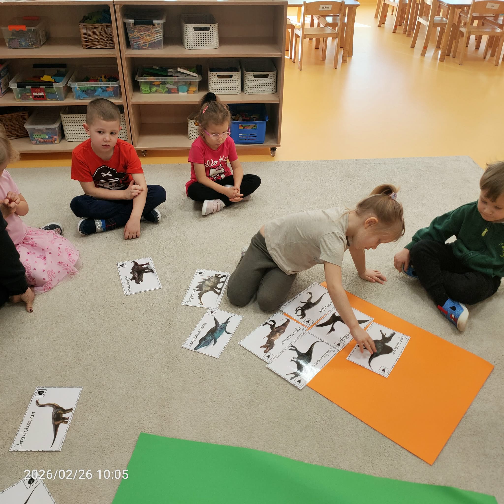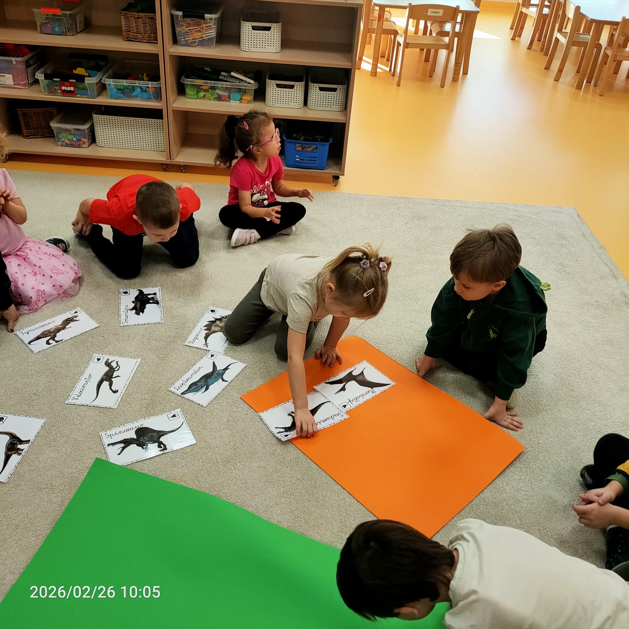 Podczas zajęć dzieci dowiedziały się, jak wyglądały roślinożerne i mięsożerne dinozaury. Przedstawiono je na specjalnym schemacie, gdzie mięsożerne dinozaury były oznaczone różowym kołem, a roślinożerne zielonym. Następnie dzieci przeprowadziły zabawę segregacji, umieszczając dinozaury we właściwych grupach.