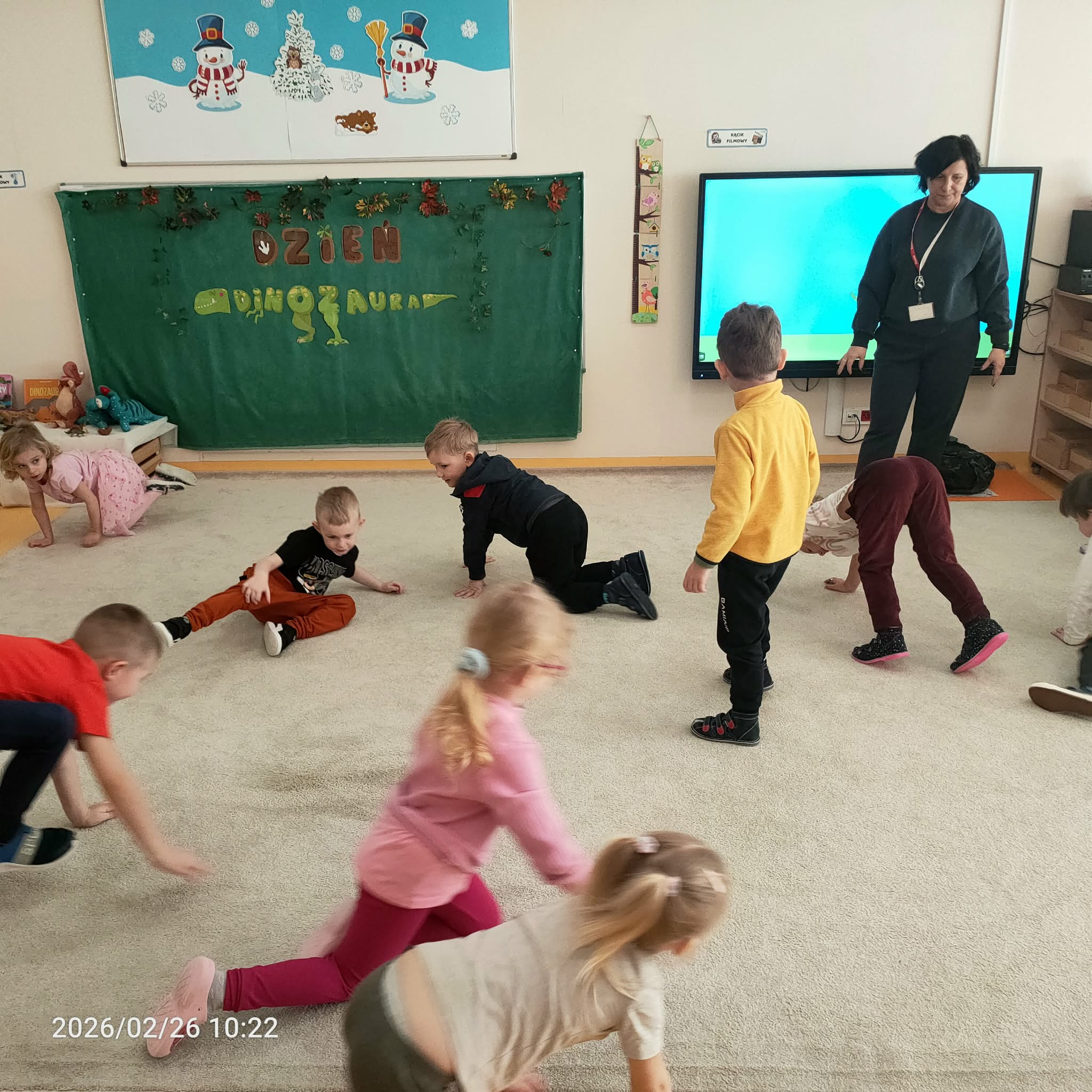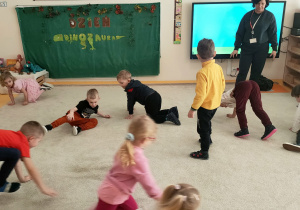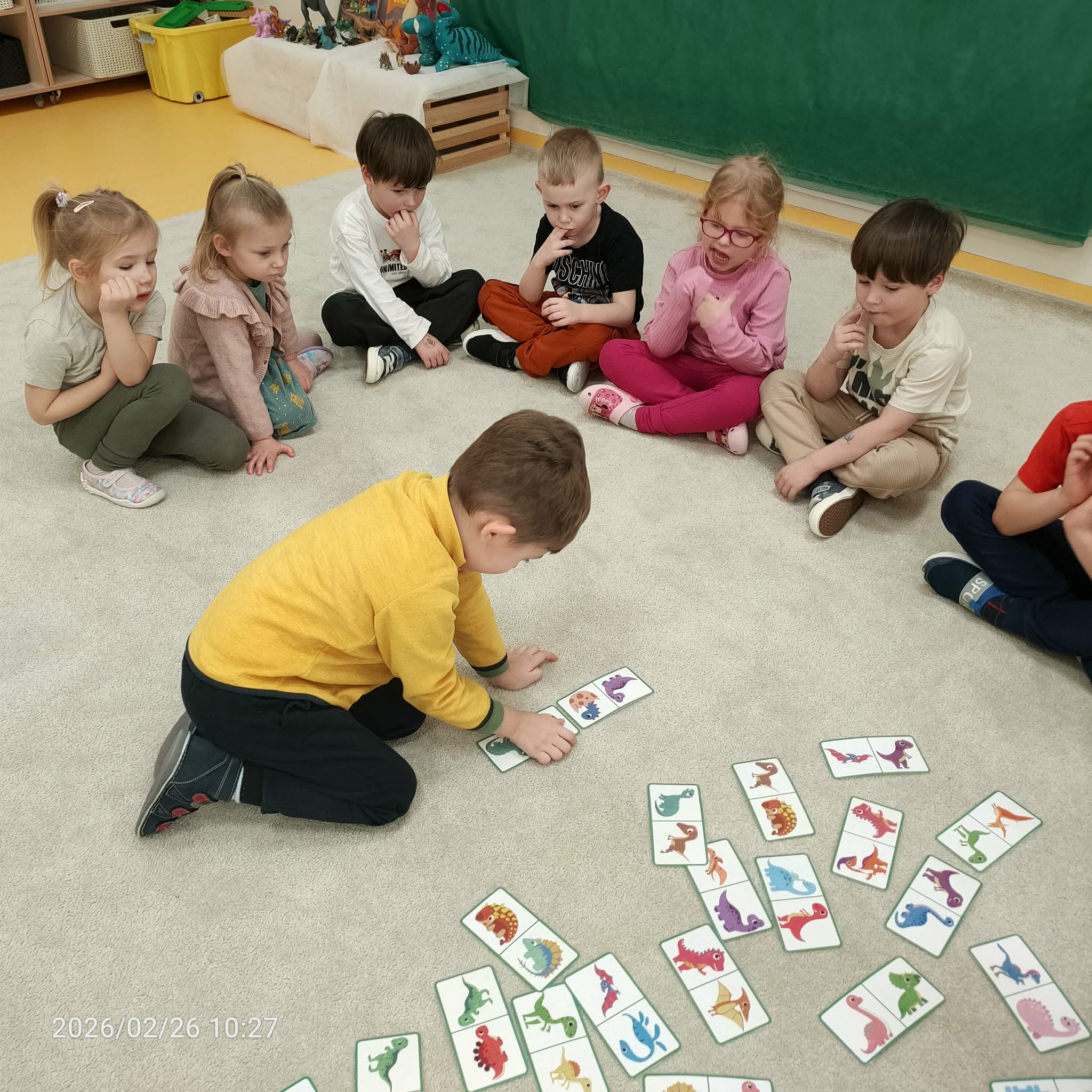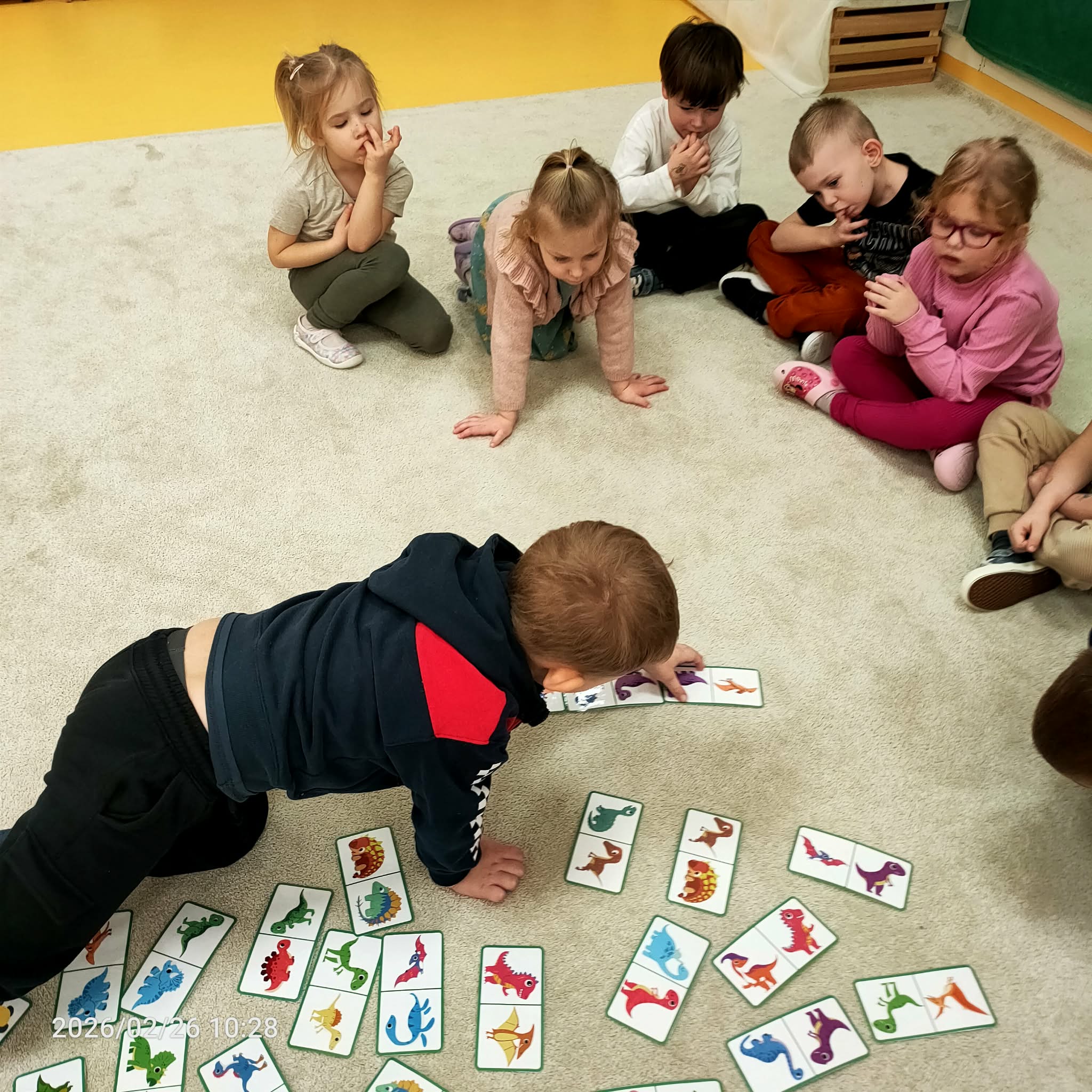 W ramach zajęć dzieci naśladowały dinozaury, odgrywając ruchowe ćwiczenia naśladujące ich ruchy i zachowania. Po tej części odbyła się również zabawa domino z motywem dinozaurów, która była świetną okazją do nauki liczenia i rozwijania zdolności manualnych.