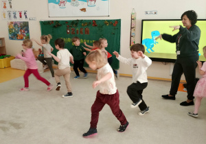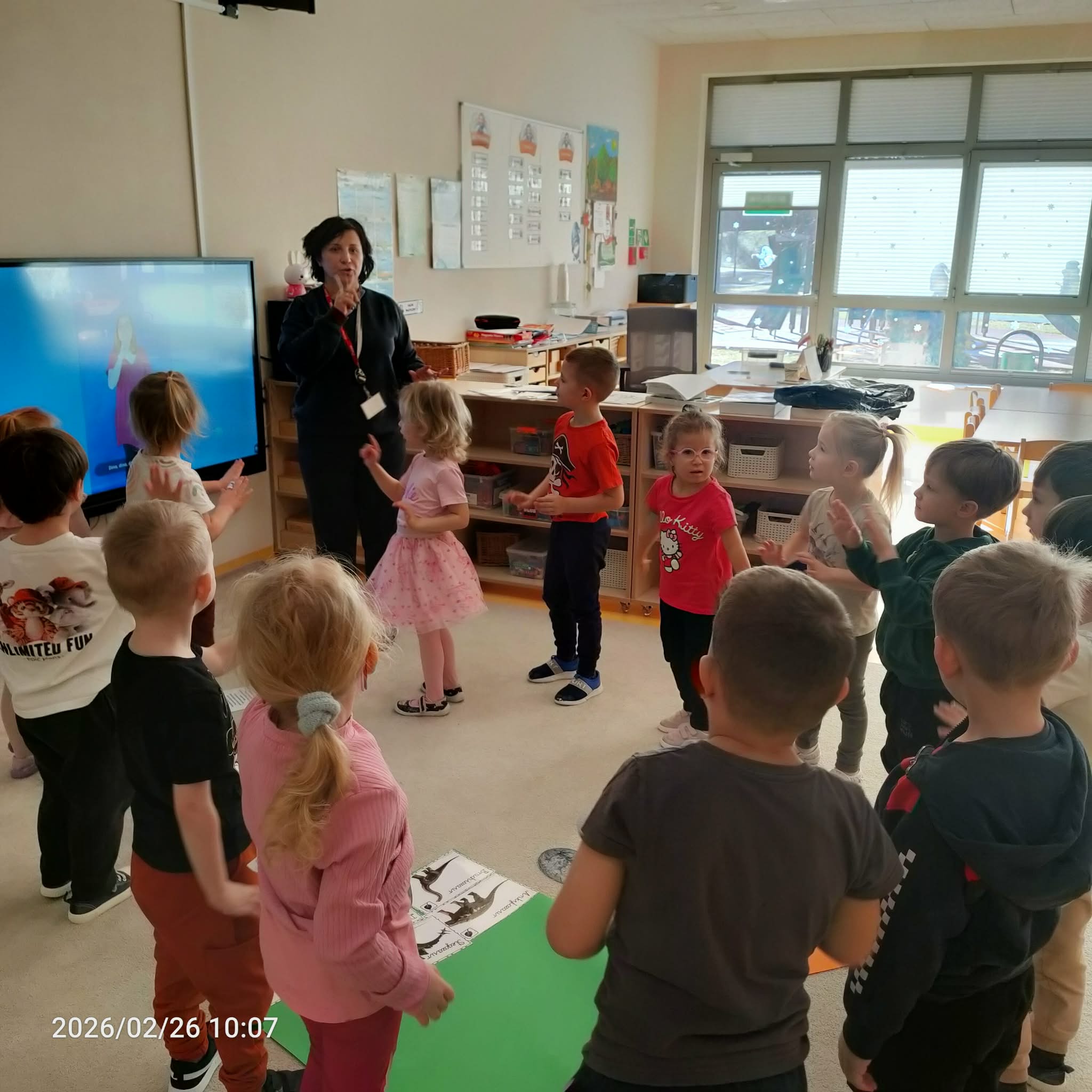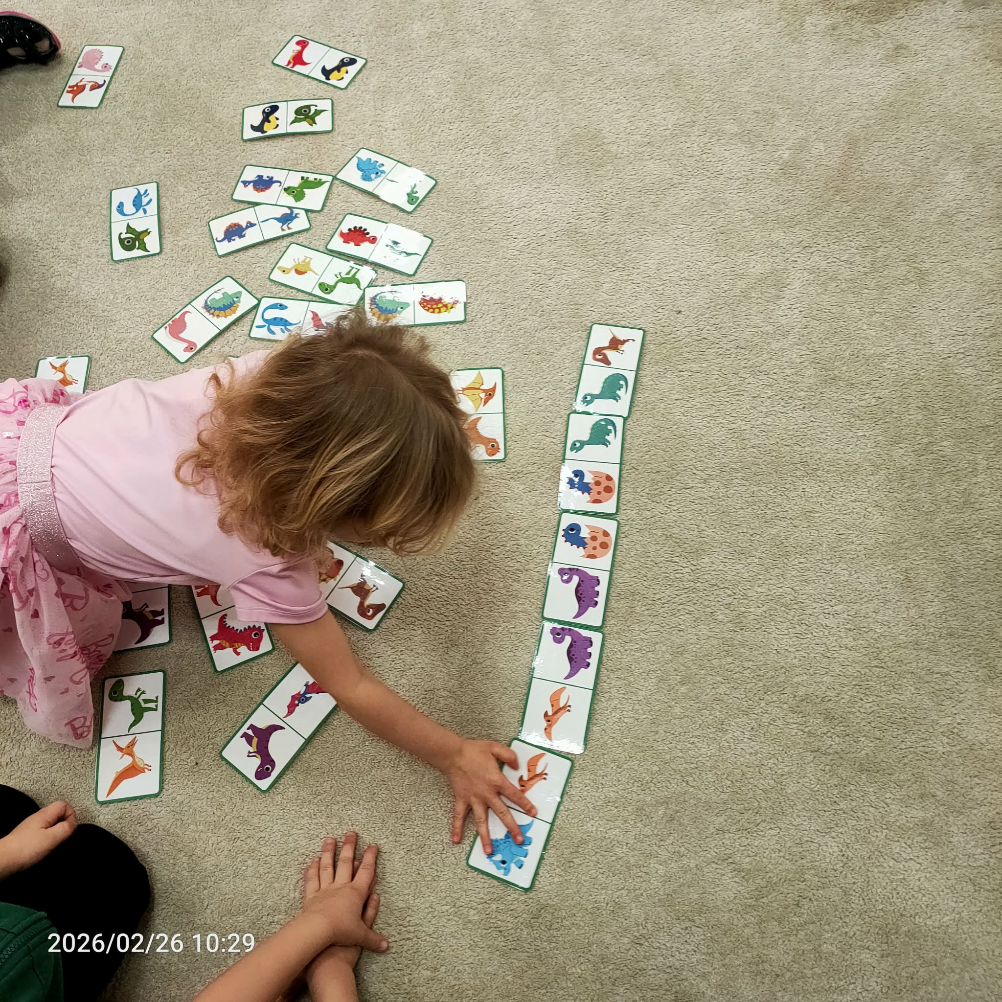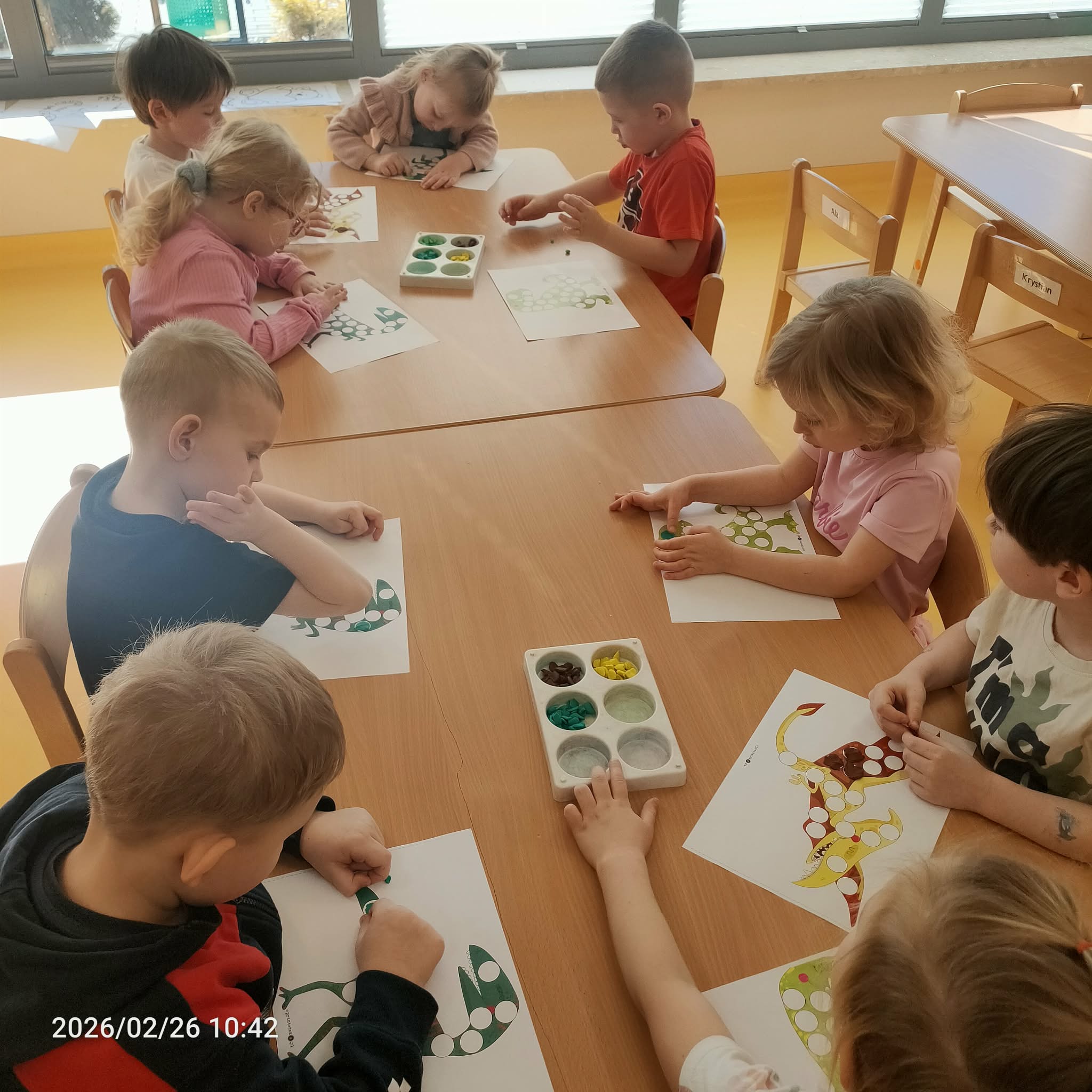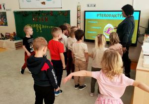 W ramach zajęć dzieci naśladowały dinozaury, odgrywając ruchowe ćwiczenia naśladujące ich ruchy i zachowania. Po tej części odbyła się również zabawa domino z motywem dinozaurów, która była świetną okazją do nauki liczenia i rozwijania zdolności manualnych.