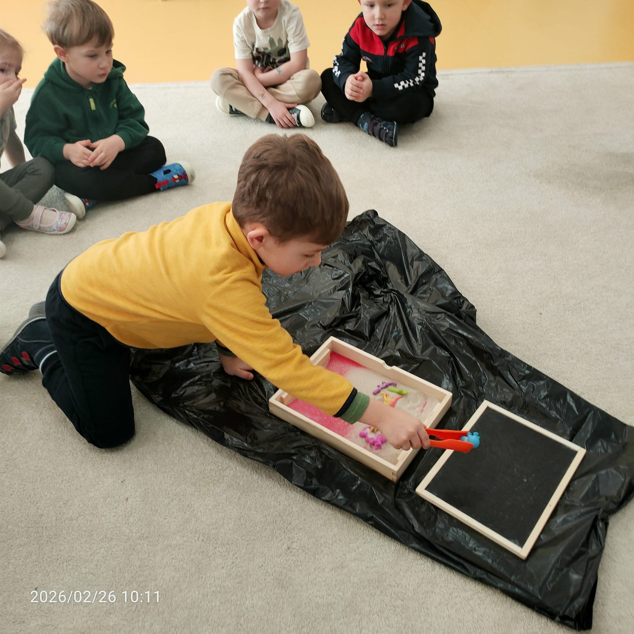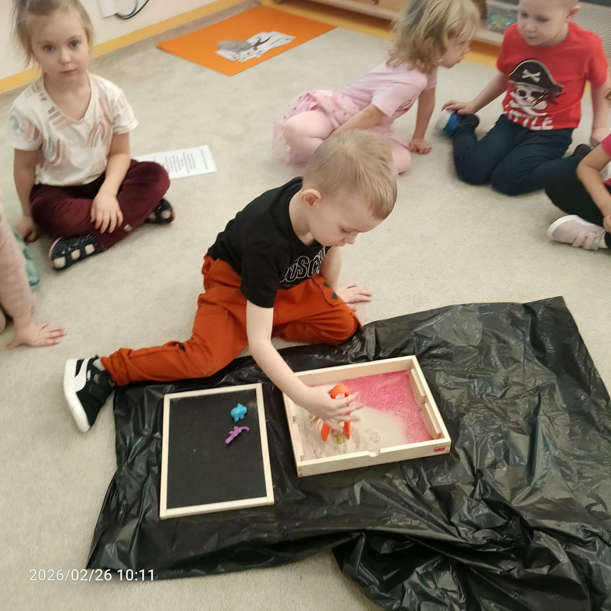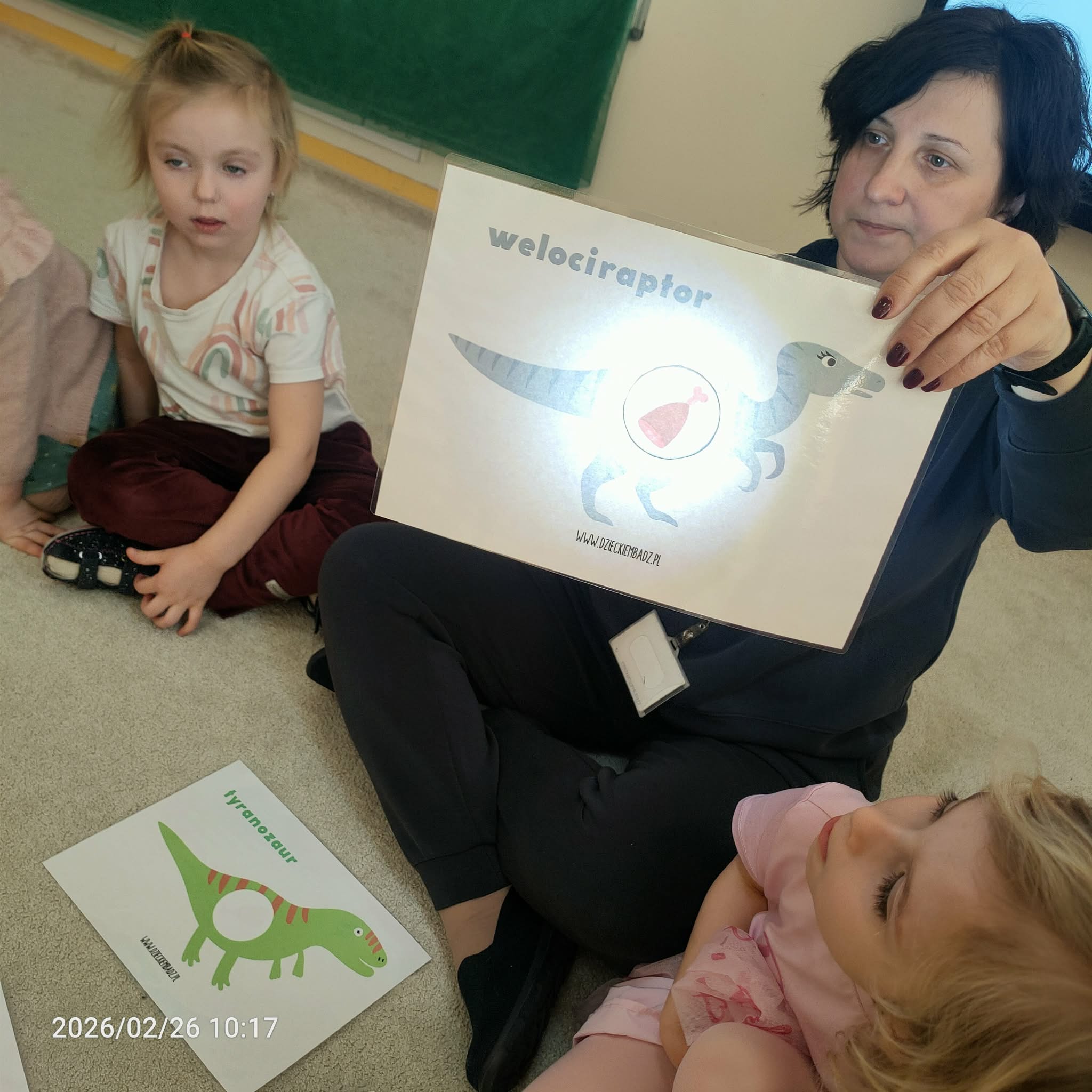 Kolejną atrakcją była zabawa dywanowa z latarką, podczas której dzieci odgrywały role dinozaurów, poszukując „prehistorycznych skarbów” ukrytych pod dywanem. To ćwiczenie rozwijało spostrzegawczość i współpracę w grupie.