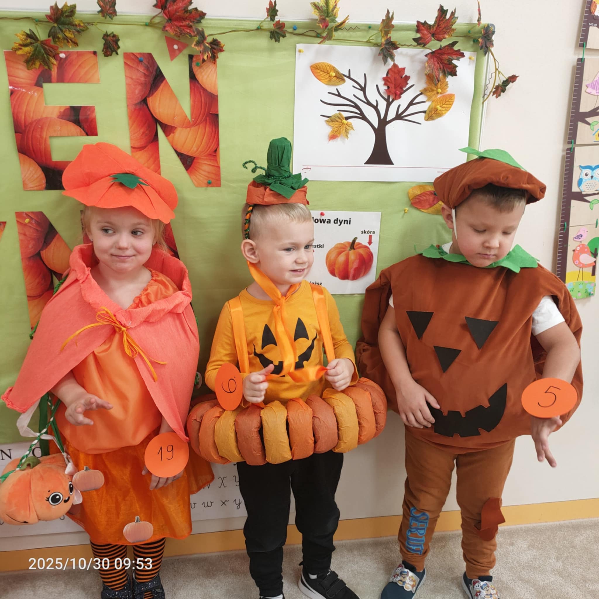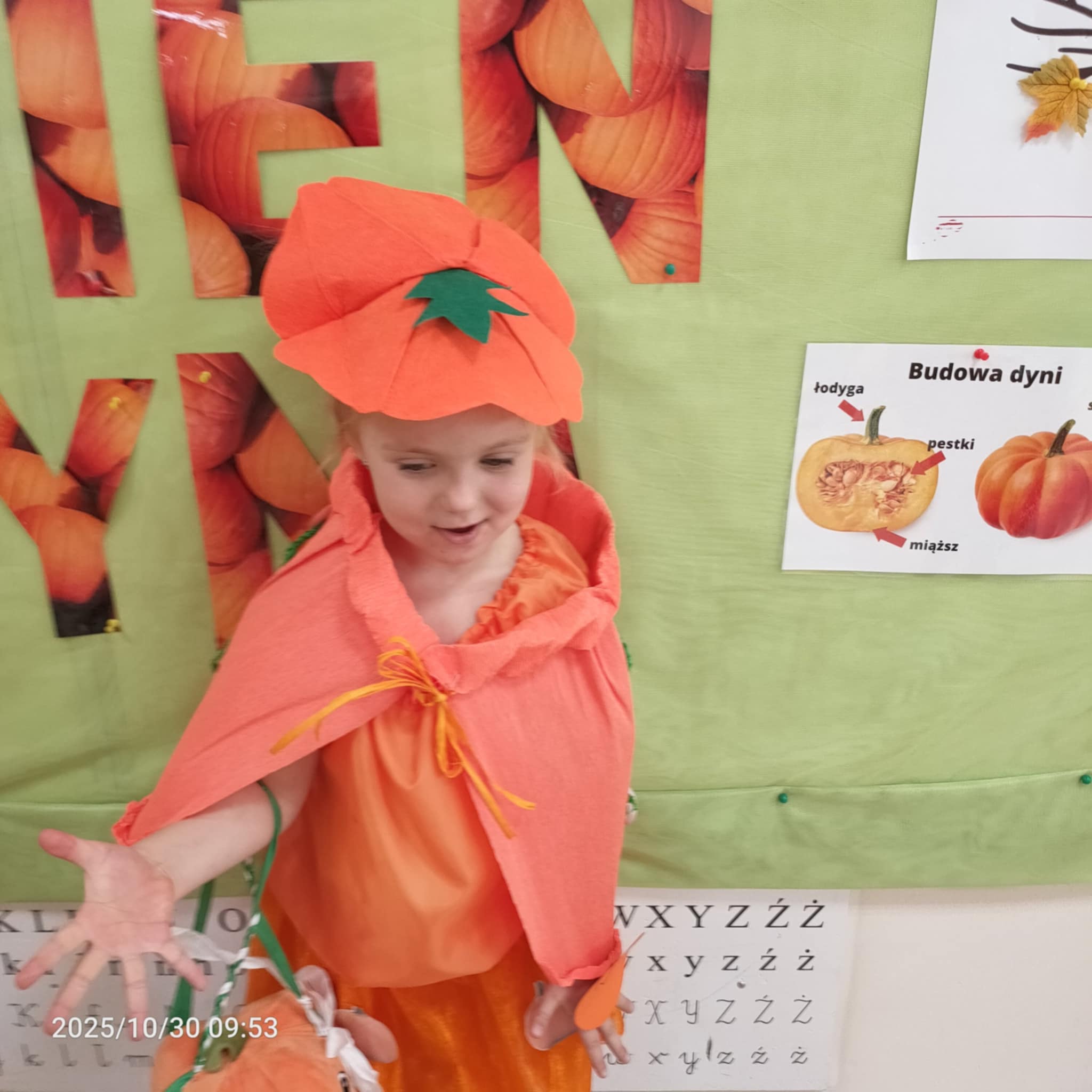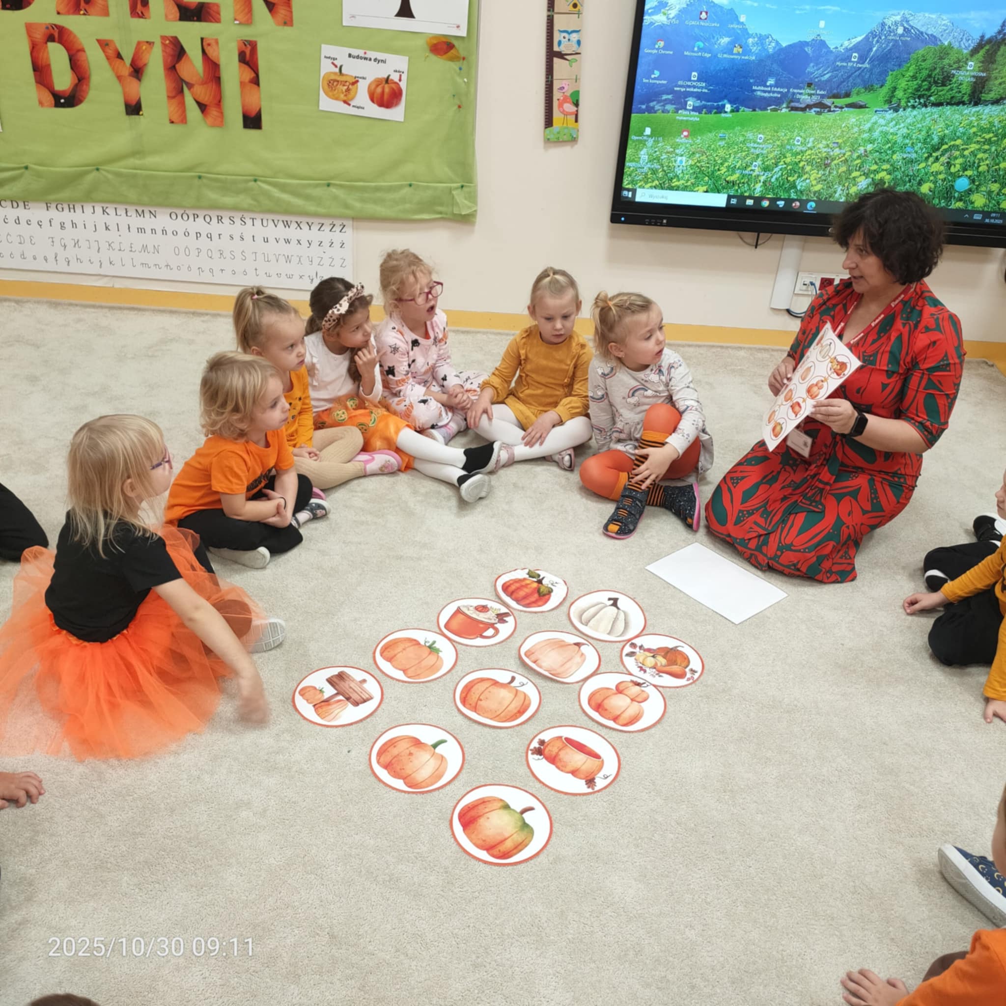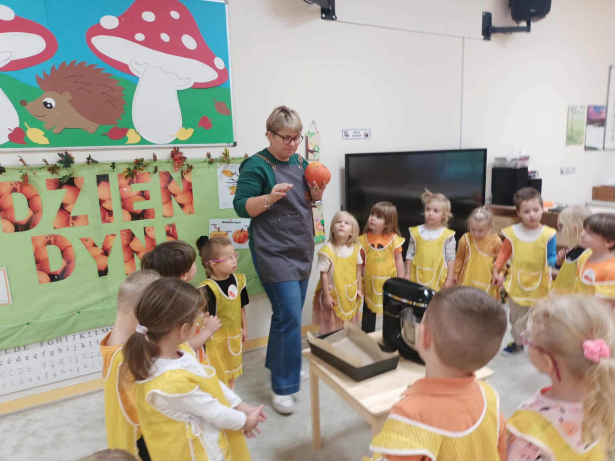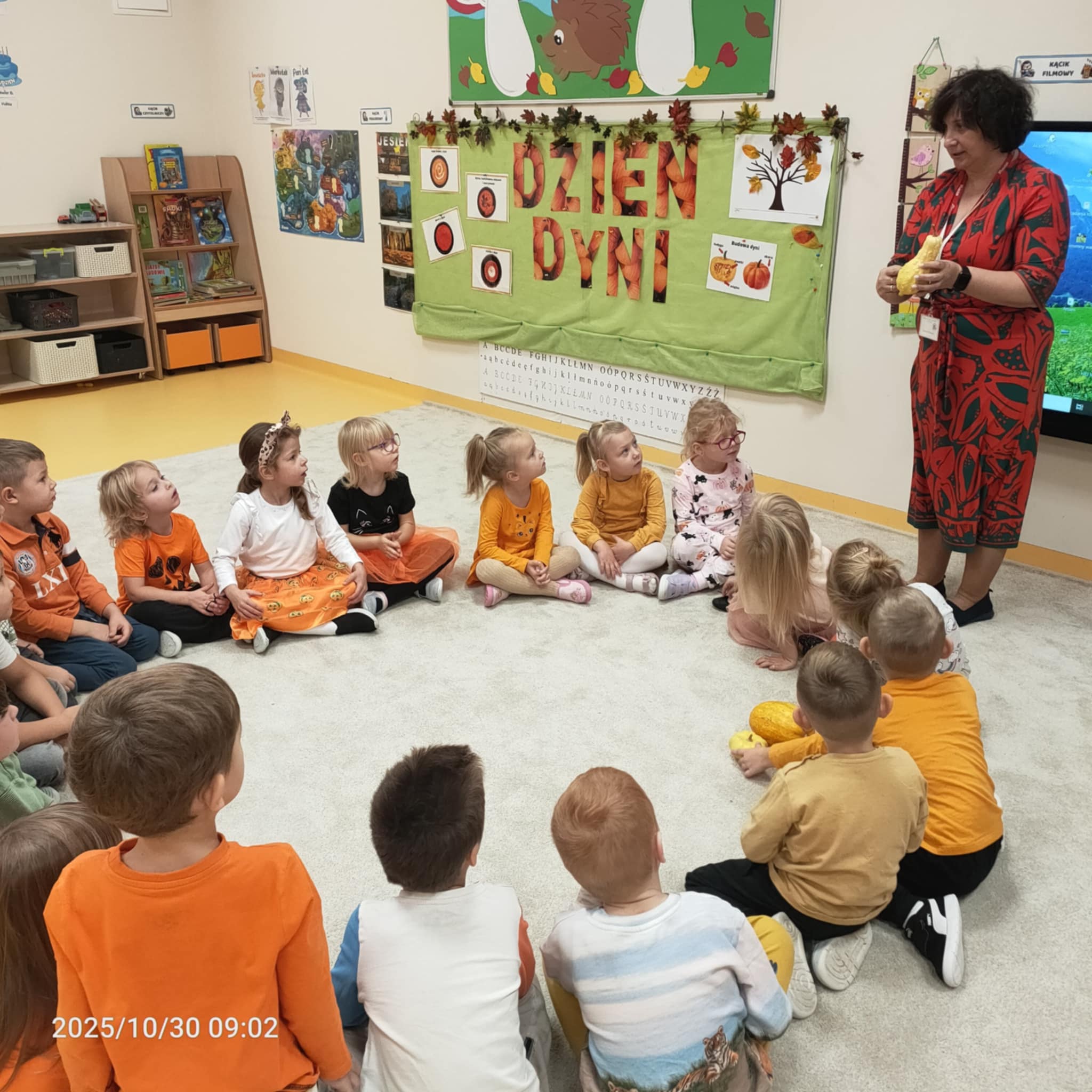Dnia 30 października 2025 roku w grupie Jeżyki obchodziliśmy wyjątkowy Dzień Dyni. Tego dnia dzieci miały okazję poznać różne kształty dyni oraz zgłębić jej budowę. Dowiedziały się również, jakie pyszne potrawy można przygotować z dyni, co rozbudziło ich ciekawość kulinarnej strony tego warzywa.