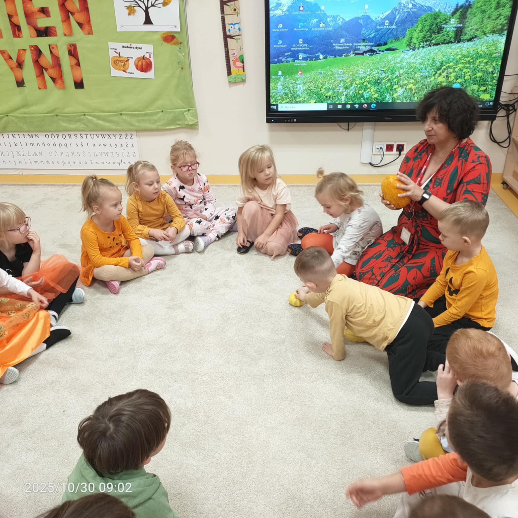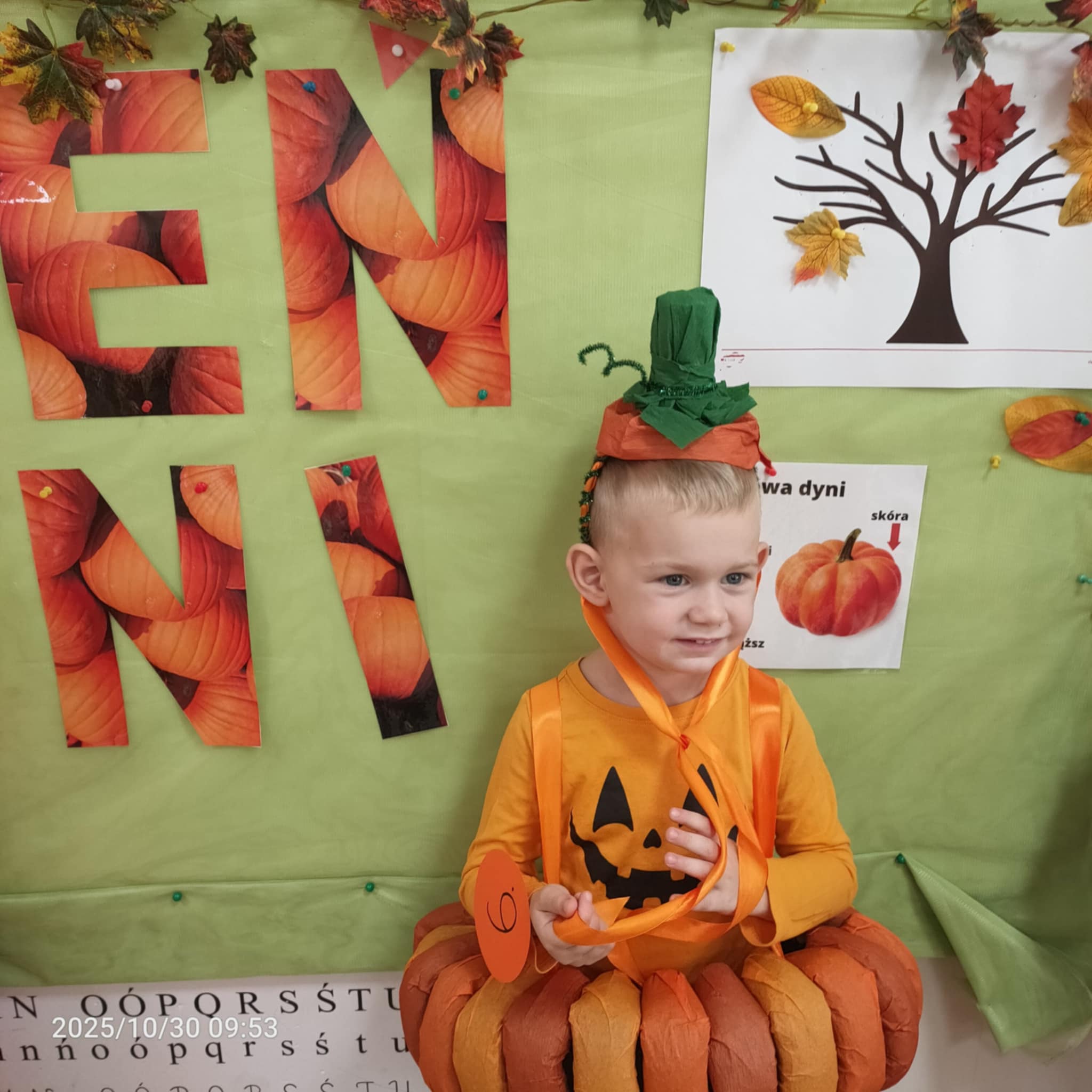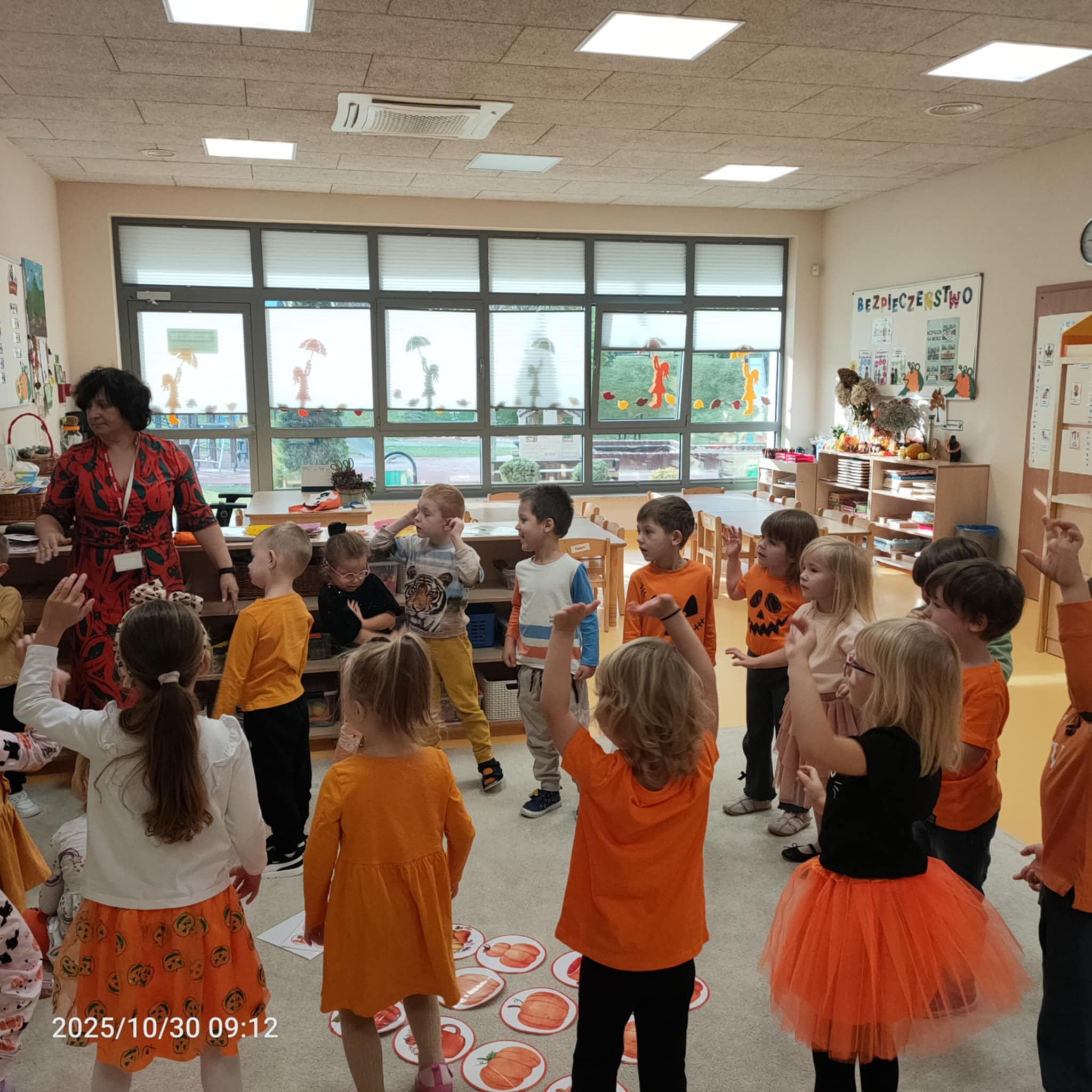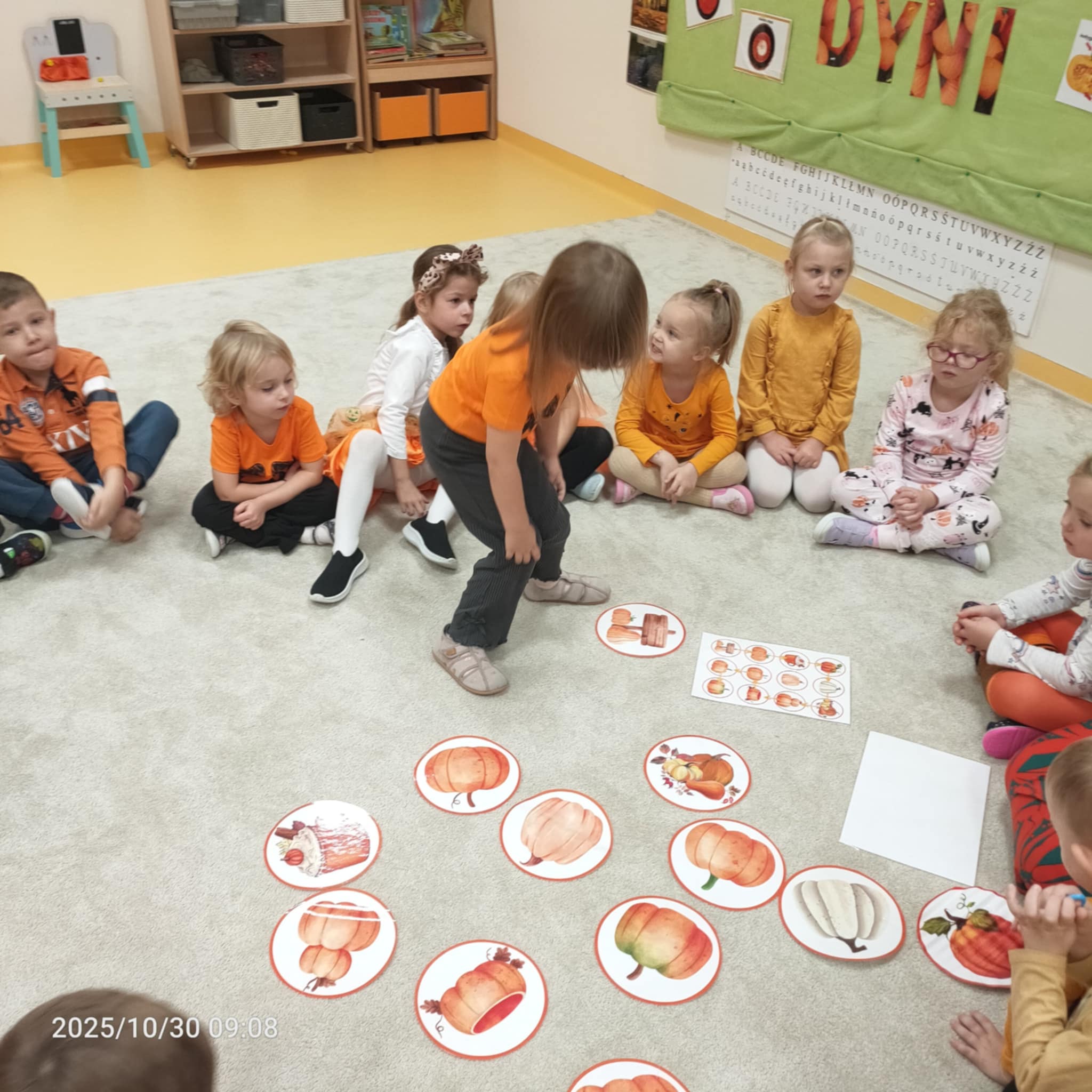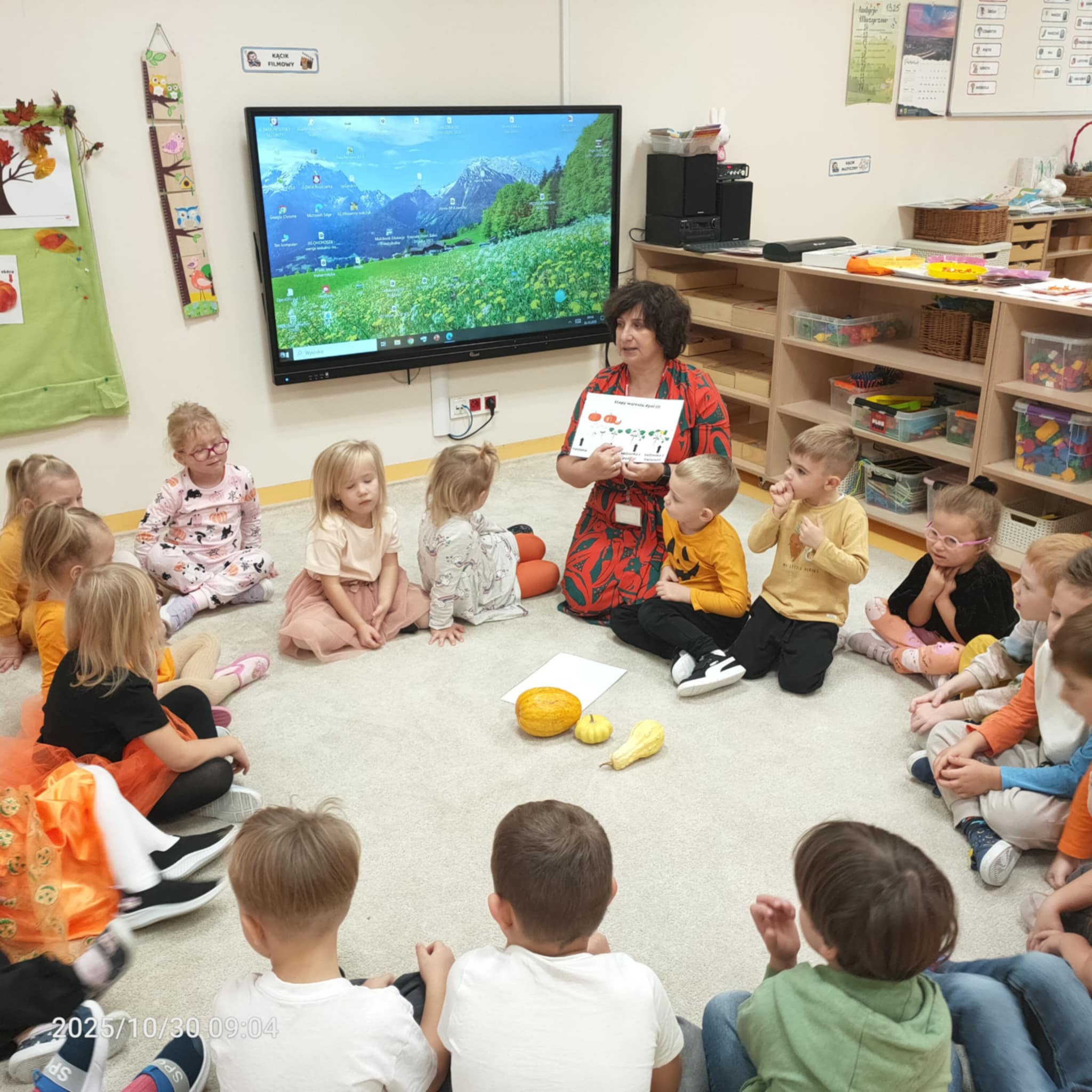 Dnia 30 października 2025 roku w grupie Jeżyki obchodziliśmy wyjątkowy Dzień Dyni. Tego dnia dzieci miały okazję poznać różne kształty dyni oraz zgłębić jej budowę. Dowiedziały się również, jakie pyszne potrawy można przygotować z dyni, co rozbudziło ich ciekawość kulinarnej strony tego warzywa.