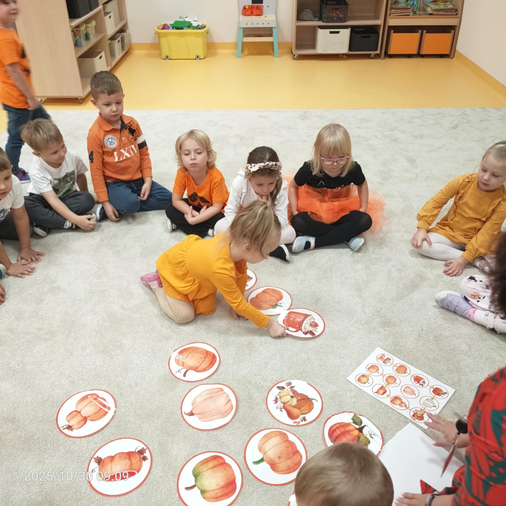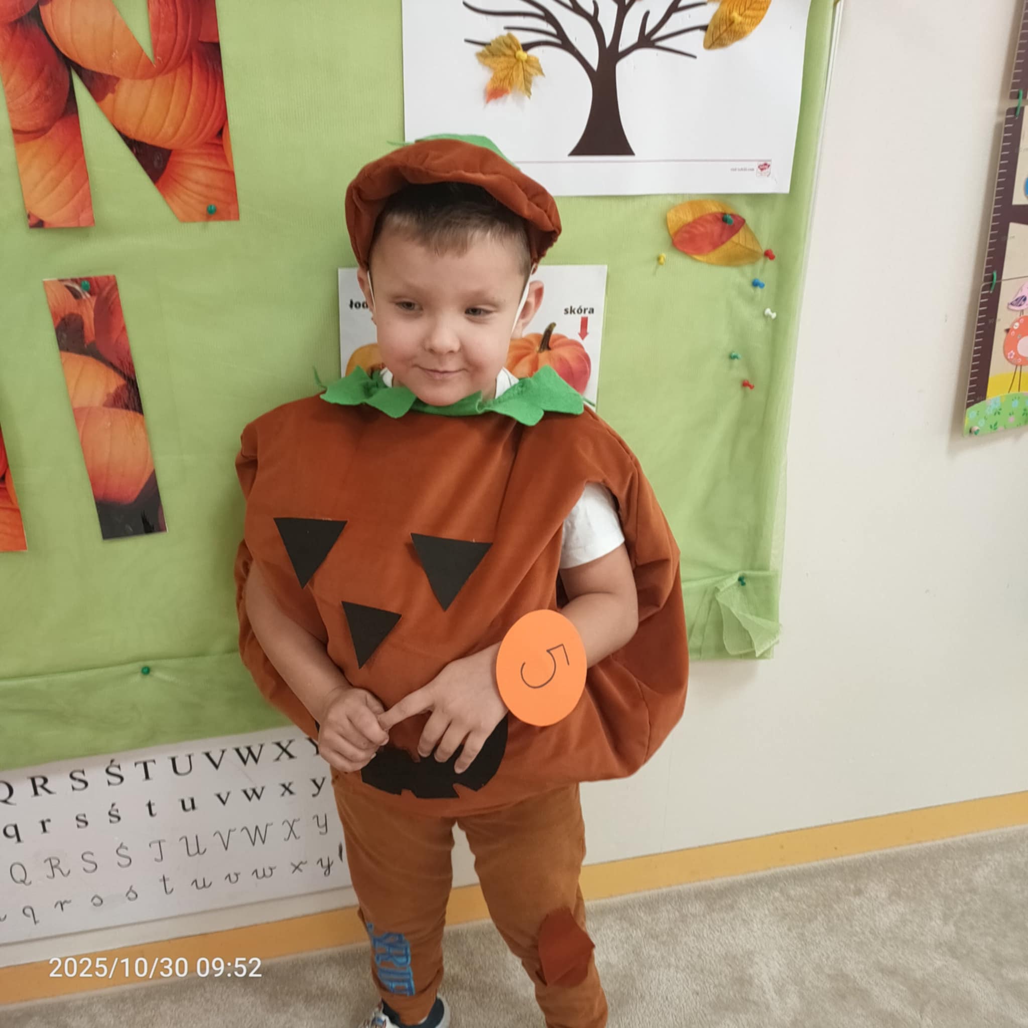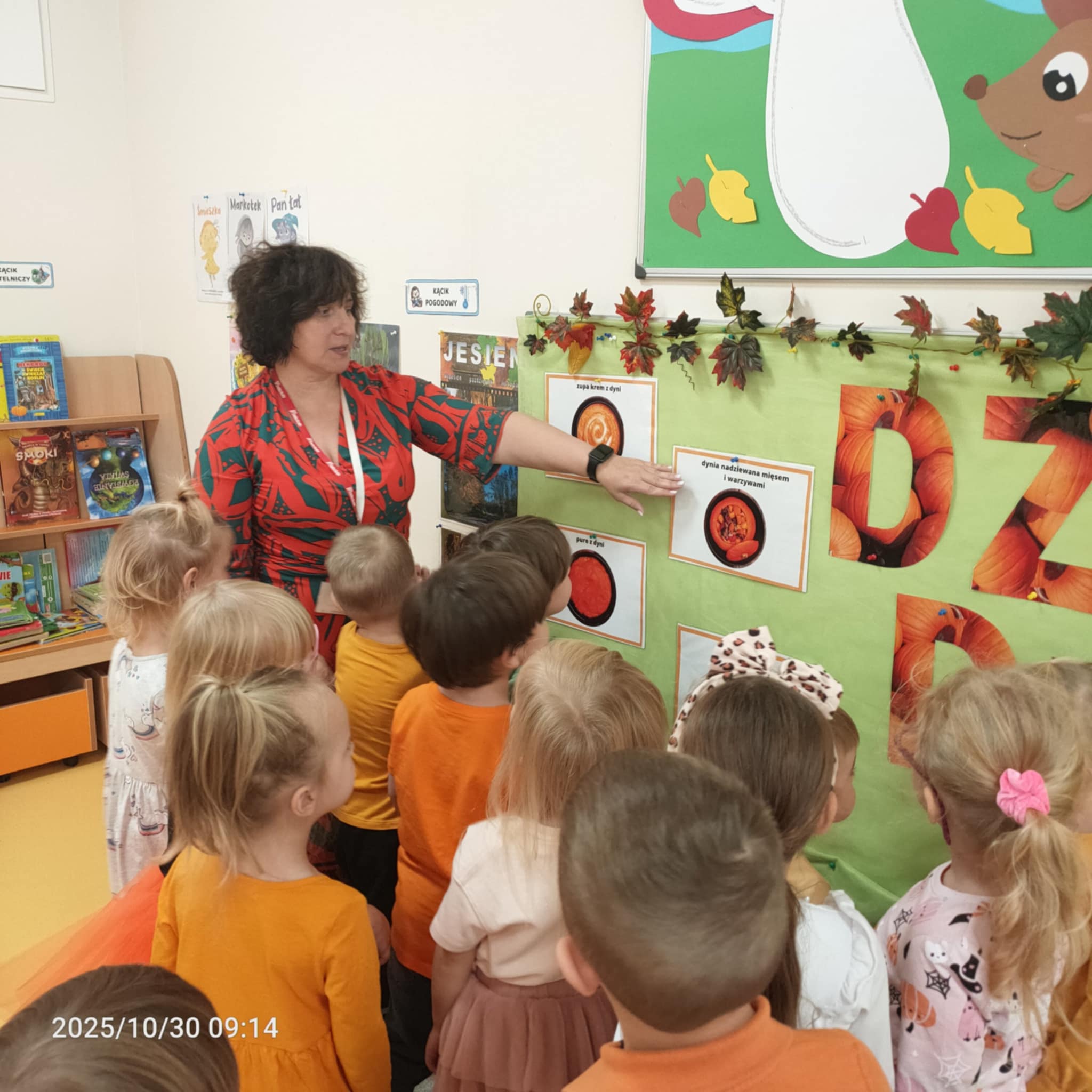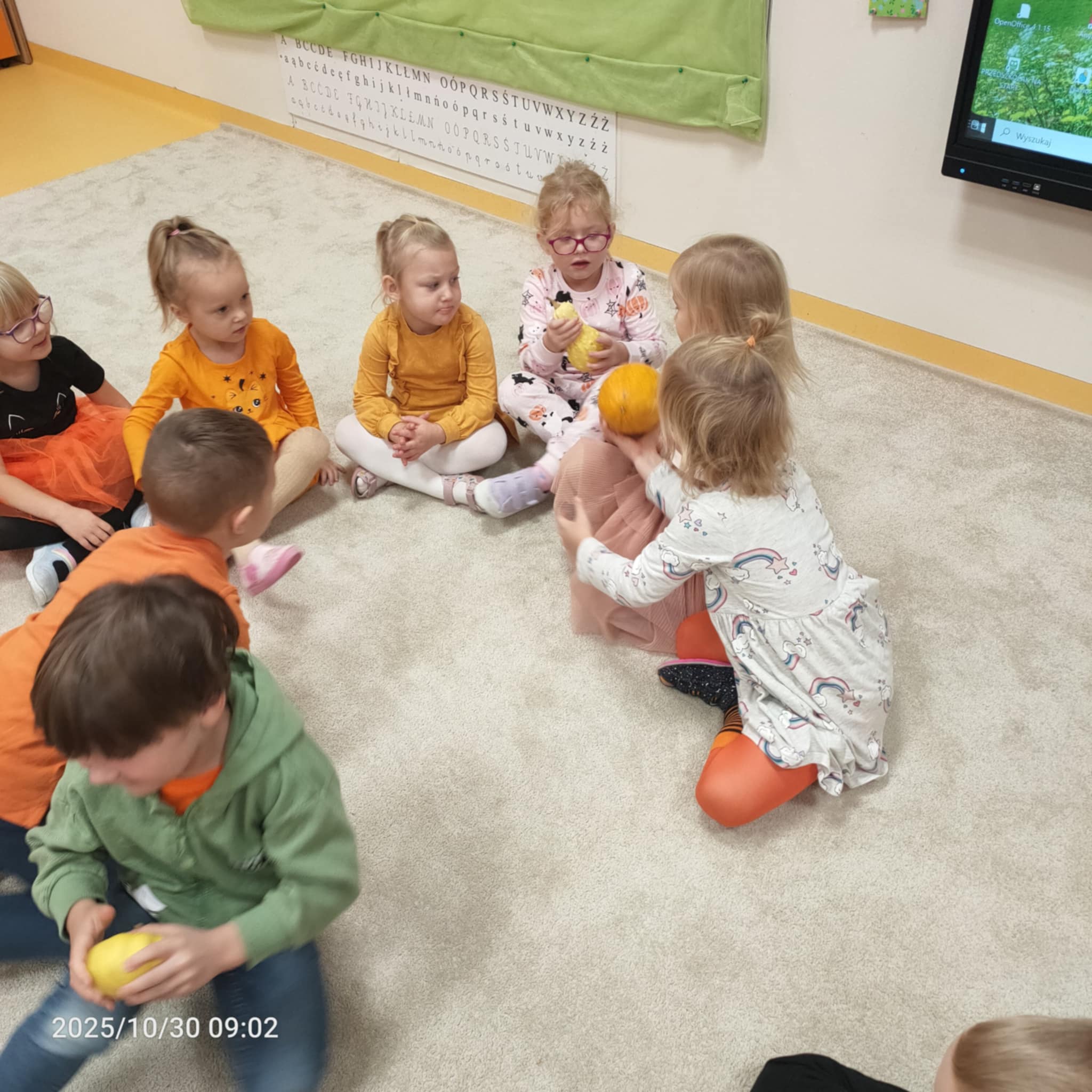 Dnia 30 października 2025 roku w grupie Jeżyki obchodziliśmy wyjątkowy Dzień Dyni. Tego dnia dzieci miały okazję poznać różne kształty dyni oraz zgłębić jej budowę. Dowiedziały się również, jakie pyszne potrawy można przygotować z dyni, co rozbudziło ich ciekawość kulinarnej strony tego warzywa.