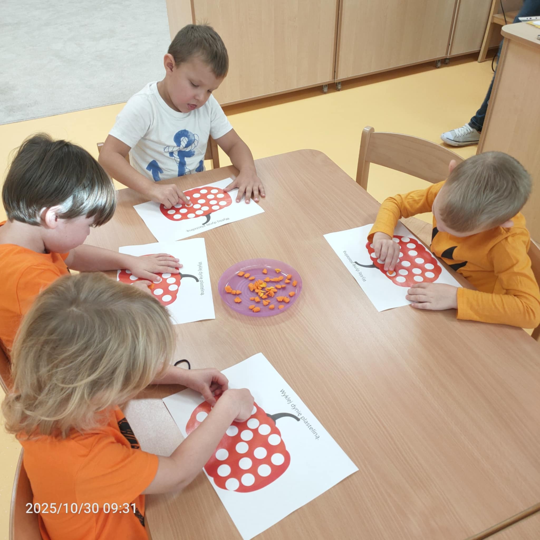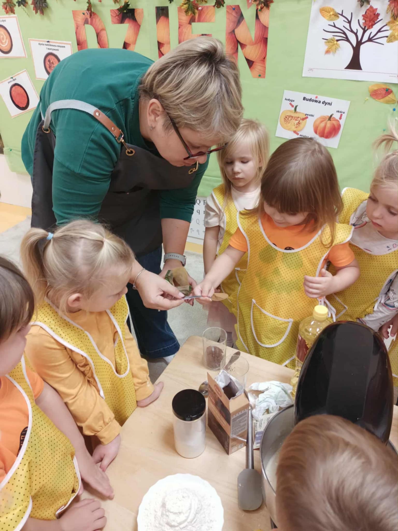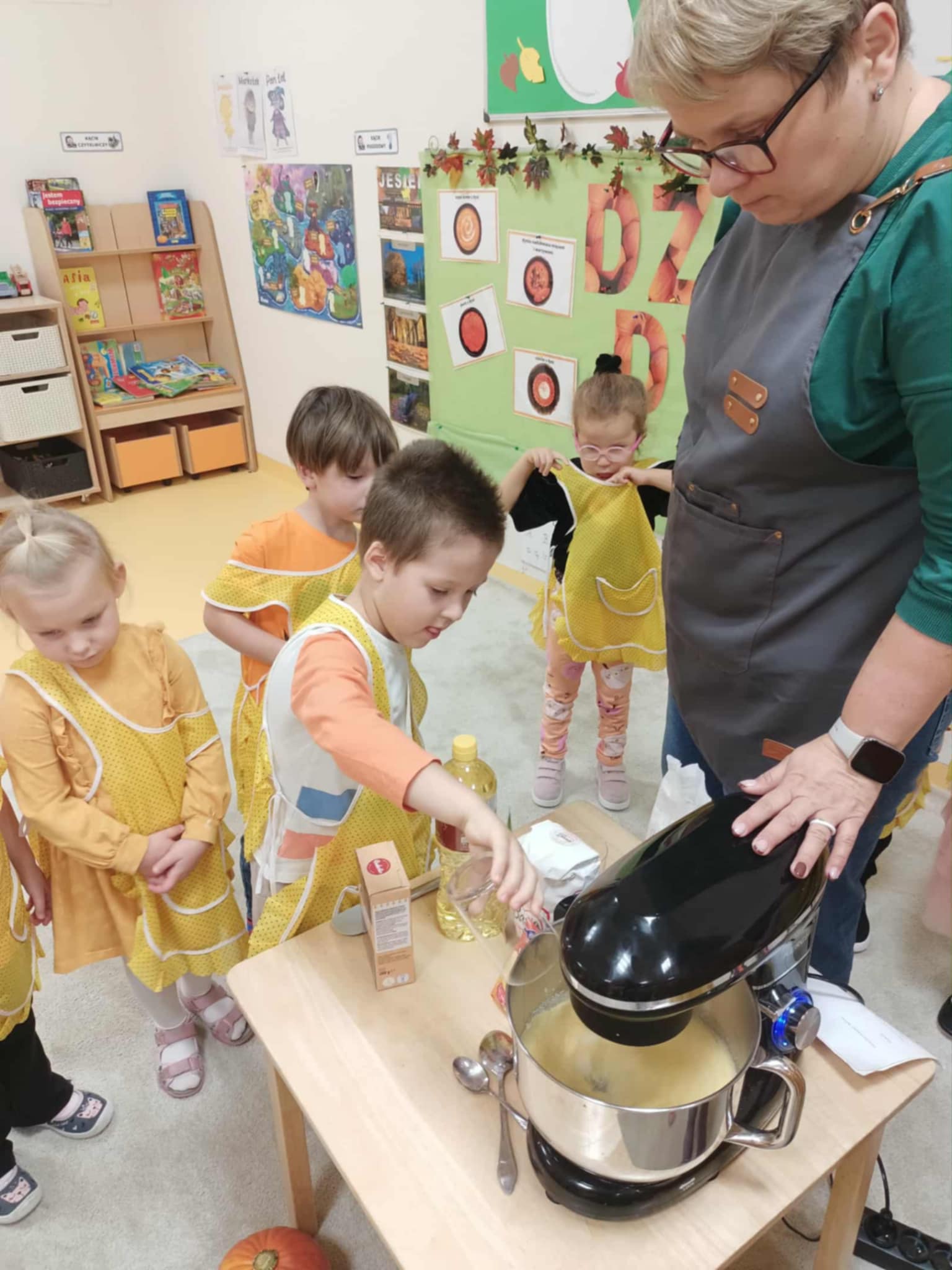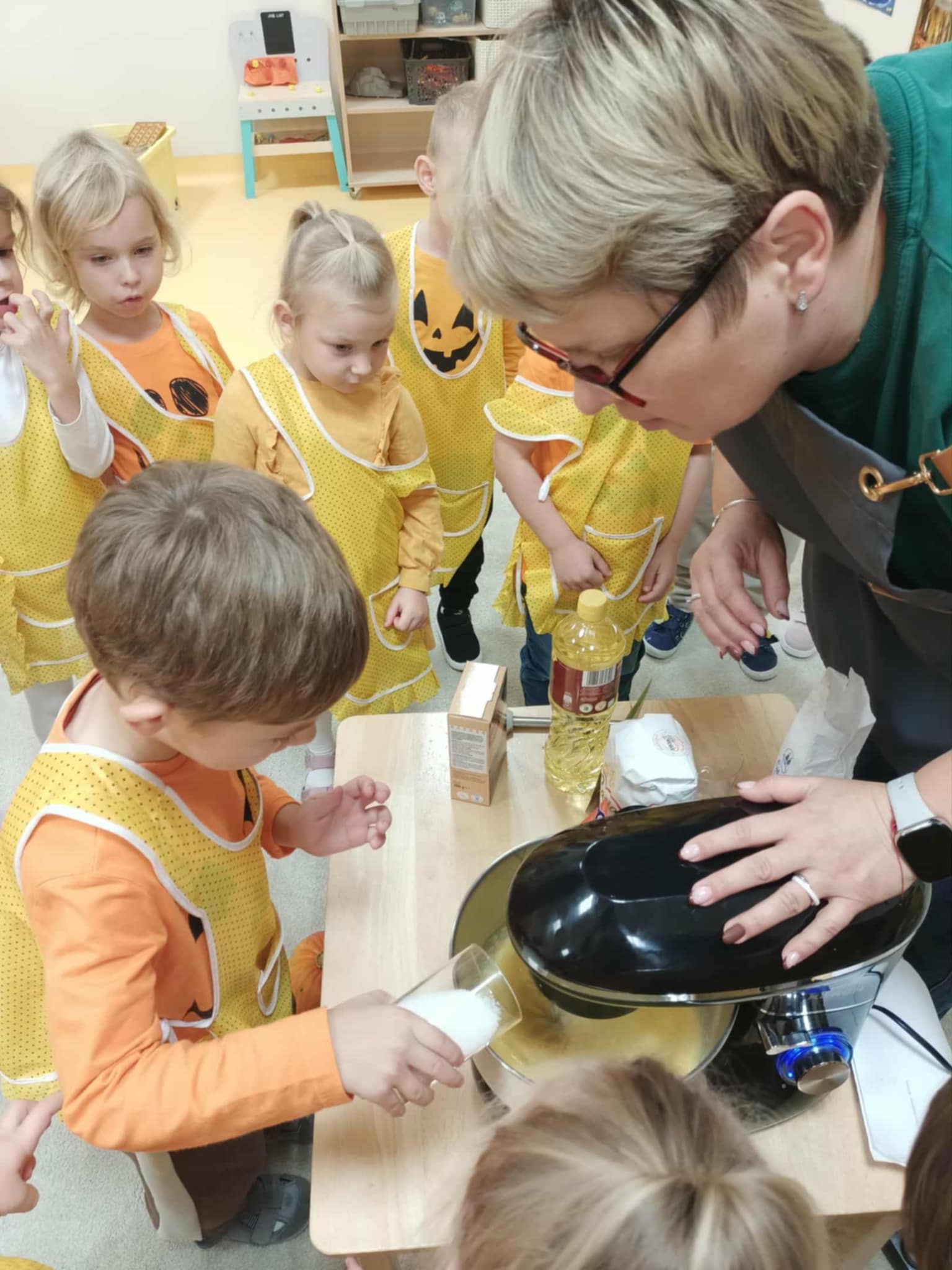 W dalszej części dnia dzieci wykonały pracę plastyczną – wyklejały dynię, co wspierało ich sprawność manualną i kreatywność. W dalszej części dnia dzieci, wspólnie z wychowawcą, przygotowały pyszne ciasto dyniowe, które okazało się świetną okazją do nauki i wspólnego gotowania.