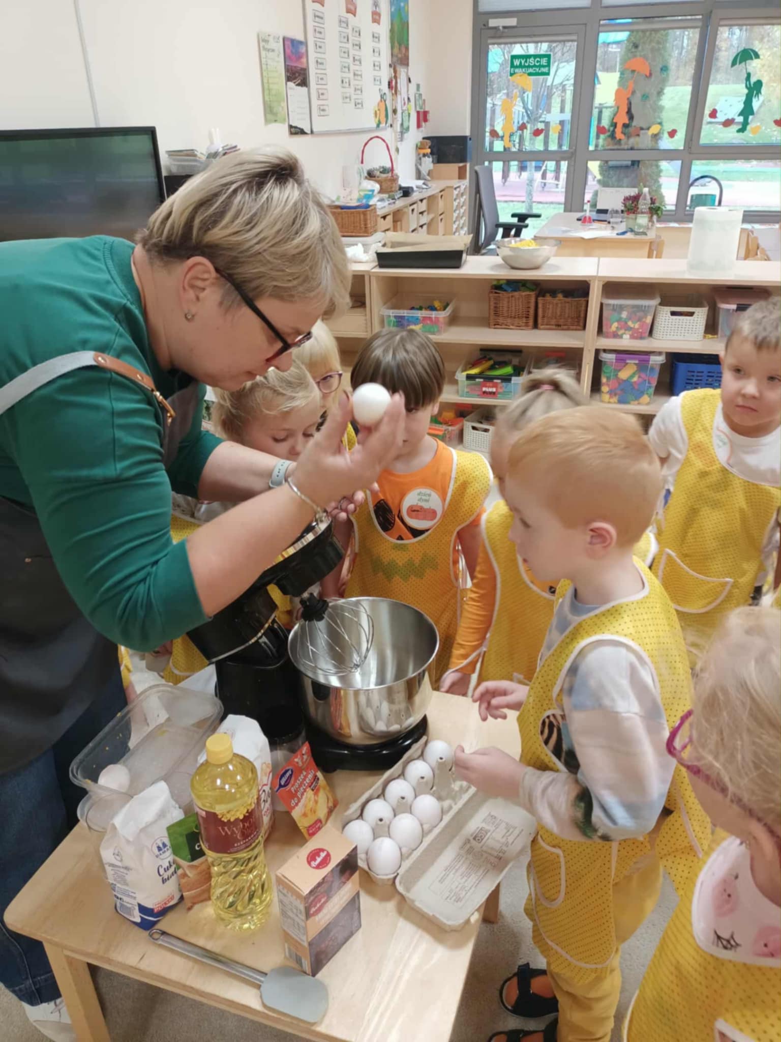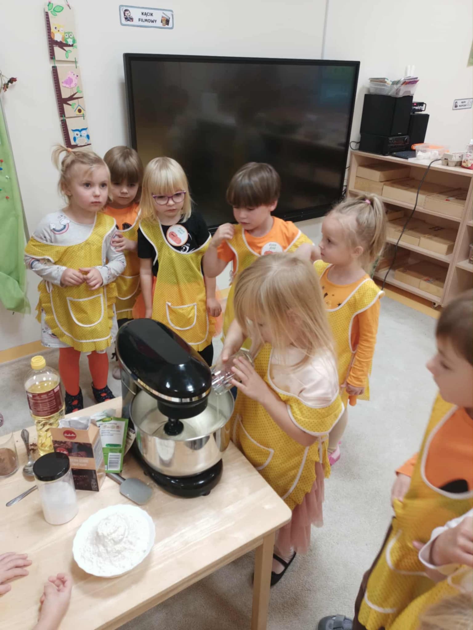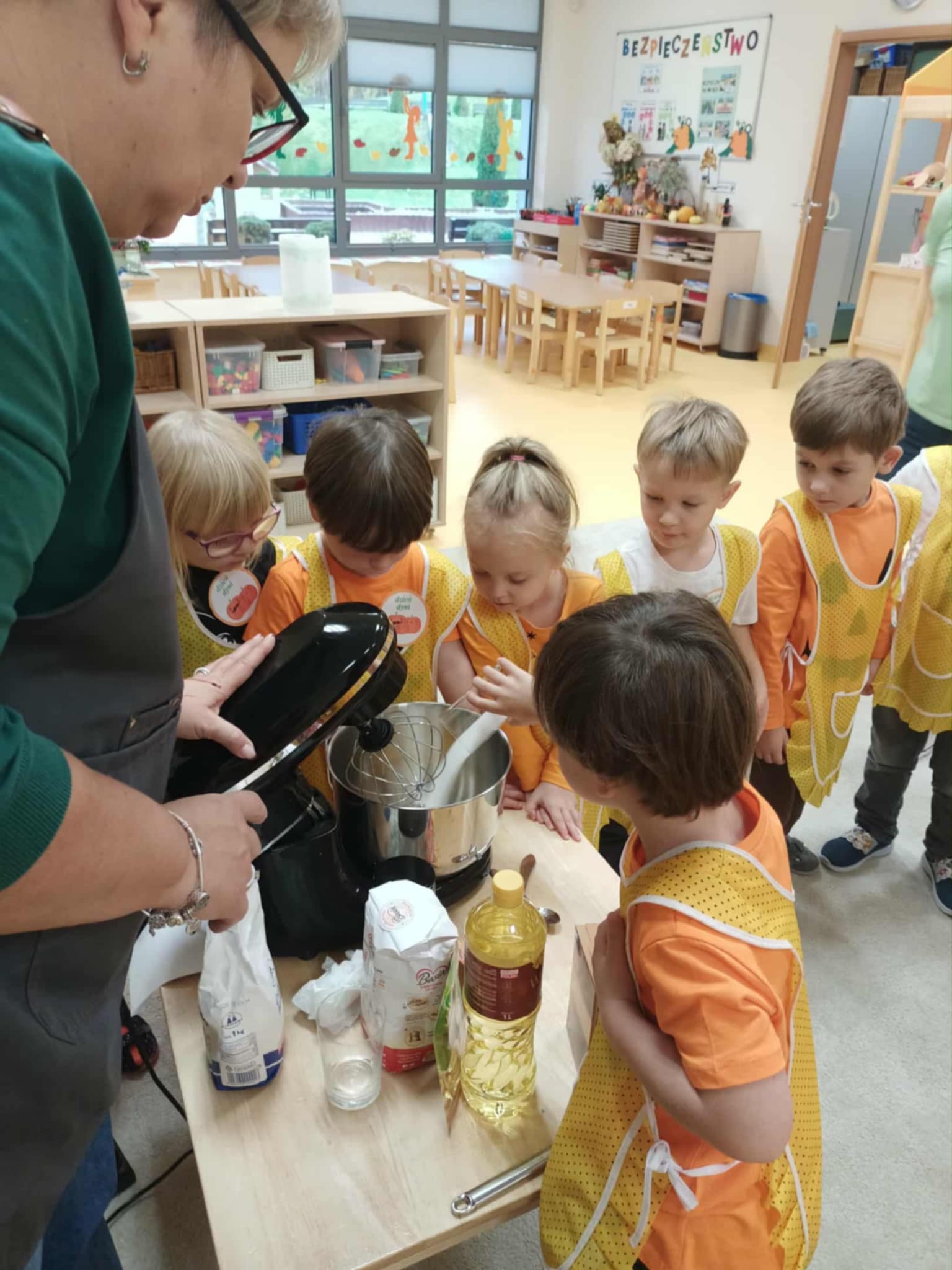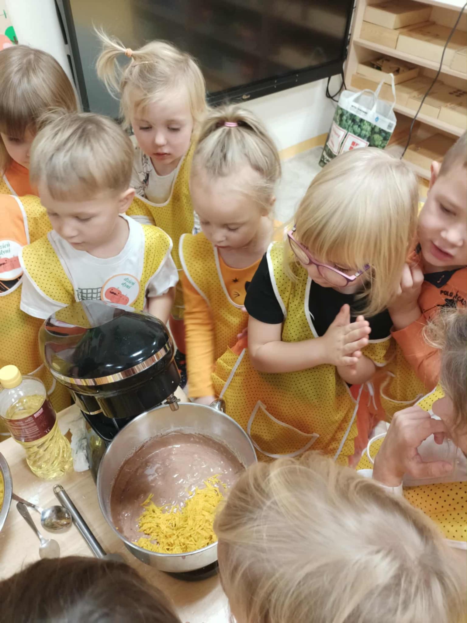 W dalszej części dnia dzieci wykonały pracę plastyczną – wyklejały dynię, co wspierało ich sprawność manualną i kreatywność. W dalszej części dnia dzieci, wspólnie z wychowawcą, przygotowały pyszne ciasto dyniowe, które okazało się świetną okazją do nauki i wspólnego gotowania.