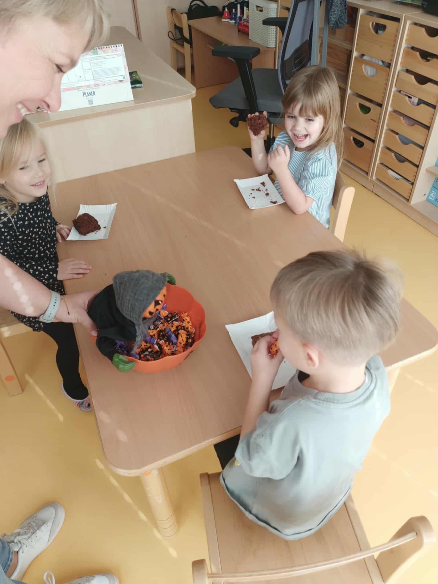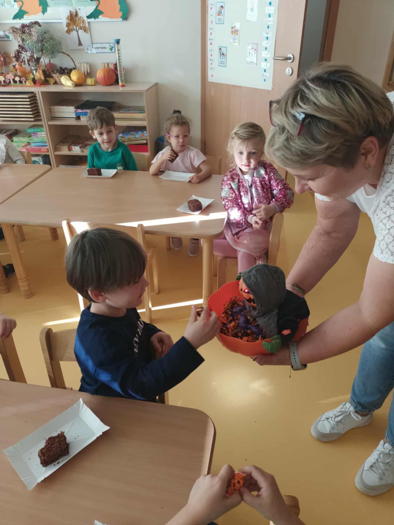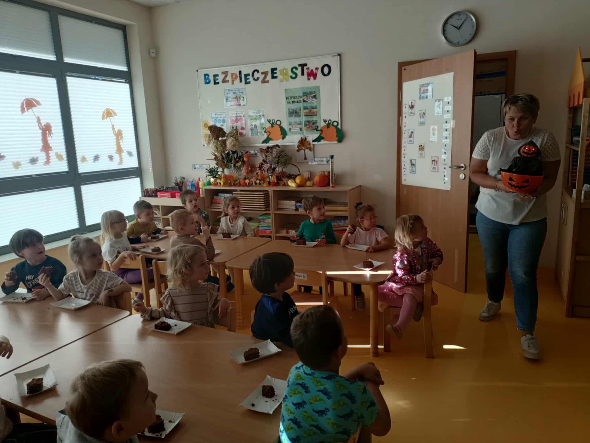 Na zakończenie dnia czekał na dzieci słodki poczęstunek – ciasto dyniowe oraz cukierki, które sprawiły wszystkim dużo radości. Ten pełny wrażeń i smaków dzień na długo pozostanie w pamięci naszych przedszkolaków.
