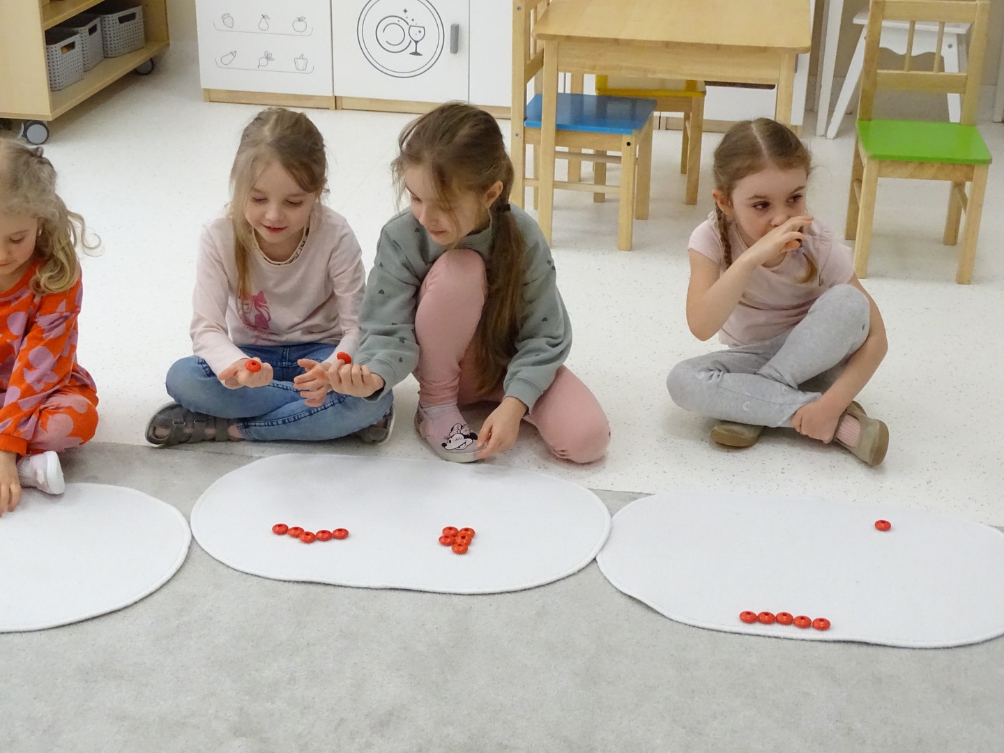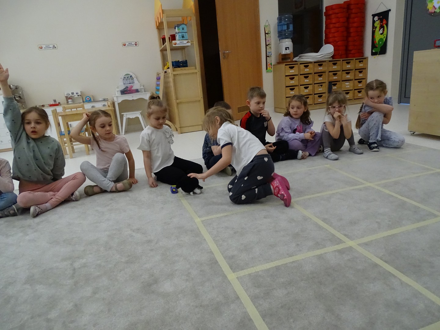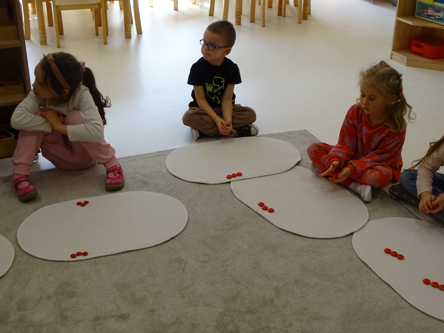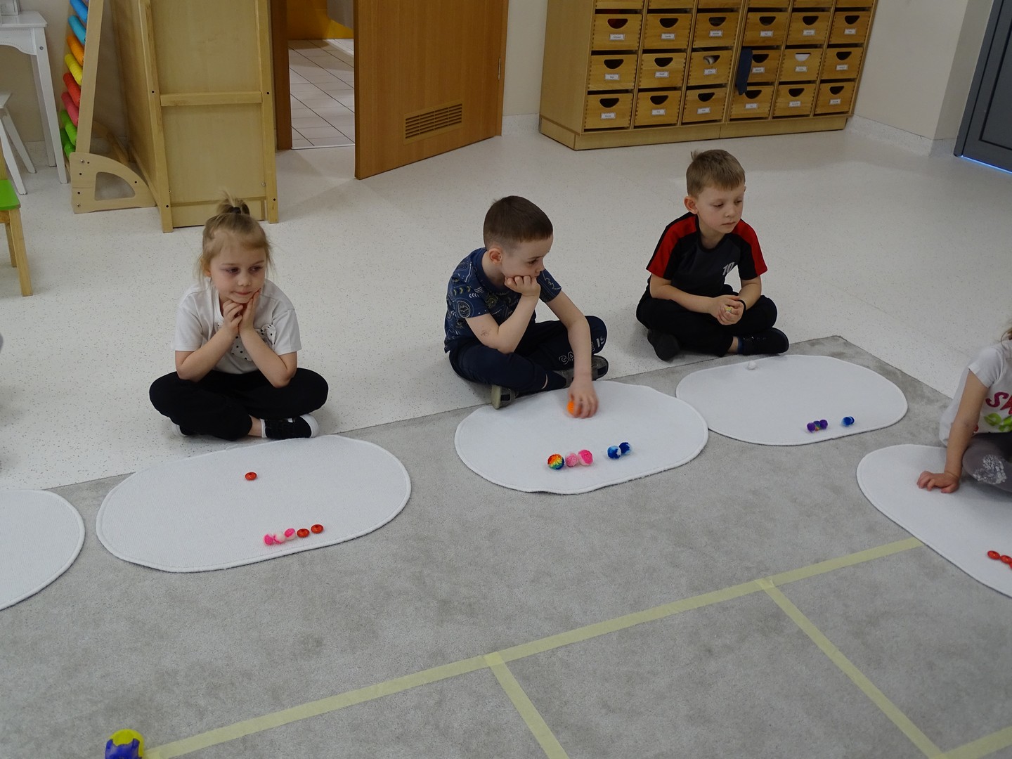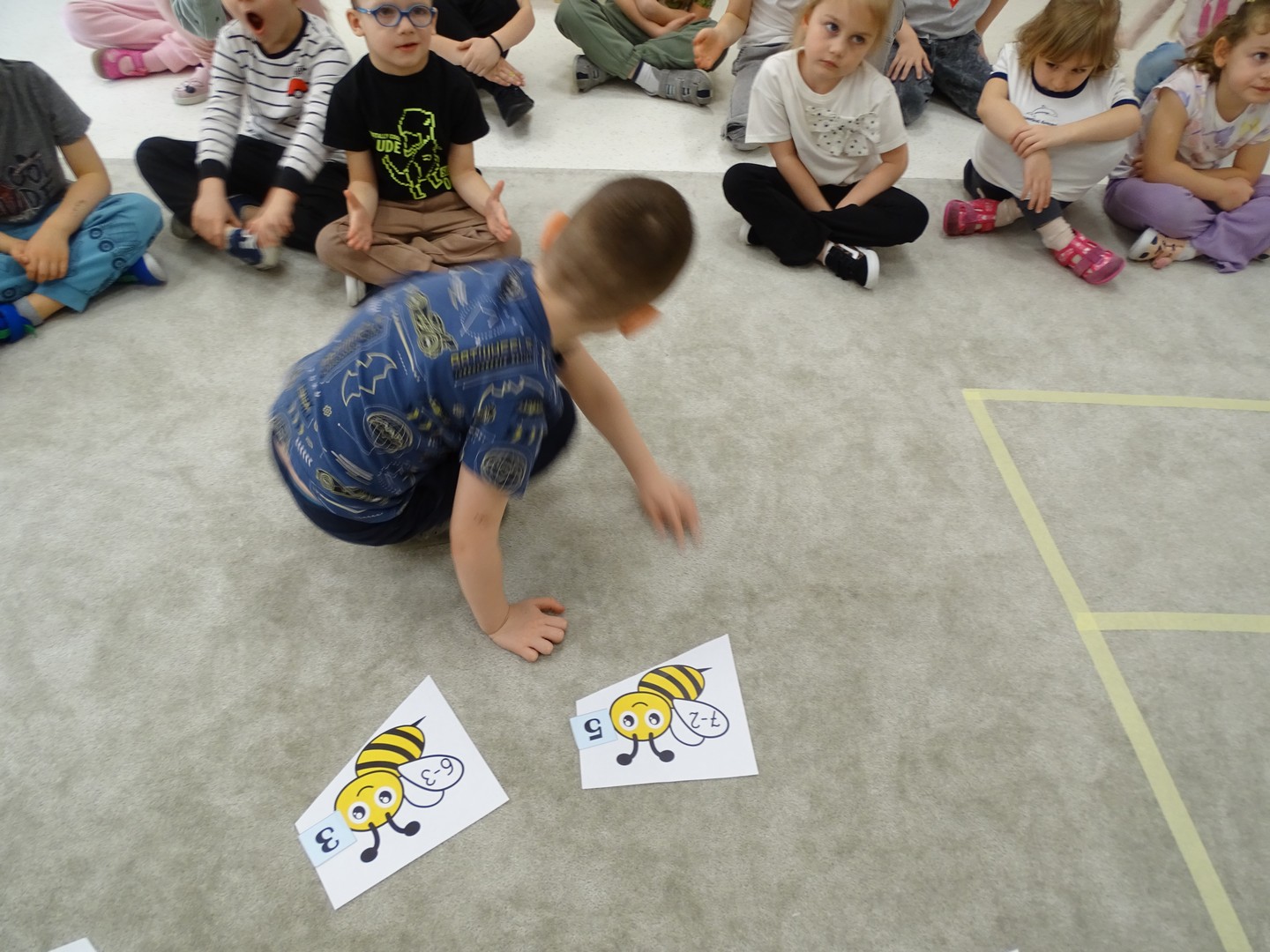 12 marca obchodziliśmy w naszej grupie "Dzień Matematyki", który stał się pretekstem do rozwijania kompetencji matematycznych. Podczas różnorodnych zabaw utrwalaliśmy oraz wzbogacaliśmy naszą wiedzę. Doskonaliliśmy umiejętność przeliczania elementów i porównywania liczebności zbiorów, orientację w przestrzeni i schemacie własnego ciała. Poprzez zabawy muzyczno - ruchowe Pani Zuzi i Pana Miłosza utrwalaliśmy umiejętność rozróżniania strony lewej i prawej, kierunków do przodu, do tyłu, w górę, w dół. W samodzielnie wykonanej na dywanie macie do kodowania, Słoneczka próbowały zaprowadzić pieska do mety. Prócz utrwalania kierunków ważnym aspektem okazała się umiejętność współpracy z partnerem zabawy, słuchanie i obserwowanie zachodzących zmian. W "Dzień Matematyki" poznaliśmy znaki matematyczne, które wykorzystywaliśmy w praktyce wykonując proste zadania z wykorzystaniem ilustracji. Na koniec zajęć dzieci doskonaliły umiejętność nazywania i rozróżniania figur geometrycznych zakodowanych kształtem i kolorem na dywaniku. Podejmowane działania zachęcały dzieci do rozwijania zainteresowań matematycznych jednocześnie sprawiając Im wiele radości.