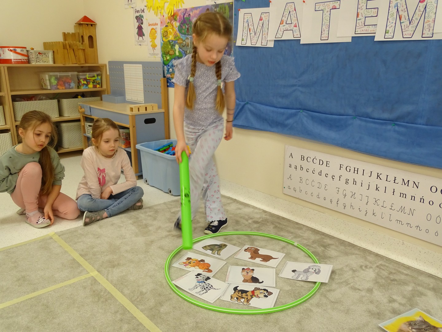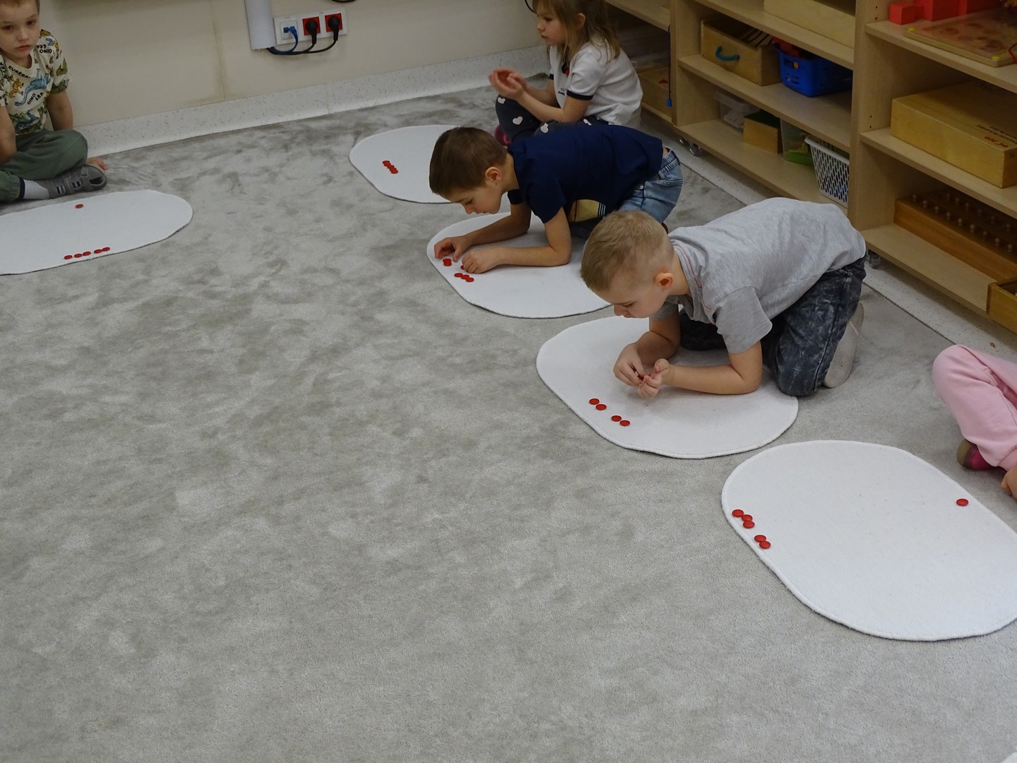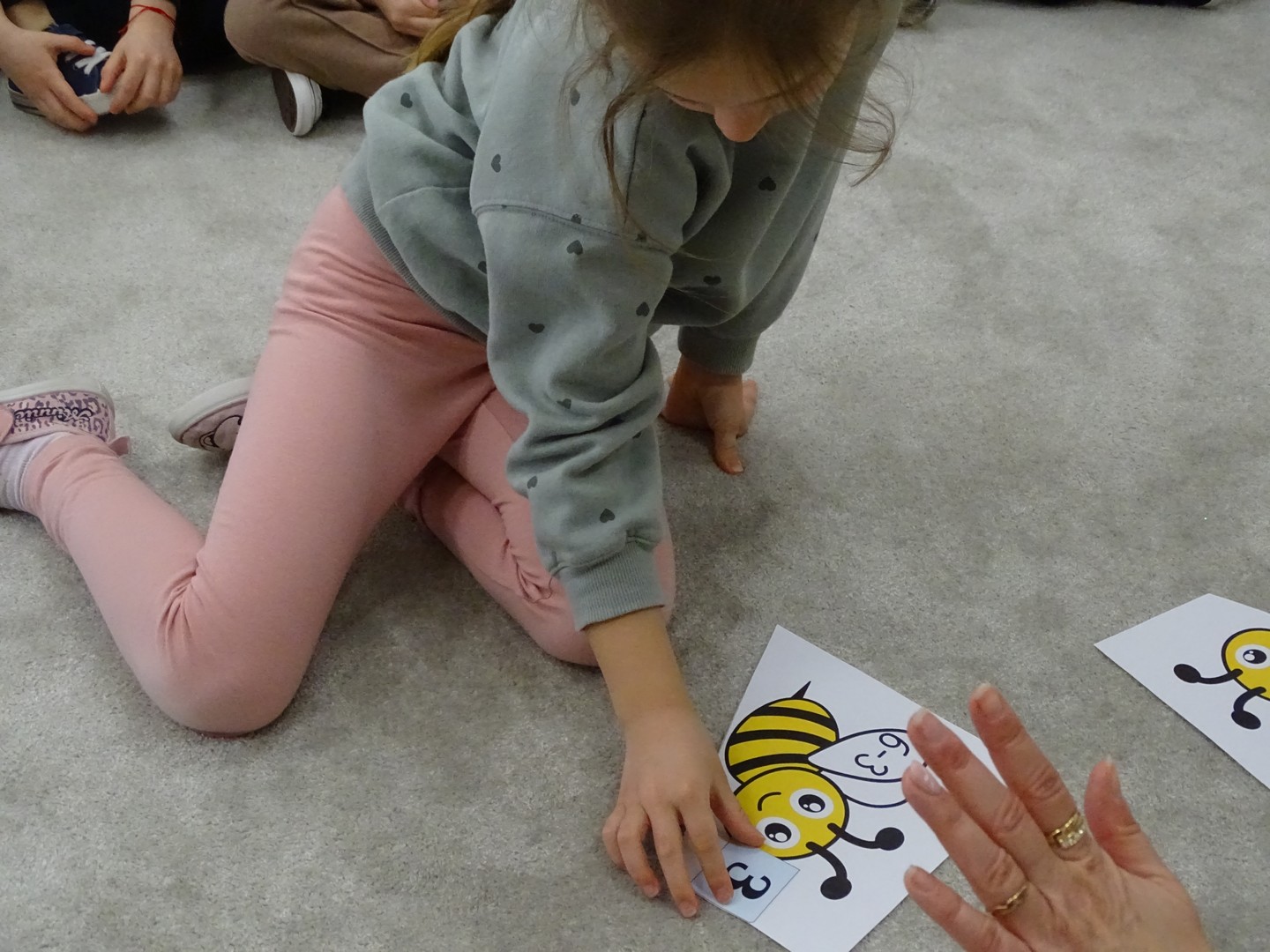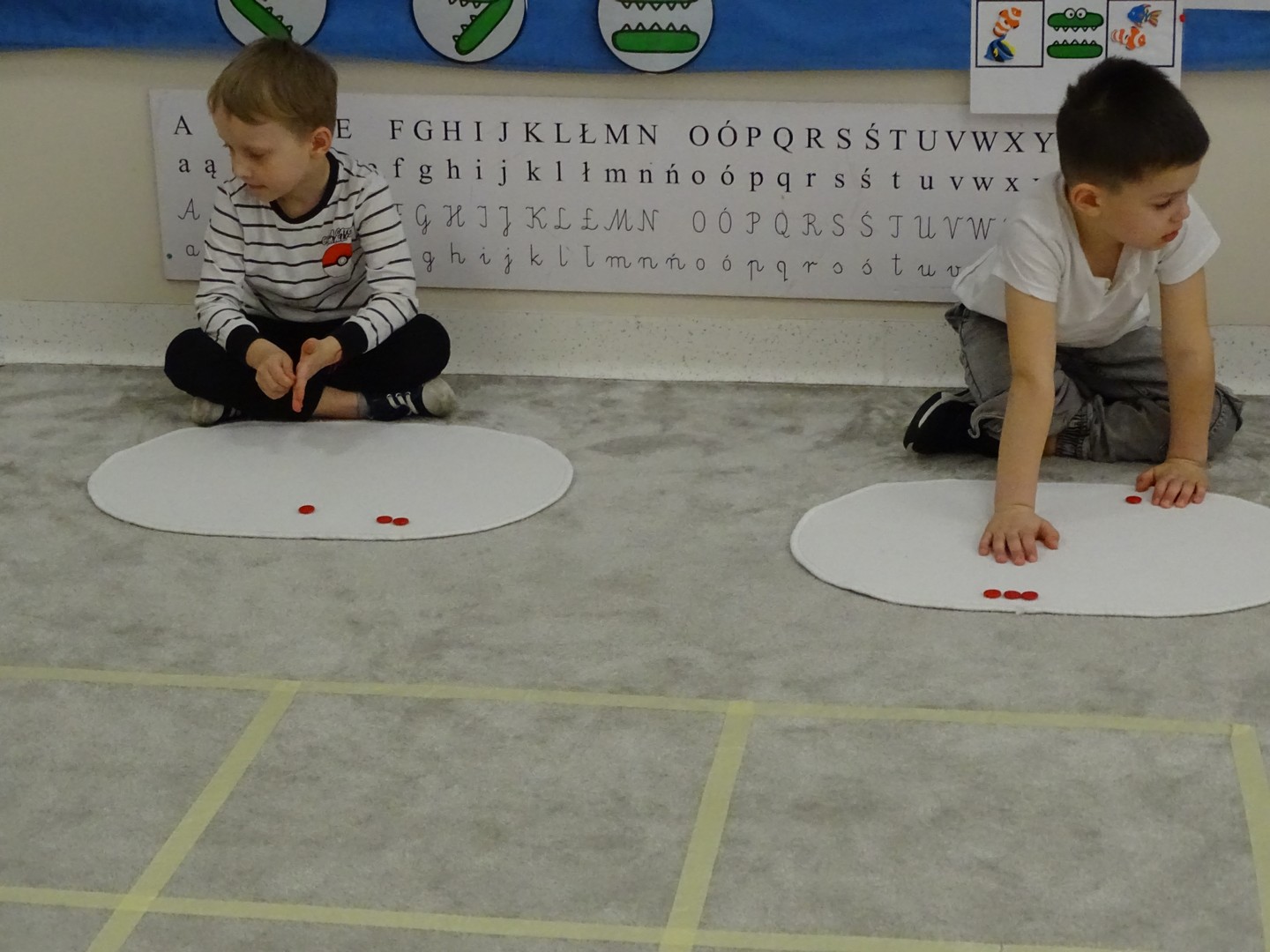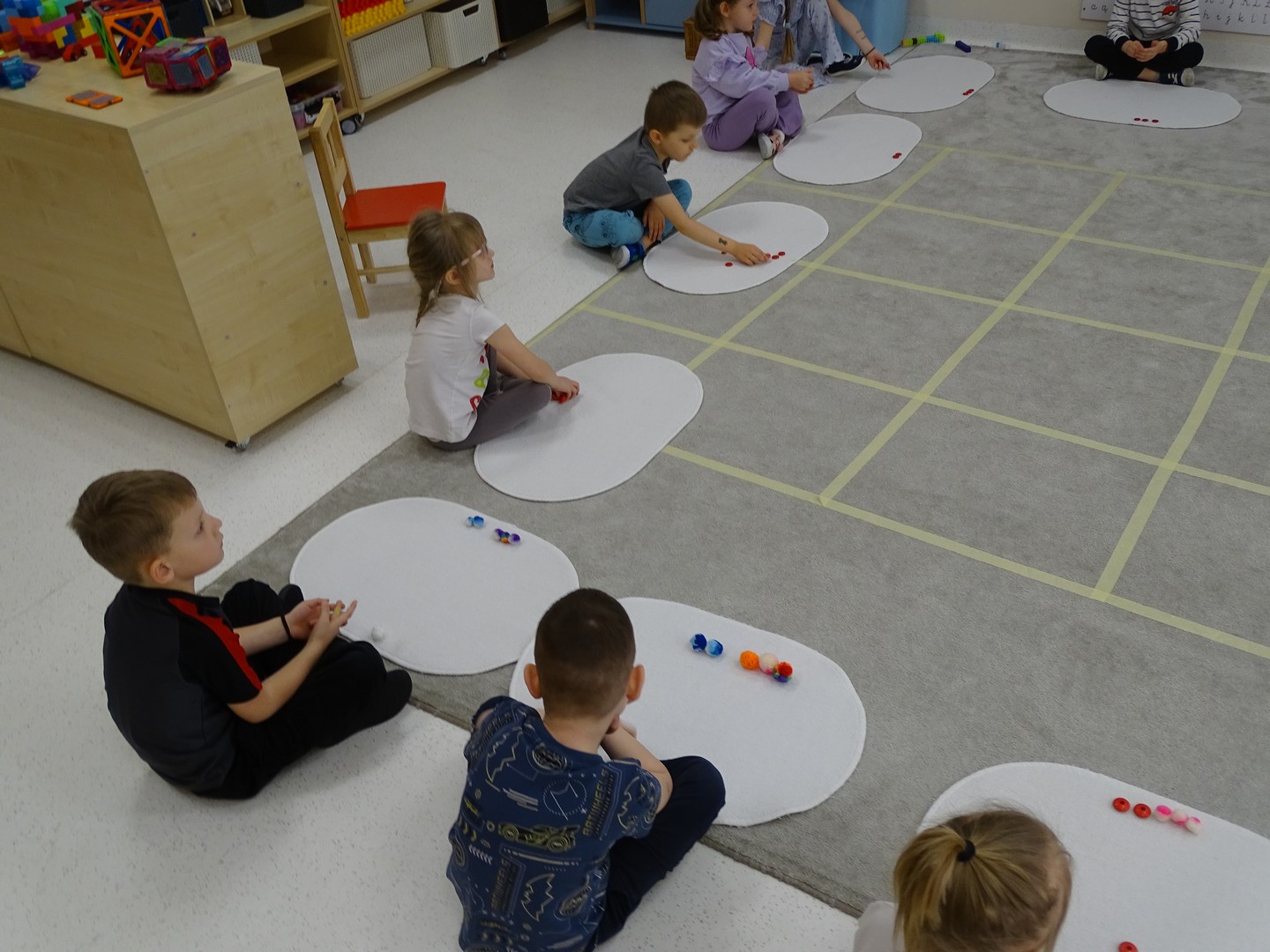12 marca obchodziliśmy w naszej grupie "Dzień Matematyki", który stał się pretekstem do rozwijania kompetencji matematycznych. Podczas różnorodnych zabaw utrwalaliśmy oraz wzbogacaliśmy naszą wiedzę. Doskonaliliśmy umiejętność przeliczania elementów i porównywania liczebności zbiorów, orientację w przestrzeni i schemacie własnego ciała. Poprzez zabawy muzyczno - ruchowe Pani Zuzi i Pana Miłosza utrwalaliśmy umiejętność rozróżniania strony lewej i prawej, kierunków do przodu, do tyłu, w górę, w dół. W samodzielnie wykonanej na dywanie macie do kodowania, Słoneczka próbowały zaprowadzić pieska do mety. Prócz utrwalania kierunków ważnym aspektem okazała się umiejętność współpracy z partnerem zabawy, słuchanie i obserwowanie zachodzących zmian. W "Dzień Matematyki" poznaliśmy znaki matematyczne, które wykorzystywaliśmy w praktyce wykonując proste zadania z wykorzystaniem ilustracji. Na koniec zajęć dzieci doskonaliły umiejętność nazywania i rozróżniania figur geometrycznych zakodowanych kształtem i kolorem na dywaniku. Podejmowane działania zachęcały dzieci do rozwijania zainteresowań matematycznych jednocześnie sprawiając Im wiele radości.