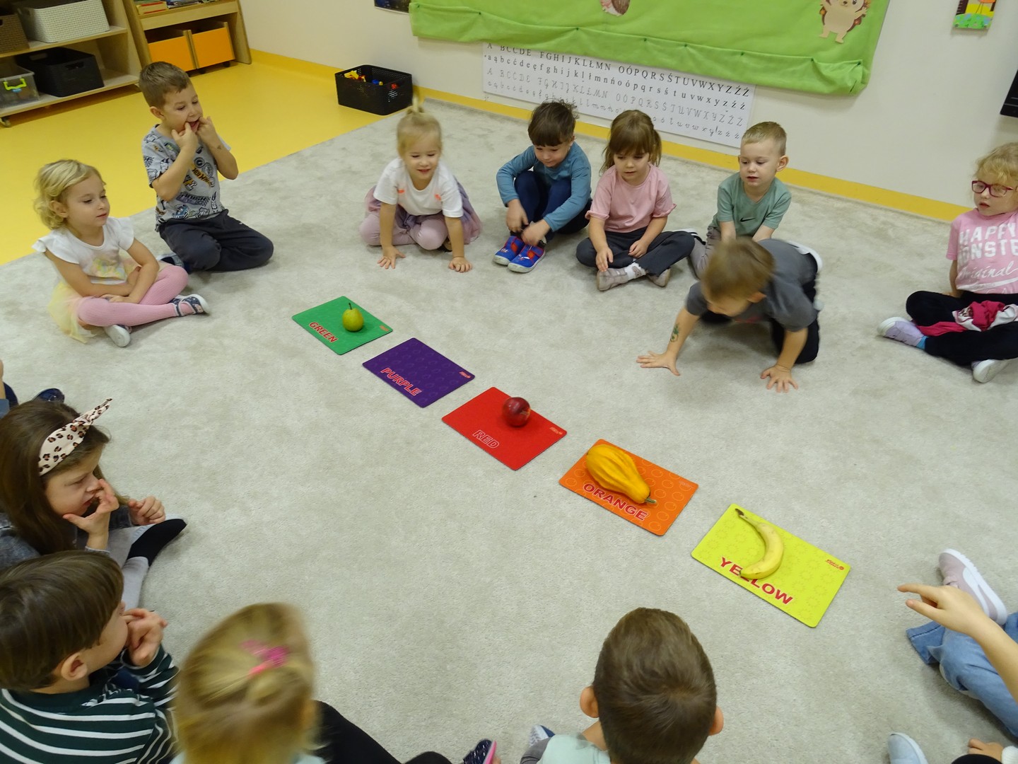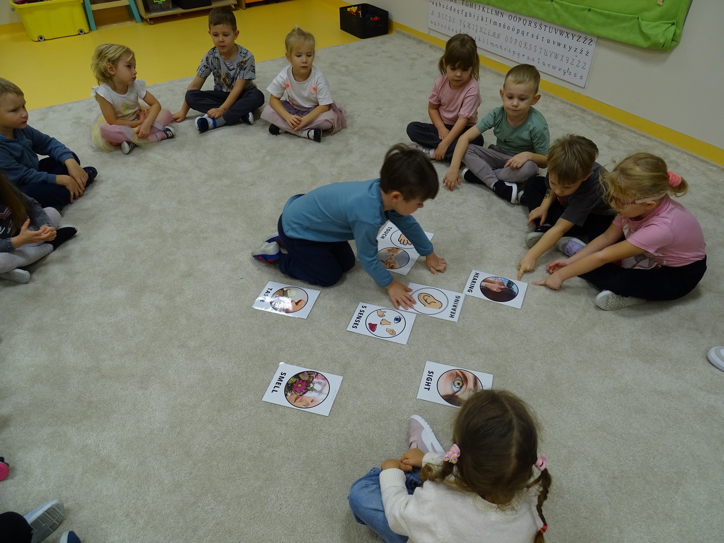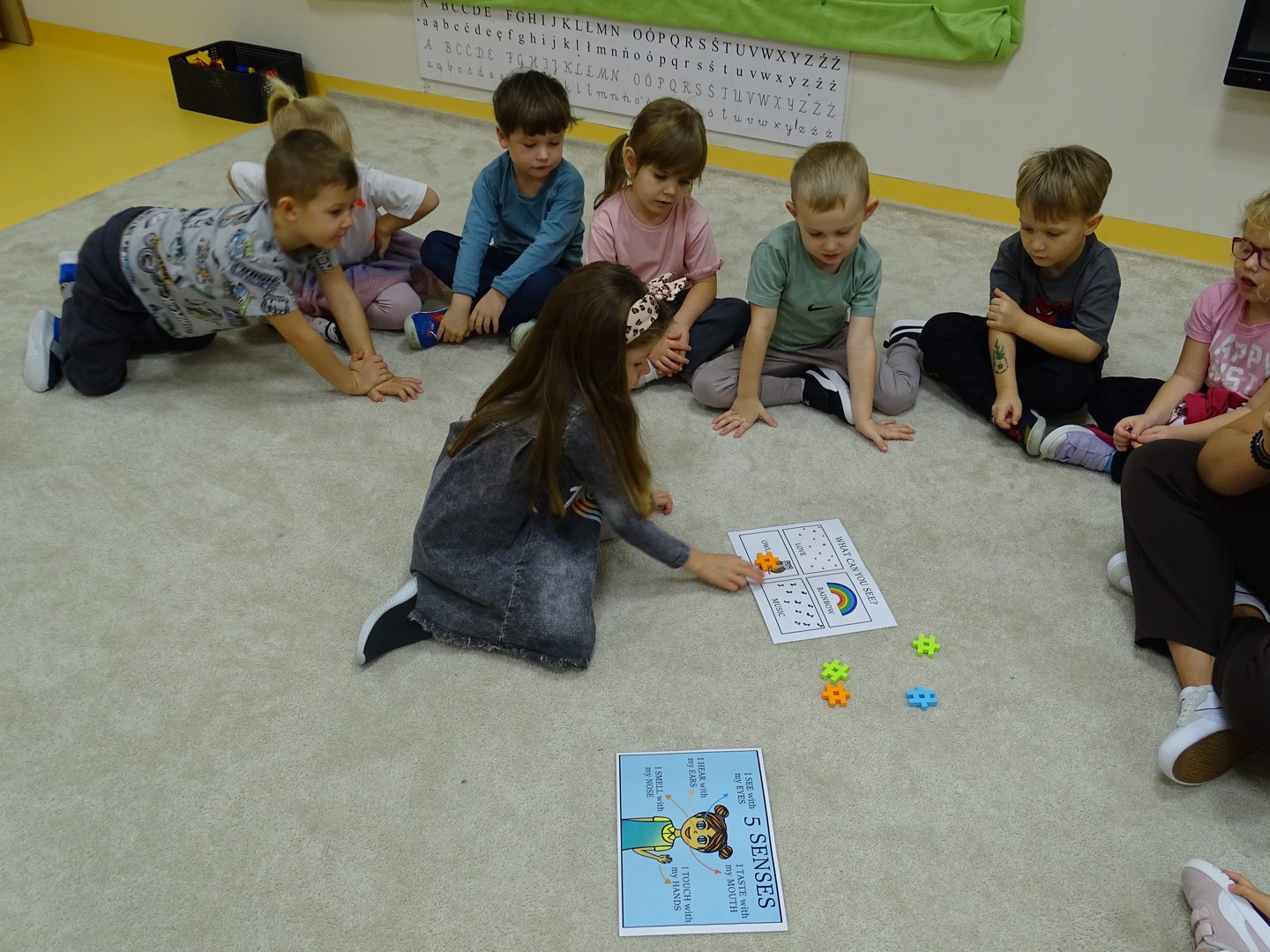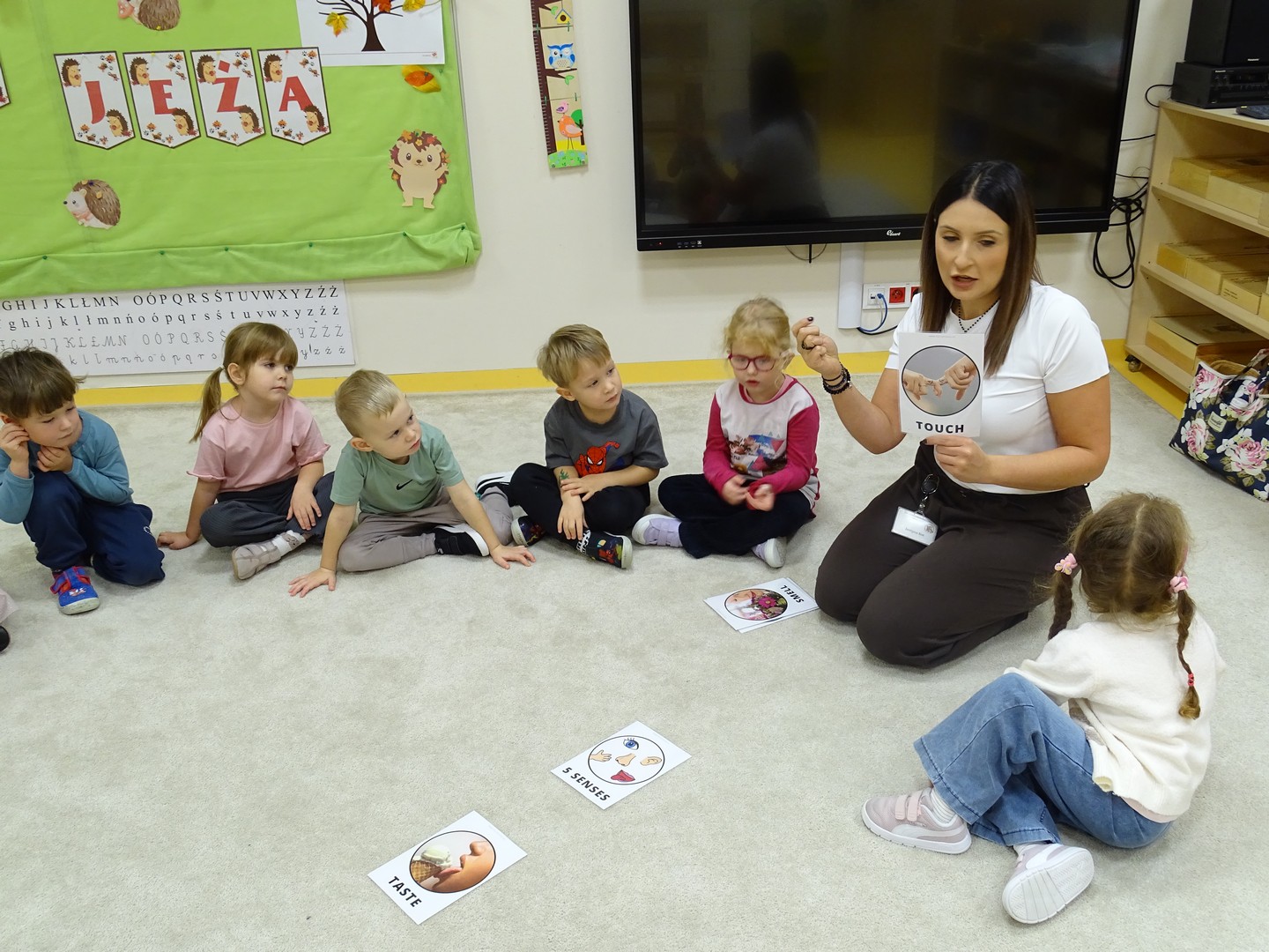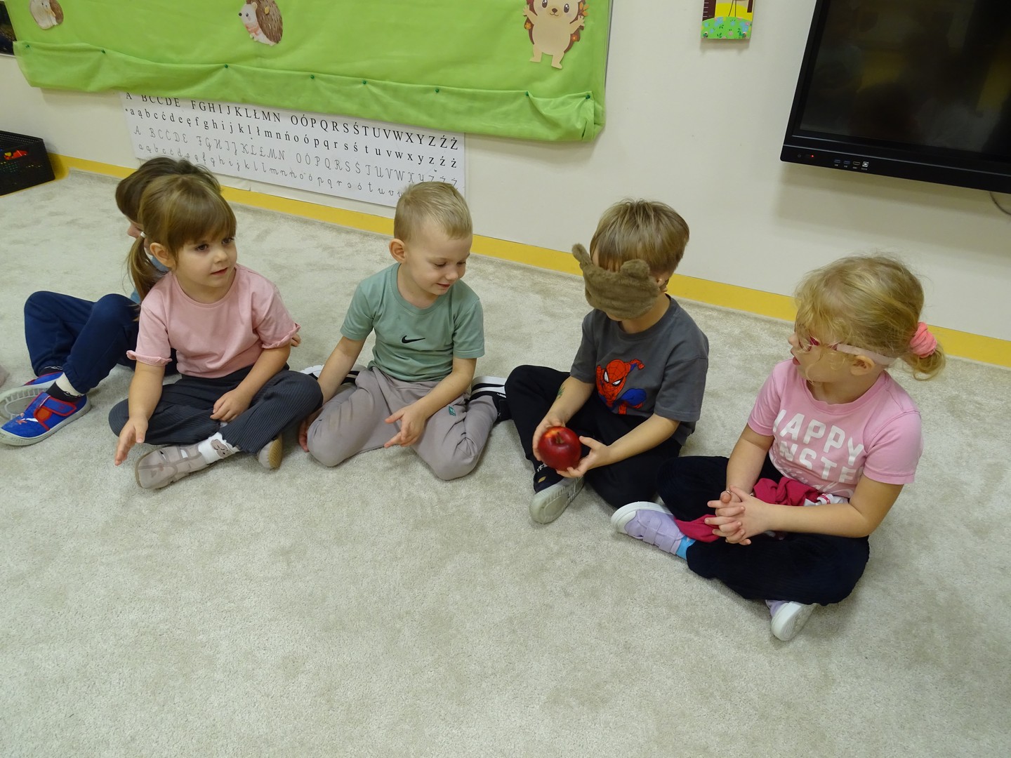 "Pięć zmysłów mam i wszystkie znam"..... Wraz z grupą "Jeżyki" poznaliśmy zmysły jakie posiada człowiek. Za pomocą kart obrazkowych utrwaliliśmy ich nazwy. Dzieci dotykały poszczególnych części ciała śpiewając piosenkę "Five senses". Następnie poznaliśmy nazwy owoców i dopasowaliśmy ich kolory do mat znajdujących się na dywanie. Dzieci z zasłoniętymi oczkami odgadywały nazwy poszczególnych owoców a następnie określały ich kolor. Najtrudniejszym zadaniem okazało się jednak rozpoznanie smaku owocu i nazywanie z zakrytymi oczkami. Niemniej jednak dzieci poradziły sobie z tym zadaniem bardzo dobrze. Na koniec była "owocowa uczta" i każdy przedszkolak mógł spróbować swojego ulubionego owocu. Zadanie to dostarczyło dzieciom różnorodnych bodźców oraz przyczyniło się do rozwoju zmysłów malucha.