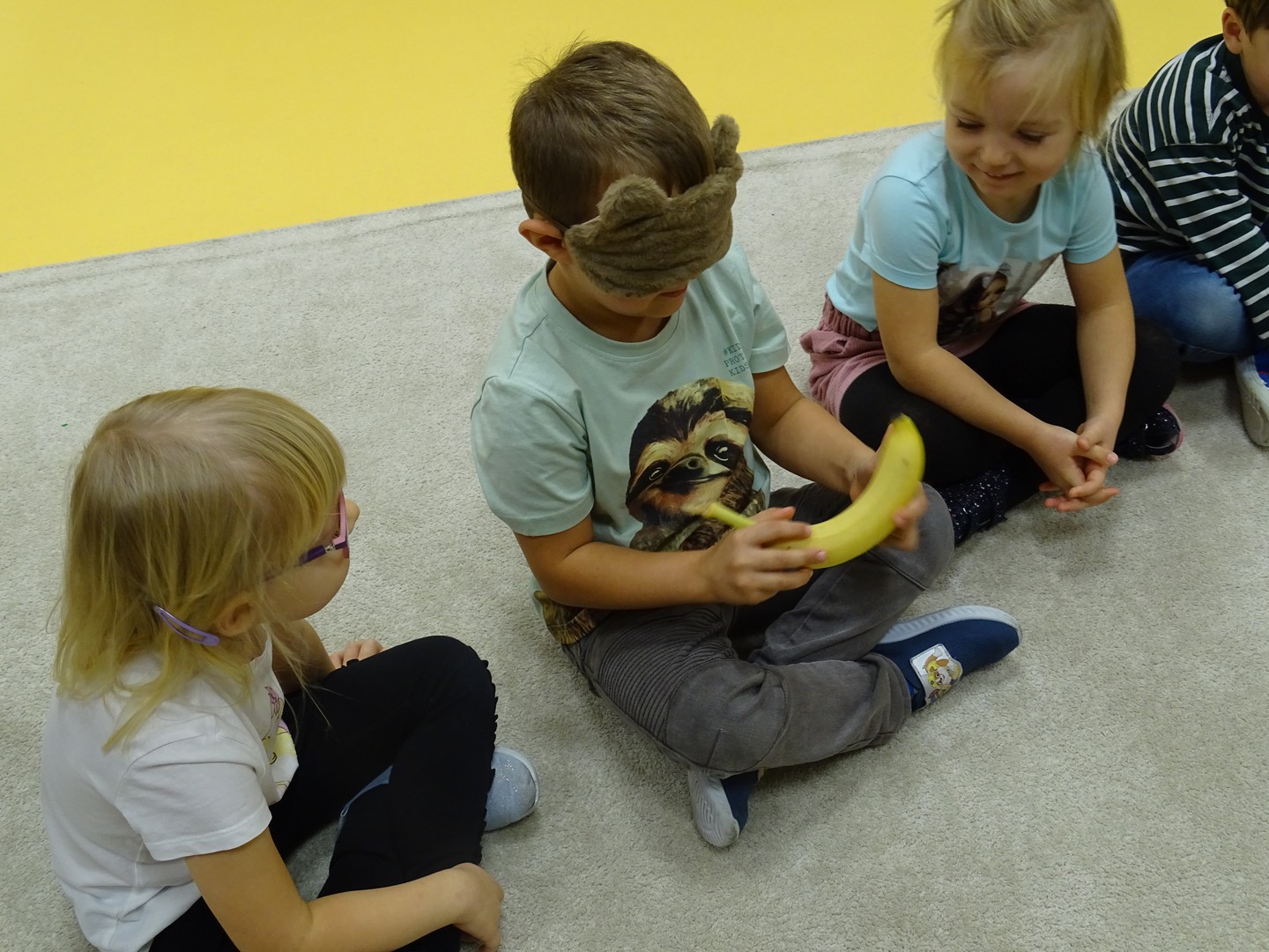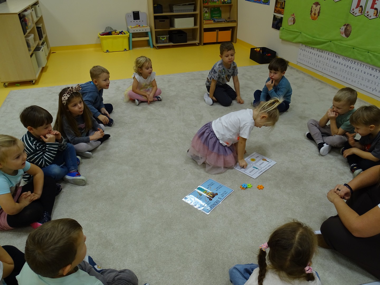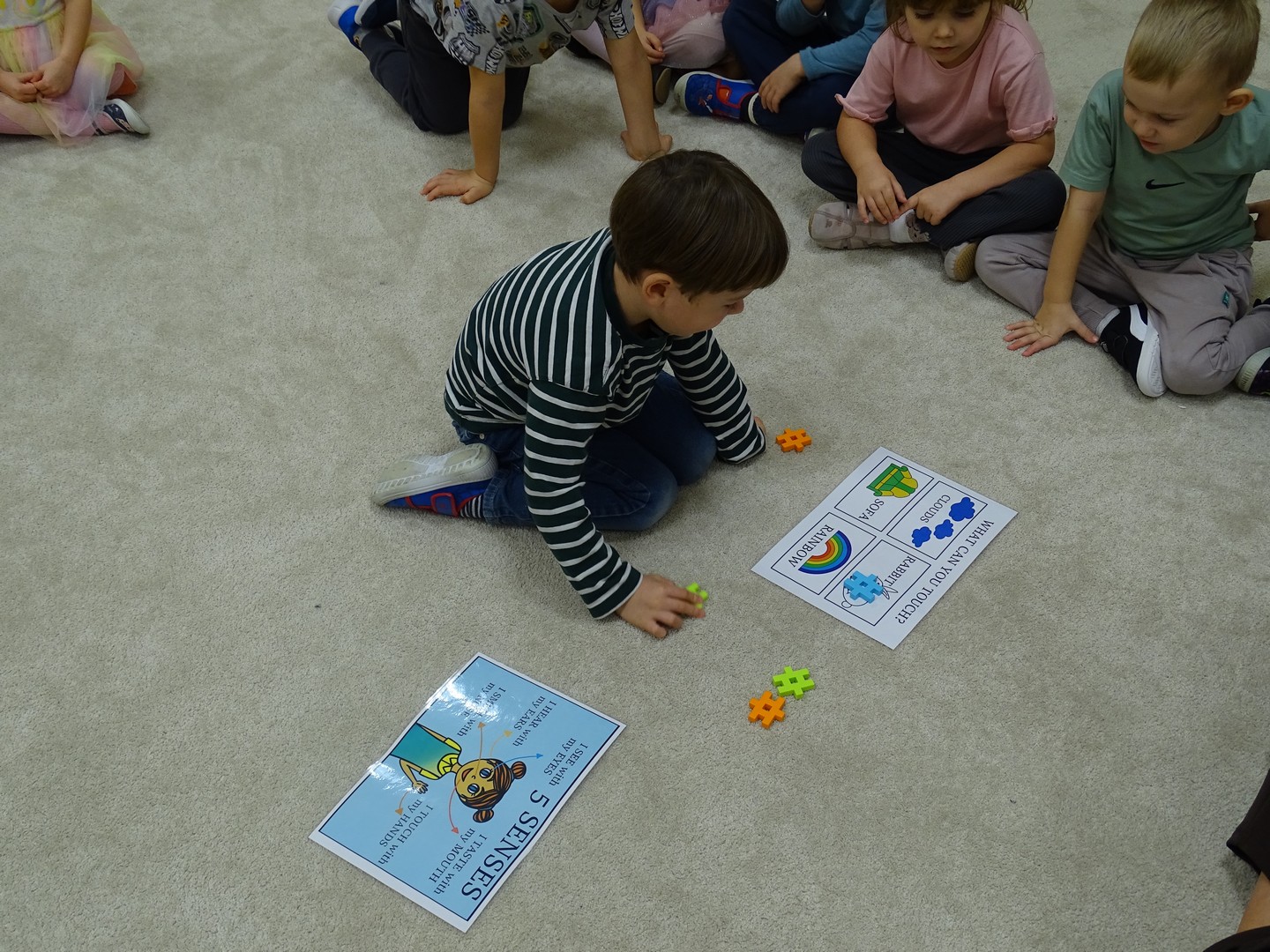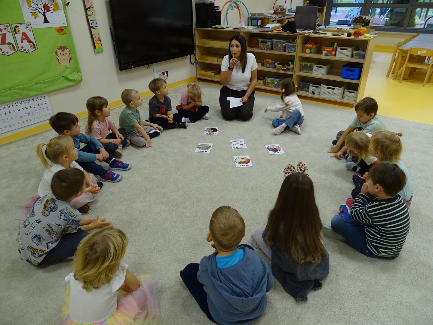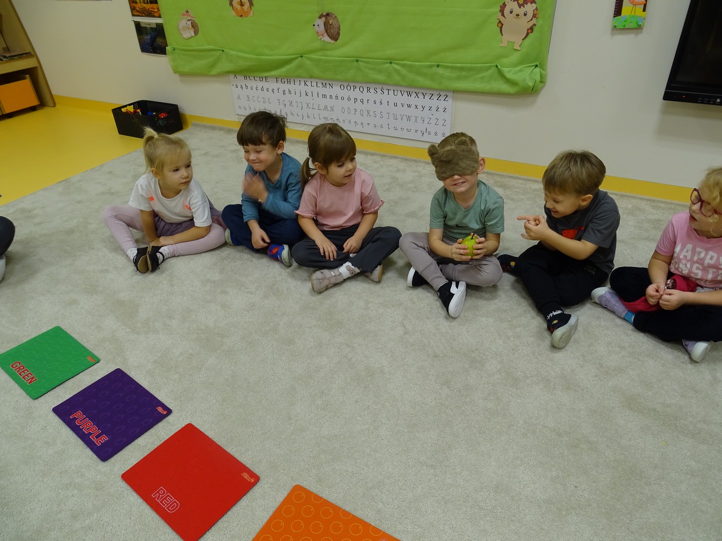 "Pięć zmysłów mam i wszystkie znam"..... Wraz z grupą "Jeżyki" poznaliśmy zmysły jakie posiada człowiek. Za pomocą kart obrazkowych utrwaliliśmy ich nazwy. Dzieci dotykały poszczególnych części ciała śpiewając piosenkę "Five senses". Następnie poznaliśmy nazwy owoców i dopasowaliśmy ich kolory do mat znajdujących się na dywanie. Dzieci z zasłoniętymi oczkami odgadywały nazwy poszczególnych owoców a następnie określały ich kolor. Najtrudniejszym zadaniem okazało się jednak rozpoznanie smaku owocu i nazywanie z zakrytymi oczkami. Niemniej jednak dzieci poradziły sobie z tym zadaniem bardzo dobrze. Na koniec była "owocowa uczta" i każdy przedszkolak mógł spróbować swojego ulubionego owocu. Zadanie to dostarczyło dzieciom różnorodnych bodźców oraz przyczyniło się do rozwoju zmysłów malucha.