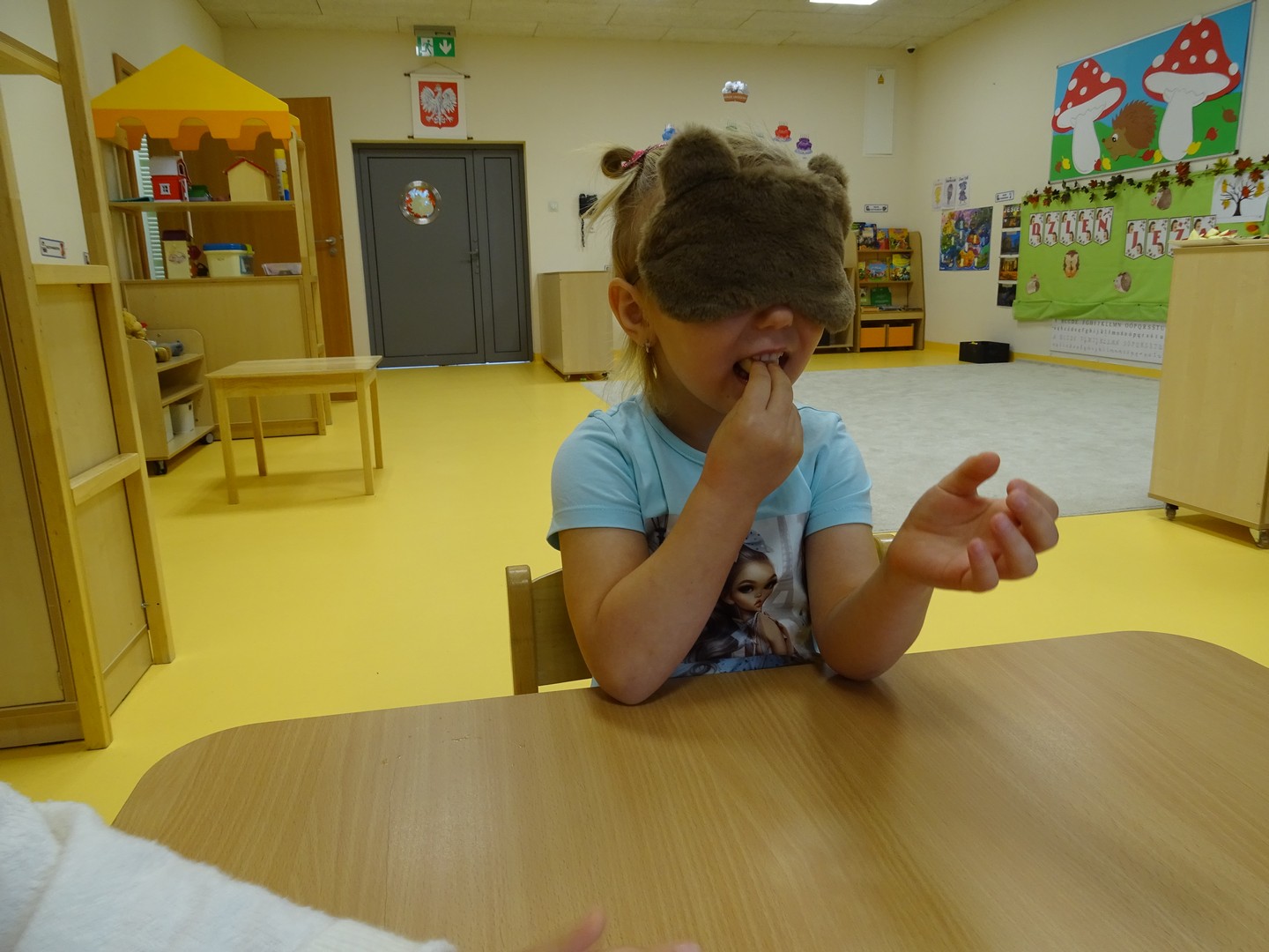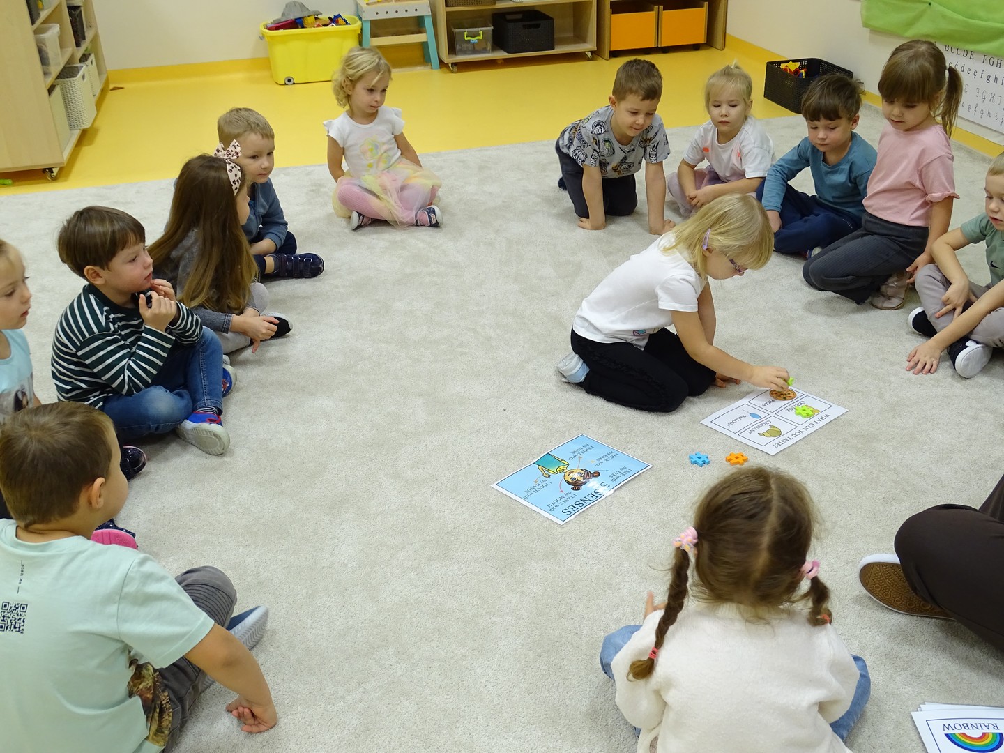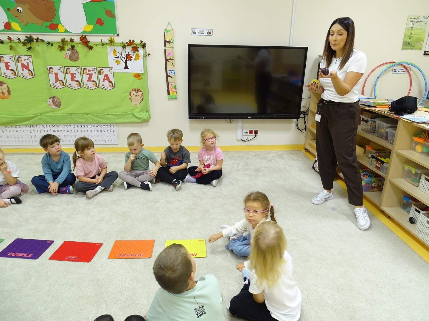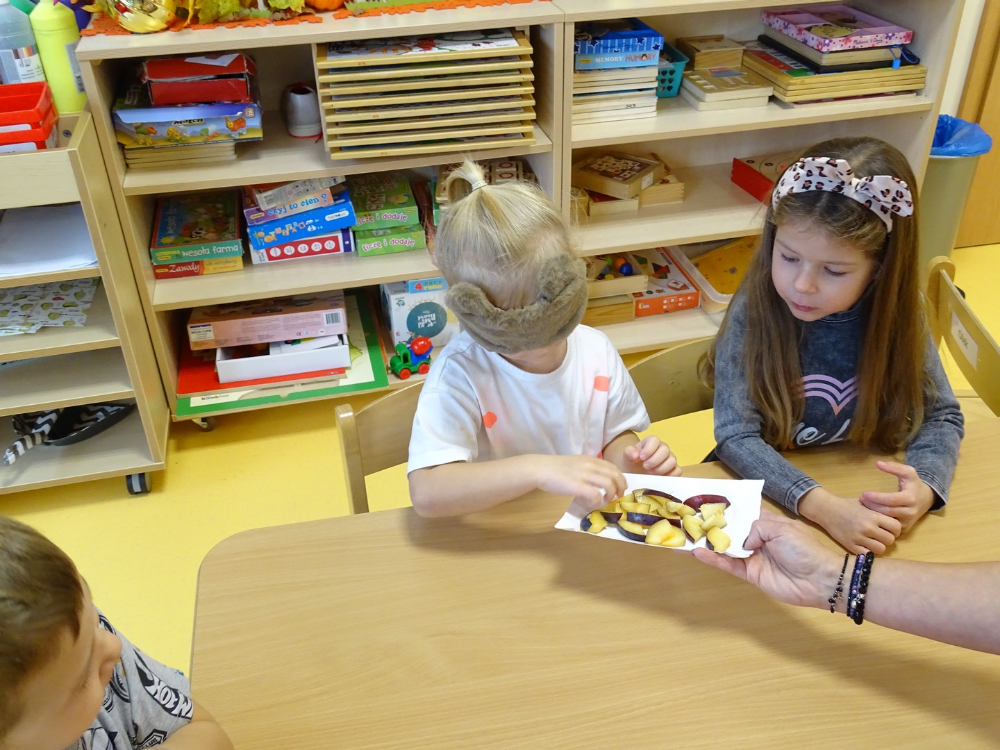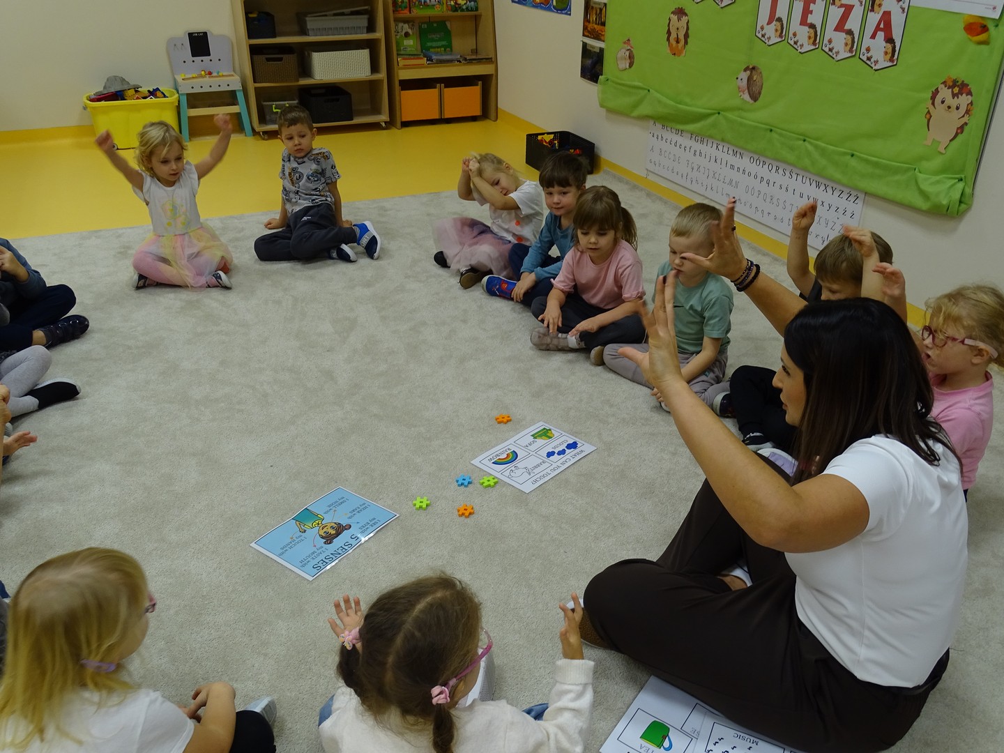 "Pięć zmysłów mam i wszystkie znam"..... Wraz z grupą "Jeżyki" poznaliśmy zmysły jakie posiada człowiek. Za pomocą kart obrazkowych utrwaliliśmy ich nazwy. Dzieci dotykały poszczególnych części ciała śpiewając piosenkę "Five senses". Następnie poznaliśmy nazwy owoców i dopasowaliśmy ich kolory do mat znajdujących się na dywanie. Dzieci z zasłoniętymi oczkami odgadywały nazwy poszczególnych owoców a następnie określały ich kolor. Najtrudniejszym zadaniem okazało się jednak rozpoznanie smaku owocu i nazywanie z zakrytymi oczkami. Niemniej jednak dzieci poradziły sobie z tym zadaniem bardzo dobrze. Na koniec była "owocowa uczta" i każdy przedszkolak mógł spróbować swojego ulubionego owocu. Zadanie to dostarczyło dzieciom różnorodnych bodźców oraz przyczyniło się do rozwoju zmysłów malucha.