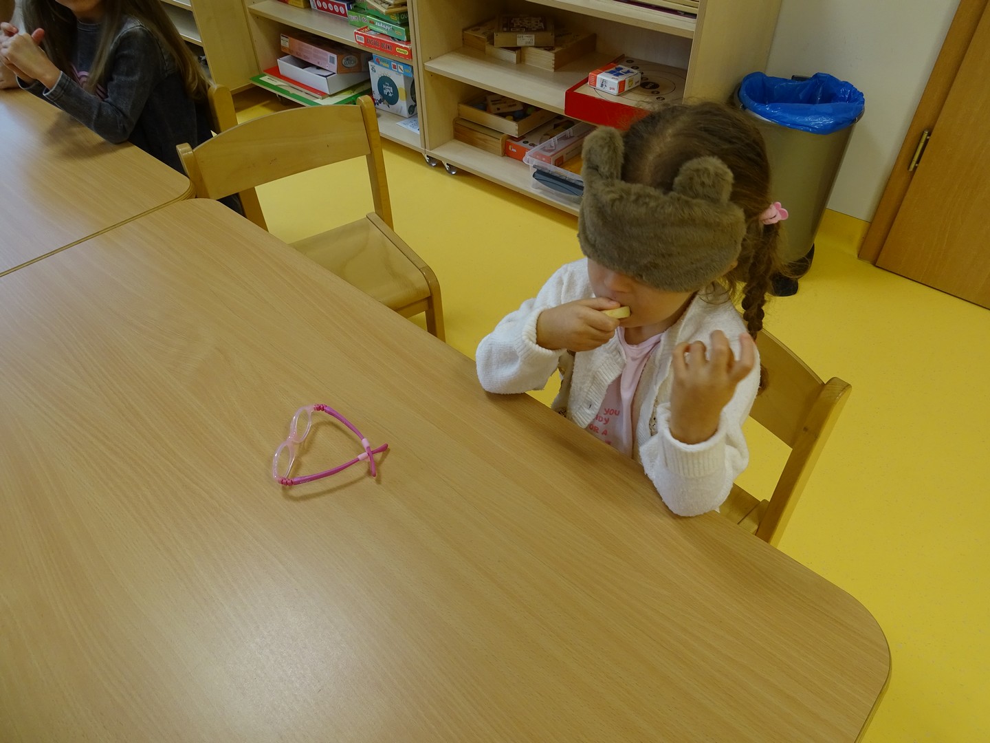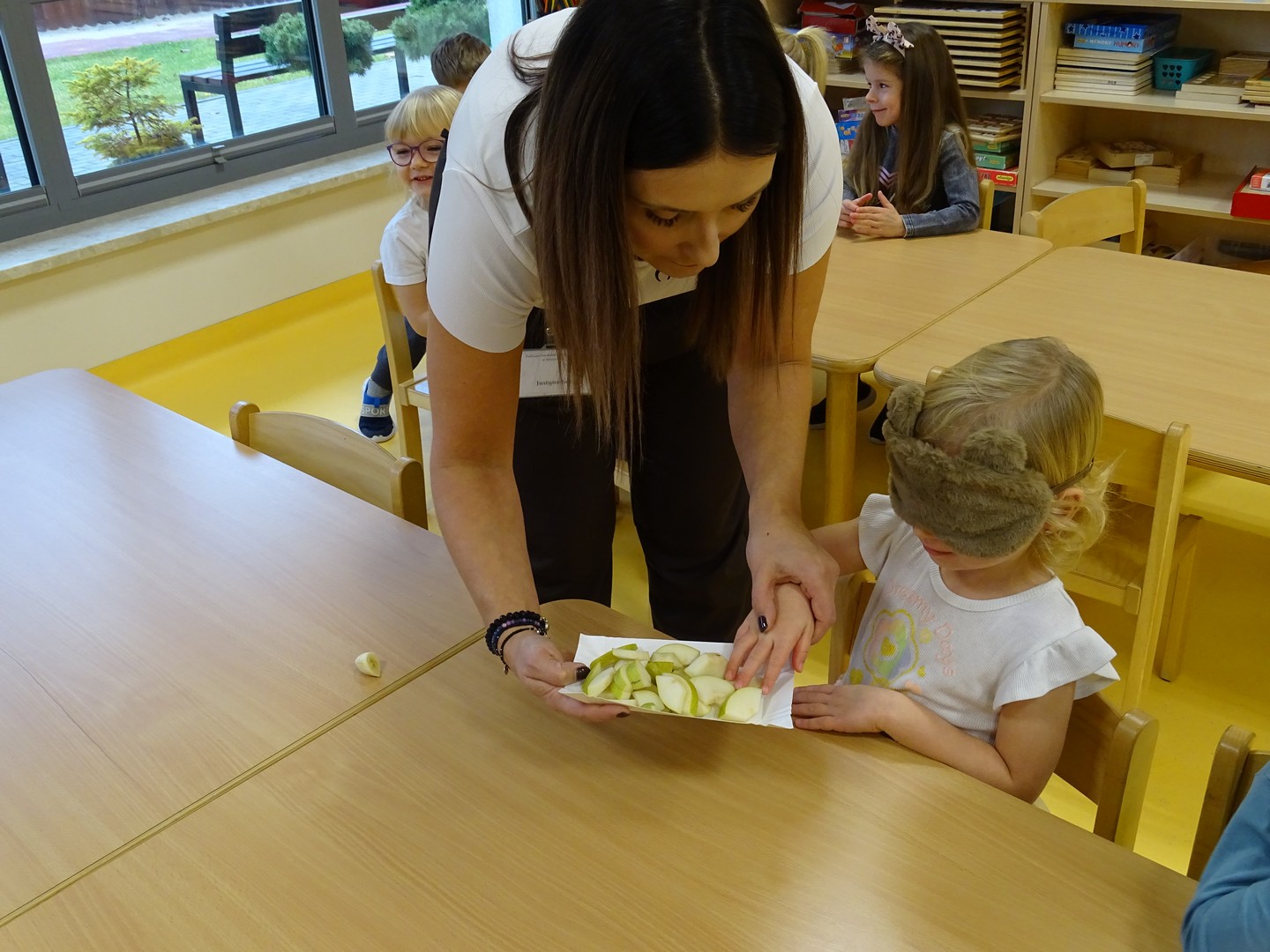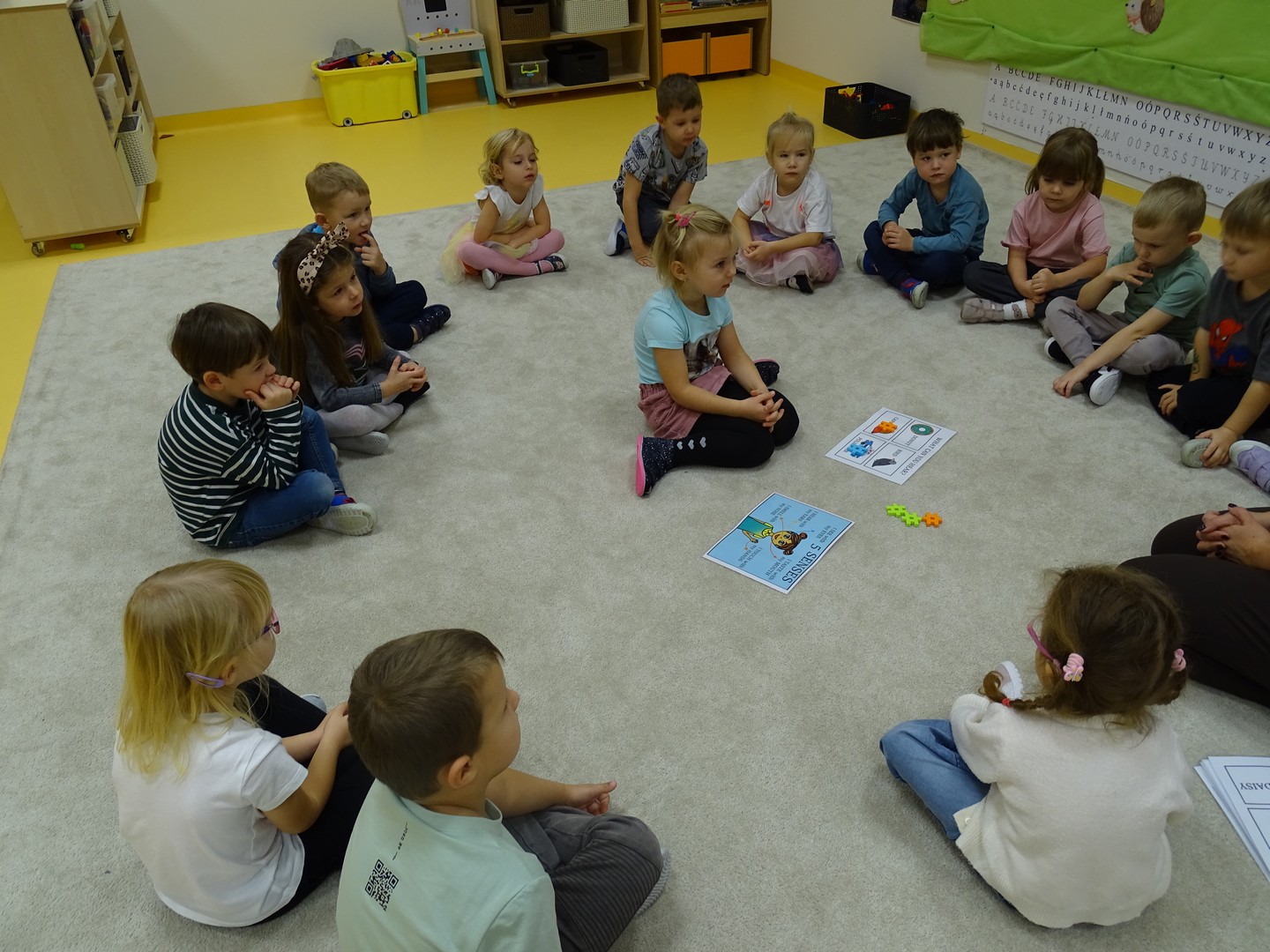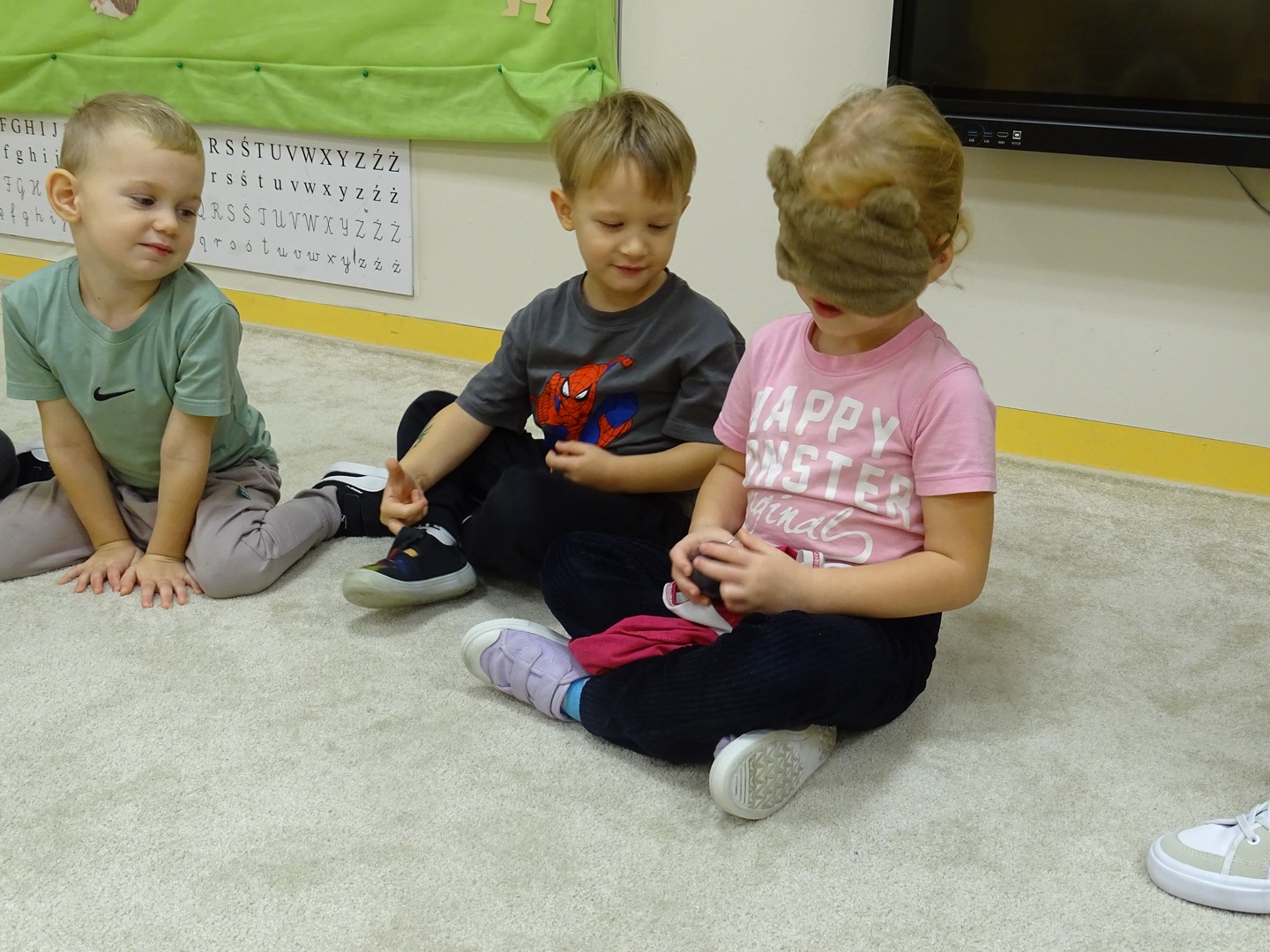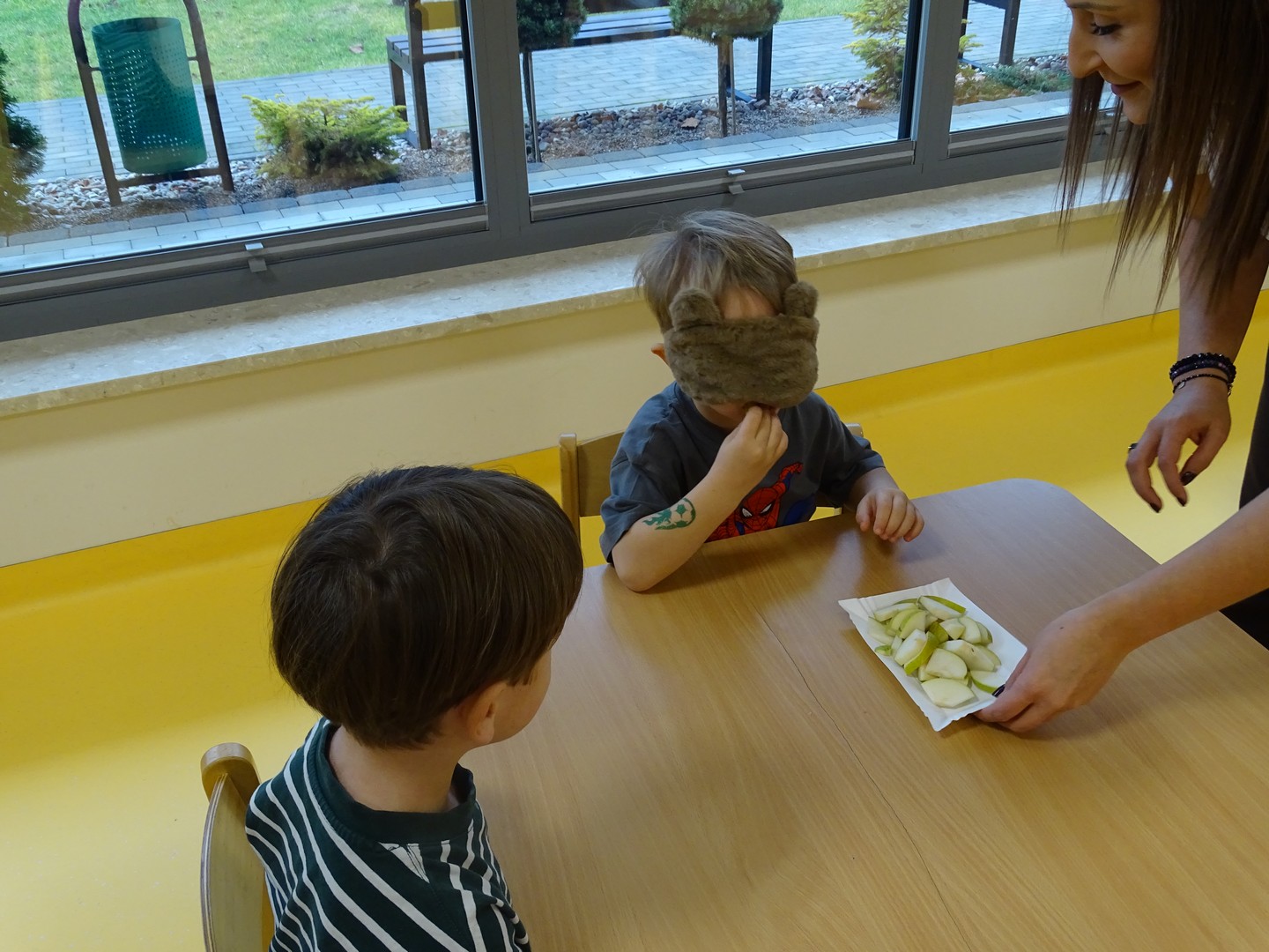 "Pięć zmysłów mam i wszystkie znam"..... Wraz z grupą "Jeżyki" poznaliśmy zmysły jakie posiada człowiek. Za pomocą kart obrazkowych utrwaliliśmy ich nazwy. Dzieci dotykały poszczególnych części ciała śpiewając piosenkę "Five senses". Następnie poznaliśmy nazwy owoców i dopasowaliśmy ich kolory do mat znajdujących się na dywanie. Dzieci z zasłoniętymi oczkami odgadywały nazwy poszczególnych owoców a następnie określały ich kolor. Najtrudniejszym zadaniem okazało się jednak rozpoznanie smaku owocu i nazywanie z zakrytymi oczkami. Niemniej jednak dzieci poradziły sobie z tym zadaniem bardzo dobrze. Na koniec była "owocowa uczta" i każdy przedszkolak mógł spróbować swojego ulubionego owocu. Zadanie to dostarczyło dzieciom różnorodnych bodźców oraz przyczyniło się do rozwoju zmysłów malucha.