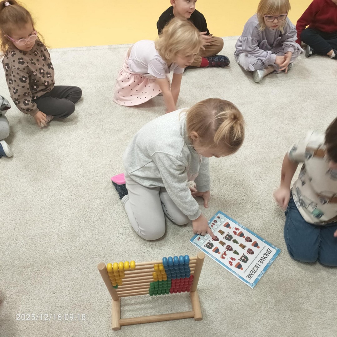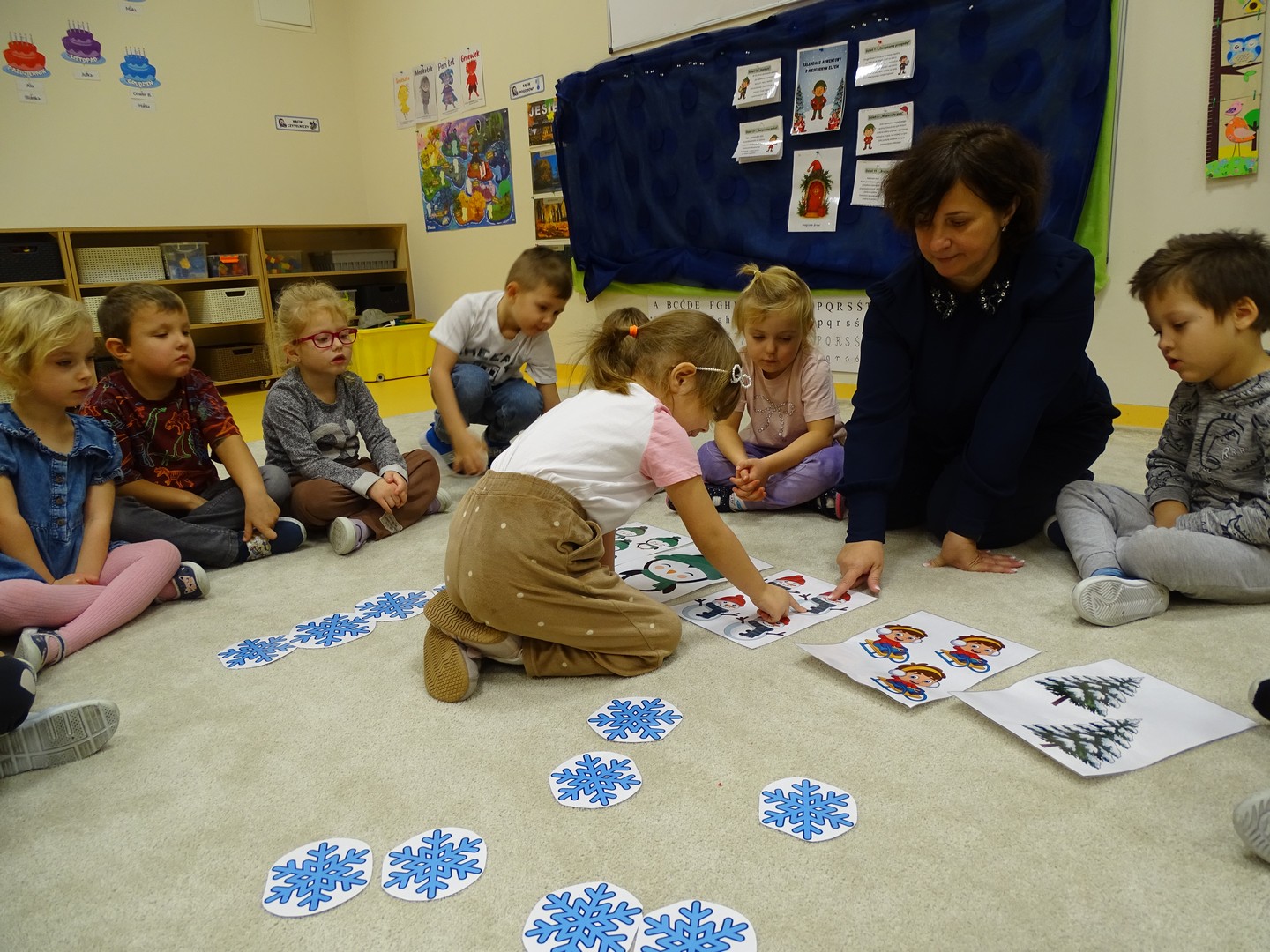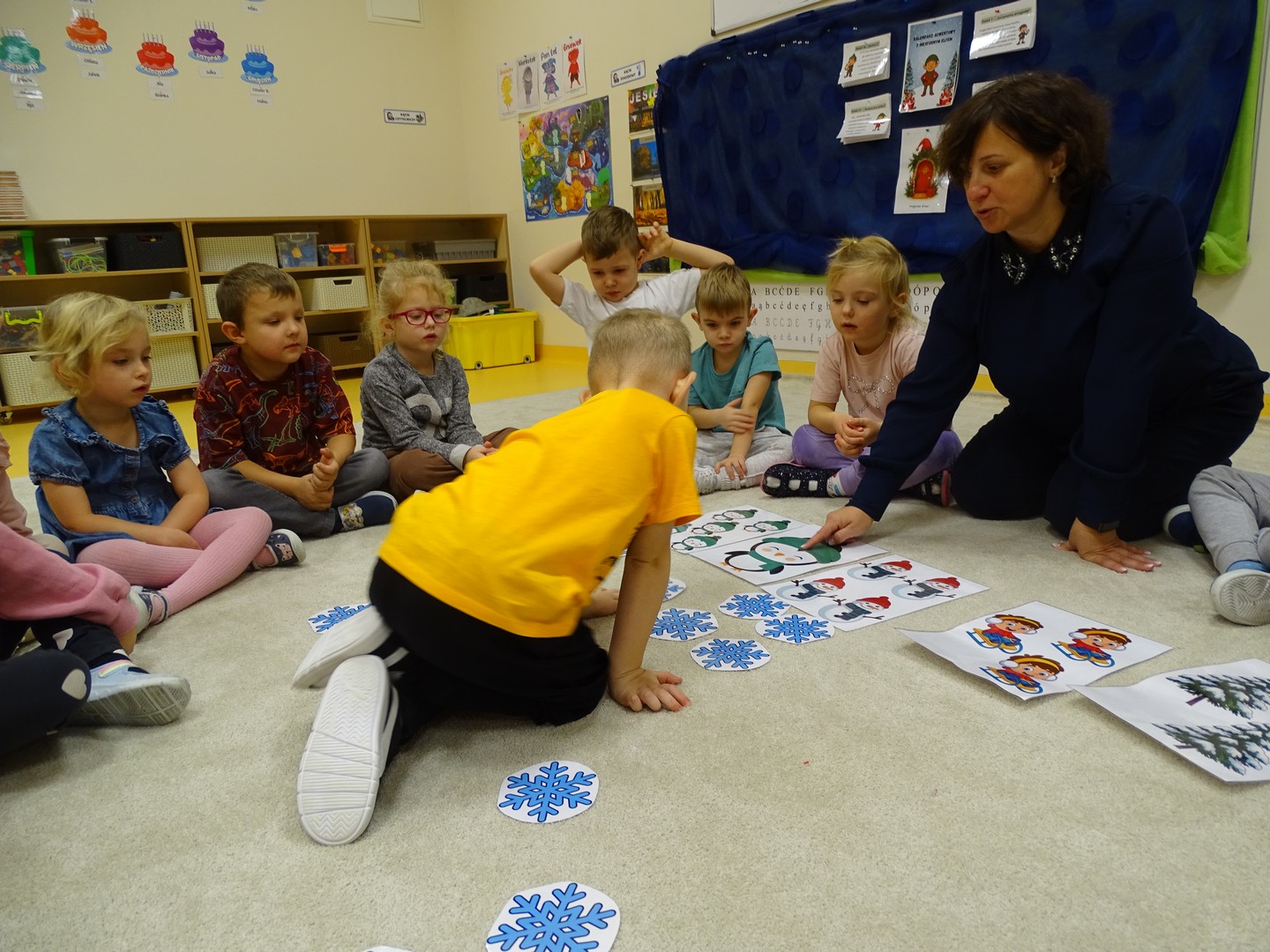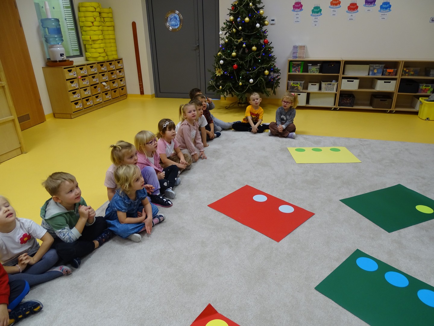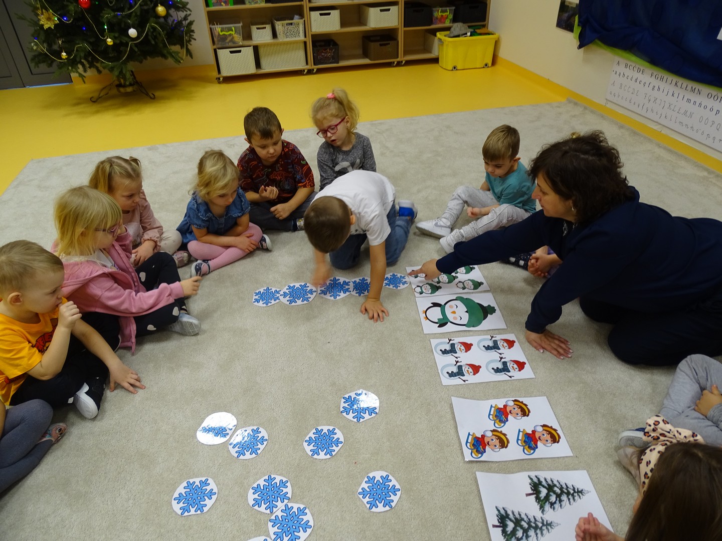 W grudniu w grupie "Jeżyki" we wszystkie wtorki odbywały się grudniowe matematyczne zabawy. Dzieci przeliczały śnieżynki, liczyły na liczydle, układały kryształki oraz brały udział w zabawach na spostrzegawczość. Miały również zabawy matematyczne, podczas których rzucały kostką i układały figury geometryczne – koło, trójkąt i kwadrat. Dzieci ozdobiły choinkę figurami geometrycznymi, co pozwoliło im utrwalić znajomość kształtów. Podczas zajęć wyszukiwały na sali przedmioty w kształcie koła, trójkąta oraz kwadratu. Wszystkie zabawy miały na celu rozwijanie spostrzegawczości, liczenia i poznawania geometrycznych figur w atrakcyjnej i zabawowej formie.