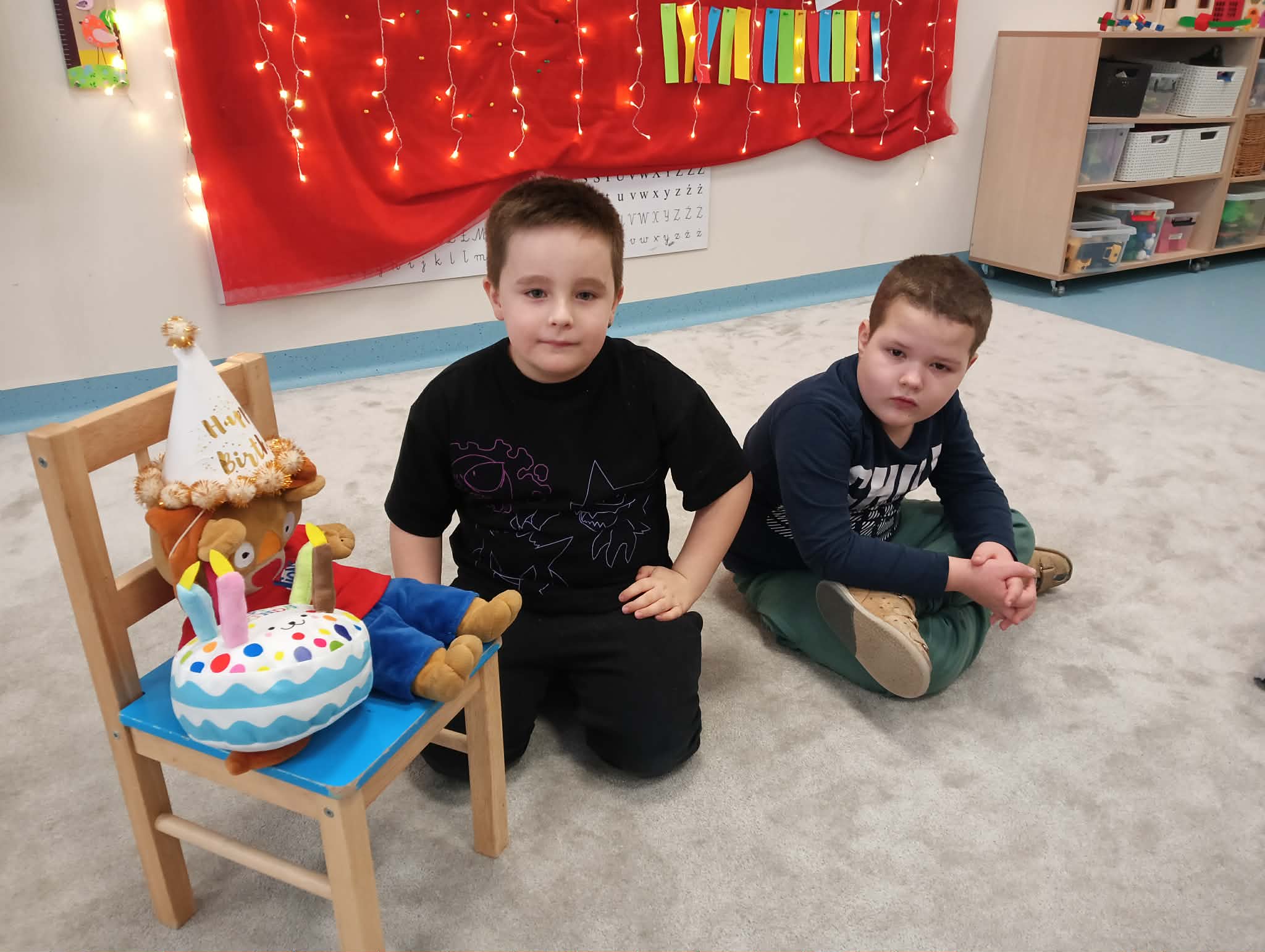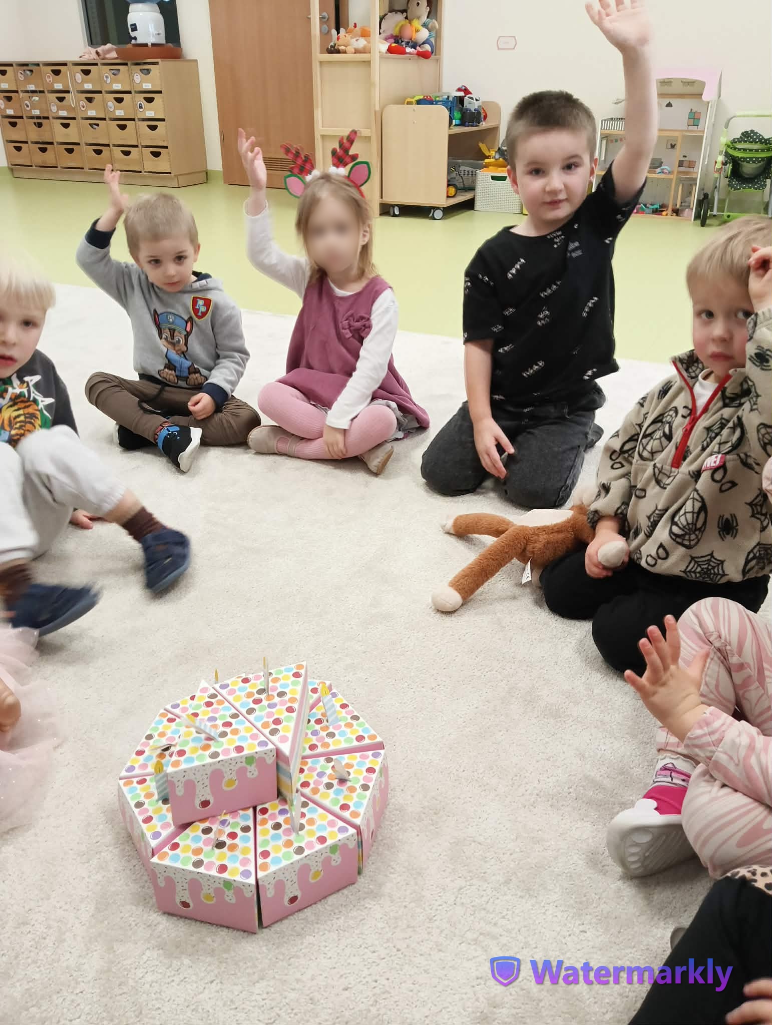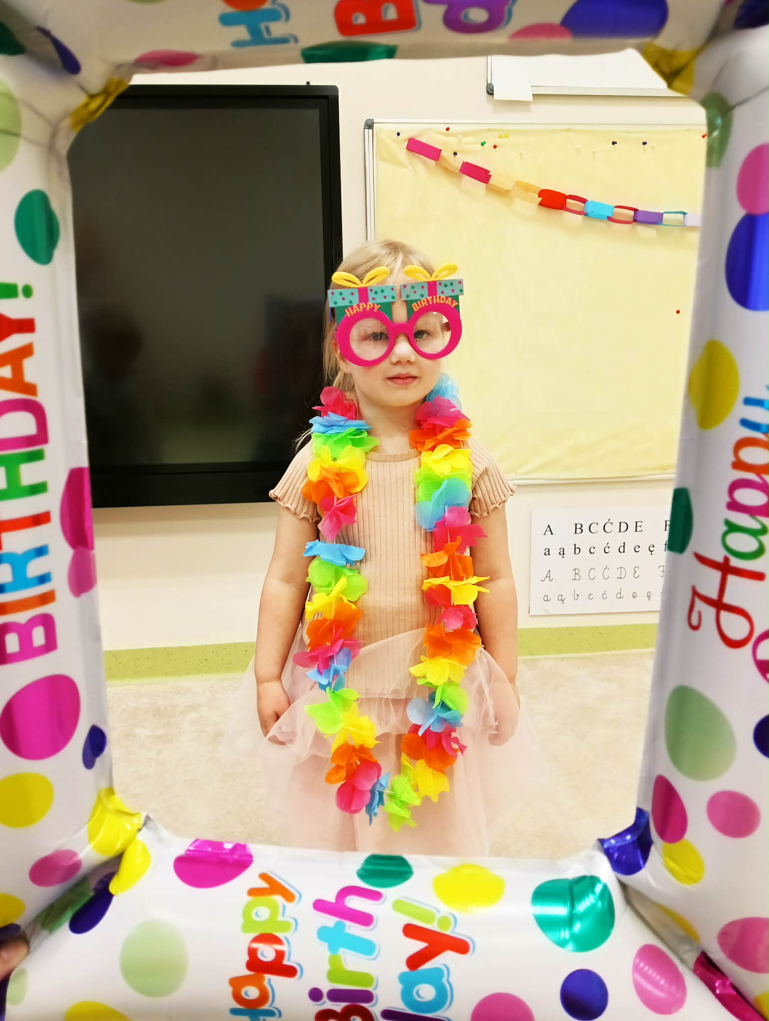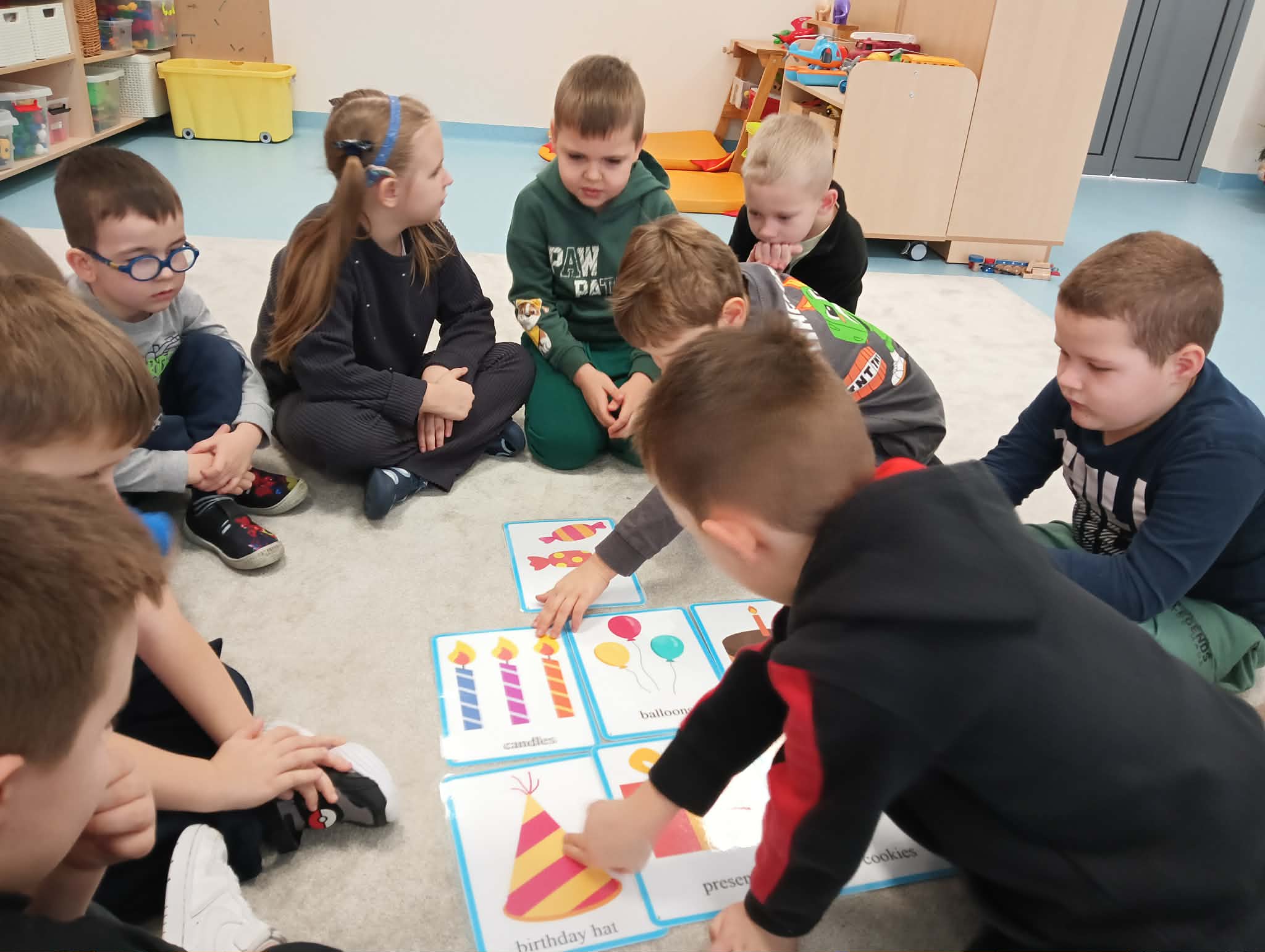 W naszym przedszkolu odbyły się wyjątkowe urodziny pacynki Billy’ego – wesołego lwa, który na co dzień towarzyszy dzieciom podczas zajęć języka angielskiego. Z tej okazji nie mogło zabraknąć urodzinowych atrakcji i dobrej zabawy. Billy wystąpił w kolorowej czapeczce urodzinowej, a dzieci przygotowały dla niego imponujący tort w rozmiarze XXL. Wspólnie zaśpiewaliśmy „Happy Birthday”, ćwicząc przy tym angielskie słówka związane z urodzinami, takie jak cake, candles, birthday czy party. Przedszkolaki kształtowały również umiejętność liczenia. Ważnym elementem zajęć było także wspólne czytanie książki w języku angielskim o tematyce urodzinowej. Dzieci z zainteresowaniem słuchały opowieści, poznając nowe słówka i utrwalając poznane zwroty w przyjaznej, bajkowej formie. Dużo radości sprawiła wszystkim wesoła fotobudka, w której przedszkolaki mogły zrobić pamiątkowe zdjęcia, wykorzystując zabawne akcesoria i urodzinowe dekoracje. Były to radosne lekcje, które połączyły naukę języka angielskiego, rozwijanie umiejętności matematycznych, czytelniczych oraz wspólne świętowanie.