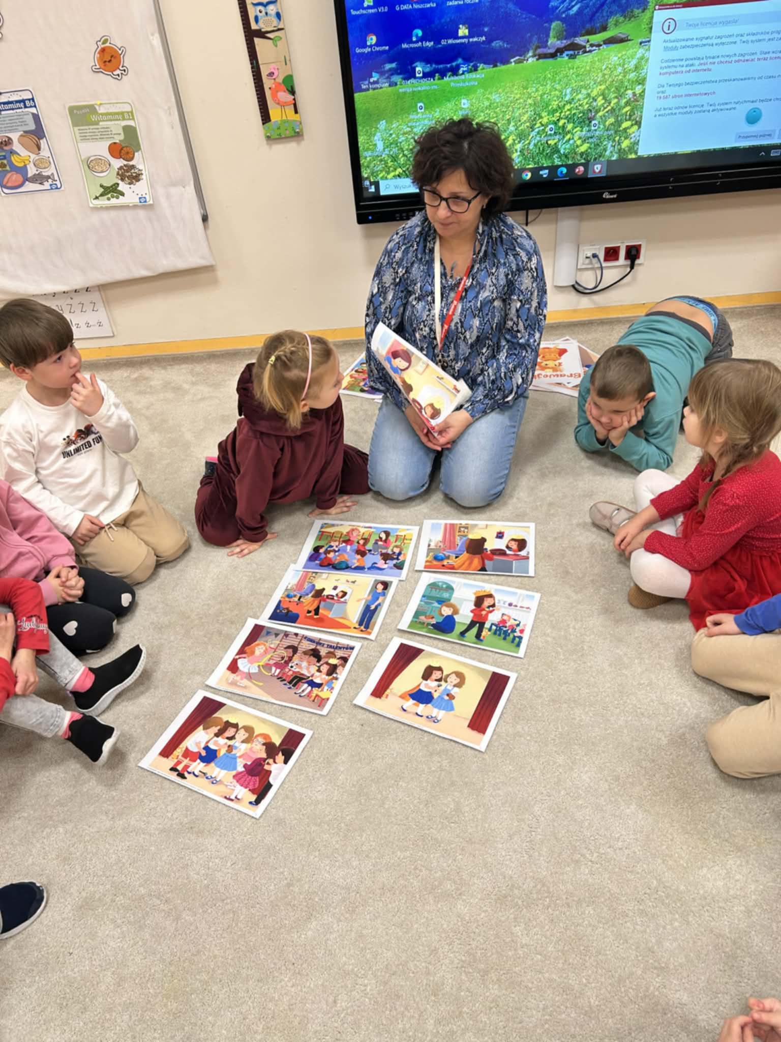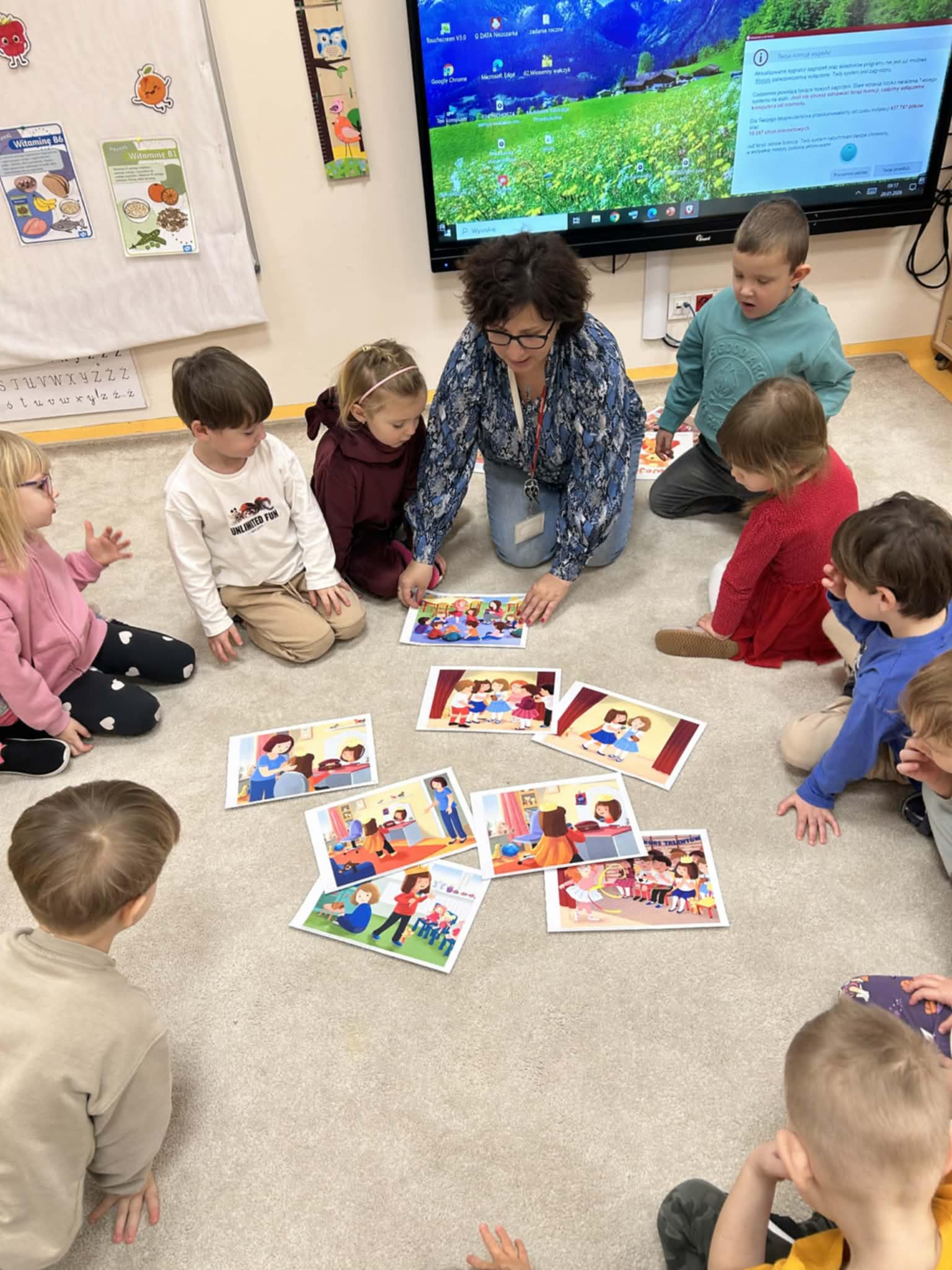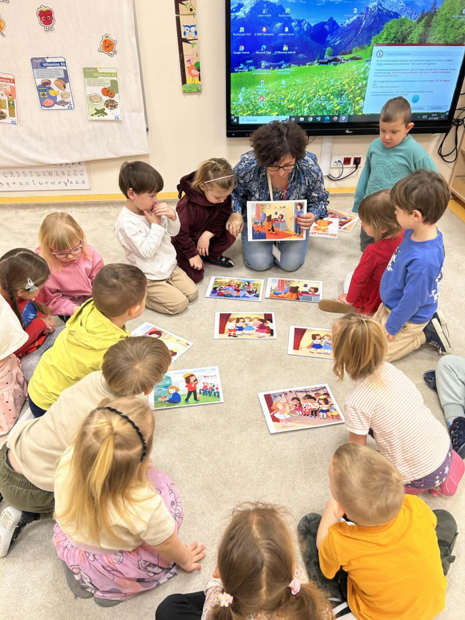 Kolejnym etapem zajęć było wyjaśnienie powiedzenia „Dumny jak paw”. Dzieci dowiedziały się, że oznacza to kogoś, kto jest bardzo dumny ze swoich osiągnięć i chce się tym chwalić, ale ważne jest, aby nie zapominać o innych. Nauczyciel wyjaśnił dzieciom ,że duma to uczucie, kiedy jesteśmy z siebie bardzo zadowoleni, bo coś nam się udało. Tak jak paw, który ma piękne pióra i jest z siebie dumny! Jednak ważne jest, żeby nie zapominać o innych i dzielić się radością z przyjaciółmi.