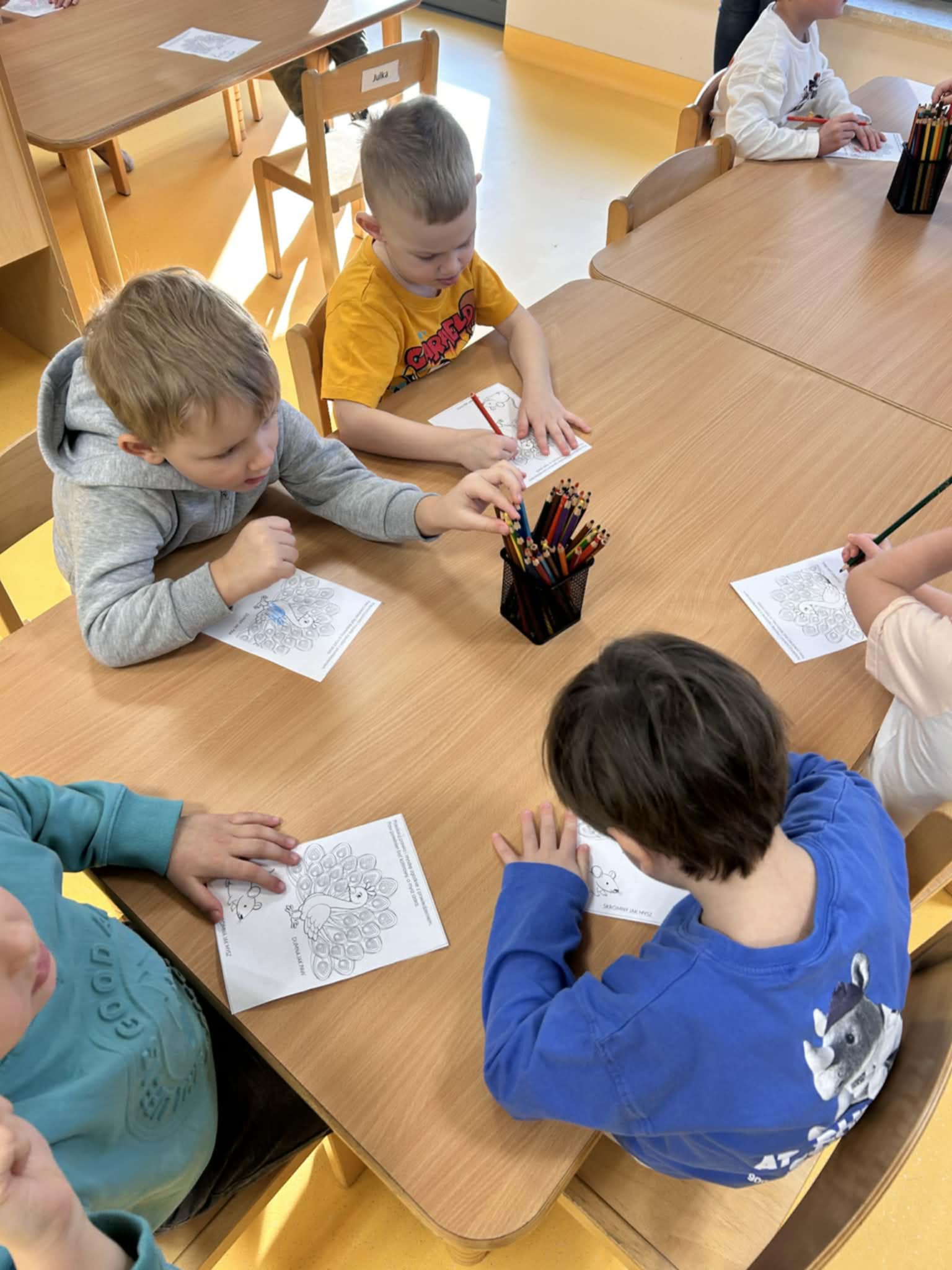 Na koniec dzieci pokolorowały obrazki: Brawojki, pawia i małej myszki. Zabawa ta miała na celu utrwalenie tematu dumy i emocji w prosty i przyjemny sposób.