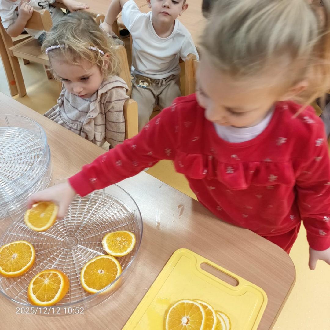 W oczekiwaniu na Święta Bożego Narodzenia, w naszej grupie przedszkolnej dzieci miały okazję uczestniczyć w wyjątkowym zadaniu związanym z kalendarzem adwentowym. Przygotowaliśmy piękne, naturalne ozdoby na choinkę – suszone plasterki cytryn i pomarańczy!
