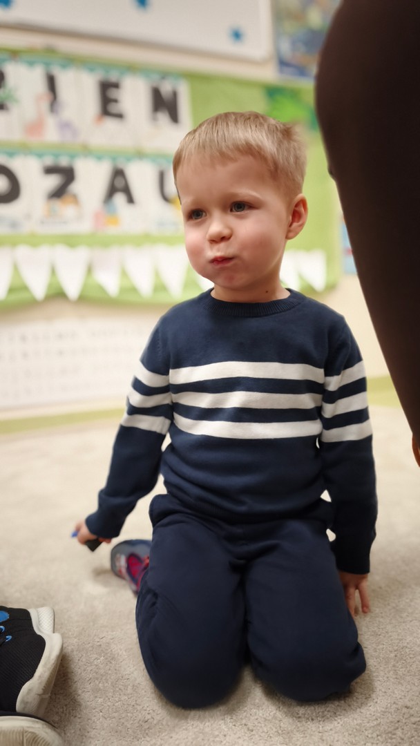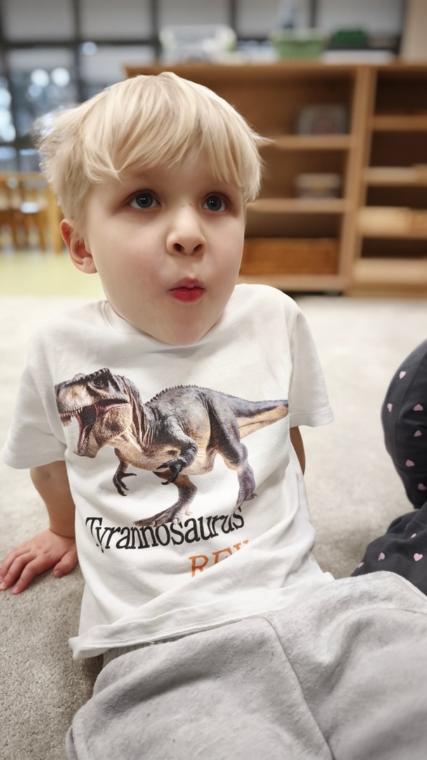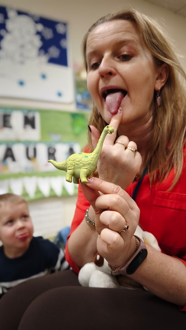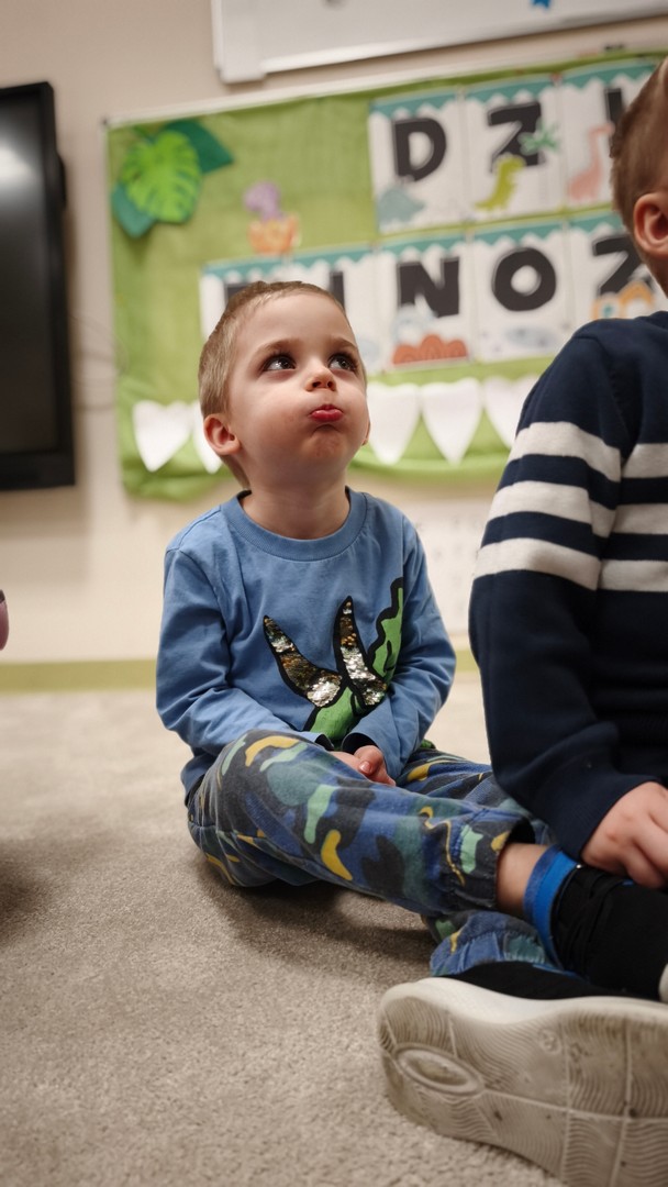 Dziś poznawaliśmy z Lulusiem świat dinozaurów. Pani Asia przygotowała dla nas nową bajkę połączoną z ćwiczeniami usprawniającymi nasze wargi i język. Poszukiwaniu stegozura i diplodoka masowaliśmy dziś podniebienie i policzki. Aby odszukać tyranozaura sięgaliśmy językiem do górnych zębów. A triceratopsa znaleźliśmy pod górą liści i musieliśmy zrobić "górkę" z języka, by wydobyć dinozaura z ukrycia. Dziś p. Asia przyniosła dinozaura, którego nazwę odgadliśmy bez trudu.