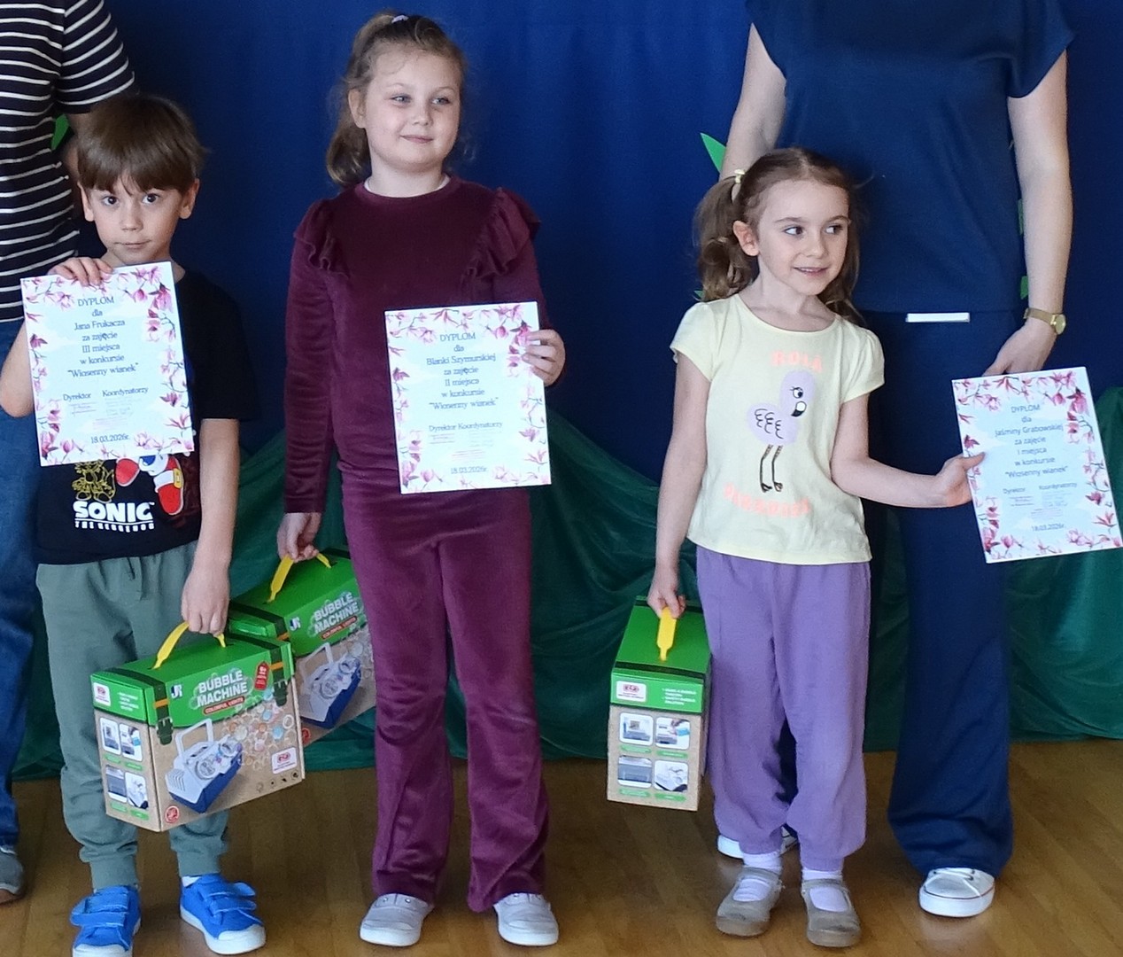 W naszym przedszkolu odbył się konkurs na najpiękniejszy wiosenny wianek. Celem konkursu było rozwijanie kreatywności, kształtowanie wrażliwości estetycznej oraz wspólne, radosne spędzanie czasu z rodziną podczas przygotowania prac konkursowych. Powstałe wianki zachwycały pomysłowością. Wszystkie prace zostały zaprezentowane na kiermaszu charytatywnym, podczas którego można było je zakupić. Dochód ze sprzedaży przeznaczony został na wsparcie Fundacji Gajusz. Wszyscy uczestnicy zostali nagrodzeni a 3 najbardziej wyróżniające się prace komisja nagrodziła miejscami: