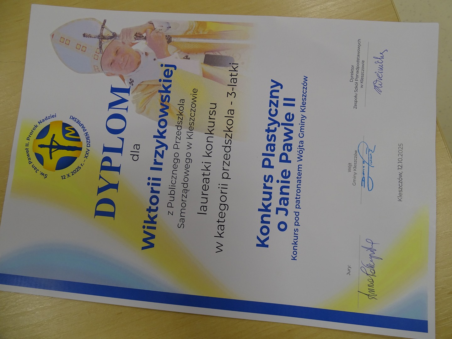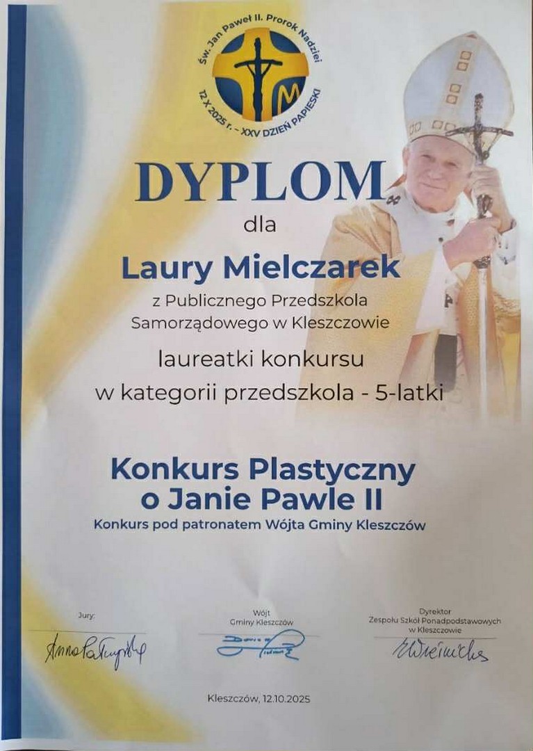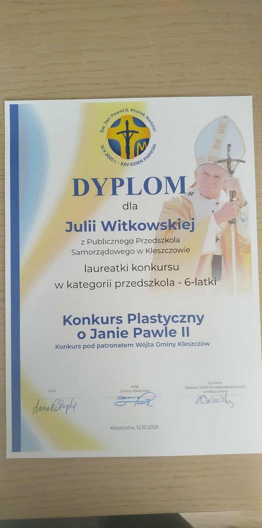 Dnia 6.10.2025r. odbyło się rozstrzygnięcie XVI Konkursu Plastycznego o Janie Pawle II. Konkurs zorganizowany był przez ZSP w Kleszczowie oraz Parafię Najświętszej Marii Panny w Kleszczowie.