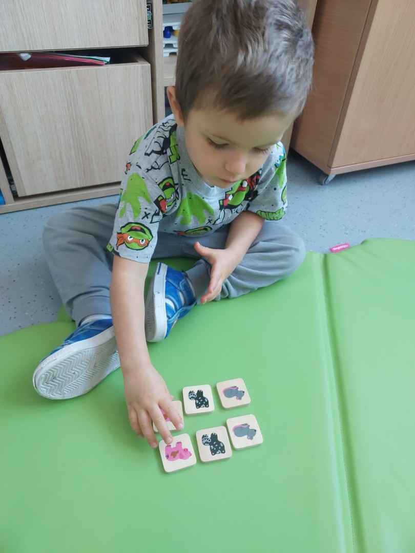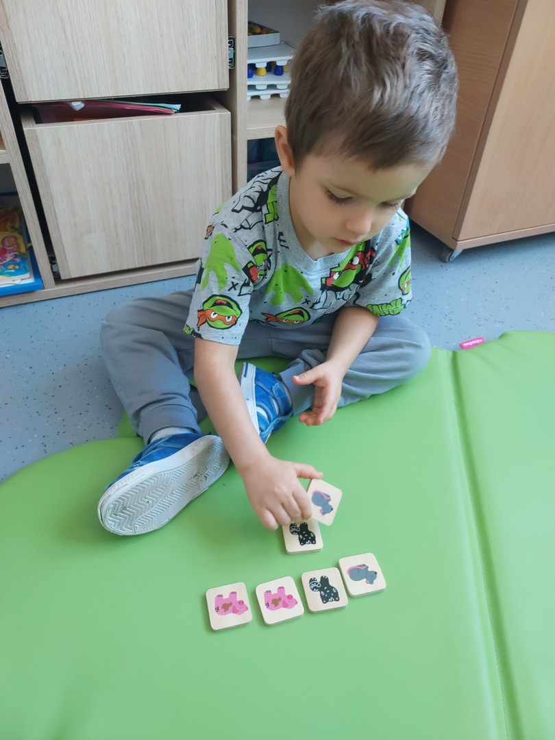 Dziś pani Asia bawiła się w rozpoznawanie dźwięków. Maluszek wskazywał i naśladował proste odgłosy zwierząt. Układał też na zielonej łące zwierzęta we wskazanej kolejności. Nie było trudne dopasowanie jednakowych obrazków.