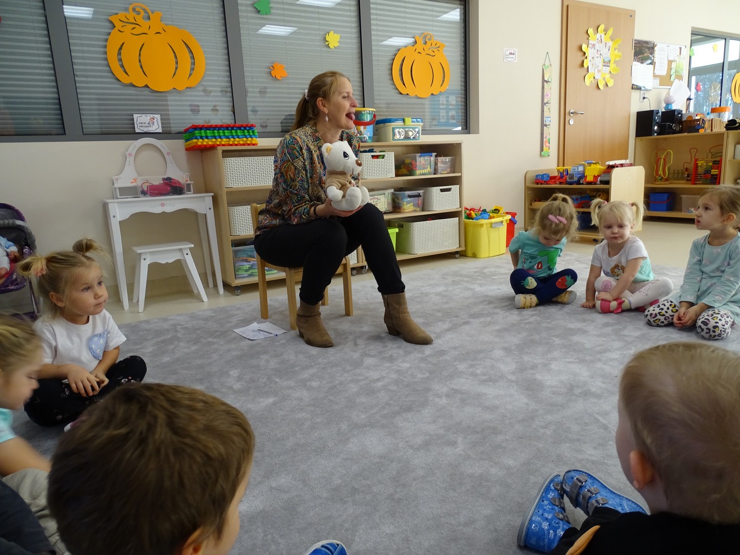 Dziś na cotygodniowe zabawy z misiem Lulusiem przyszła do nas p. Asia - logopeda. Miś ćwiczy z nami usprawnianie ruchów języka, naprzemienność i precyzję ruchów. Umiemy już zrobić "górkę z języka", i każdy umie odwzorować buziakową zabawę "zegar tik- tak". Jeszcze nie wszystko nam się udaje, ale ćwiczymy wytrwale i uważnie słuchamy o przygodach misia Lulusia. na zakończenie odpowiadamy na pytania o nowe przygody misia.