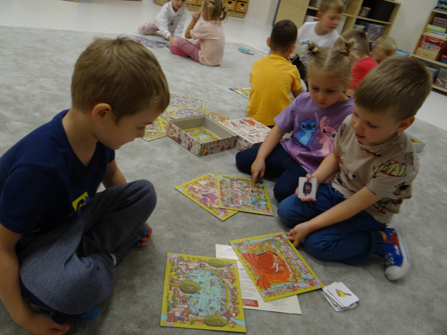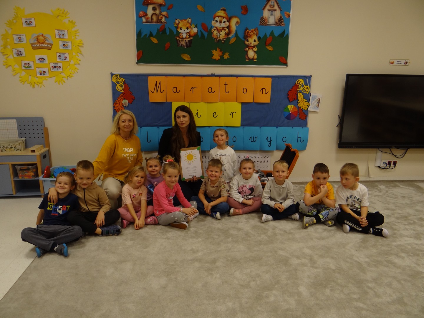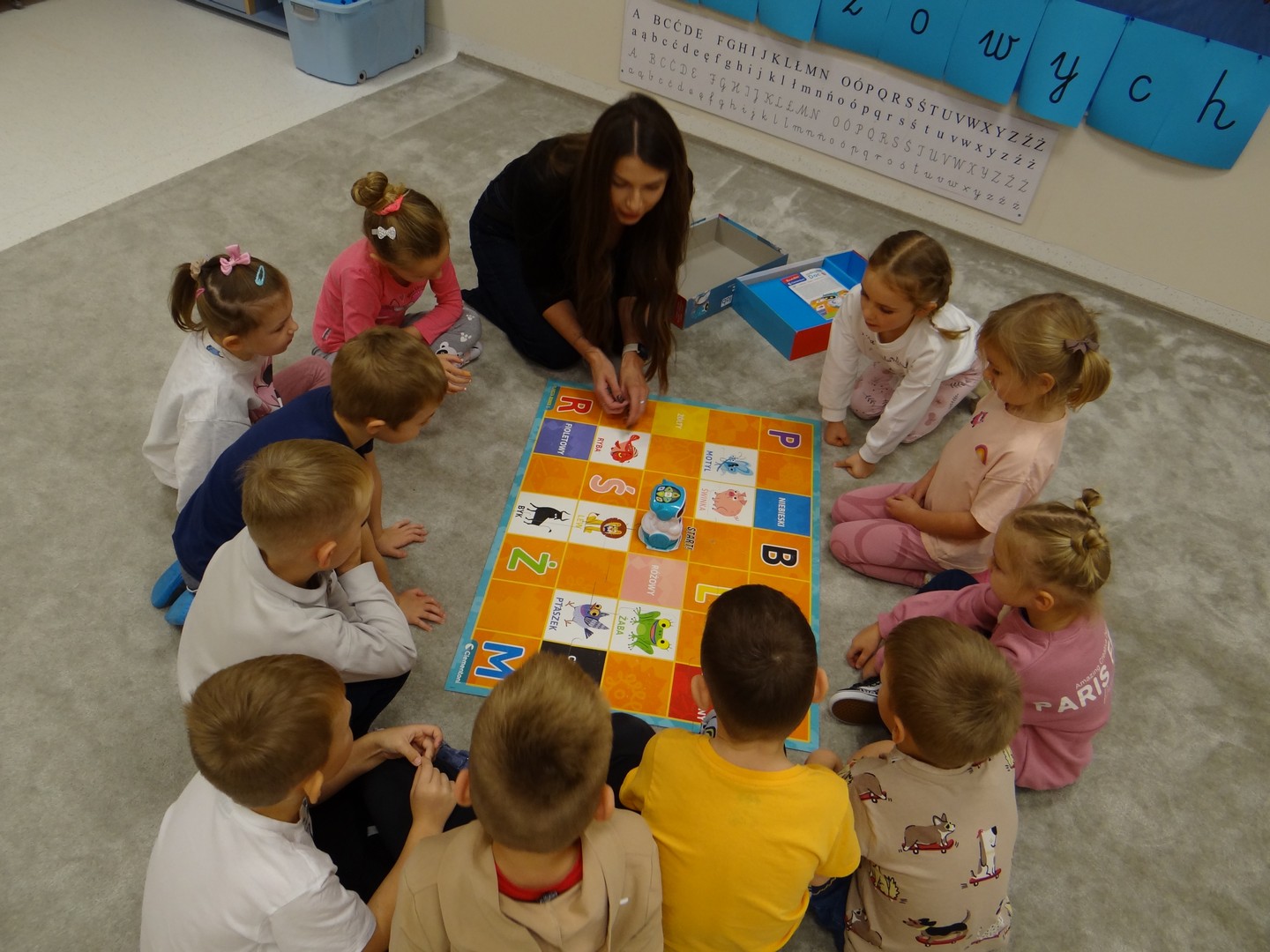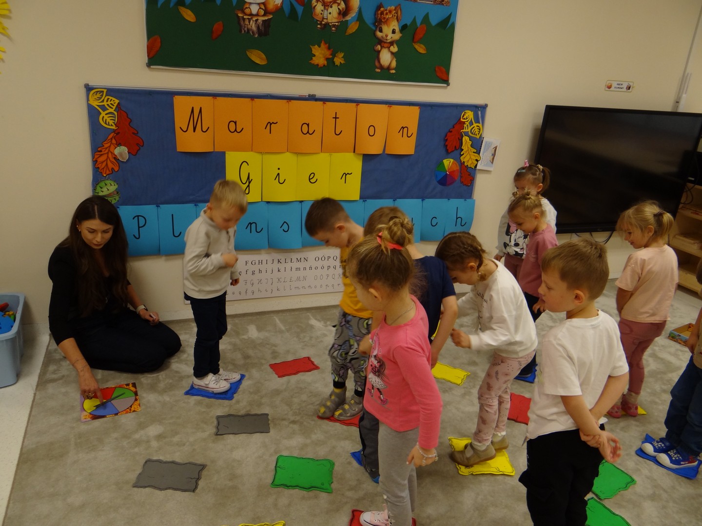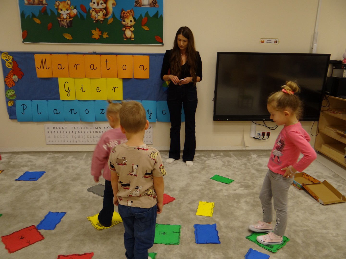 10.10.2025 r. uczestniczyliśmy w grupie w Maratonie Gier Planszowych. Dzień ten uświetniła, umiliła i pięknie zorganizowała nam mama Klarci. Dzięki Pani Agnieszce Słoneczka poznały zasady gier „Lawa”, „Papier, kamień, nożyce”. Czerpiąc radość ze wspólnej zabawy, wykazywały się szybką reakcją na polecenia oraz przestrzegały zasady „fair play”. Podczas maratonu dzieci z ogromnym zainteresowaniem obserwowały poruszającego się po macie robocika, którego samodzielnie kodowały ustalając kierunek i liczbę pól. Niesamowite emocje towarzyszyły dzieciom podczas oglądania na specjalnych okularach, przestrzennych obrazów. Na zakończenie zajęć, Słoneczka otrzymały od Pani Agnieszki upominki a same wręczyły Jej laurkę jako podziękowanie za przemile spędzony wspólnie czas. Dzięki takim wartościowym spotkaniom możemy nie tylko dobrze się bawić i uczyć ale nade wszystko jeszcze bardziej integrować ze środowiskiem rodzinnym. Po dzisiejszych zajęciach jesteśmy pewni, że planszówki mogą być świetną, rozwijającą formą spędzania czasu z dziećmi także w domu, podczas długich, jesiennych wieczorów.