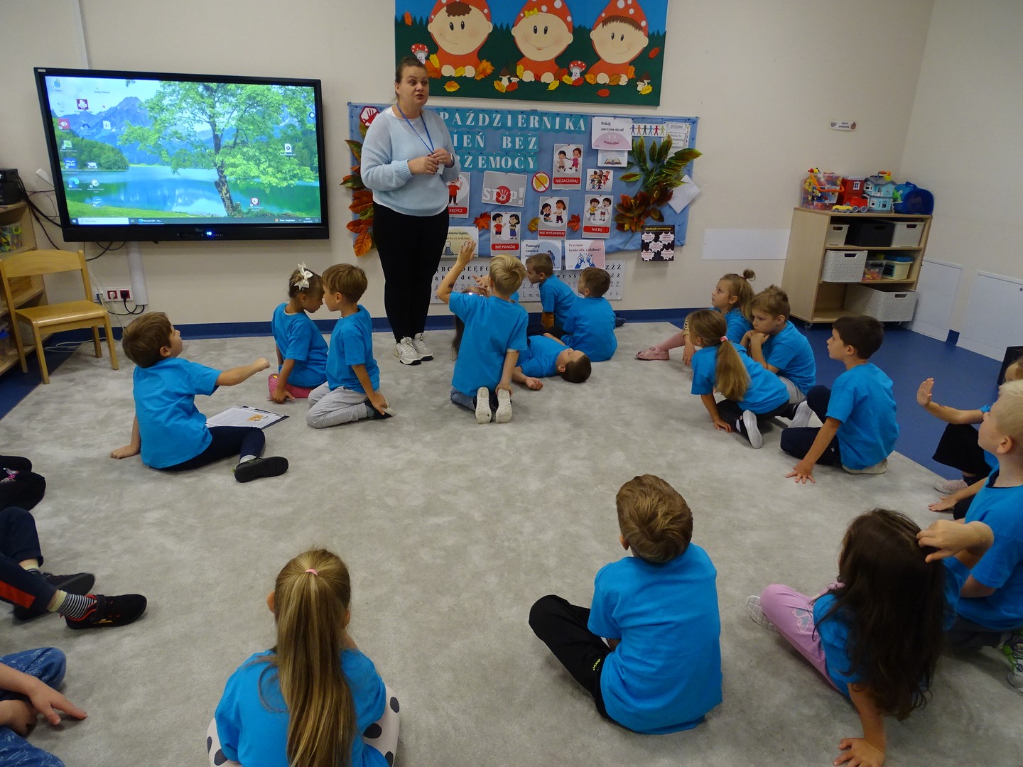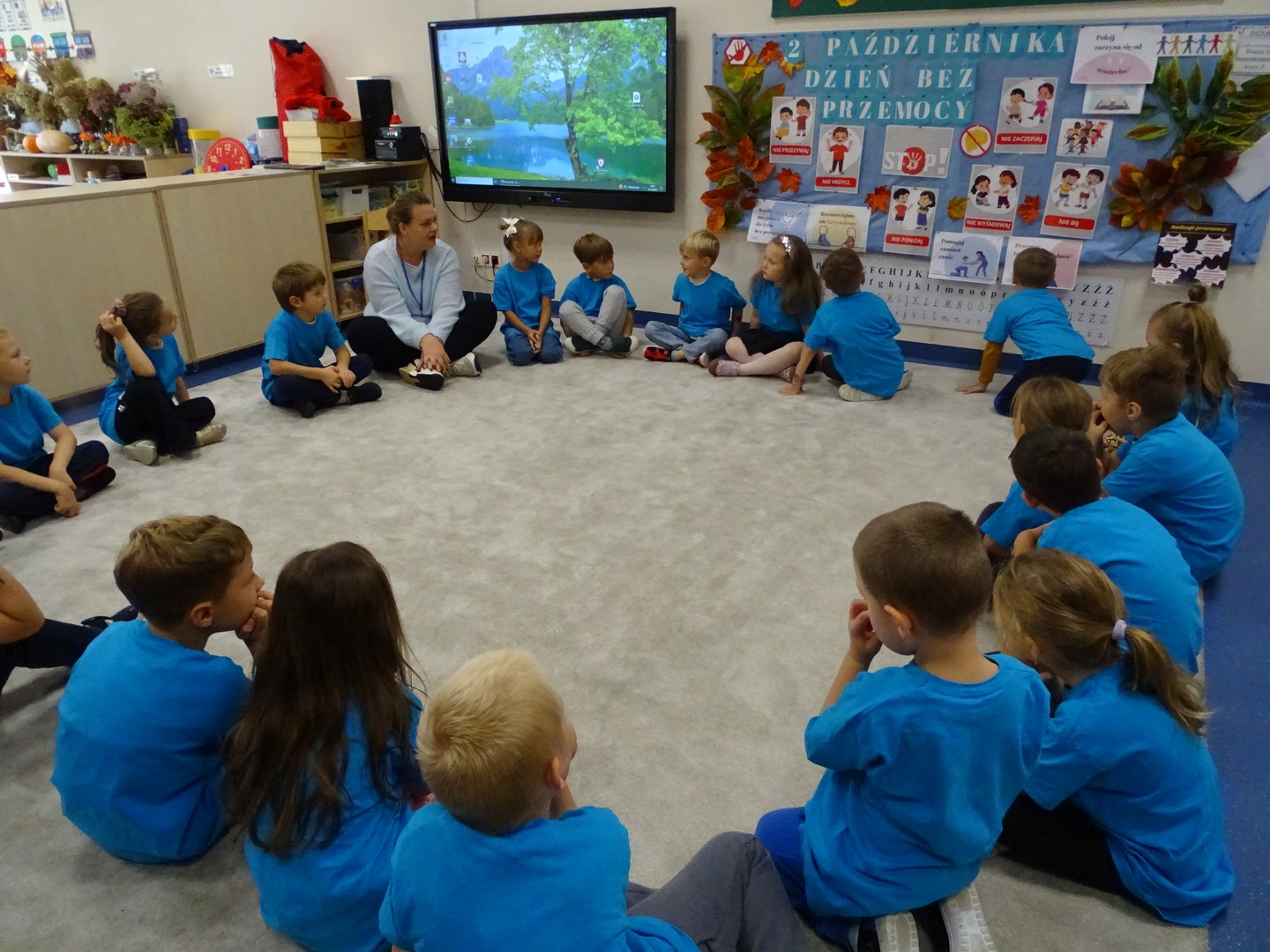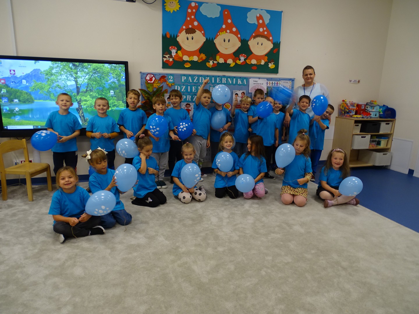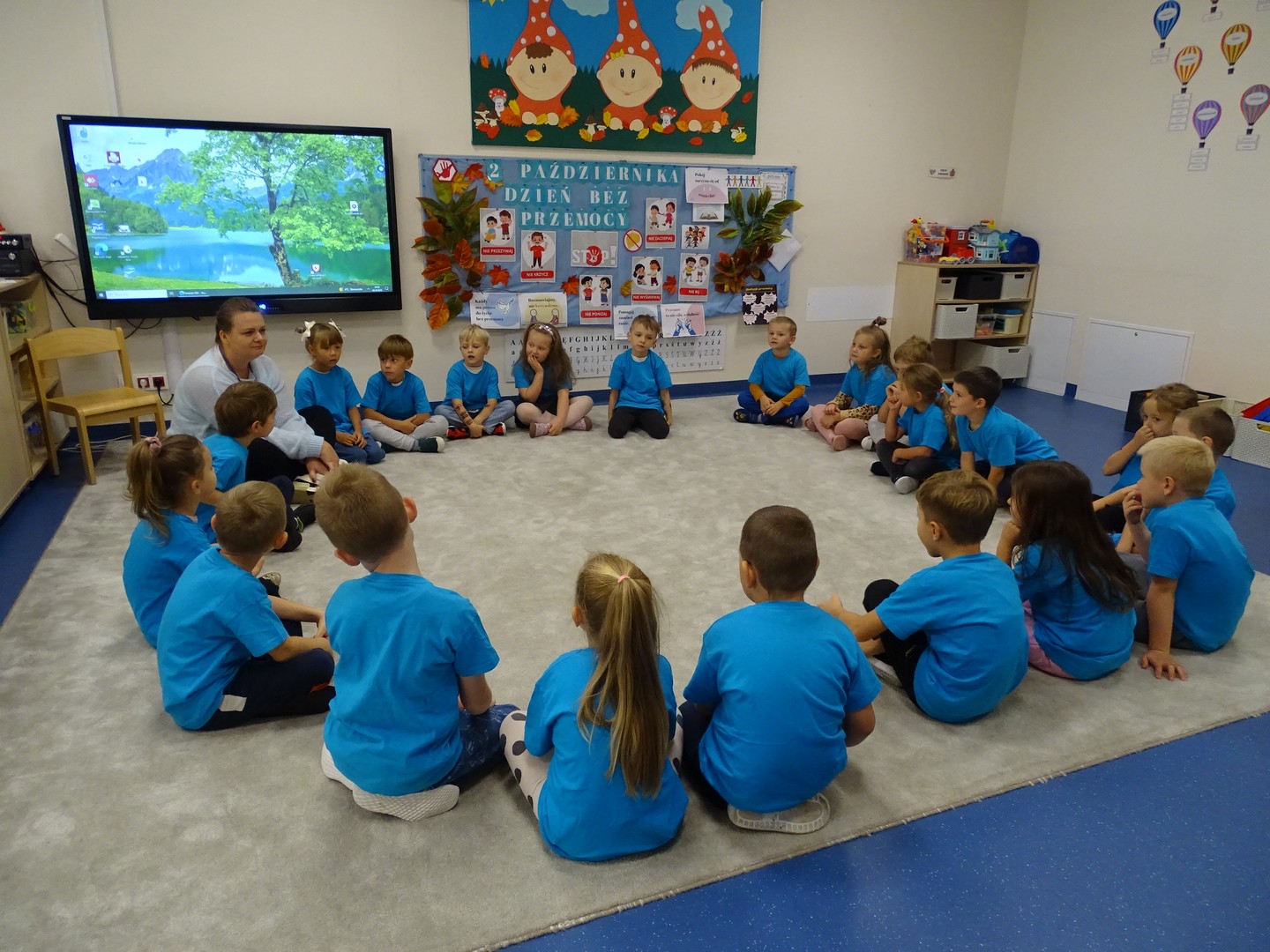 2 października 2025 r. z okazji Międzynarodowego Dnia Bez Przemocy dzieci z grupy „Sówki” uczestniczyły w specjalnej pogadance na temat przeciwdziałania przemocy i budowania pozytywnych relacji, przygotowaną przez pedagoga specjalnego panią Ewelinę Pukacz. Podczas spotkania dzieci: założyły niebieskie koszulki – symbol pokoju, bezpieczeństwa i solidarności z ofiarami przemocy, wysłuchały bajki terapeutycznej pt. “Lew Drapuś”, która porusza temat agresji i przemiany wewnętrznej, obejrzały krótki film animowany o mówieniu „STOP” przemocy oraz wzięły udział w twórczym zadaniu – rysowały na niebieskich balonach złe sytuacje, które kojarzą im się z przemocą, a następnie symbolicznie przebijały balony, mówiąc przemocy stanowcze NIE! Celem zajęć było uwrażliwienie dzieci na temat przemocy – zarówno fizycznej, jak i słownej – oraz pokazanie, że każda trudna sytuacja ma rozwiązanie, a wokół są dorośli, którzy chcą i potrafią pomóc.