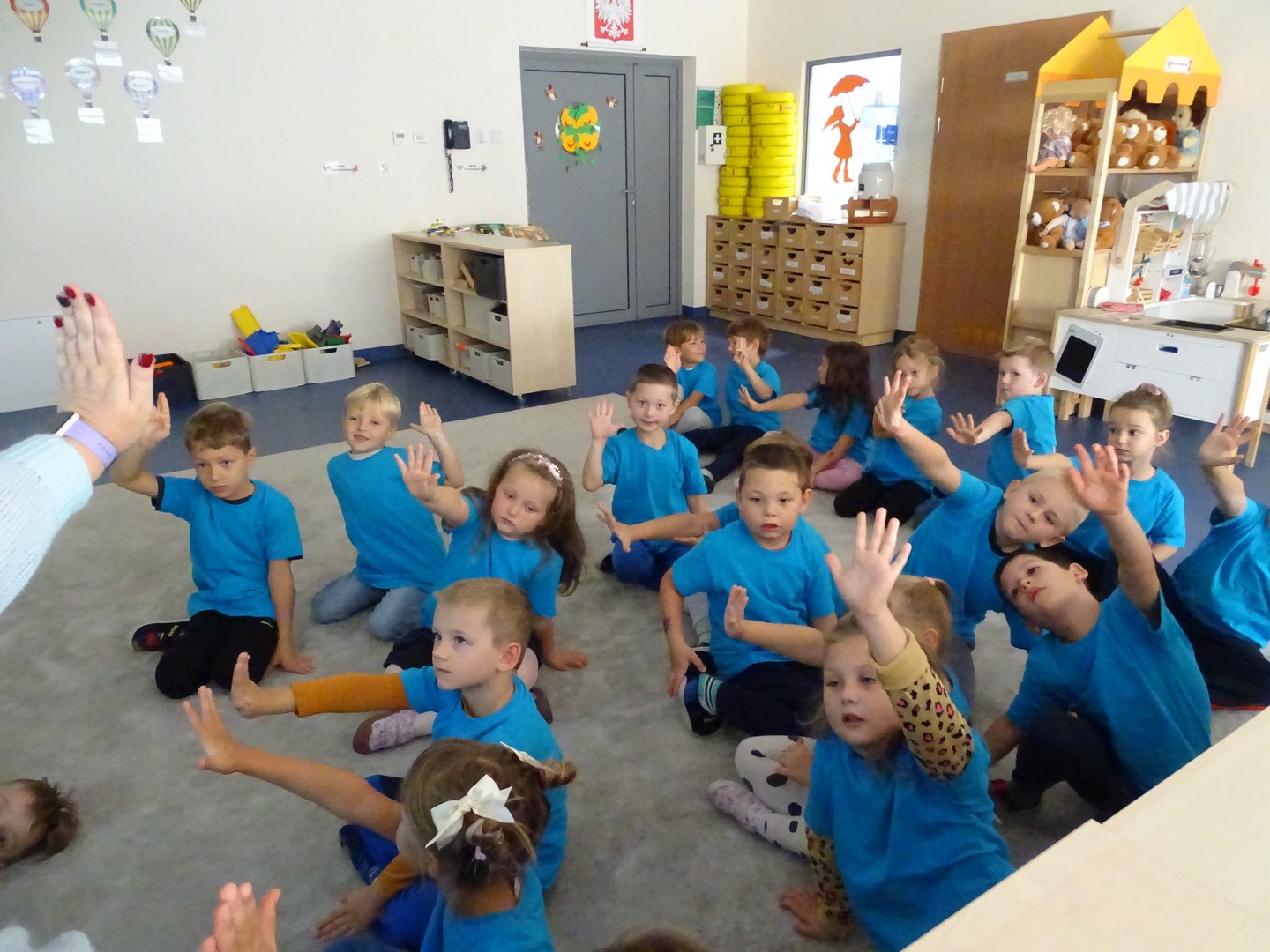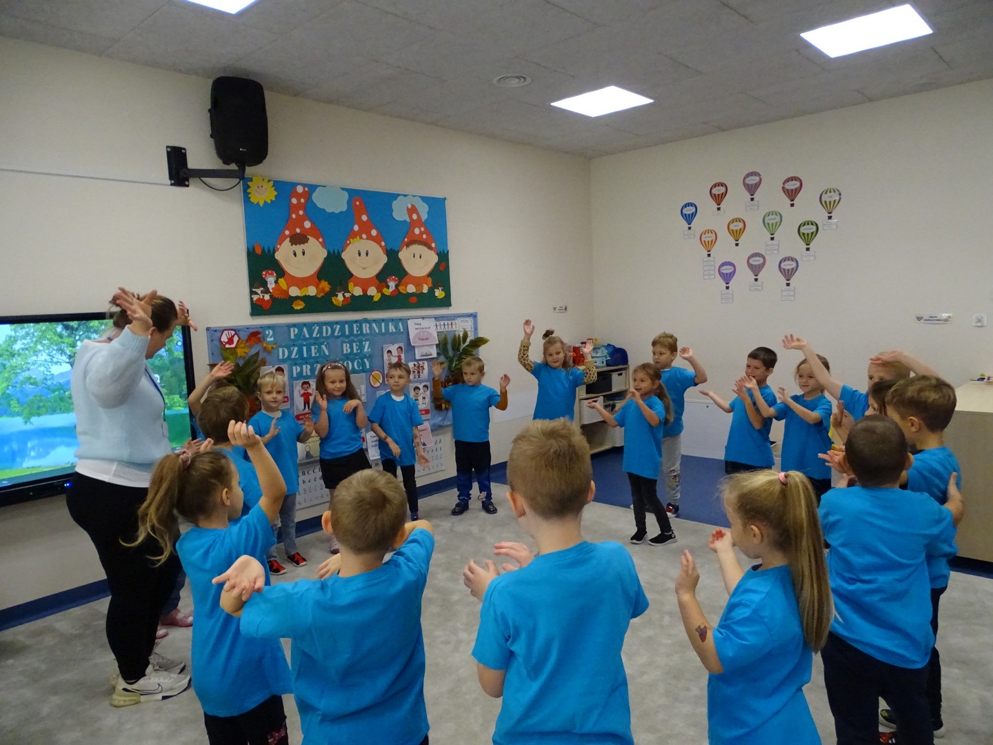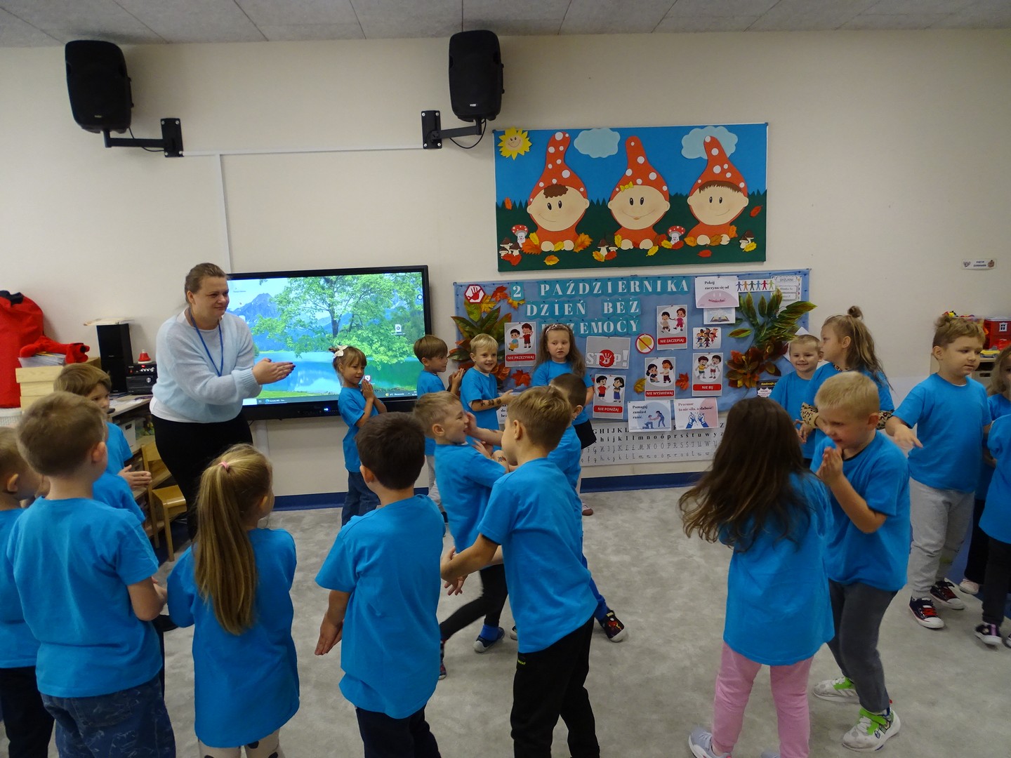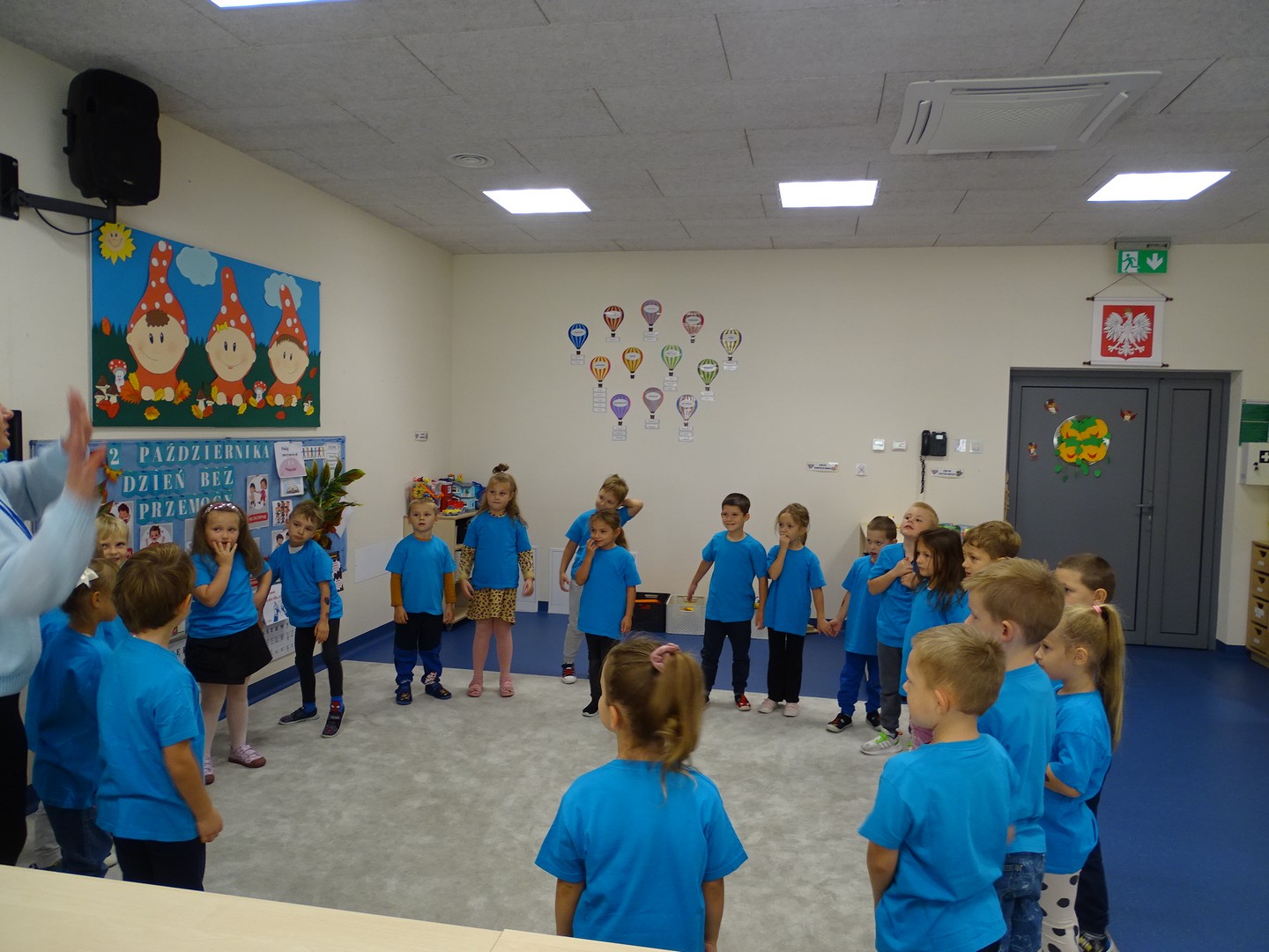 2 października 2025 r. z okazji Międzynarodowego Dnia Bez Przemocy dzieci z grupy „Sówki” uczestniczyły w specjalnej pogadance na temat przeciwdziałania przemocy i budowania pozytywnych relacji, przygotowaną przez pedagoga specjalnego panią Ewelinę Pukacz. Podczas spotkania dzieci: założyły niebieskie koszulki – symbol pokoju, bezpieczeństwa i solidarności z ofiarami przemocy, wysłuchały bajki terapeutycznej pt. “Lew Drapuś”, która porusza temat agresji i przemiany wewnętrznej, obejrzały krótki film animowany o mówieniu „STOP” przemocy oraz wzięły udział w twórczym zadaniu – rysowały na niebieskich balonach złe sytuacje, które kojarzą im się z przemocą, a następnie symbolicznie przebijały balony, mówiąc przemocy stanowcze NIE! Celem zajęć było uwrażliwienie dzieci na temat przemocy – zarówno fizycznej, jak i słownej – oraz pokazanie, że każda trudna sytuacja ma rozwiązanie, a wokół są dorośli, którzy chcą i potrafią pomóc.