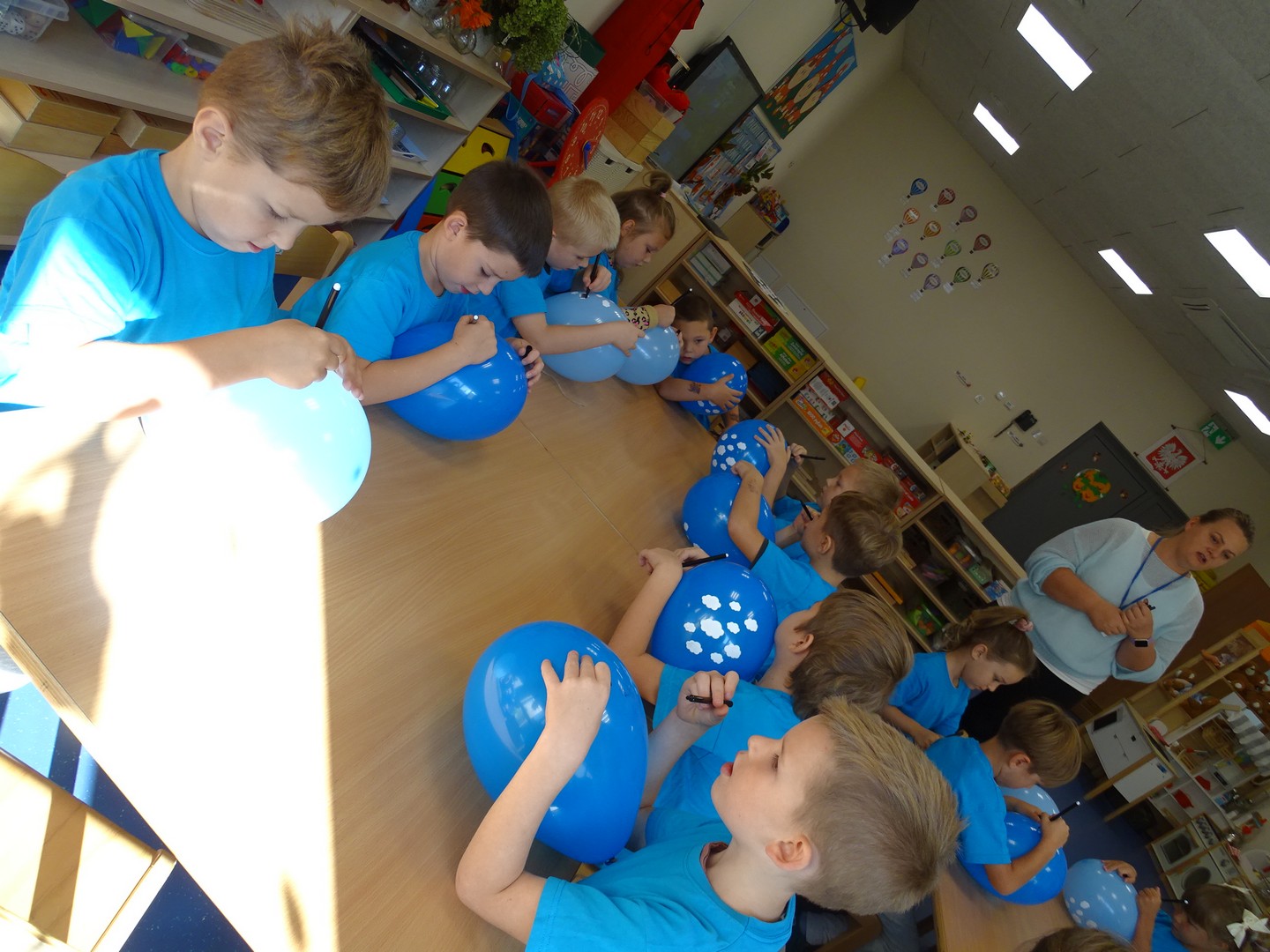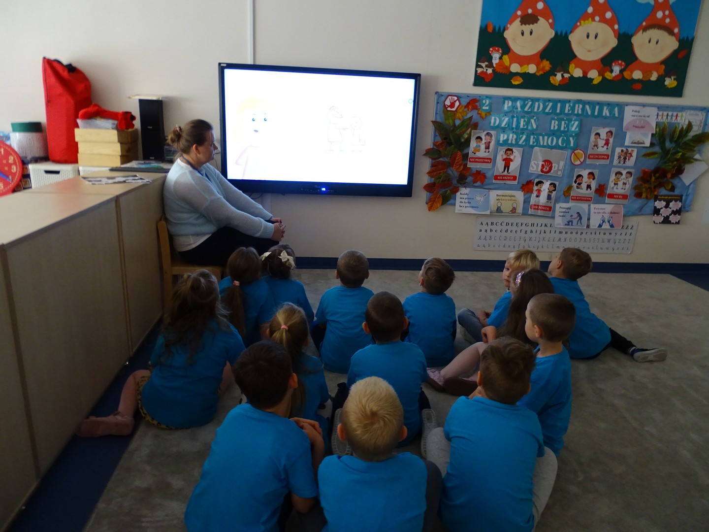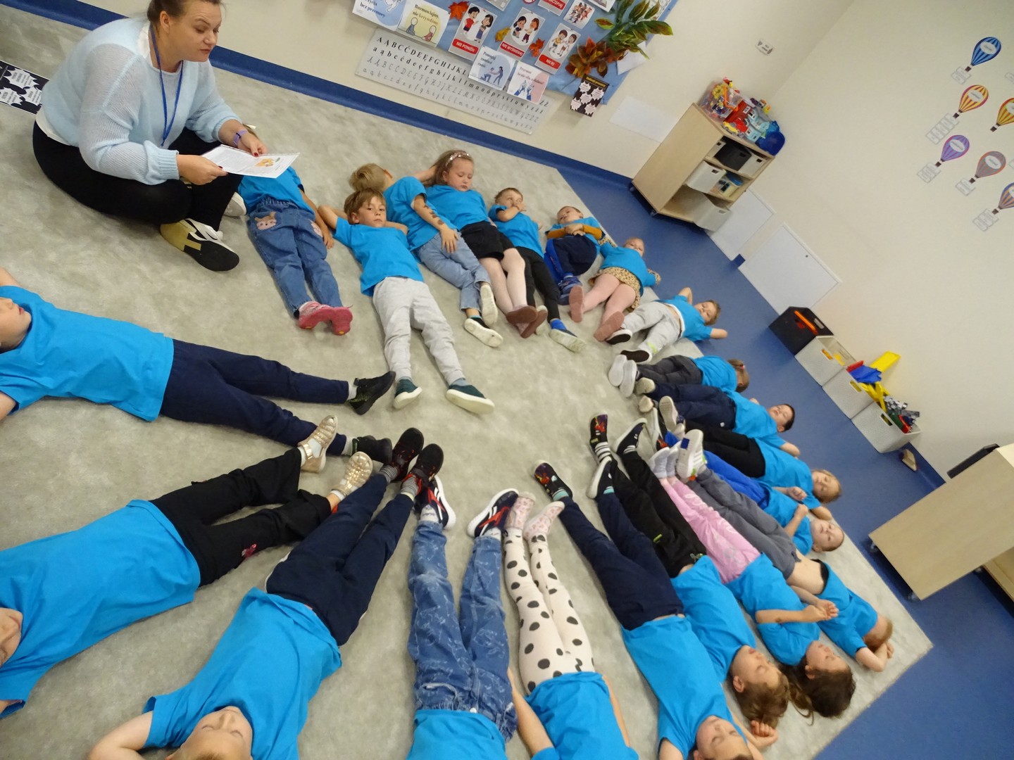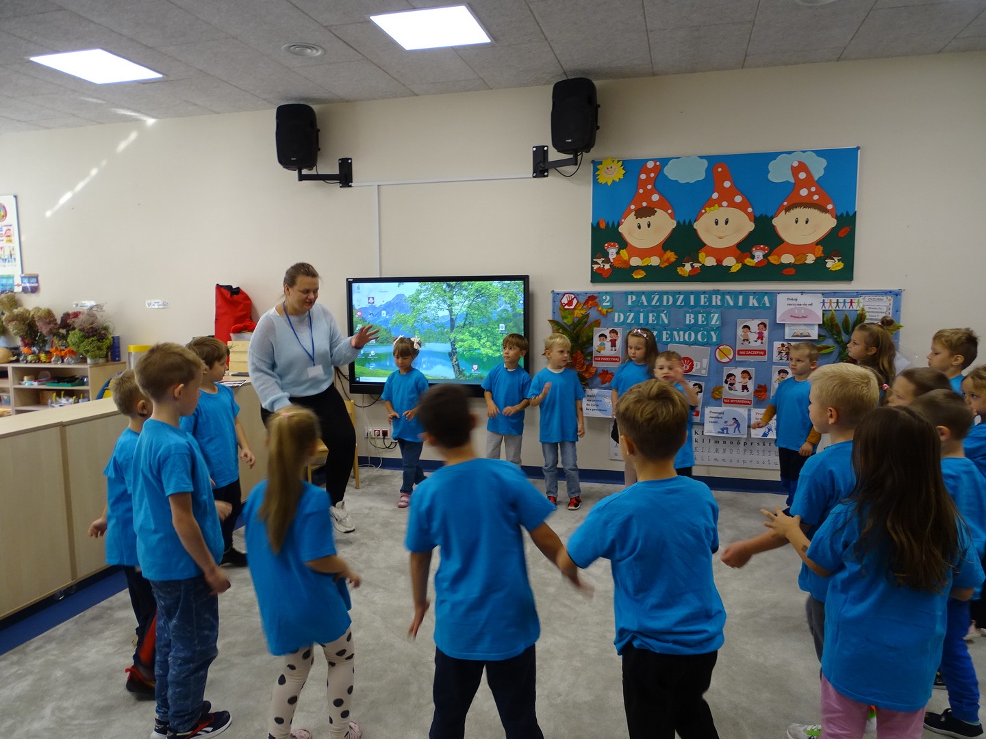 2 października 2025 r. z okazji Międzynarodowego Dnia Bez Przemocy dzieci z grupy „Sówki” uczestniczyły w specjalnej pogadance na temat przeciwdziałania przemocy i budowania pozytywnych relacji, przygotowaną przez pedagoga specjalnego panią Ewelinę Pukacz. Podczas spotkania dzieci: założyły niebieskie koszulki – symbol pokoju, bezpieczeństwa i solidarności z ofiarami przemocy, wysłuchały bajki terapeutycznej pt. “Lew Drapuś”, która porusza temat agresji i przemiany wewnętrznej, obejrzały krótki film animowany o mówieniu „STOP” przemocy oraz wzięły udział w twórczym zadaniu – rysowały na niebieskich balonach złe sytuacje, które kojarzą im się z przemocą, a następnie symbolicznie przebijały balony, mówiąc przemocy stanowcze NIE! Celem zajęć było uwrażliwienie dzieci na temat przemocy – zarówno fizycznej, jak i słownej – oraz pokazanie, że każda trudna sytuacja ma rozwiązanie, a wokół są dorośli, którzy chcą i potrafią pomóc.