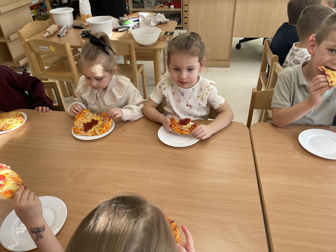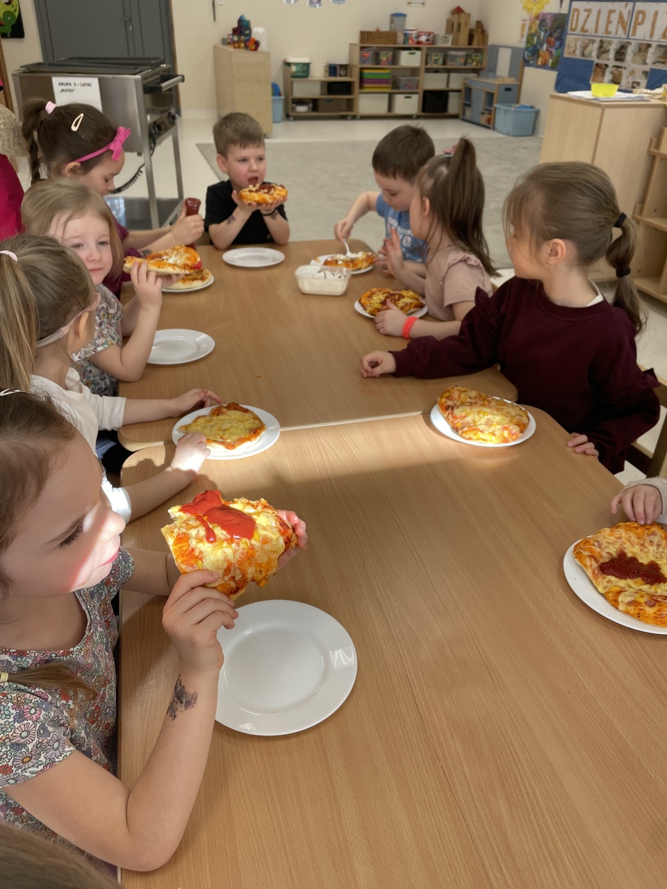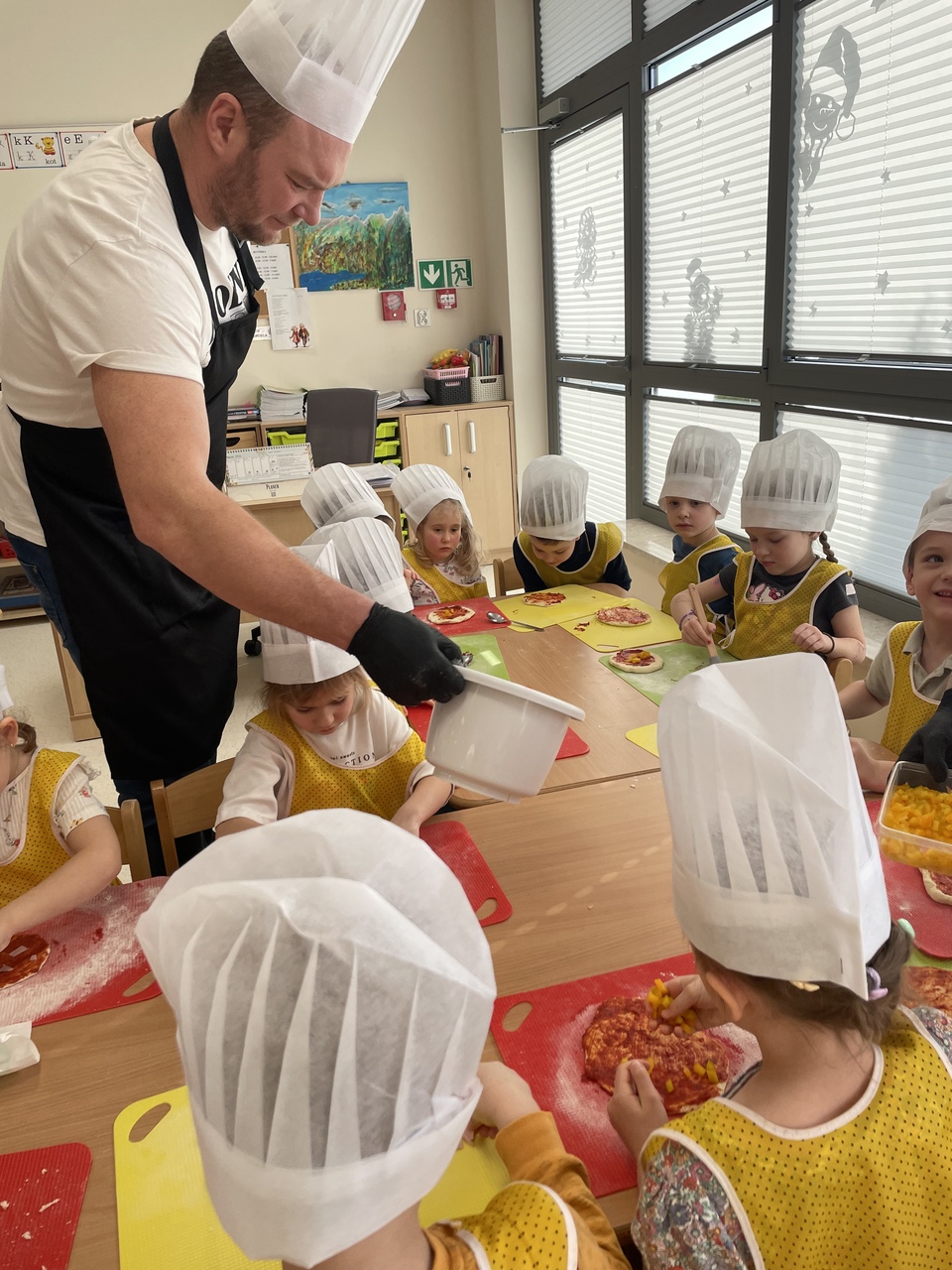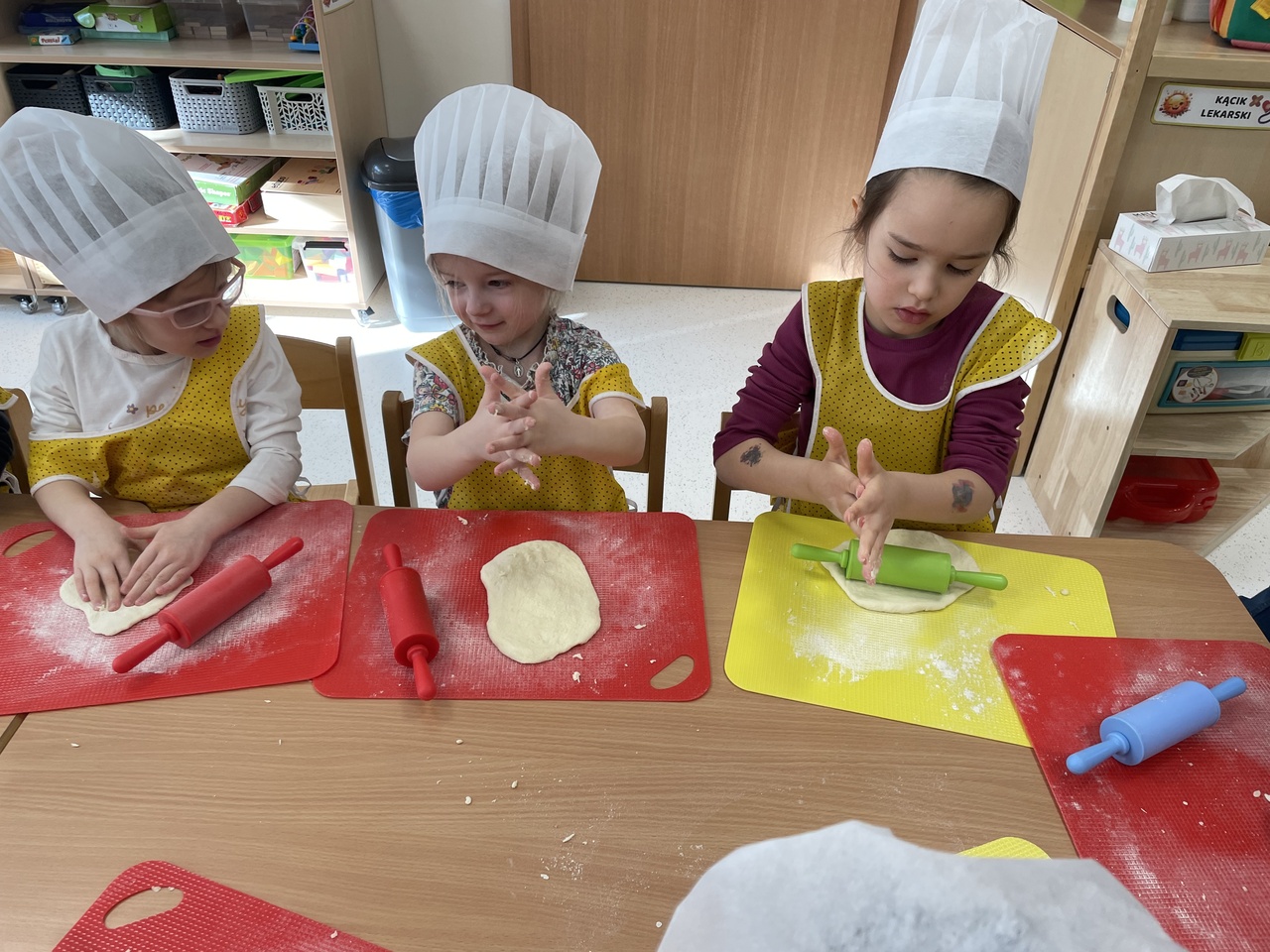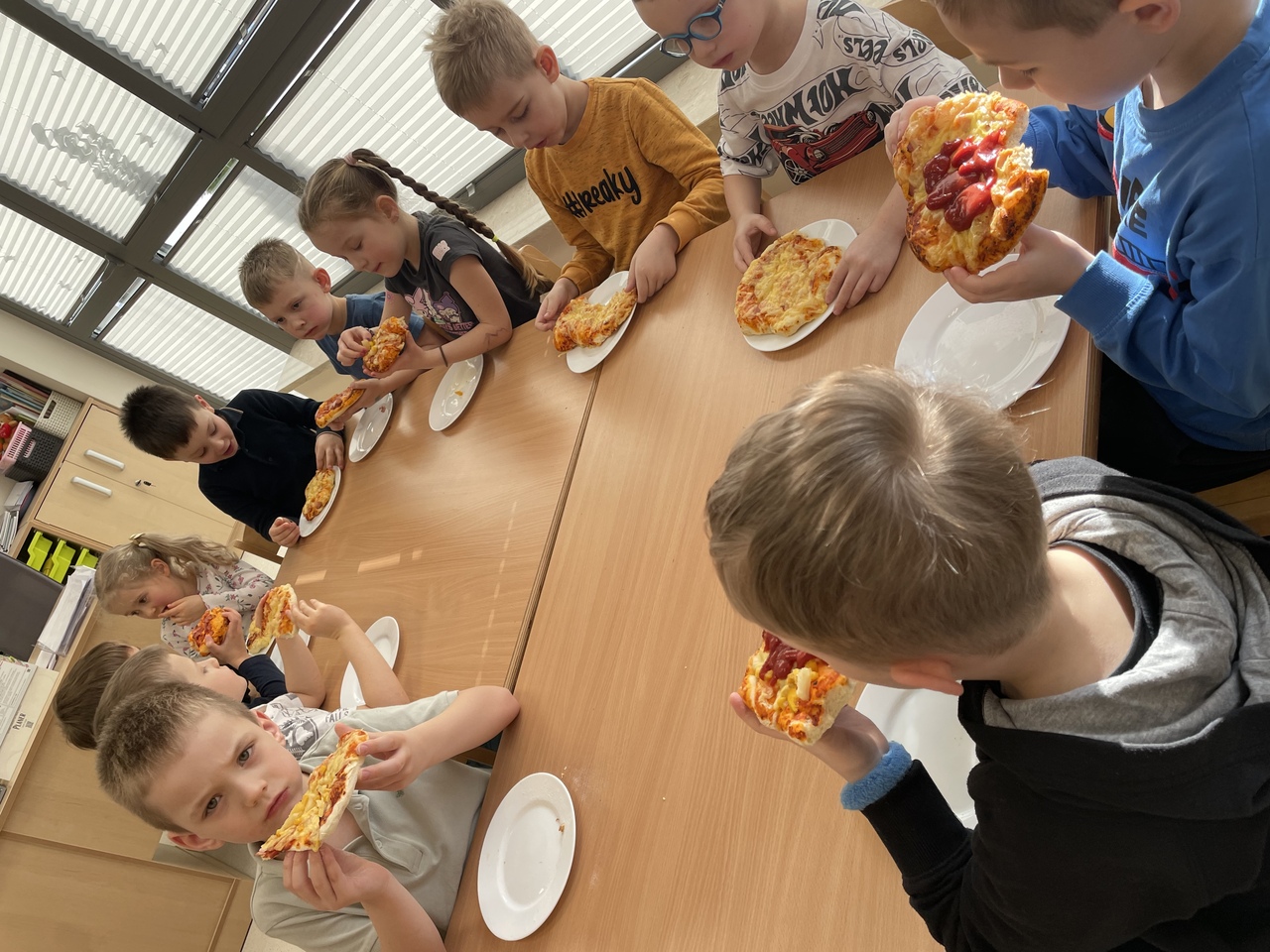 19 lutego 2026 roku w naszym przedszkolu zapachniało słoneczną Italią, a wszystko to za sprawą świętowania Międzynarodowego Dnia Pizzy. Tego dnia nasza sala zamieniła się w prawdziwą pizzerię, w której dzieci wspólnie przygotowywały ten uwielbiany przez wszystkich przysmak. Wyjątkowy charakter wydarzenia podkreśliła wizyta dwojga rodziców - tata Stasia i tata Oliwierka, którzy odwiedzili nas, by przeprowadzić profesjonalne warsztaty z pieczenia pizzy. Pod ich czujnym okiem przedszkolaki poznawały tajniki wyrabiania ciasta oraz uczyły się, jak dobierać najlepsze składniki. Każdy mały kucharz z wielkim zaangażowaniem komponował własny placek, dbając o każdy kolorowy dodatek. Po pracy nadszedł czas na najbardziej wyczekiwany punkt programu – wielką degustację. Własnoręcznie przygotowane dania smakowały wyśmienicie, a apetyty dopisywały każdemu bez wyjątku. Dzieci były niezwykle dumne ze swoich kulinarnych osiągnięć i z radością dzieliły się wrażeniami z kolegami. Serdecznie dziękujemy rodzicom za poświęcony czas oraz zorganizowanie tak pysznej i edukacyjnej zabawy. To był dzień pełen uśmiechów.