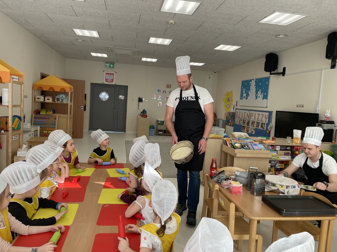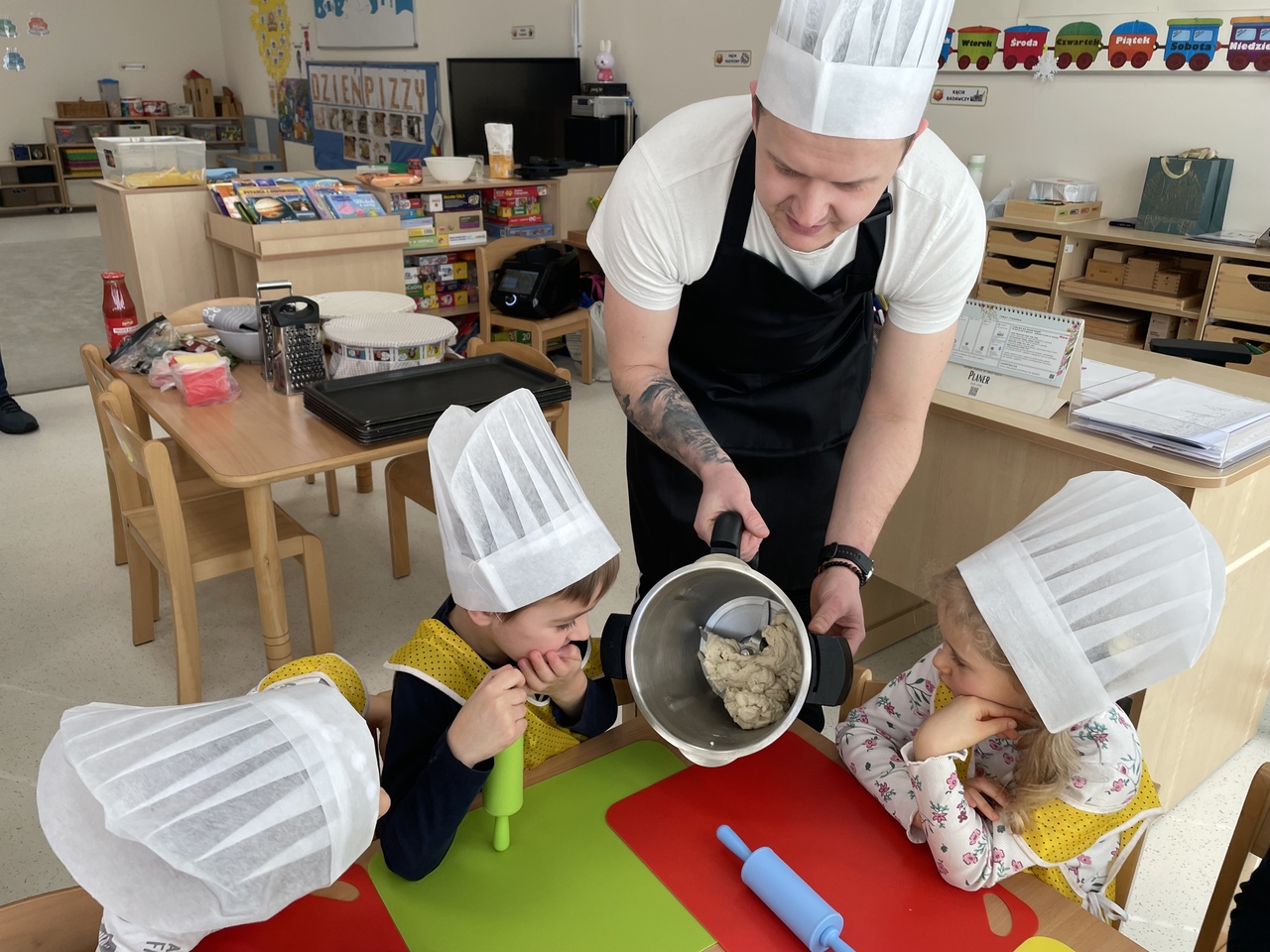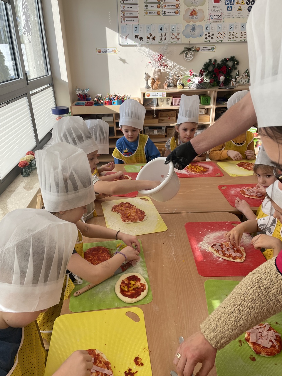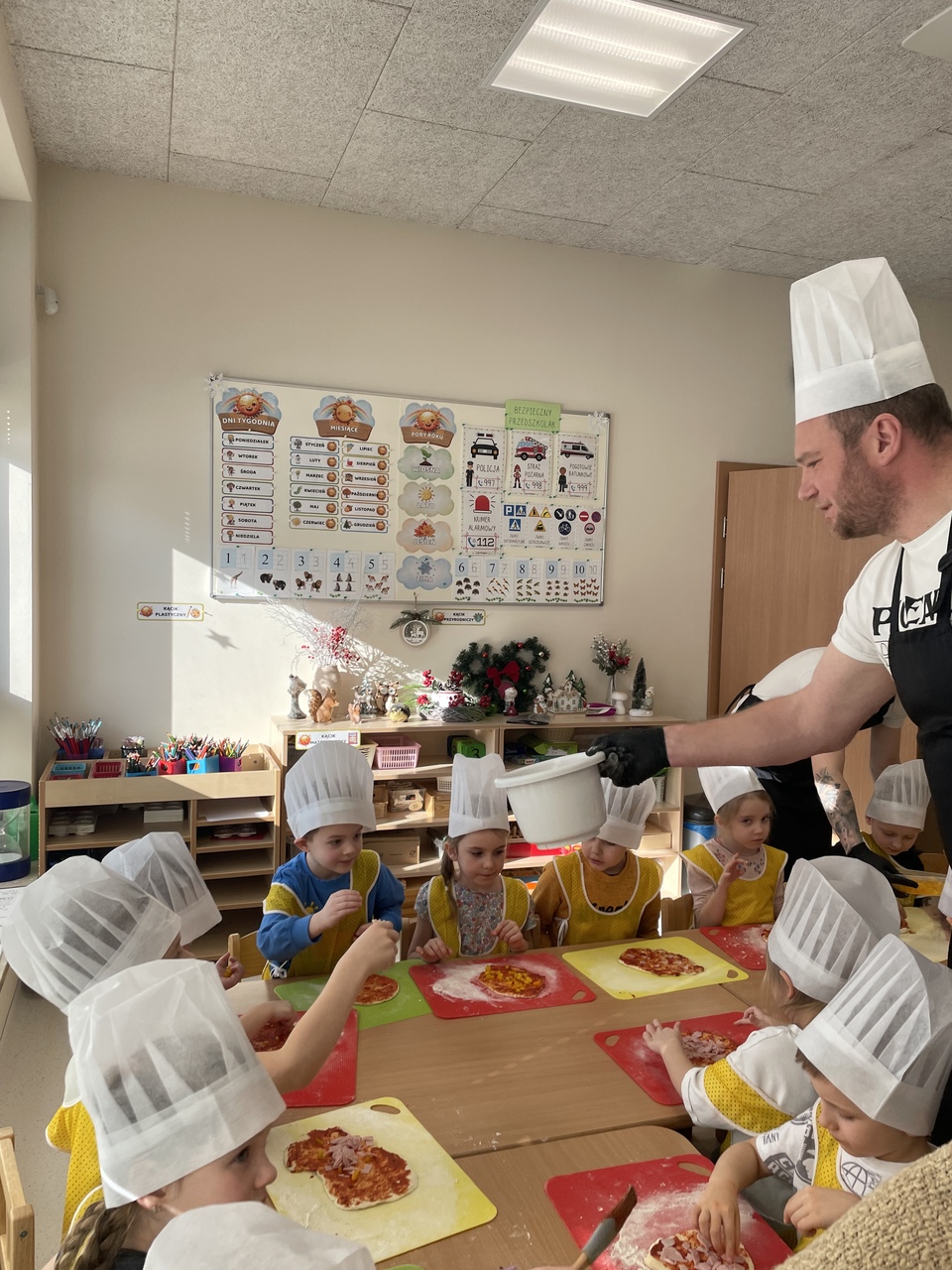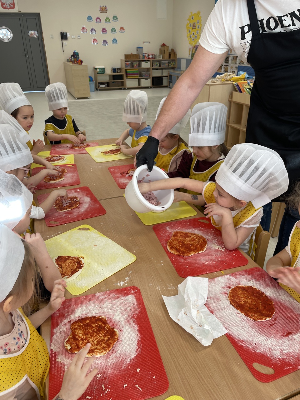 19 lutego 2026 roku w naszym przedszkolu zapachniało słoneczną Italią, a wszystko to za sprawą świętowania Międzynarodowego Dnia Pizzy. Tego dnia nasza sala zamieniła się w prawdziwą pizzerię, w której dzieci wspólnie przygotowywały ten uwielbiany przez wszystkich przysmak. Wyjątkowy charakter wydarzenia podkreśliła wizyta dwojga rodziców - tata Stasia i tata Oliwierka, którzy odwiedzili nas, by przeprowadzić profesjonalne warsztaty z pieczenia pizzy. Pod ich czujnym okiem przedszkolaki poznawały tajniki wyrabiania ciasta oraz uczyły się, jak dobierać najlepsze składniki. Każdy mały kucharz z wielkim zaangażowaniem komponował własny placek, dbając o każdy kolorowy dodatek. Po pracy nadszedł czas na najbardziej wyczekiwany punkt programu – wielką degustację. Własnoręcznie przygotowane dania smakowały wyśmienicie, a apetyty dopisywały każdemu bez wyjątku. Dzieci były niezwykle dumne ze swoich kulinarnych osiągnięć i z radością dzieliły się wrażeniami z kolegami. Serdecznie dziękujemy rodzicom za poświęcony czas oraz zorganizowanie tak pysznej i edukacyjnej zabawy. To był dzień pełen uśmiechów.