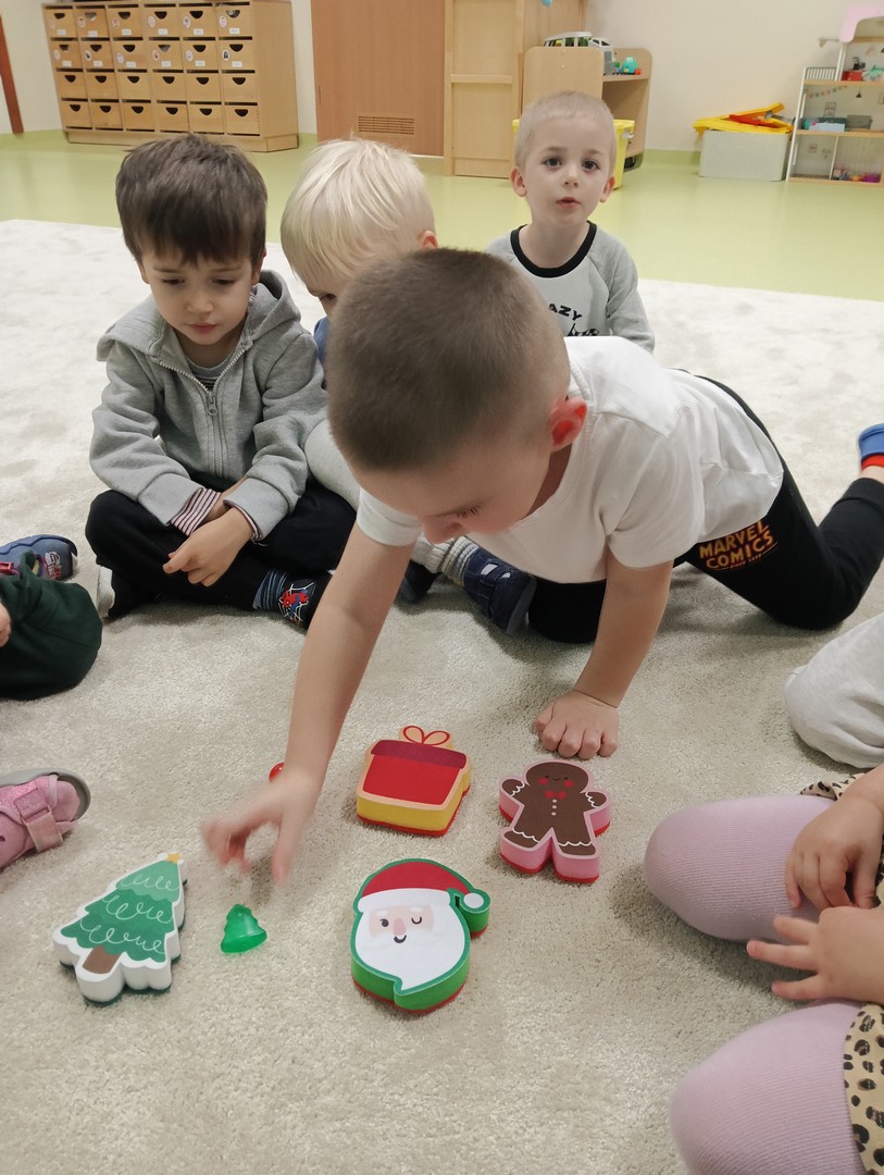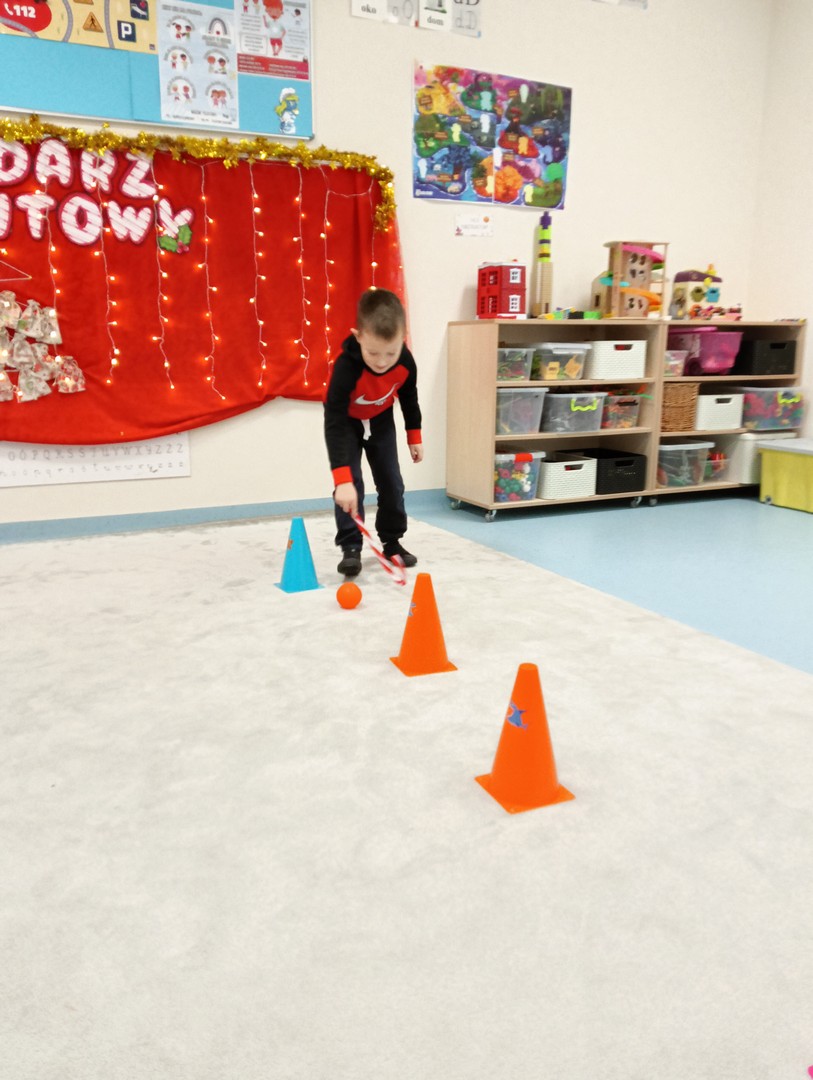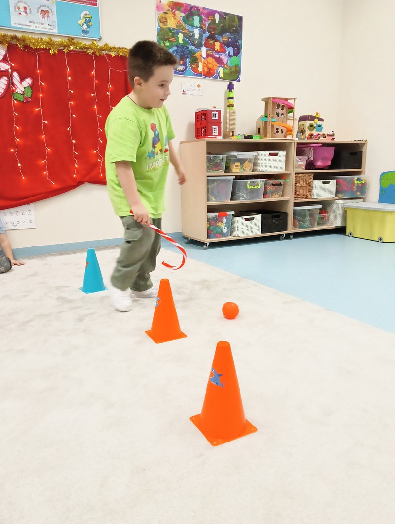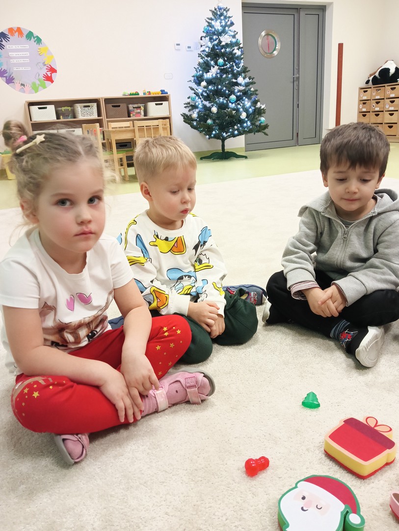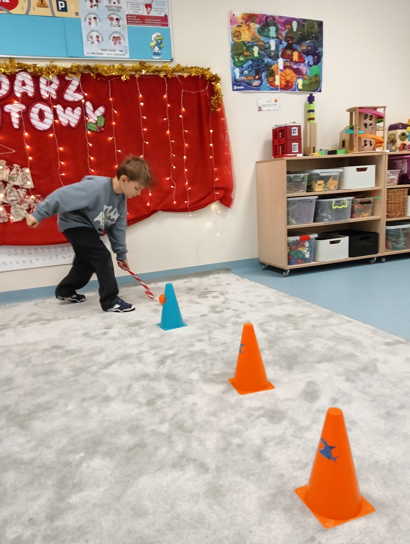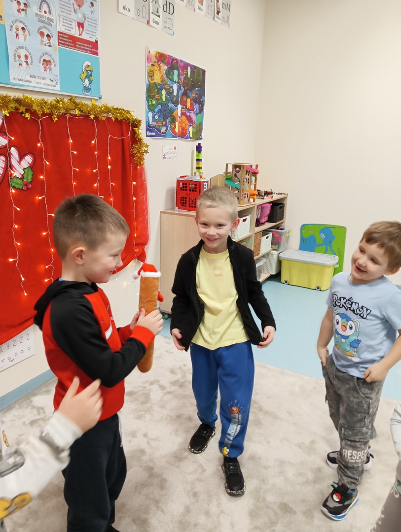 W grudniu, tuż przed świętami, nasze zajęcia wypełniła radosna, świąteczna atmosfera. Dzieci z ogromnym entuzjazmem brały udział w różnorodnych zabawach ruchowych i logicznych, które nie tylko dostarczały dużo śmiechu, ale także rozwijały współpracę i spryt. Wspólnie odkrywaliśmy ukryte prezenty, rozwiązywaliśmy świąteczne zgadywanki oraz wcielaliśmy się w pomocników Mikołaja – nie zabrakło nawet mini stroju św. Mikołaja, który wywołał wiele radości. Podczas zajęć towarzyszyła nam dobra zabawa oraz śpiewanie ulubionych piosenek świątecznych, które wprowadziły wszystkich w wyjątkowy nastrój. Na zakończenie czekała miła niespodzianka od śnieżynek – dzieci otrzymały laski cukrowe, a w młodszej grupie piękne zawieszki na choinkę z własnymi imionami. Ten magiczny czas na długo pozostanie w naszej pamięci jako pełen uśmiechu, ciepła i świątecznej radości.