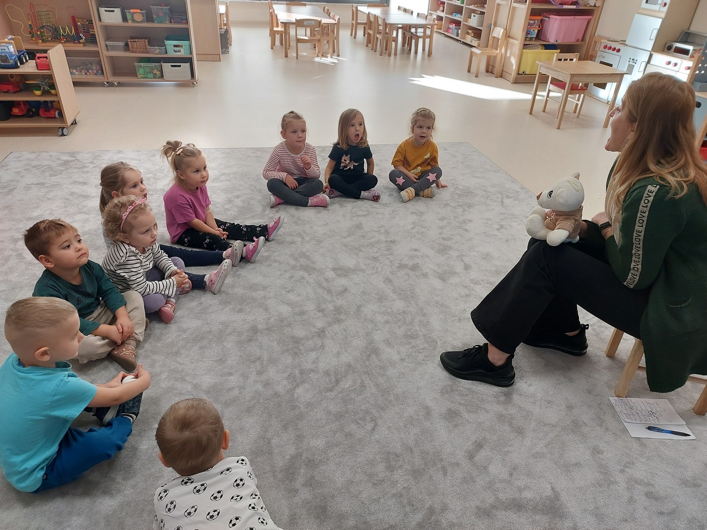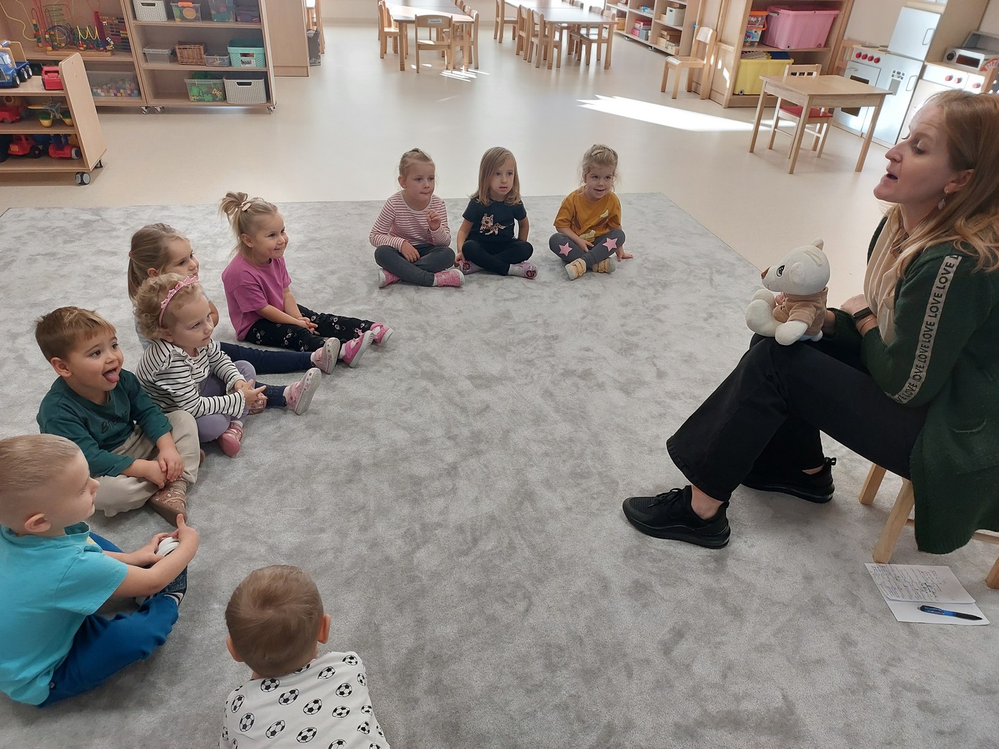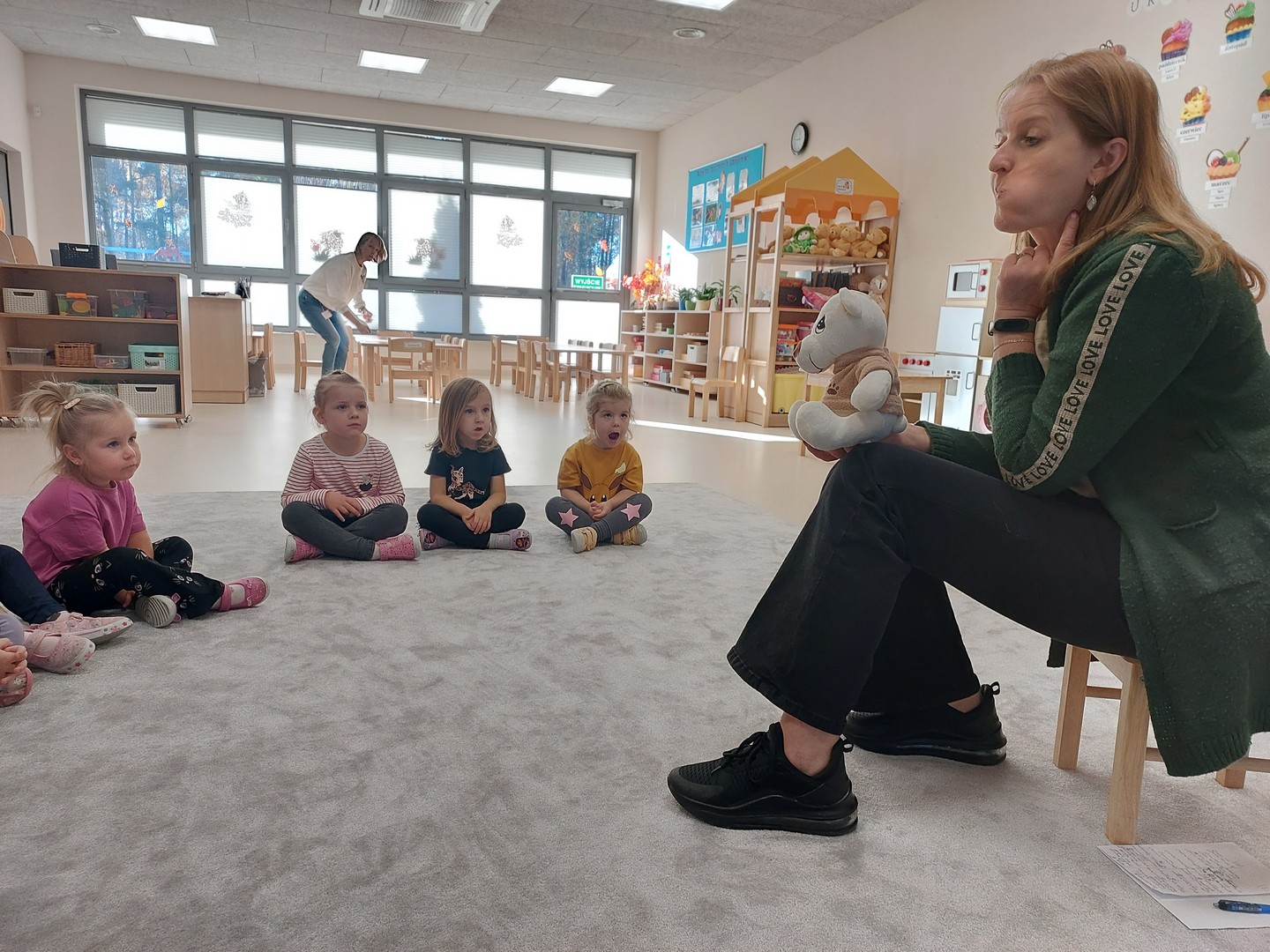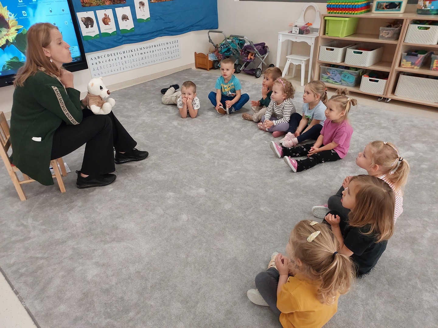Dziś po pierwszy przyszła do nas pani Asia z misiem. Nazywa się Luluś i będzie nas odwiedzał w każdy wtorek. Pani Asia wprowadziła nas w świat ćwiczeń buzi i języka. Utrwalaliśmy słownictwo związane z jesienią, wykonywaliśmy kilka prostych zadań buziakowych. Miś miał dużo zajęć: grabił liście, obserwował je, gdy leciały na wietrze, poruszał się w rytm spadających kropli deszczu i chodziła po kałużach. Dzięki nam poradził sobie ze wszystkimi czynnościami.
