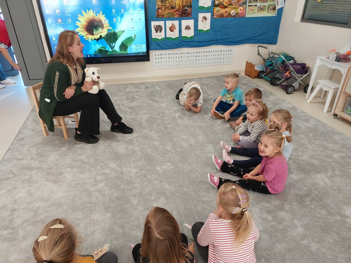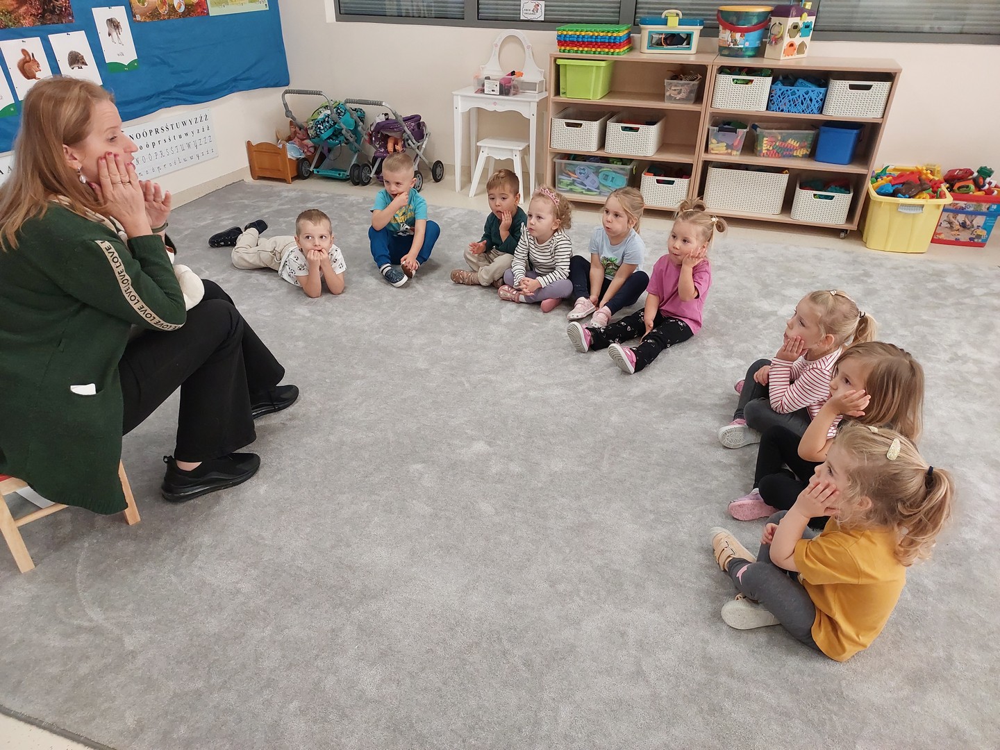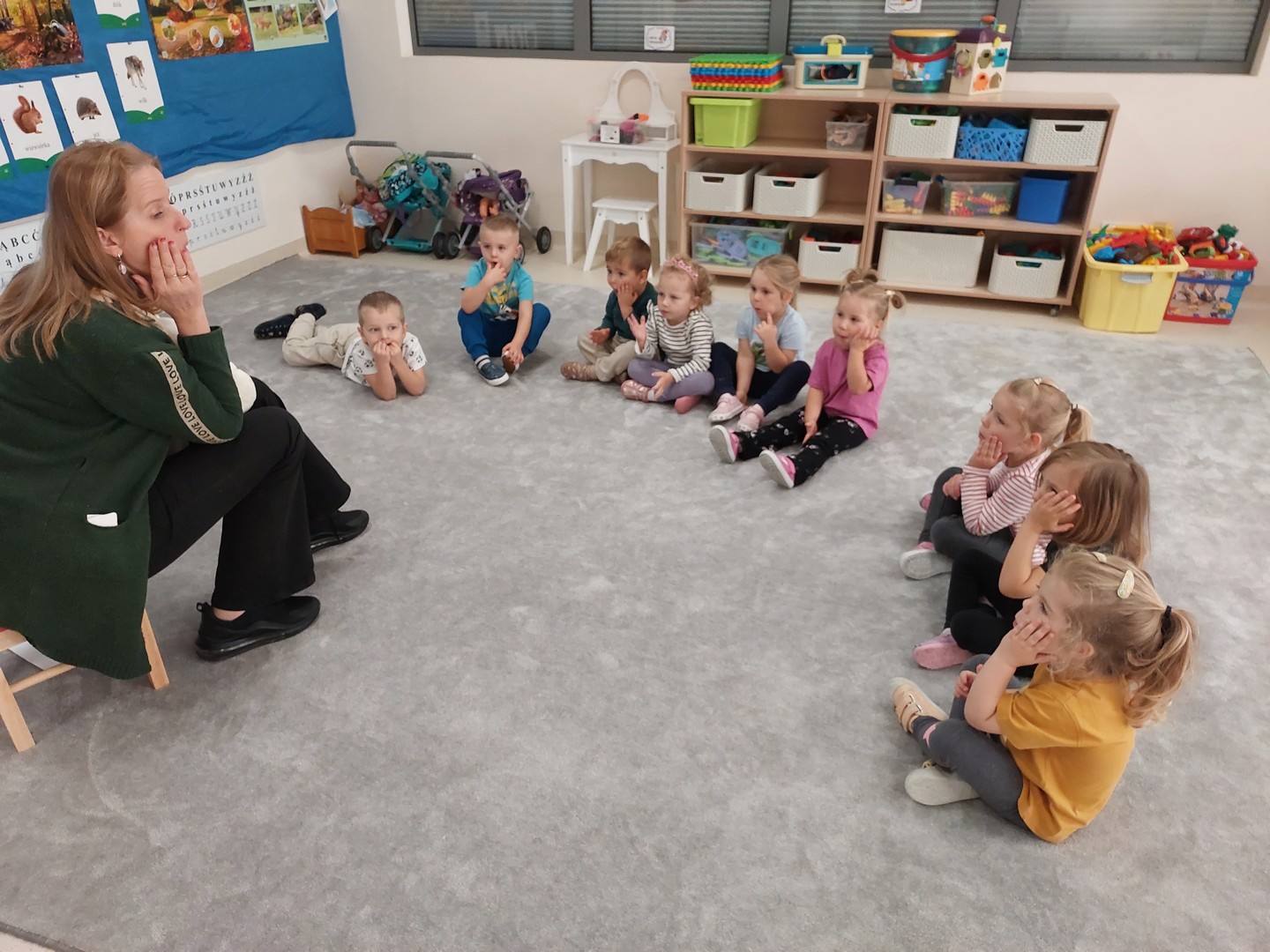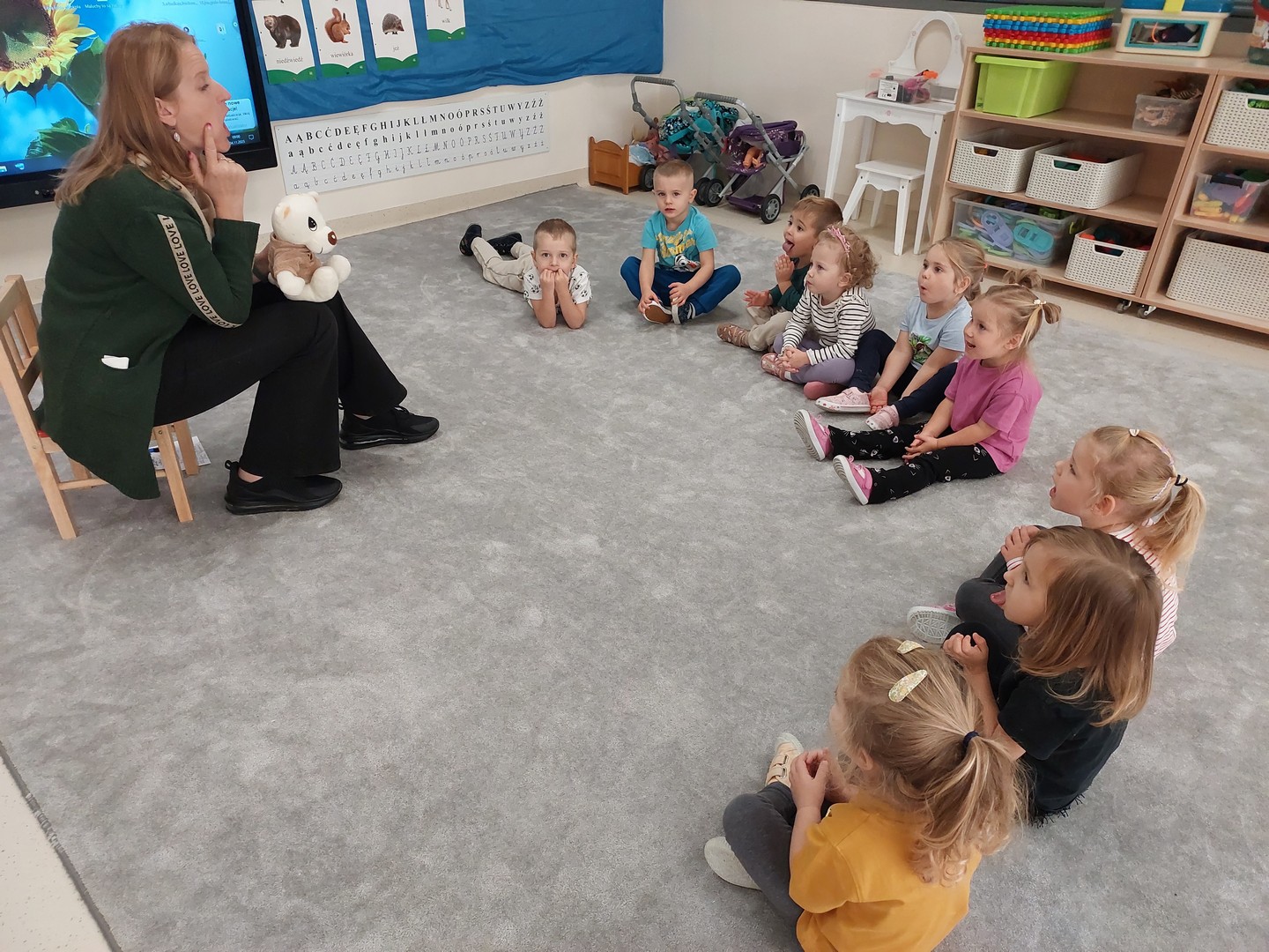 Dziś po pierwszy przyszła do nas pani Asia z misiem. Nazywa się Luluś i będzie nas odwiedzał w każdy wtorek. Pani Asia wprowadziła nas w świat ćwiczeń buzi i języka. Utrwalaliśmy słownictwo związane z jesienią, wykonywaliśmy kilka prostych zadań buziakowych. Miś miał dużo zajęć: grabił liście, obserwował je, gdy leciały na wietrze, poruszał się w rytm spadających kropli deszczu i chodziła po kałużach. Dzięki nam poradził sobie ze wszystkimi czynnościami.