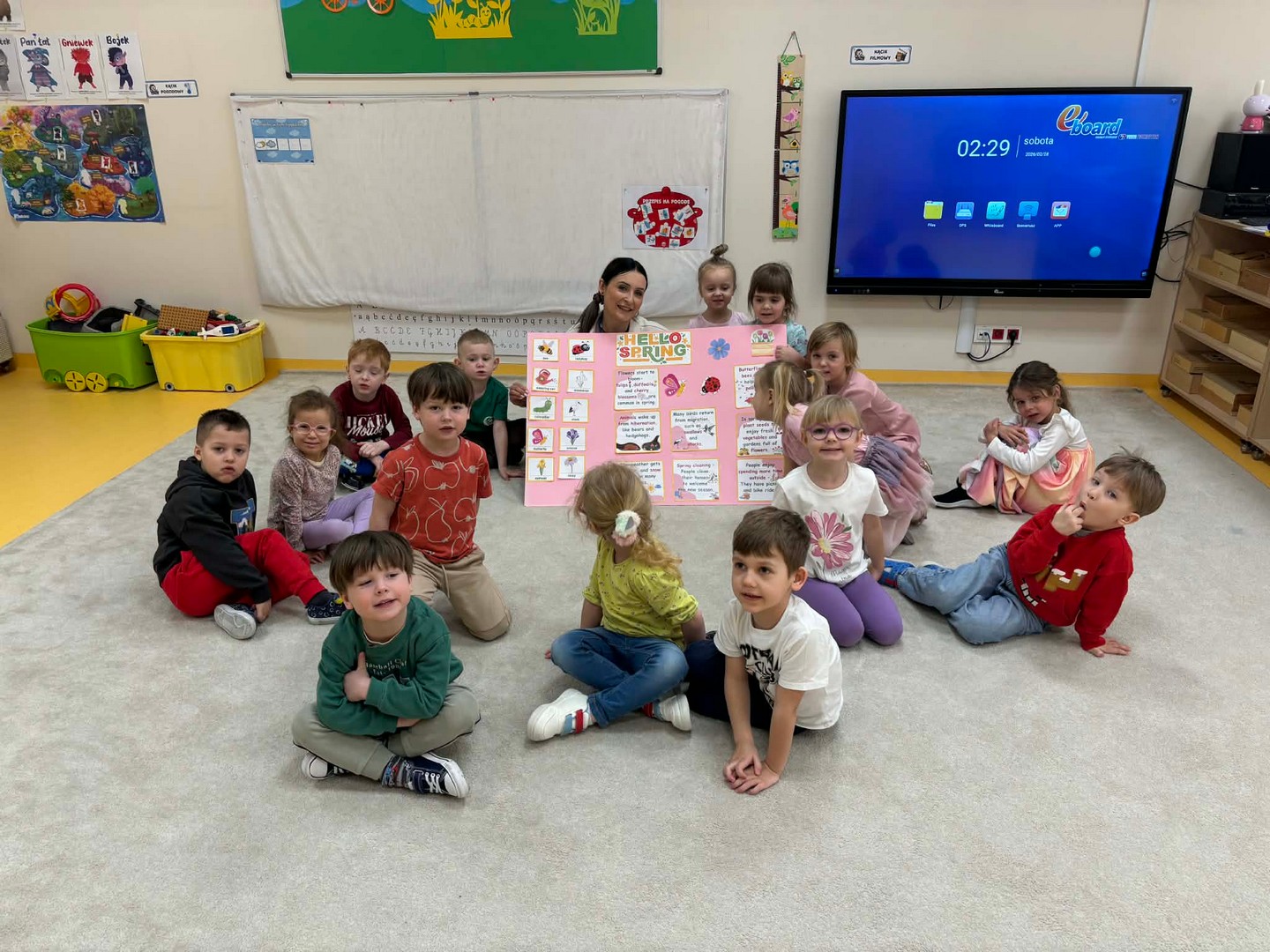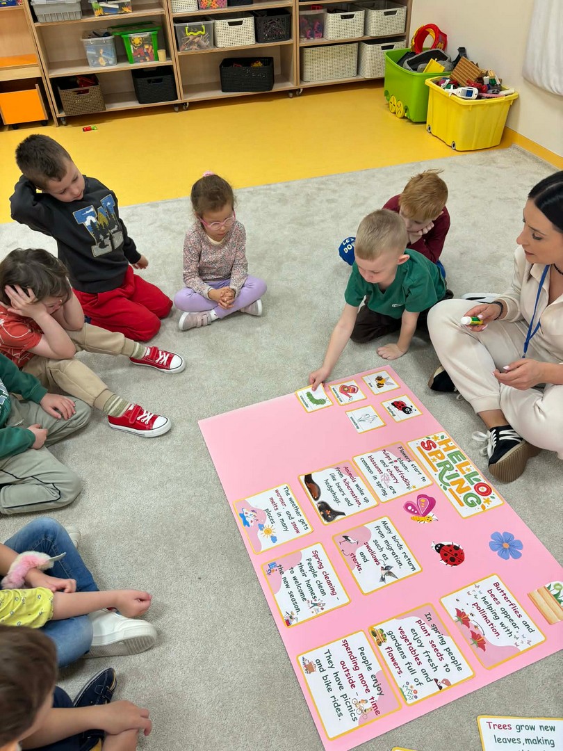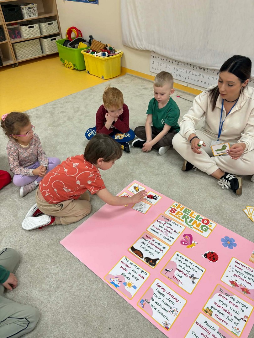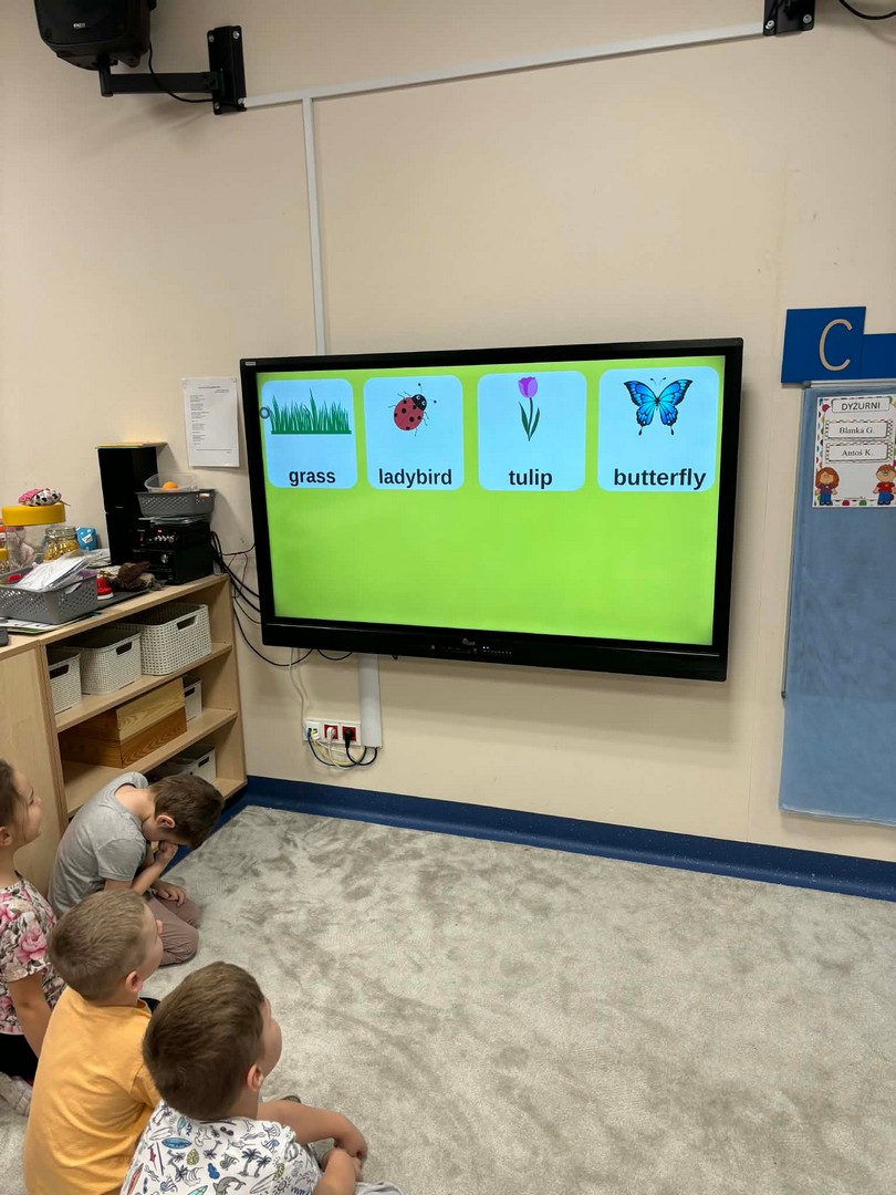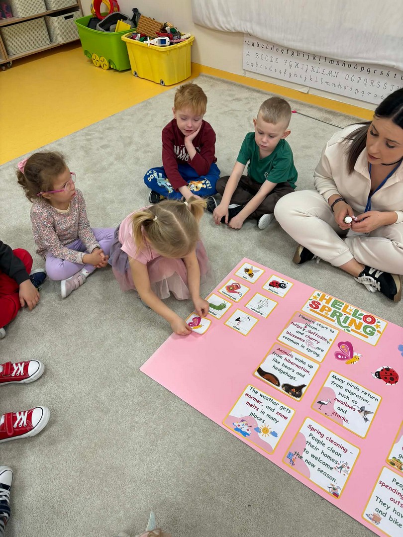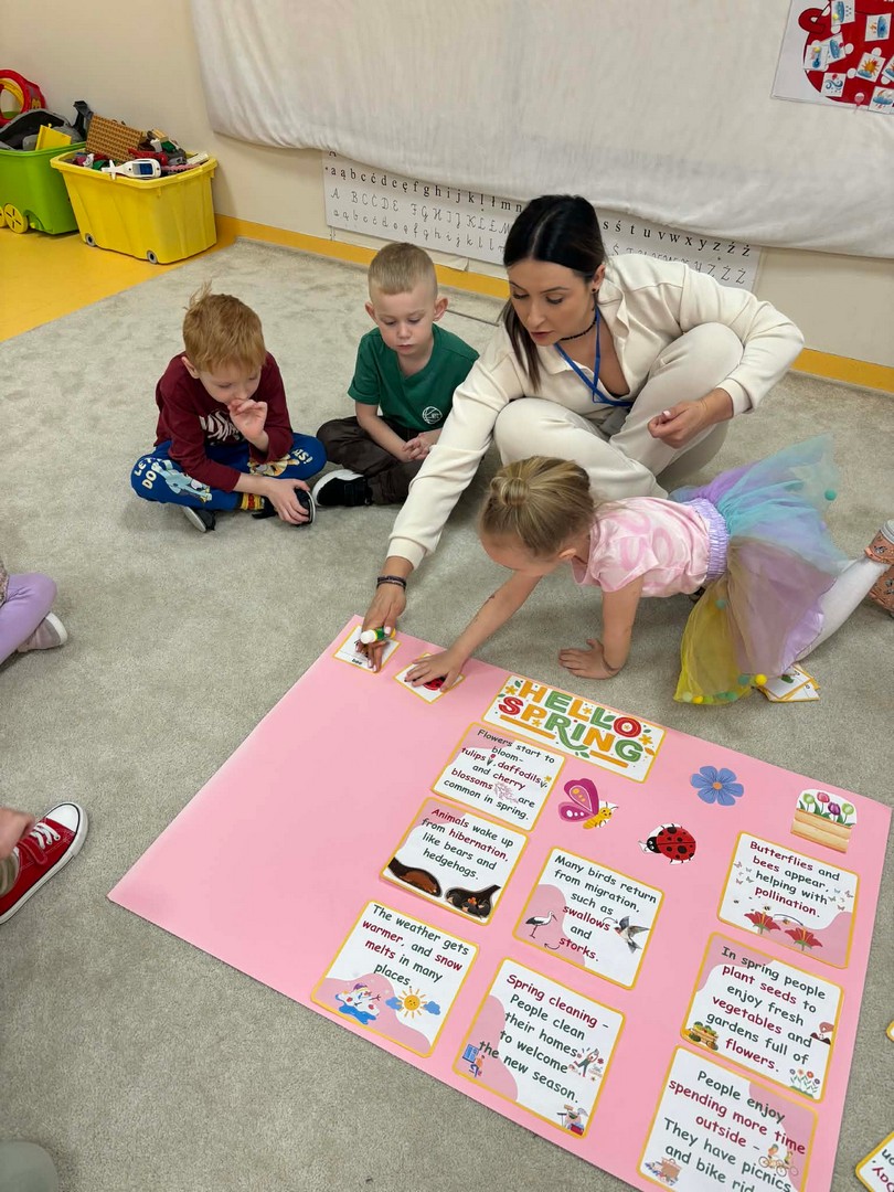 Projekt edukacyjny "Hello spring-wiosna w przedszkolu" został zrealizowany w czterech grupach przedszkolnych. Głównym celem projektu było wzbogacenie słownictwa związanego z wiosną, rozwój słuchania, mówienia oraz budowanie pozytywnej relacji z językiem. Za pomocą kolorowych kart obrazkowych, grach językowych dzieci poznały wiosenne słownictwo oraz wzbogaciły swoją wiedzę na temat przyrody. W ramach projektu przedszkolaki założyły swój ogródek warzywny, utrwaliły kolory poprzez wskazywanie barw na wiosennej łące, poznały figury geometryczne oraz wiosenne słownictwo, stworzyły plakat, wzięły udział w zabawach ruchowych, muzycznych, plastycznych. Wydarzeniem finałowym projektu było krótkie przedstawienie w języku angielskim pt: "Can you be my friend" ? przygotowane przez grupę dzieci pięcioletnich, gdzie dzieci wcieliły się w role owadów.