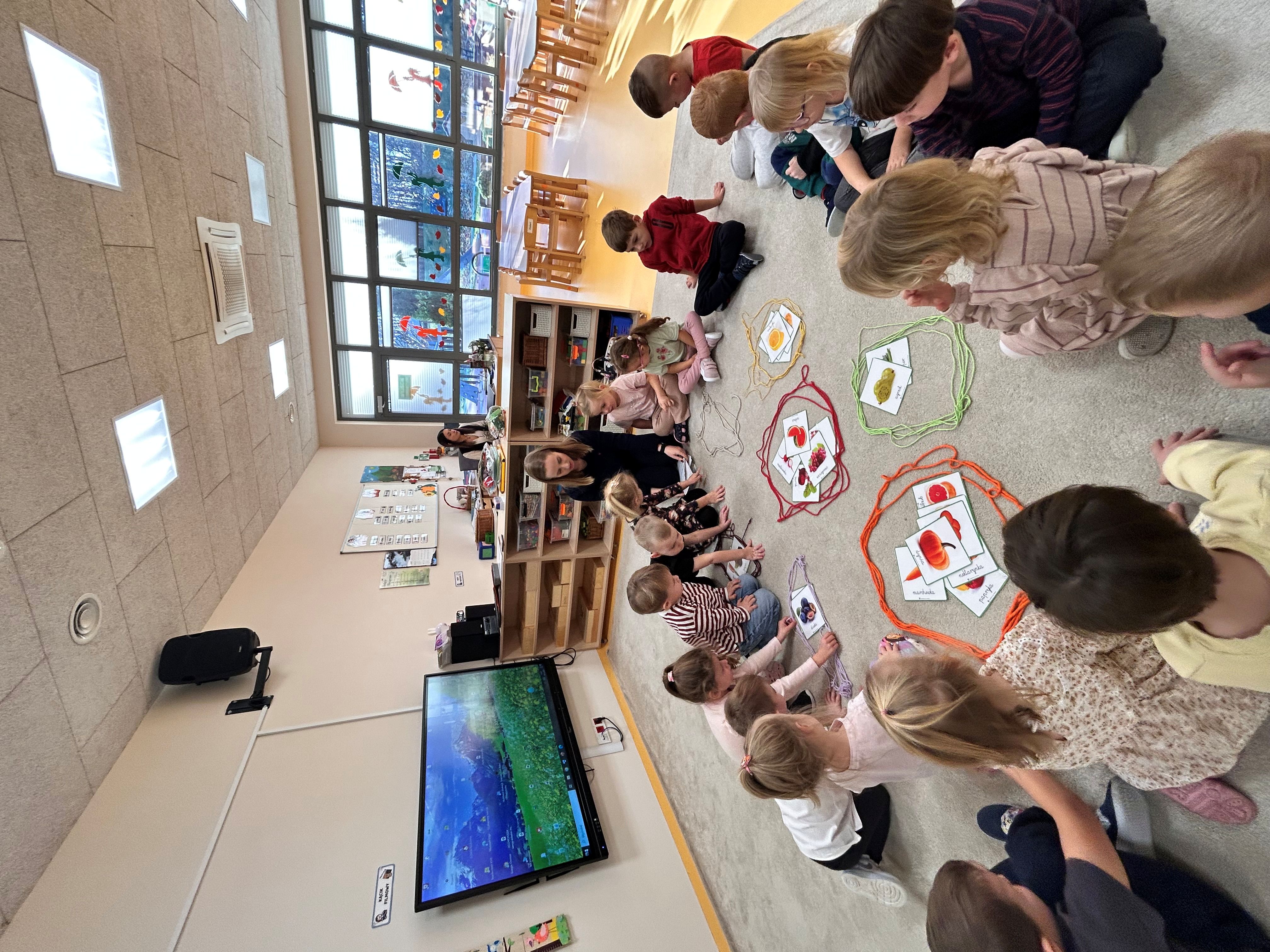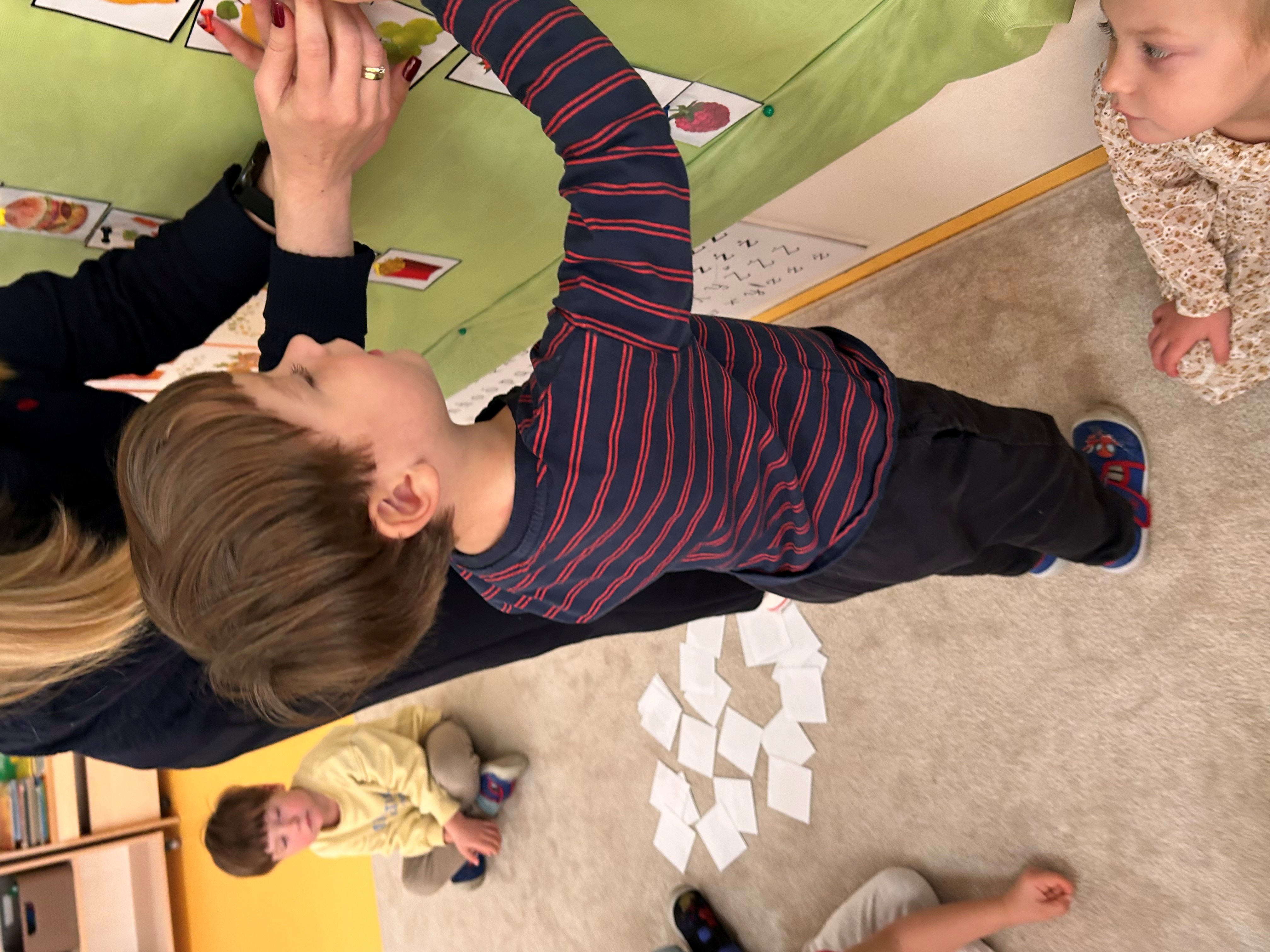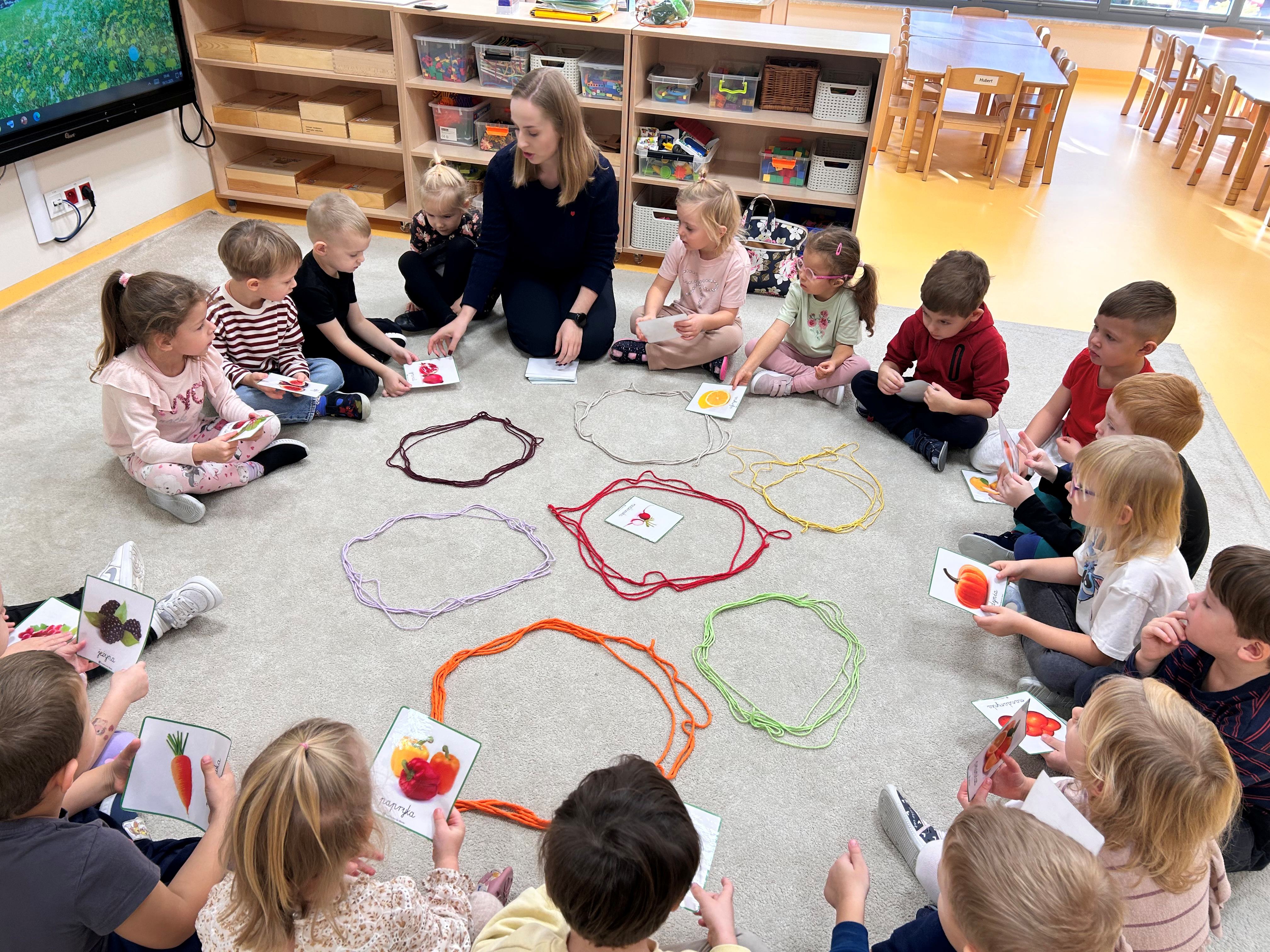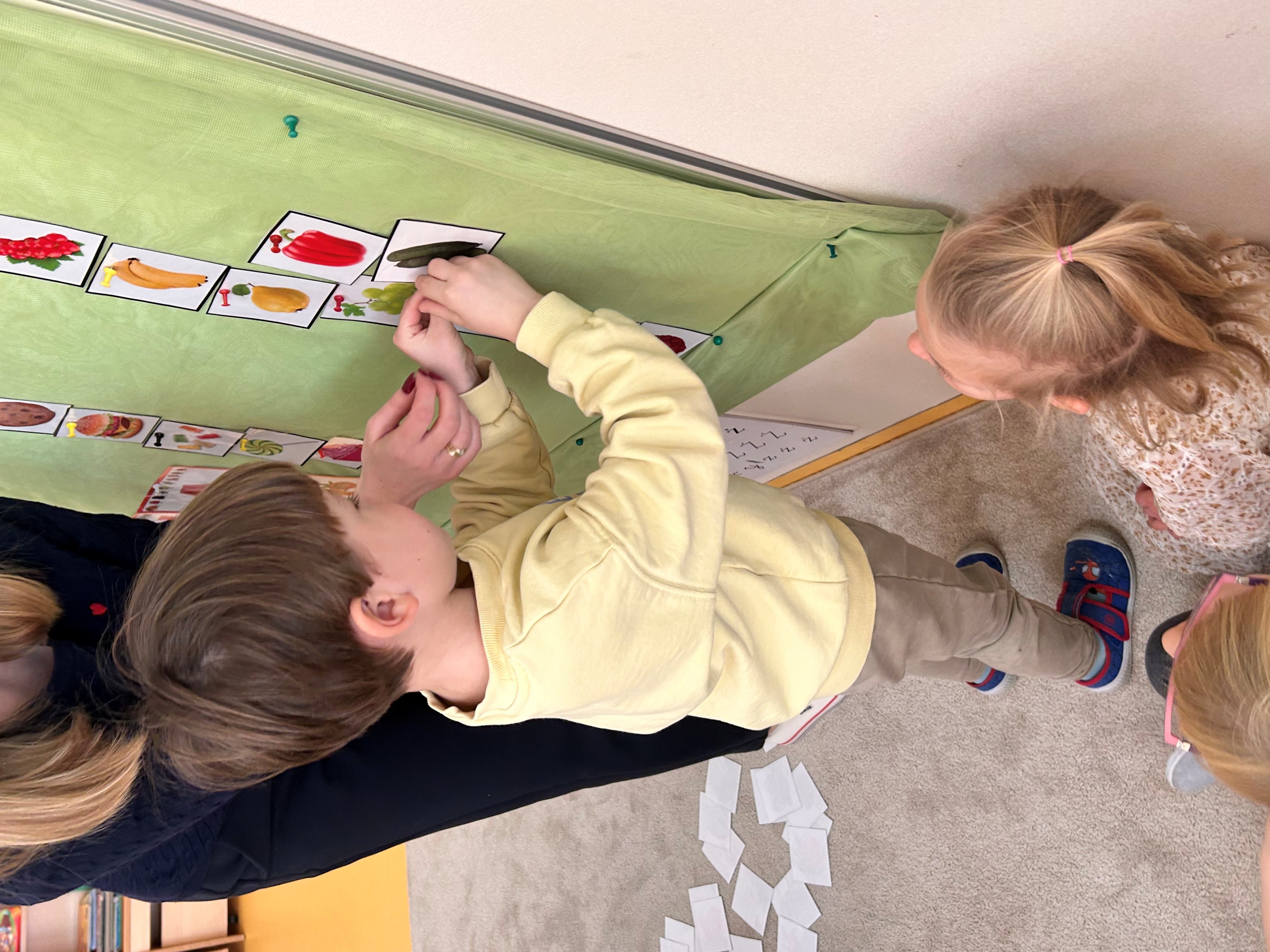 Kolory owoców i warzyw to kolejny temat zrealizowany przez grupę Jeżyki. Zajęcia były pełne kolorów i dobrej zabawy. Dzieci odkrywały barwny świat owoców i warzyw- najpierw nazywały kolory, a następnie wkładały karty z owocami i warzywami do okręgów o tych samych barwach. Kolejne zadanie do segregowanie jedzenia na zdrowe i niezdrowe. Dzieci świetnie wiedziały, które produkty pomagają zachować zdrowie i dobrą energię. Na koniec zajęć Jeżyki zmierzyły się z zagadkami, które okazały się bardzo łatwym zadaniem. To były pyszne i kolorowe zajęcia.