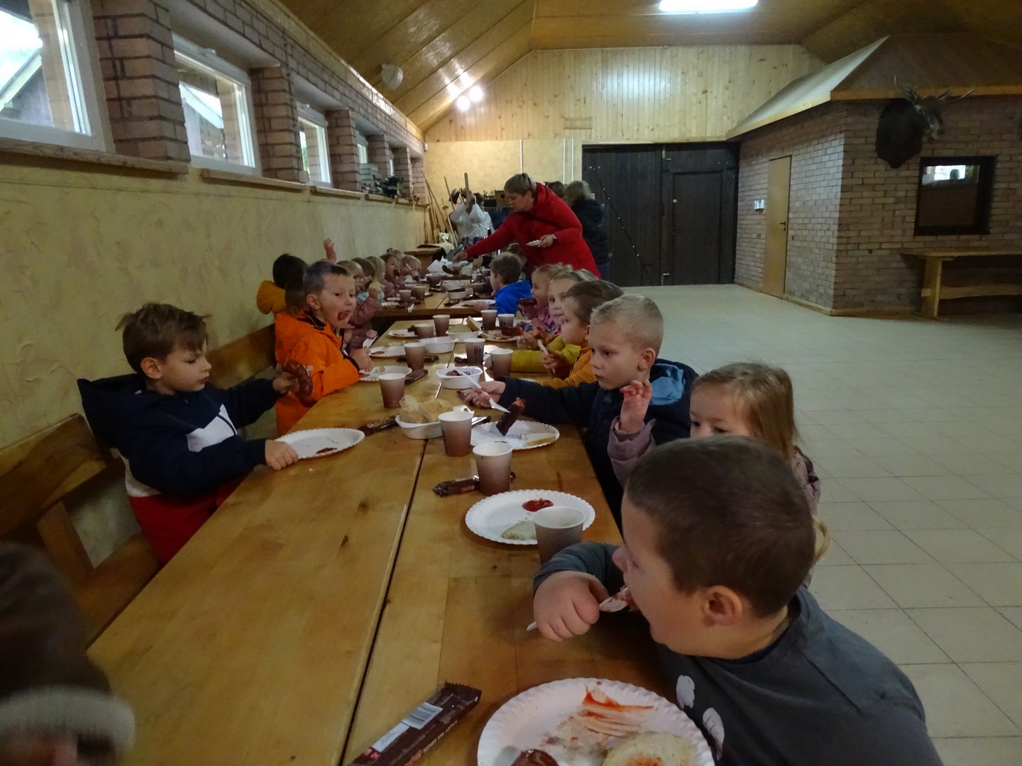 Nie zabrakło także zabaw na świeżym powietrzu, które pozwoliły maluchom poczuć radość z kontaktu z naturą. Na zakończenie wycieczki dzieci wspólnie zjadły kiełbaski, co było miłym i smacznym akcentem całego dnia.