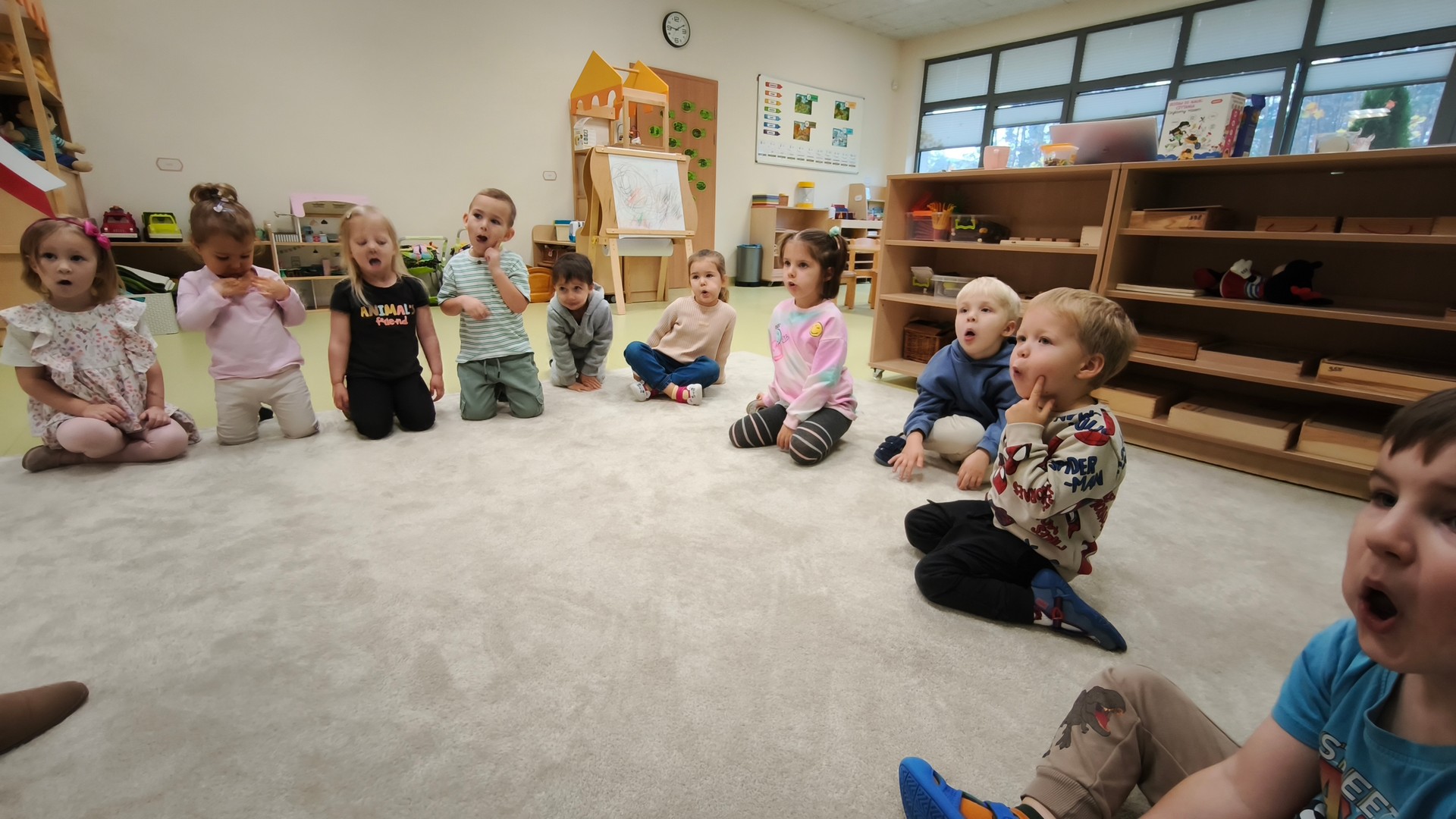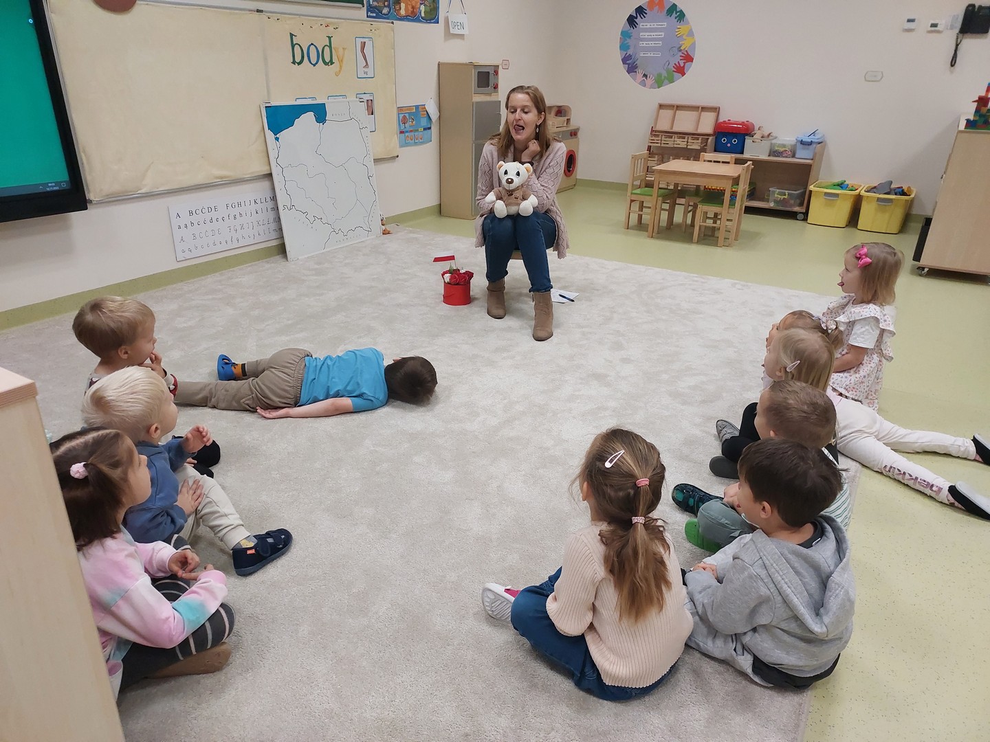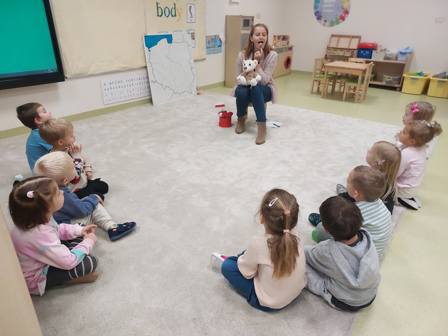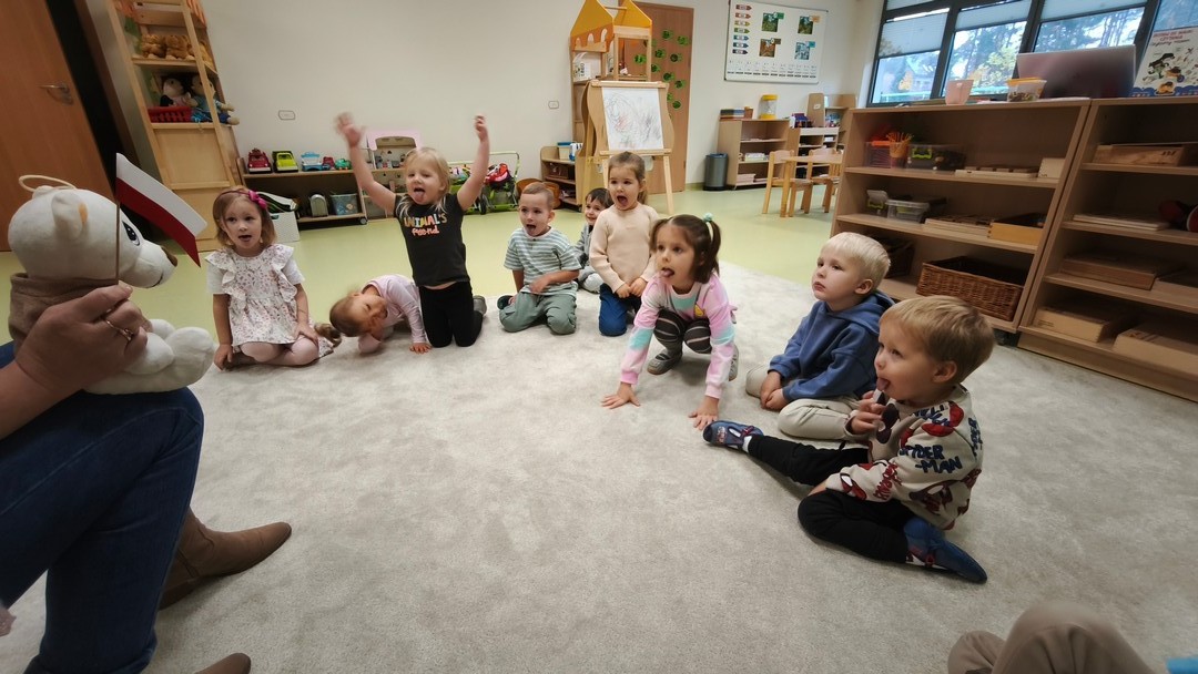 Dziś grupa trzy-czterolatków poznawała i utrwalała nasze symbole narodowe. Żabki ćwiczyły język, wargi i policzki. Bawiliśmy się p. Asią i Misiem Lulusiem w zgadywanki tematyczne, o naszych barwach i godle, fladze i hymnie. Na zakończenie powstały piękne flagi. Luluś przypominał nam jak zbudowany jest język, gdzie jest jego czubek, środek, gdzie mamy podniebienie twarde, miękkie i policzki. Języczek – jako flaga trzepotał na wietrze, malowaliśmy kolor na górze i na dole, unosiliśmy ją wysoko na maszt. Później języczek był orłem z naszego godła. Po zakończonej bajce przypominaliśmy wspólnie wszystkie symbole i przypisane do nich ruchy artykulatorów. Już zaprosiliśmy Lulusia na następny tydzień.