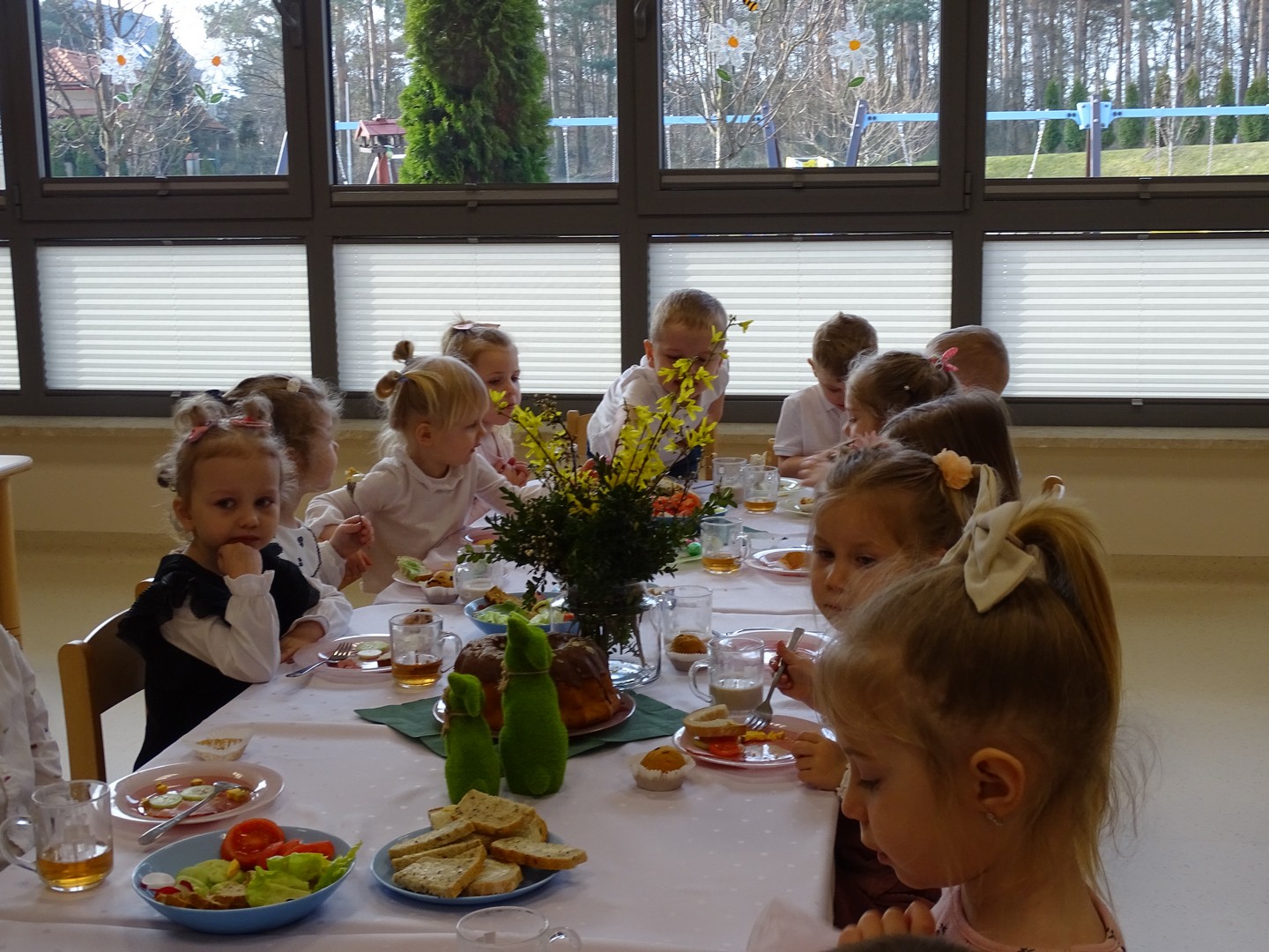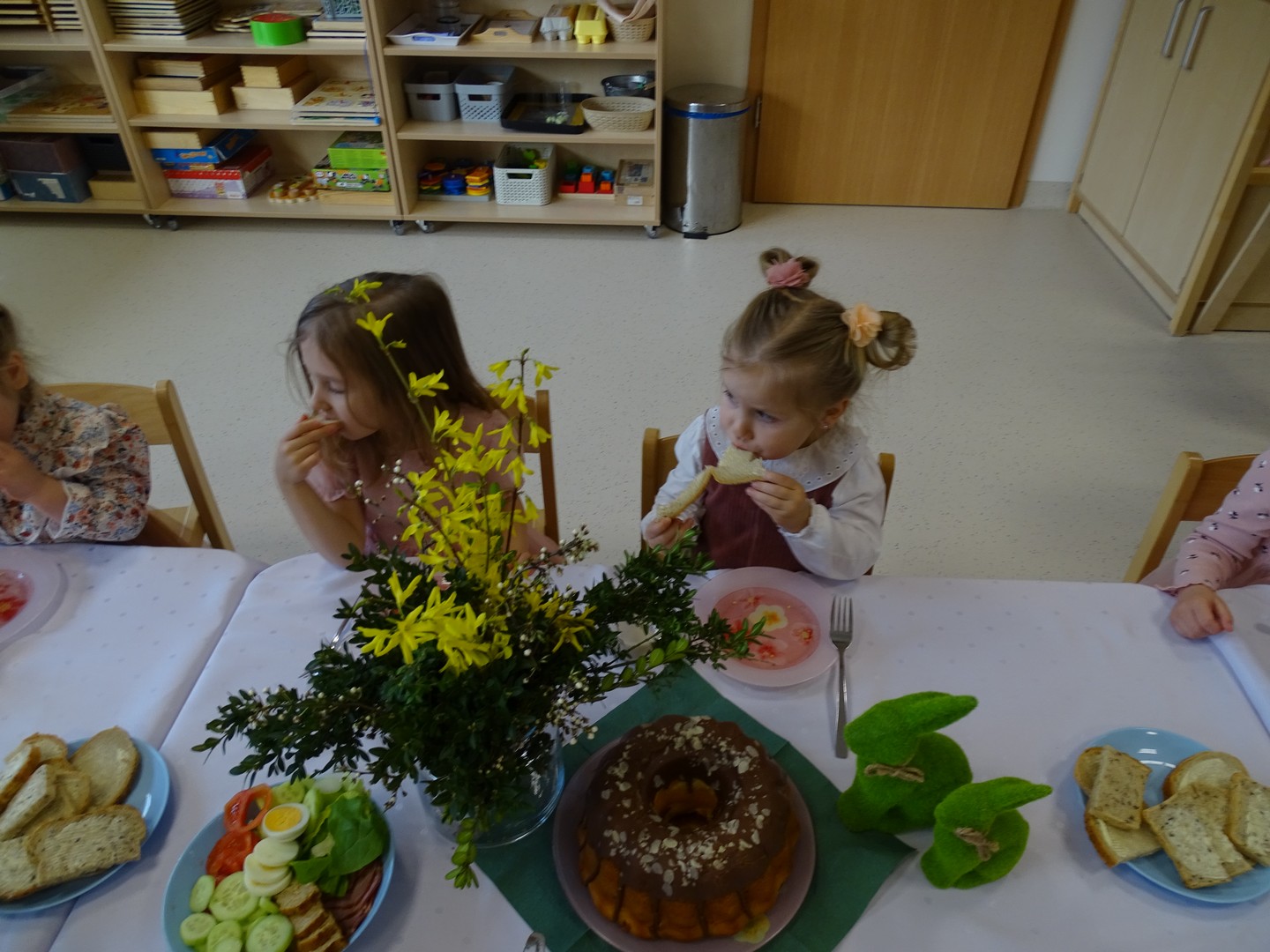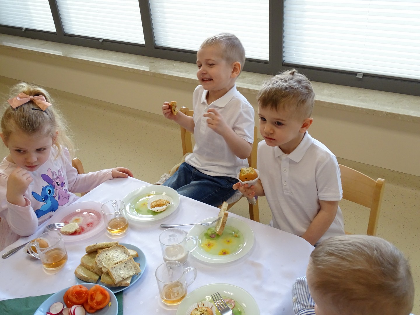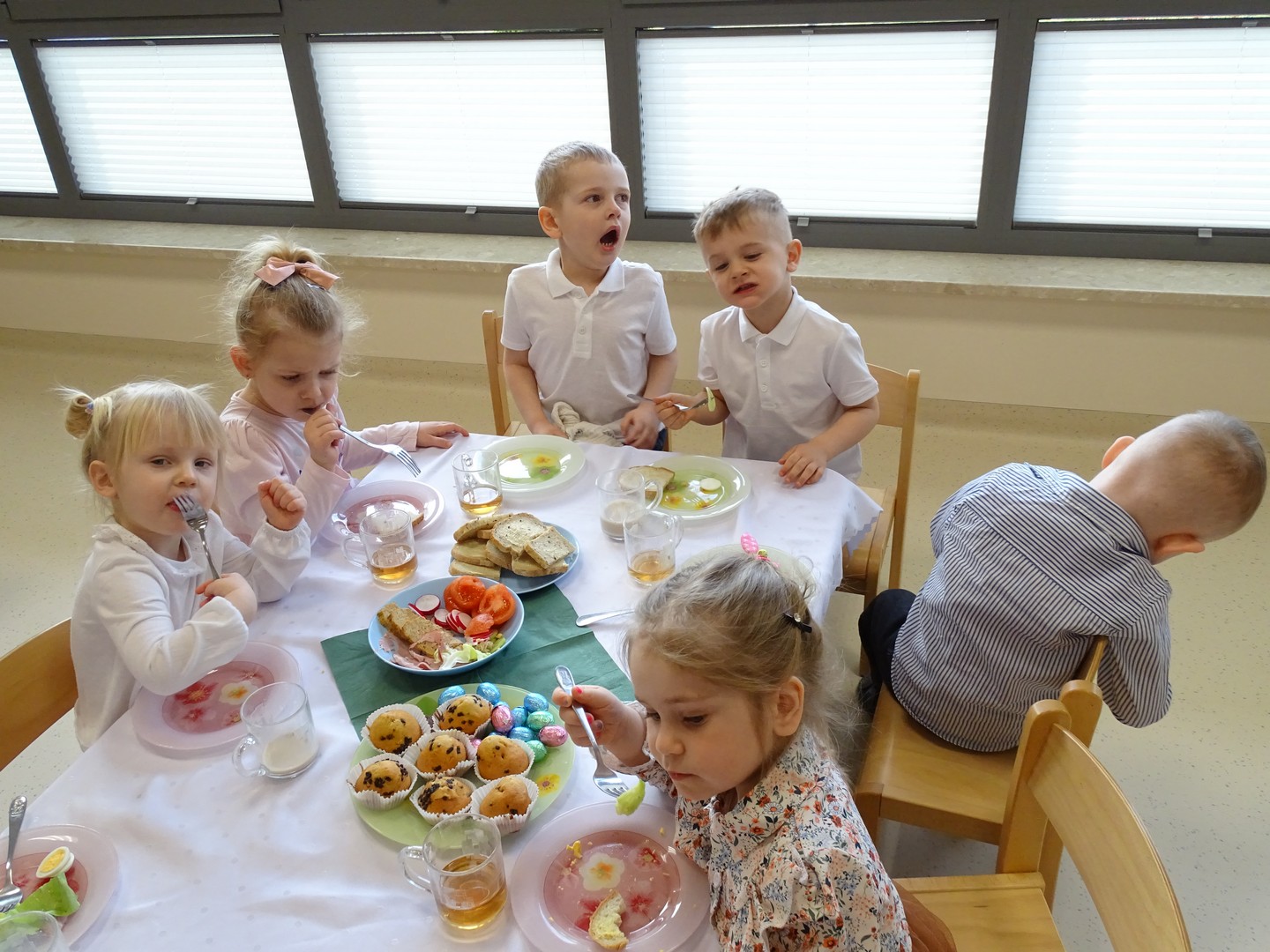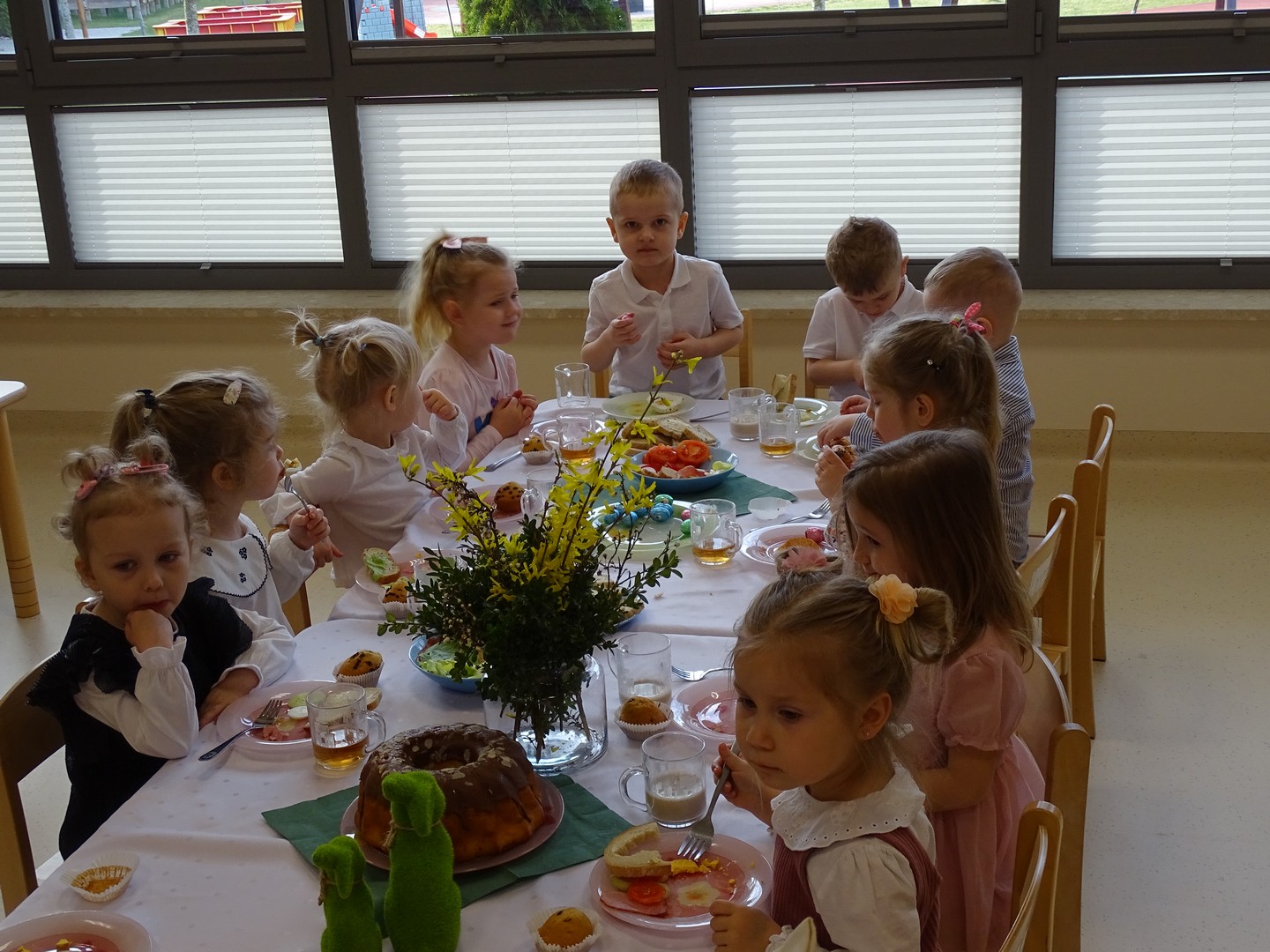 W Wielki Czwartek dzieci wraz z paniami zasiadły do śniadania wielkanocnego. Przedszkolaki aktywnie włączyły się w przygotowanie świątecznego stołu. Na stole pojawiły się tradycyjne wielkanocne przysmaki – jajka, szynka, babka wielkanocna, babeczki, które samodzielnie upiekły. Nie zabrakło także symboli wielkanocnych oraz stroików. Spotkanie przy wspólnym świątecznym stole sprawiło dzieciom wiele radości.