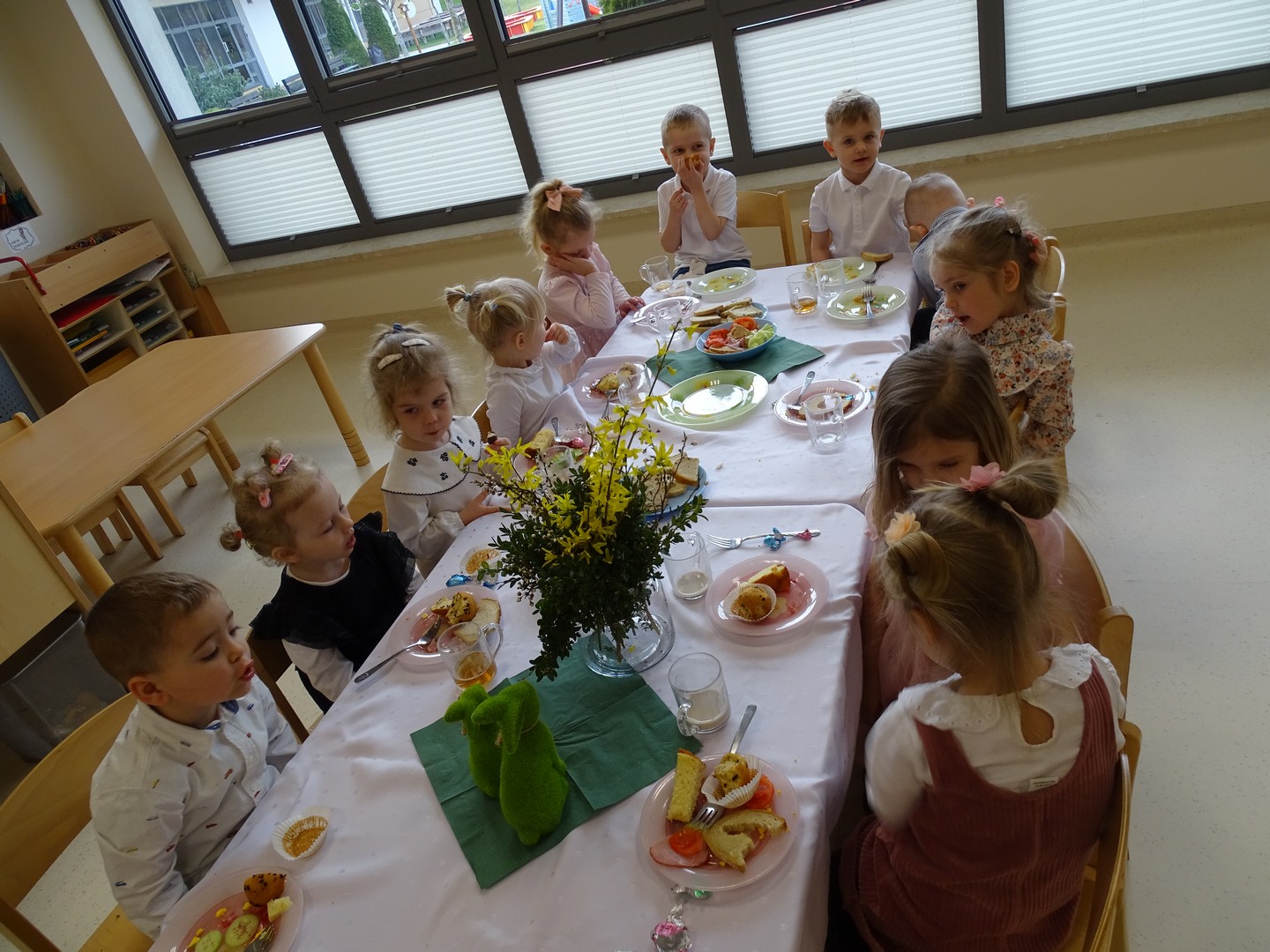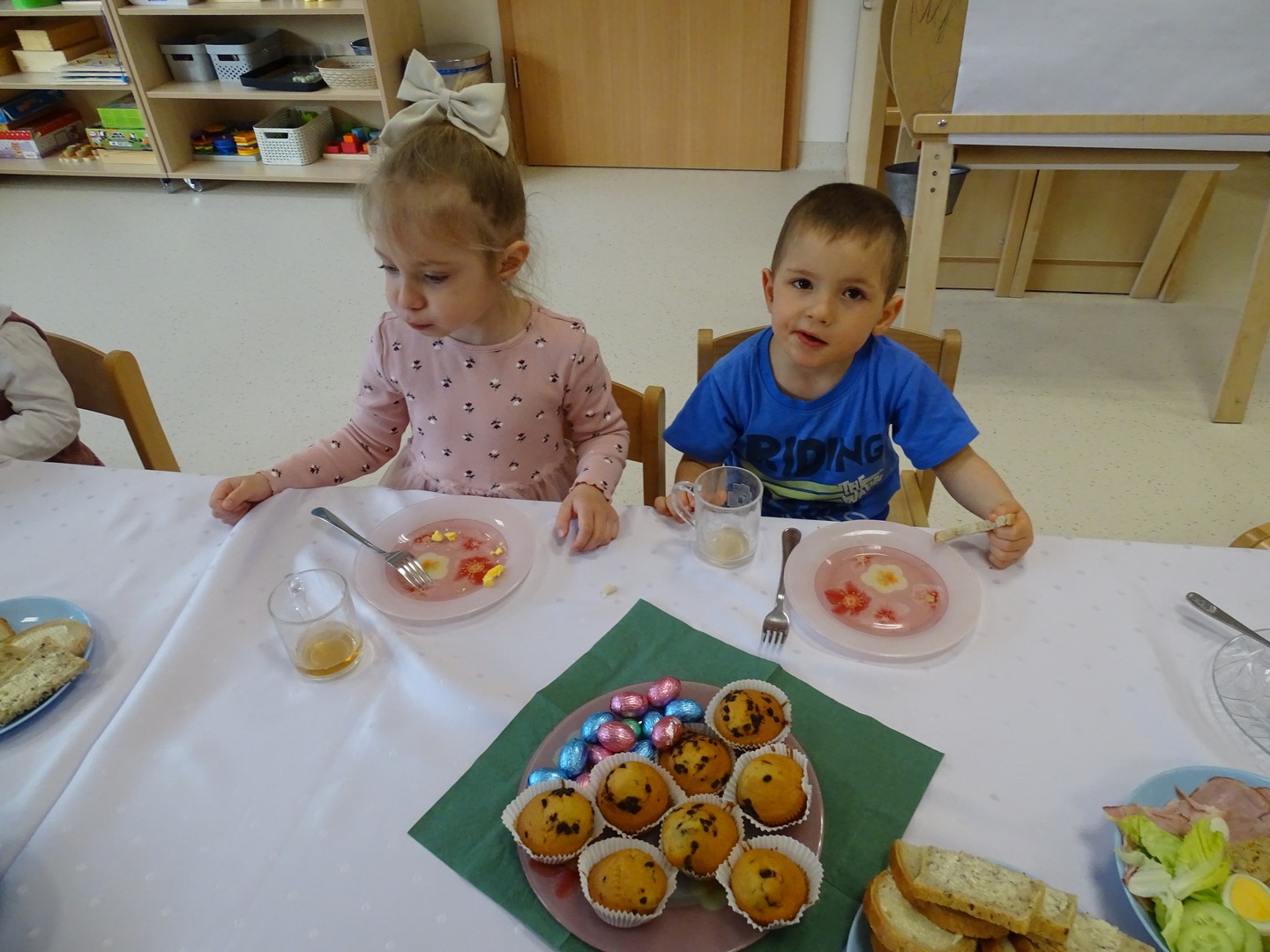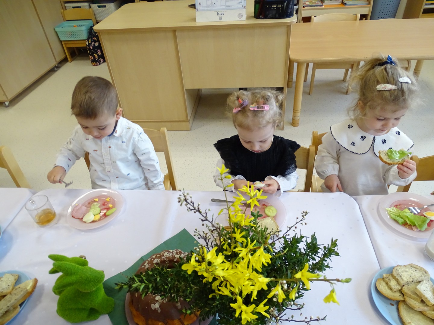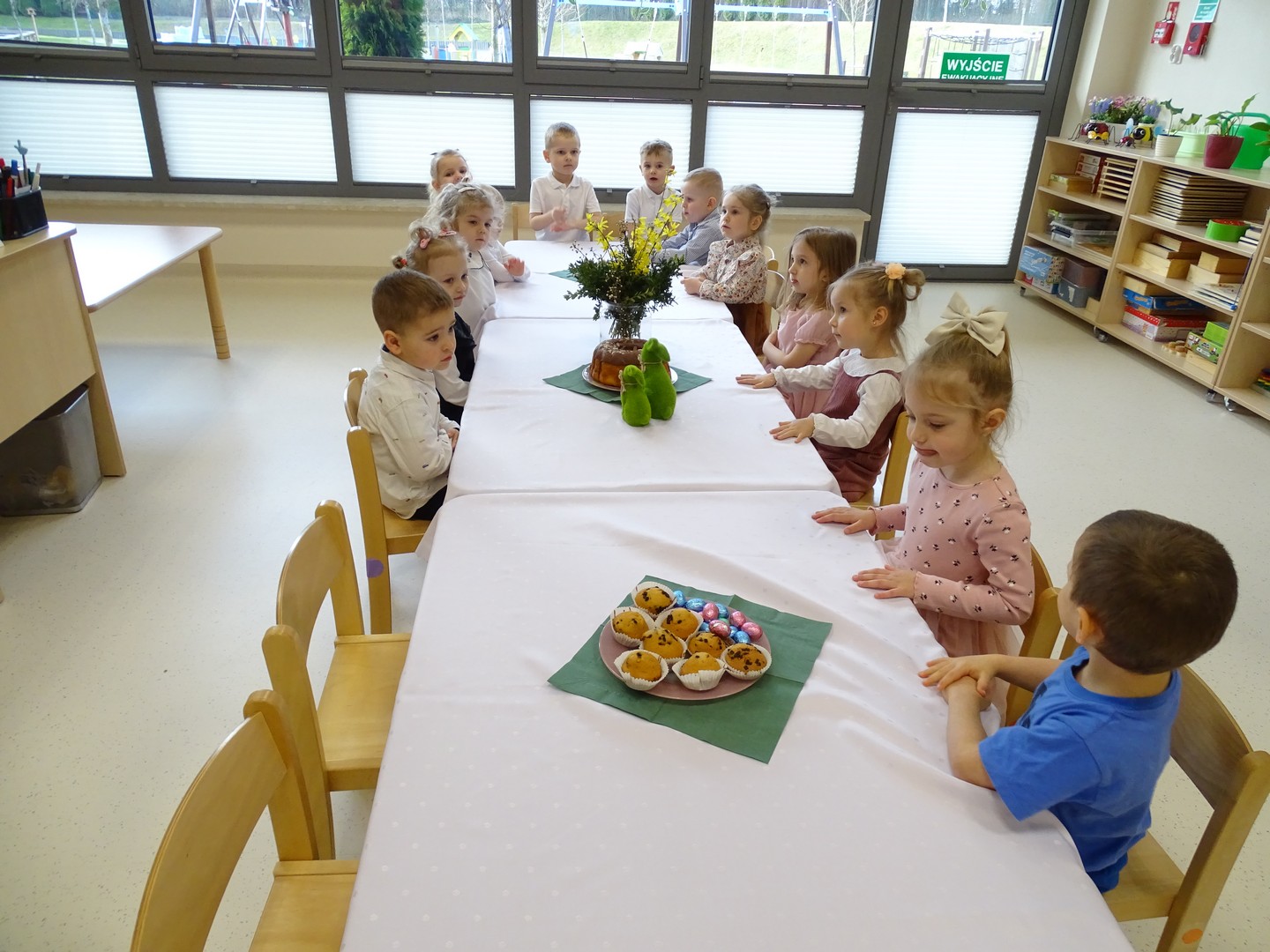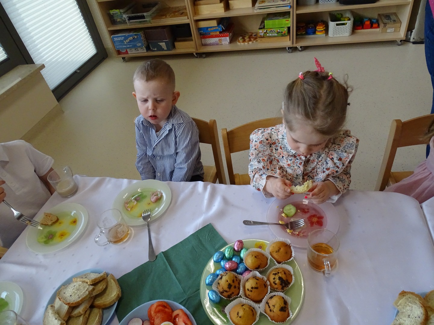 W Wielki Czwartek dzieci wraz z paniami zasiadły do śniadania wielkanocnego. Przedszkolaki aktywnie włączyły się w przygotowanie świątecznego stołu. Na stole pojawiły się tradycyjne wielkanocne przysmaki – jajka, szynka, babka wielkanocna, babeczki, które samodzielnie upiekły. Nie zabrakło także symboli wielkanocnych oraz stroików. Spotkanie przy wspólnym świątecznym stole sprawiło dzieciom wiele radości.