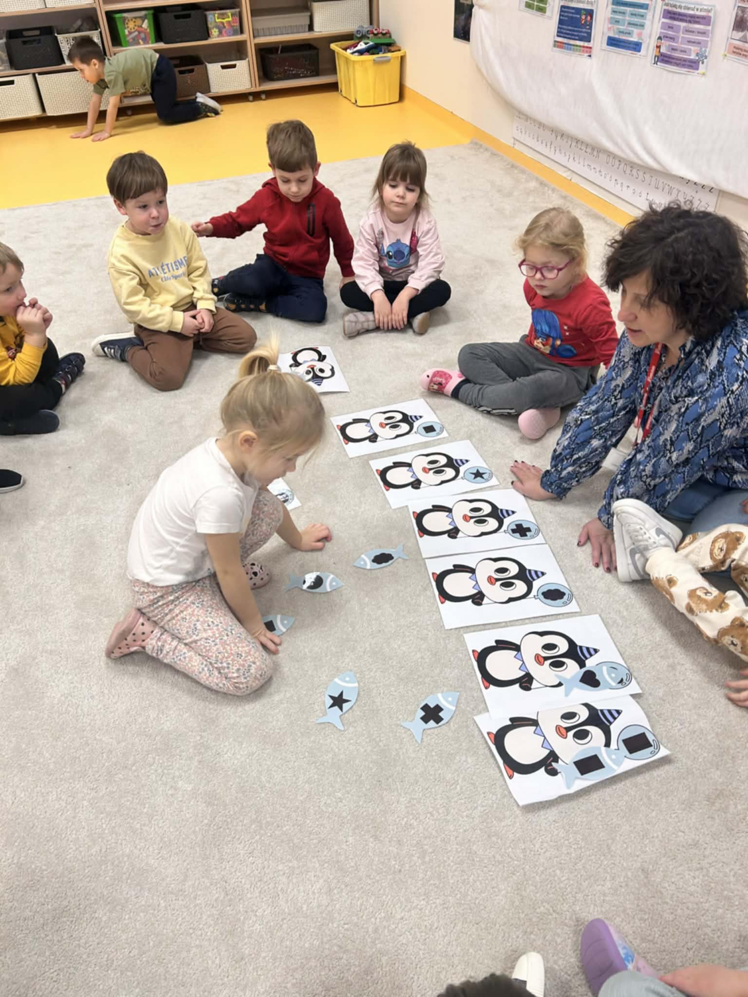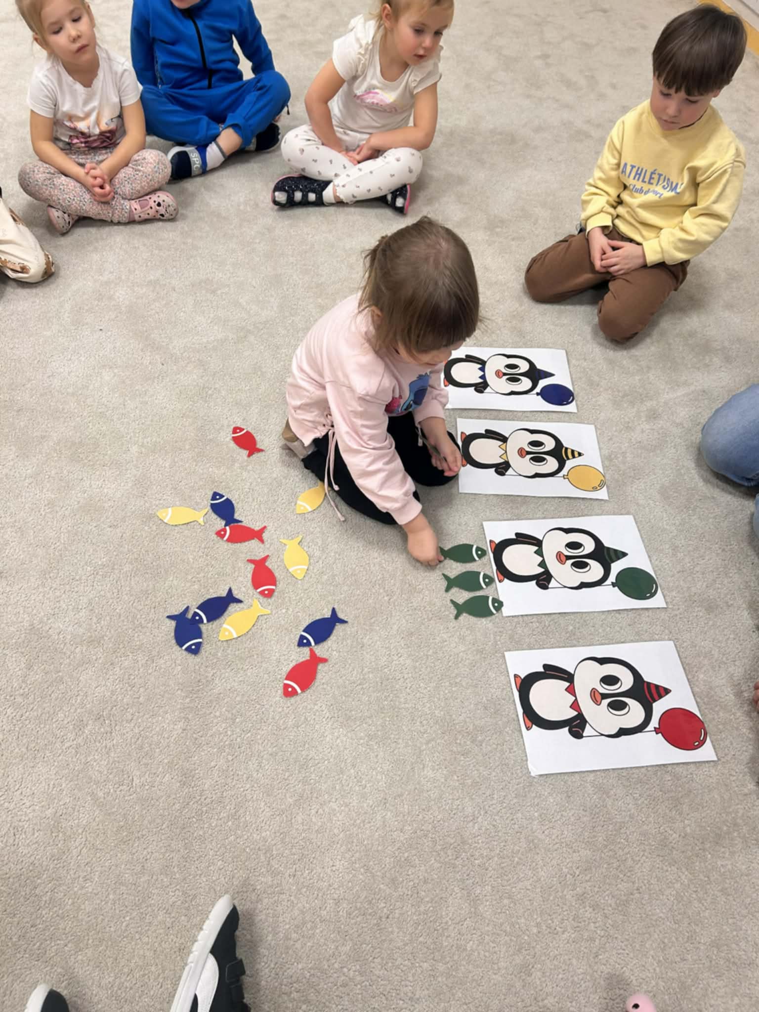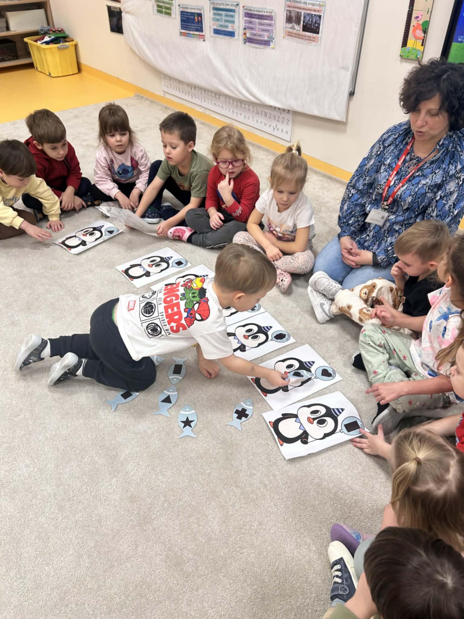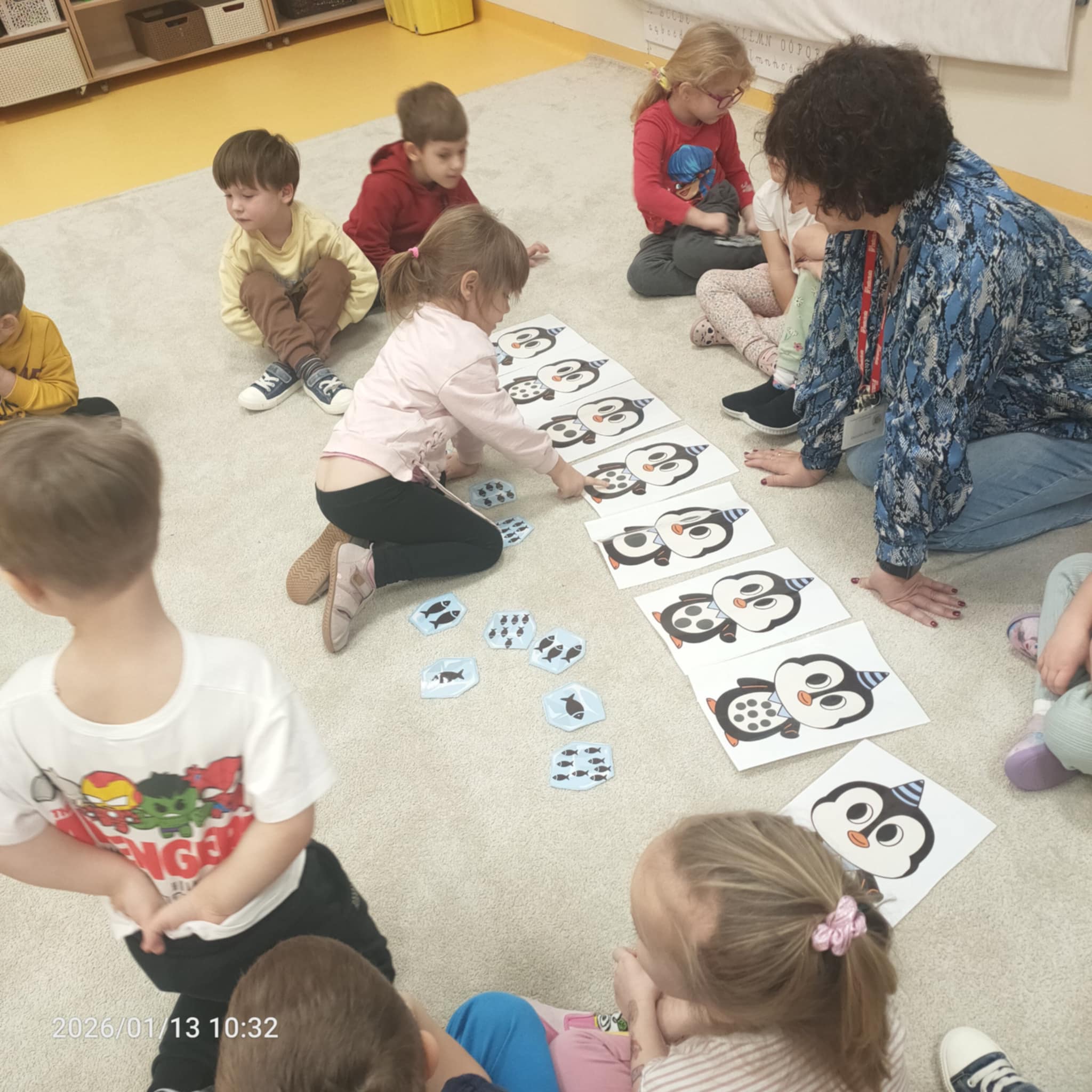 Dzieci w naszej grupie świetnie rozwijają swoje umiejętności liczenia poprzez ciekawe i angażujące zajęcia! Podczas zajęć dzieci liczyły kropki na pingwinkach, co pomogło im ćwiczyć rozpoznawanie i zapamiętywanie liczebników. Następnie miały za zadanie dopasować do nich odpowiednią liczbę rybek, aby ilości się zgadzały.Dzieci poznały figury geometryczne oraz różne kształty. Miały okazję dopasować kształt do pingwinka-balonika oraz znaleźć na sali trójkąt, kwadrat i koło. To wspaniała zabawa, która pomaga rozwijać spostrzegawczość i umiejętność rozpoznawania figur.